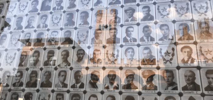 Skyline. La città si proietta sulle fotografie dei martiri della Resistenza nazi – fascista, mostra il suo profilo, si racconta. Bologna, piazza Maggiore. Il sacrario della memoria.