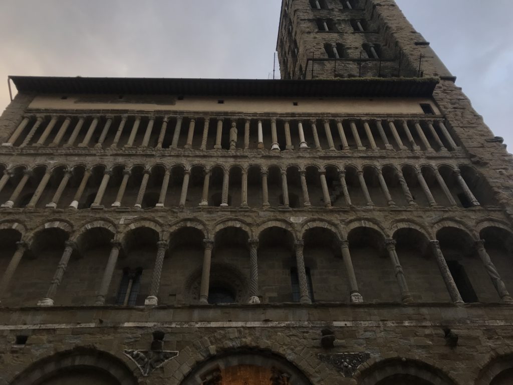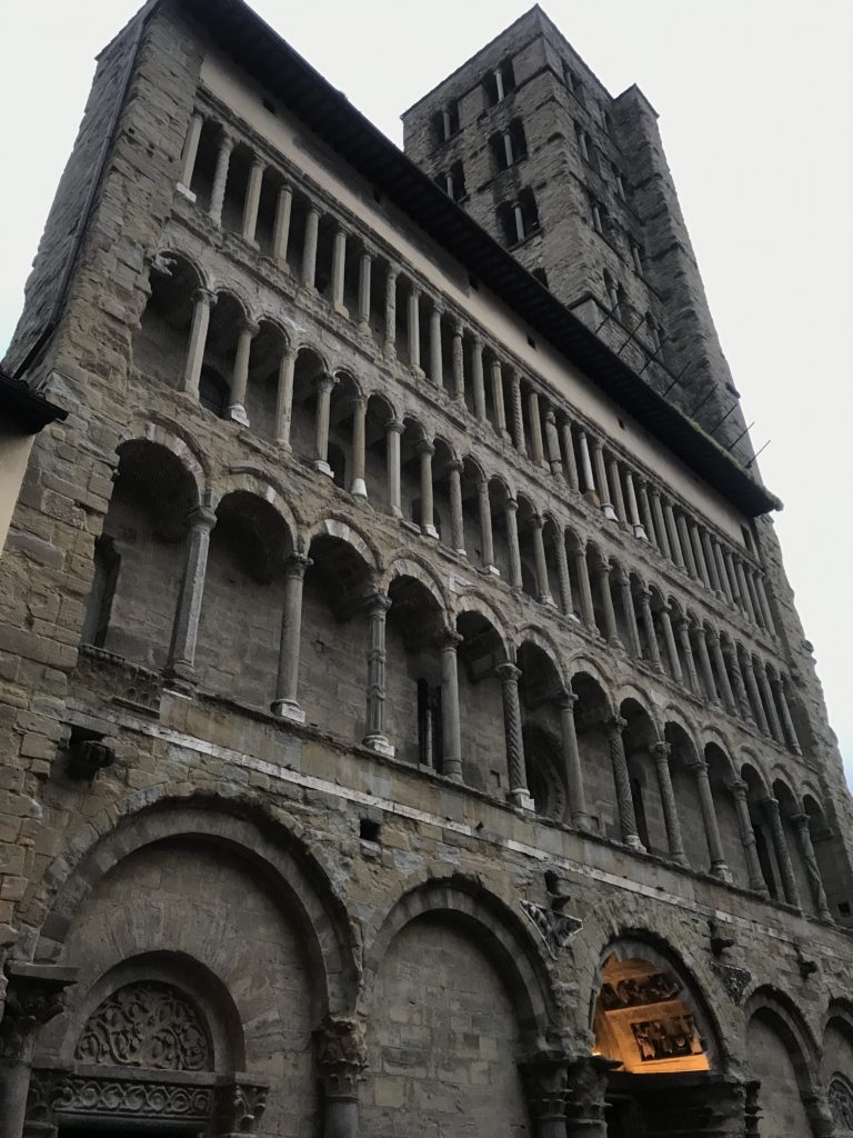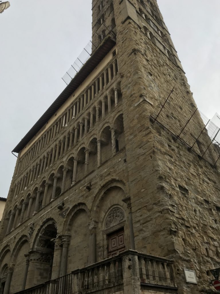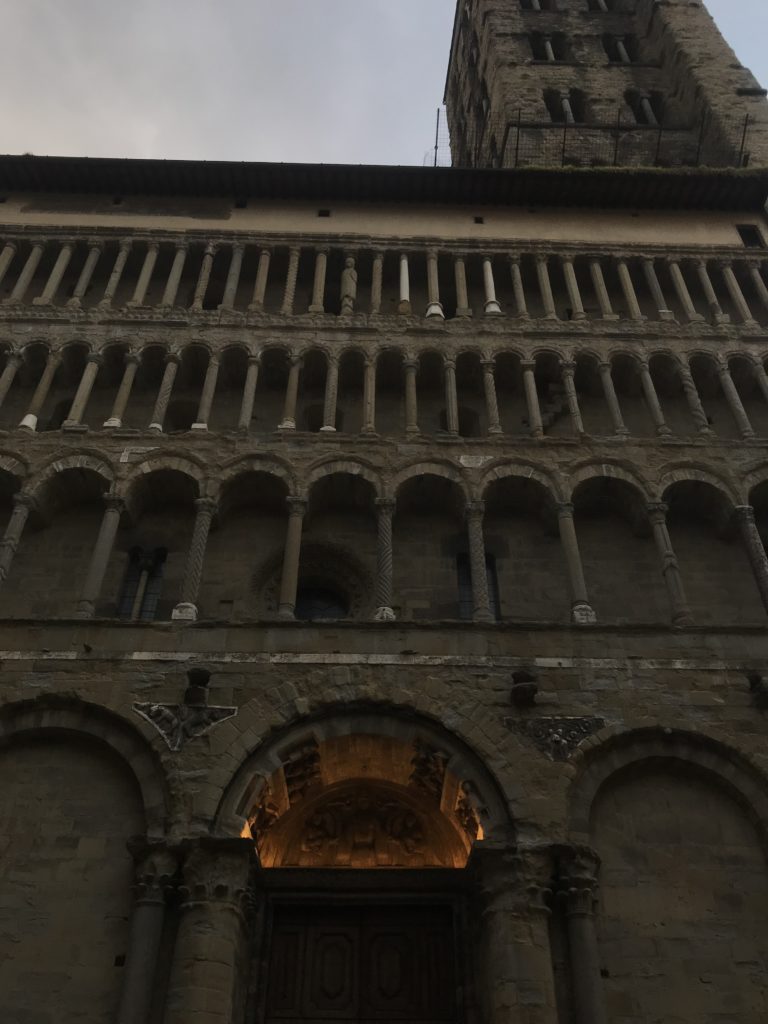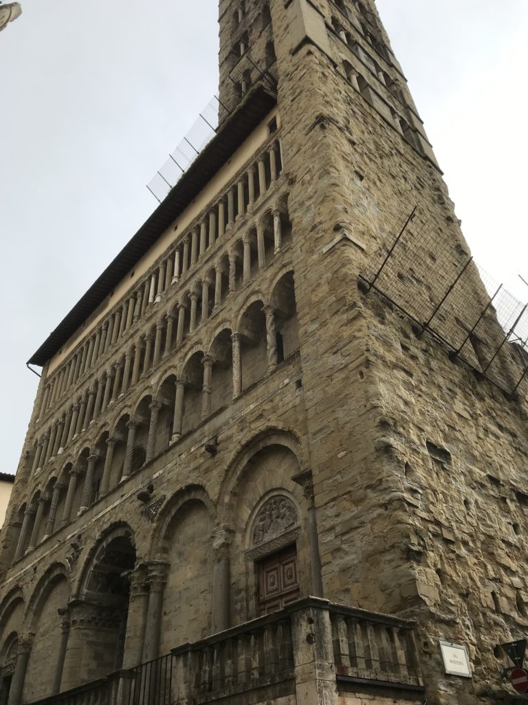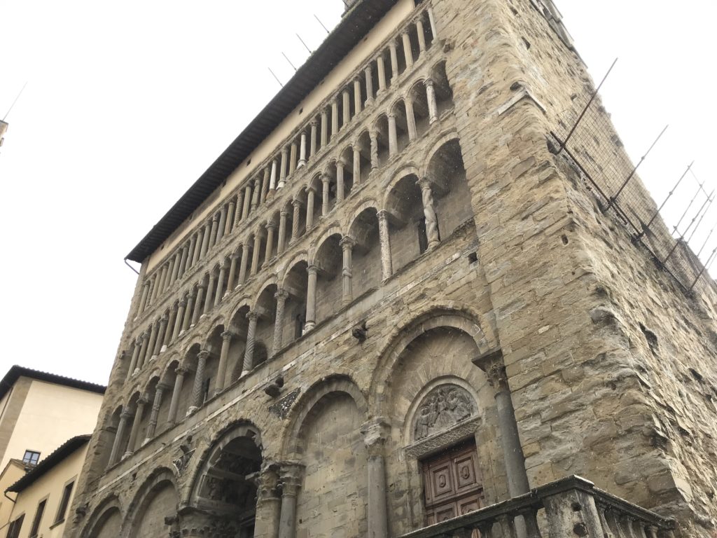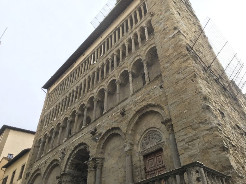 Architettura romanica, uno degli esempio in Italia più rilevanti nel panorama delle origini comunali e degli insediamenti religiosi dentro il borgo difensivo di Arezzo. Sull’asse viario un tempo Cassia Vetus, inizialmente sorta come chiesa battesimale, in un’are archeologica di impronta romana, tanto che le sei colonne di granito della facciata sono lì a testimoniare il recupero e il riuso. Riedificata nel XII secolo e rinnovata nel XIII , la chiesa di Santa Maria della Pieve di Arezzo mantiene il prospetto romanico con tre ordini di tre monofore (visibili dall’interno). La facciata si presenta con cinque arcate includendo i tre portali e i tre ordini sovrapposti alle aree logge: dodici al primo ordine, ventiquattro al secondo e trentadue al terzo. Nel 1330 l’ultimazione della torre campanaria, con cinque ordini di bifore aperta ai quattro lati. Nella lunetta centrale le allegorie dei dodici mesi con i lavoro agricoli praticati dalle genti del contado, gruppo scultoreo policromo. L’interno a tre navate, presbiterio e cripta e un abside semicircolare. Nell’altare centrale con inserti pittorici che Vasari realizzò per il sepolcro di famiglia. Rilevanti i capitelli presenti nella cripta che raffigurano anche teste di arieti e montoni: simboli del potere e della cultura armentizia, che forse ha commissionato la cripta intestandosi così il proprio logo e brand.