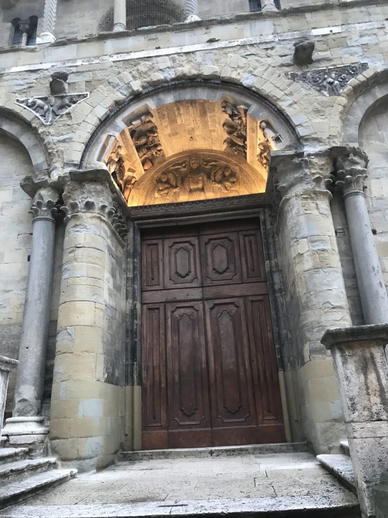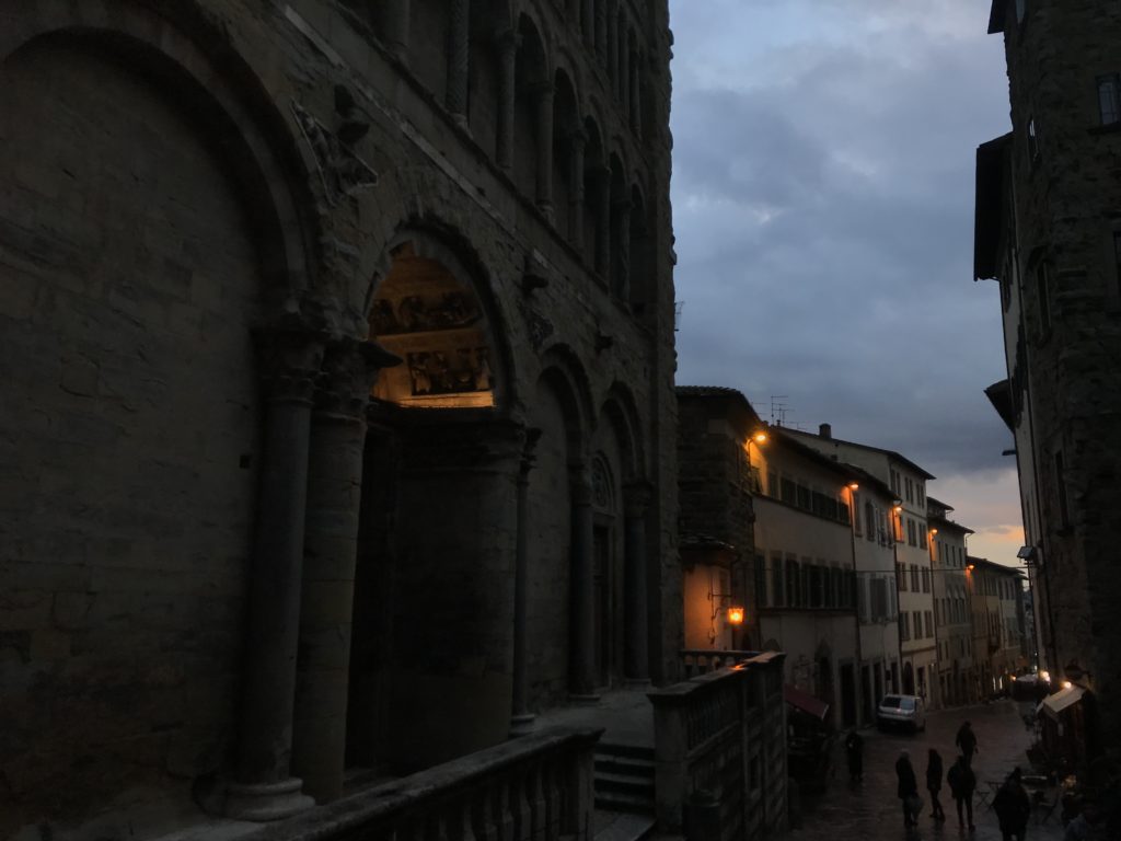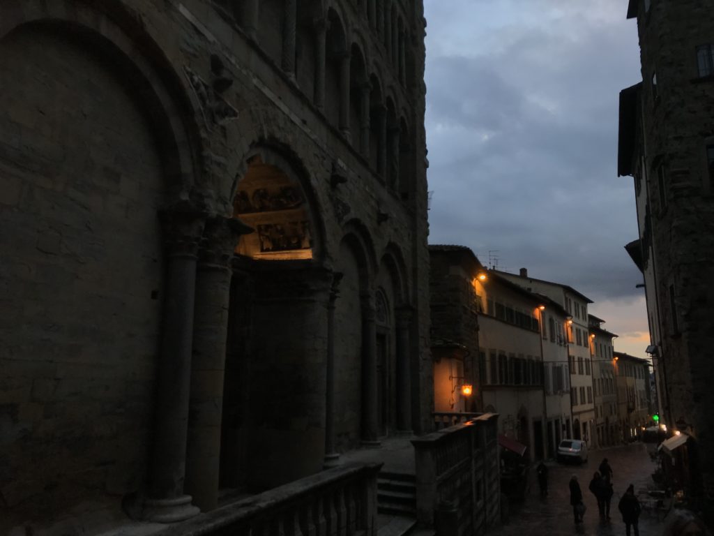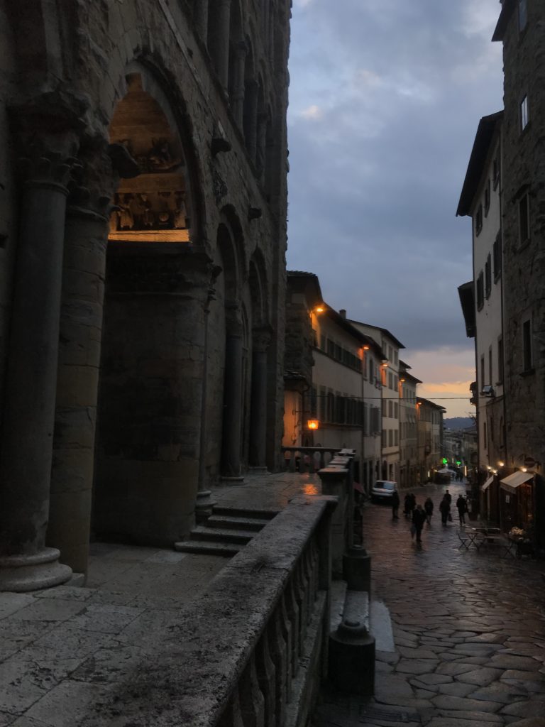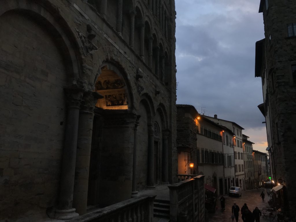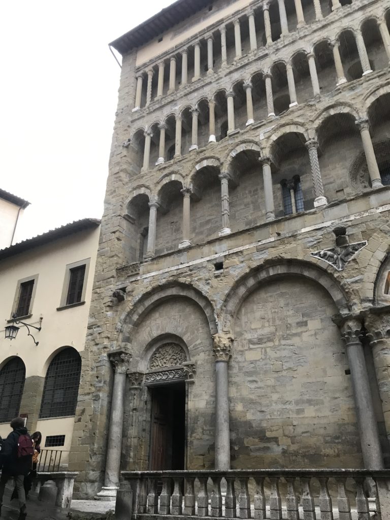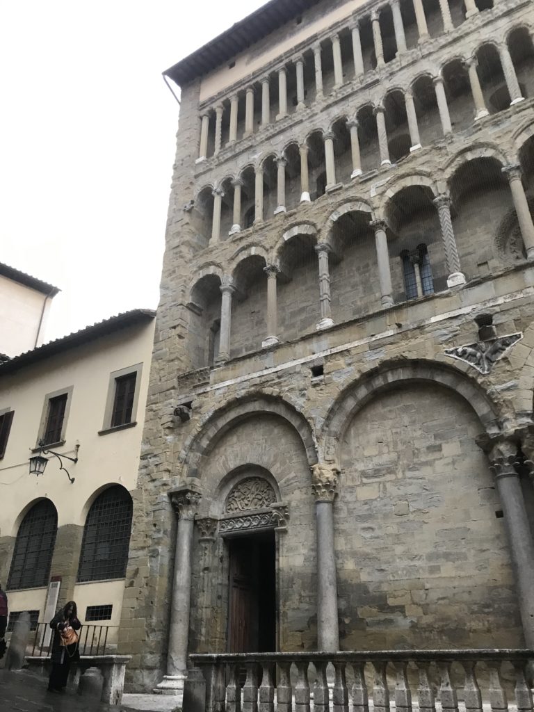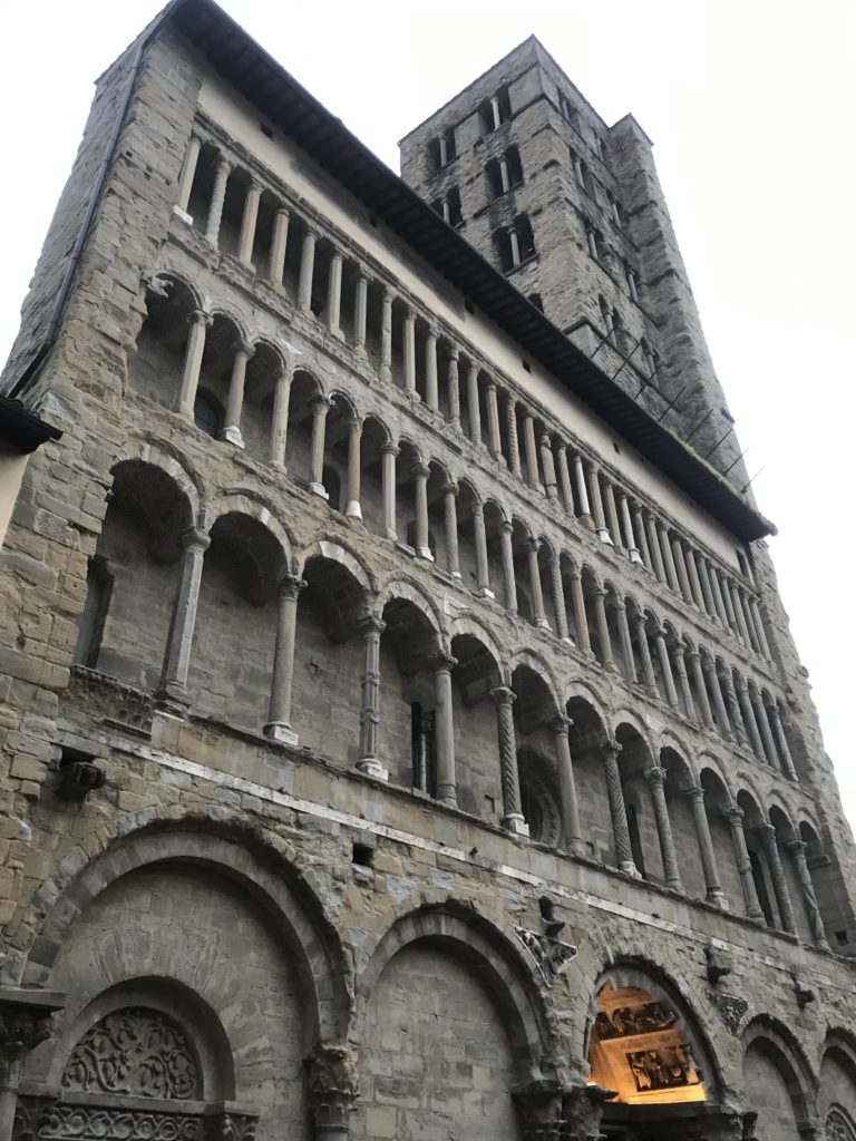 Architettura romanica, uno degli esempio in Italia più rilevanti nel panorama delle origini comunali e degli insediamenti religiosi dentro il borgo difensivo di Arezzo. Sull’asse viario un tempo Cassia Vetus, inizialmente sorta come chiesa battesimale, in un’are archeologica di impronta romana, tanto che le sei colonne di granito della facciata sono lì a testimoniare il recupero e il riuso. Riedificata nel XII secolo e rinnovata nel XIII , la chiesa di Santa Maria della Pieve di Arezzo mantiene il prospetto romanico con tre ordini di tre monofore (visibili dall’interno). La facciata si presenta con cinque arcate includendo i tre portali e i tre ordini sovrapposti alle aree logge: dodici al primo ordine, ventiquattro al secondo e trentadue al terzo. Nel 1330 l’ultimazione della torre campanaria, con cinque ordini di bifore aperta ai quattro lati. Nella lunetta centrale le allegorie dei dodici mesi con i lavoro agricoli praticati dalle genti del contado, gruppo scultoreo policromo. L’interno a tre navate, presbiterio e cripta e un abside semicircolare. Nell’altare centrale con inserti pittorici che Vasari realizzò per il sepolcro di famiglia. Rilevanti i capitelli presenti nella cripta che raffigurano anche teste di arieti e montoni: simboli del potere e della cultura armentizia, che forse ha commissionato la cripta intestandosi così il proprio logo e brand.