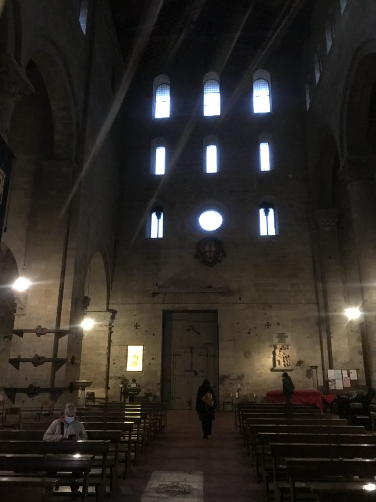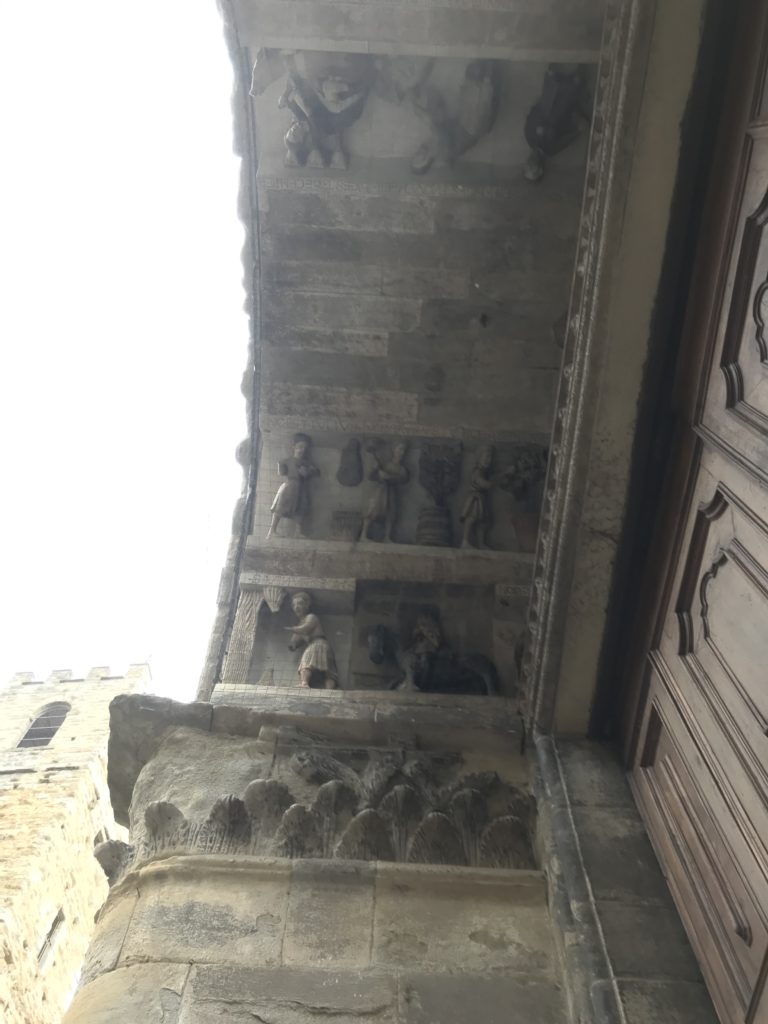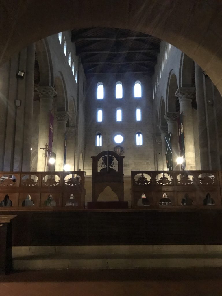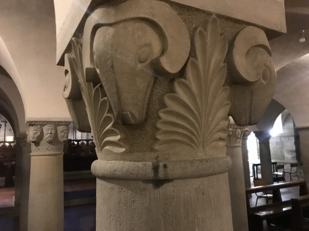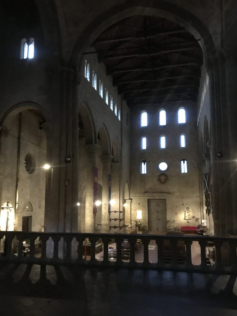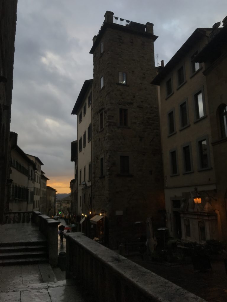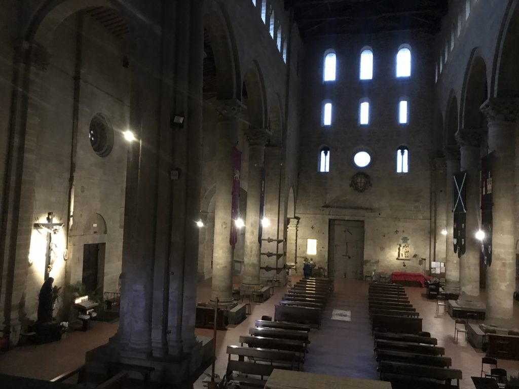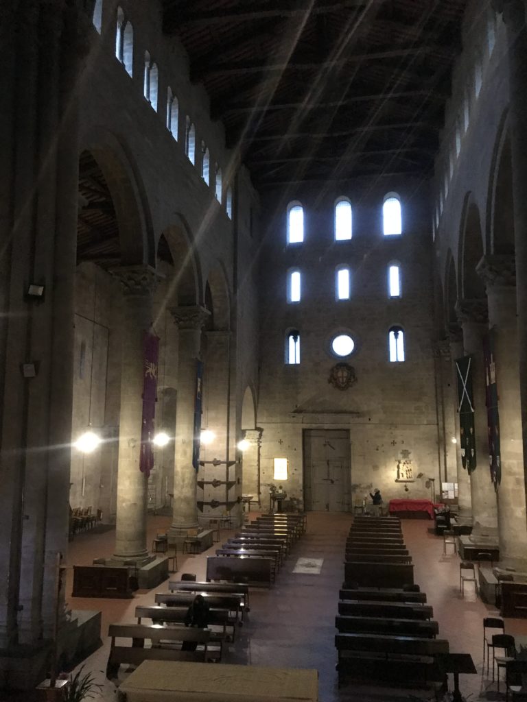 Architettura romanica, uno degli esempio in Italia più rilevanti nel panorama delle origini comunali e degli insediamenti religiosi dentro il borgo difensivo di Arezzo. Sull’asse viario un tempo Cassia Vetus, inizialmente sorta come chiesa battesimale, in un’are archeologica di impronta romana, tanto che le sei colonne di granito della facciata sono lì a testimoniare il recupero e il riuso. Riedificata nel XII secolo e rinnovata nel XIII , la chiesa di Santa Maria della Pieve di Arezzo mantiene il prospetto romanico con tre ordini di tre monofore (visibili dall’interno). La facciata si presenta con cinque arcate includendo i tre portali e i tre ordini sovrapposti alle aree logge: dodici al primo ordine, ventiquattro al secondo e trentadue al terzo. Nel 1330 l’ultimazione della torre campanaria, con cinque ordini di bifore aperta ai quattro lati. Nella lunetta centrale le allegorie dei dodici mesi con i lavoro agricoli praticati dalle genti del contado, gruppo scultoreo policromo. L’interno a tre navate, presbiterio e cripta e un abside semicircolare. Nell’altare centrale con inserti pittorici che Vasari realizzò per il sepolcro di famiglia. Rilevanti i capitelli presenti nella cripta che raffigurano anche teste di arieti e montoni: simboli del potere e della cultura armentizia, che forse ha commissionato la cripta intestandosi così il proprio logo e brand.
