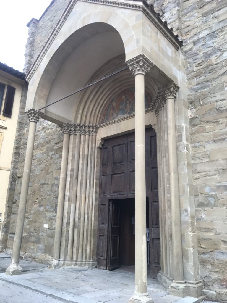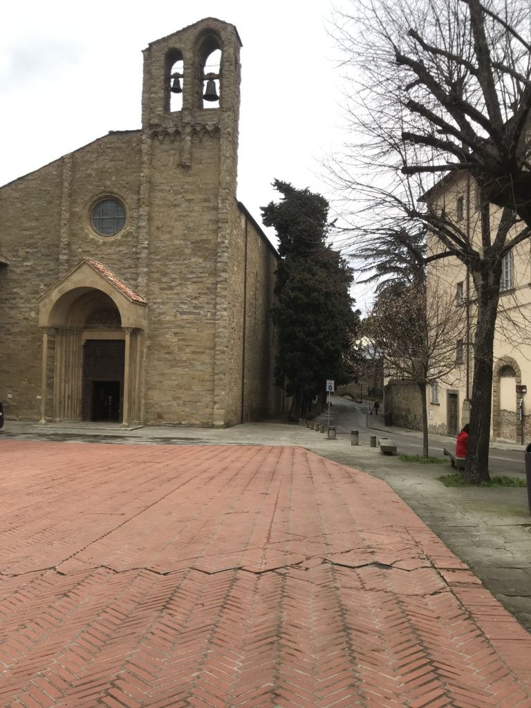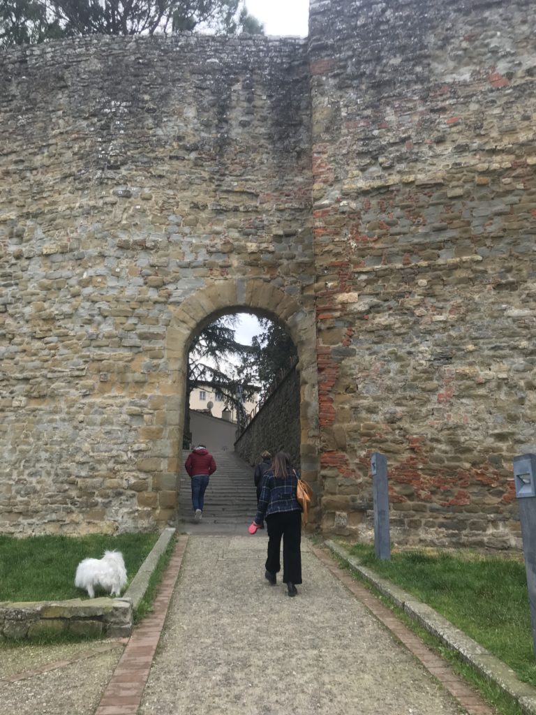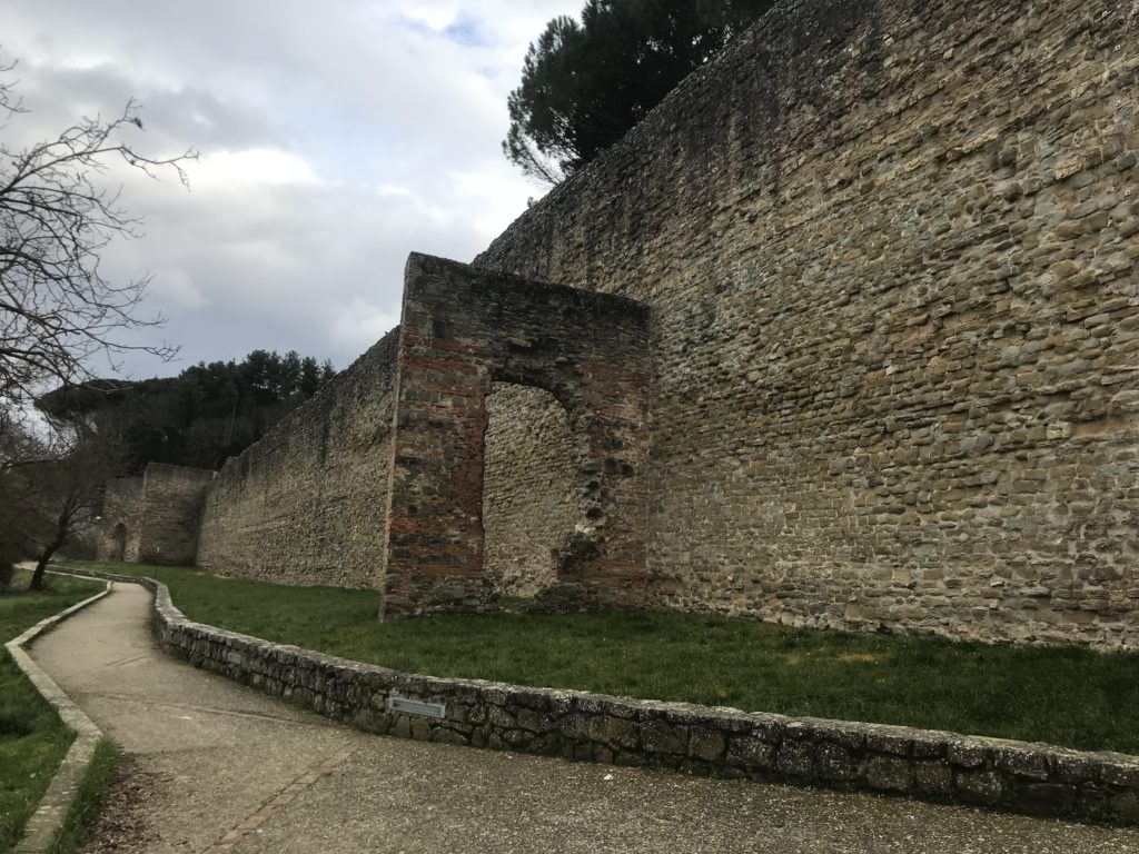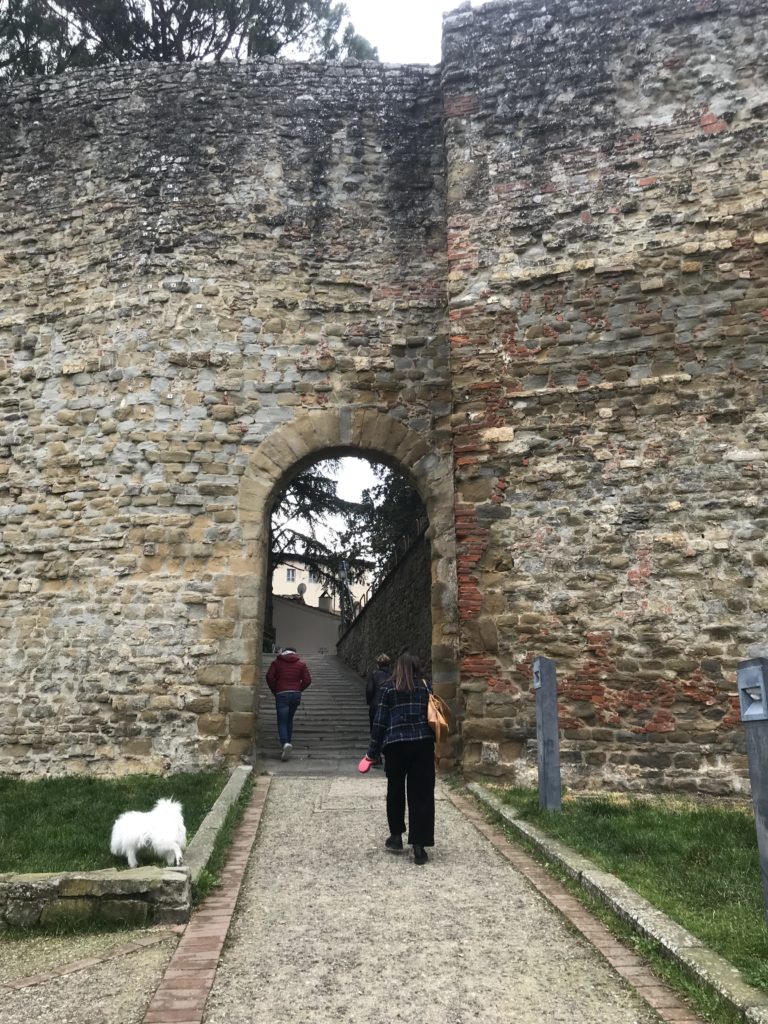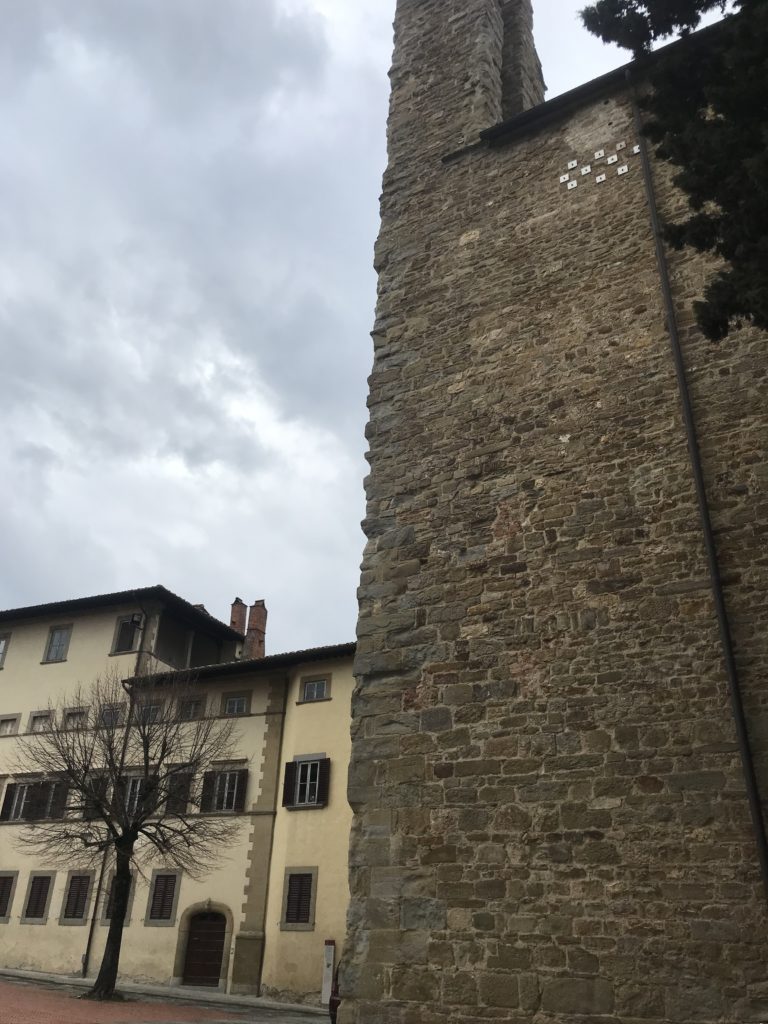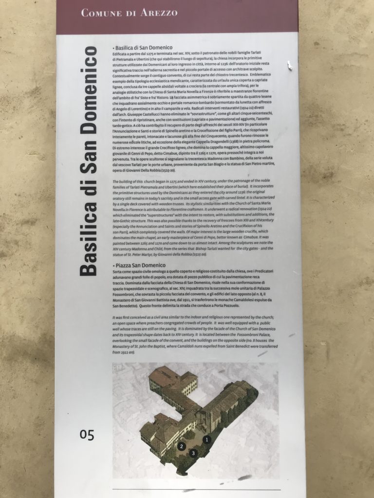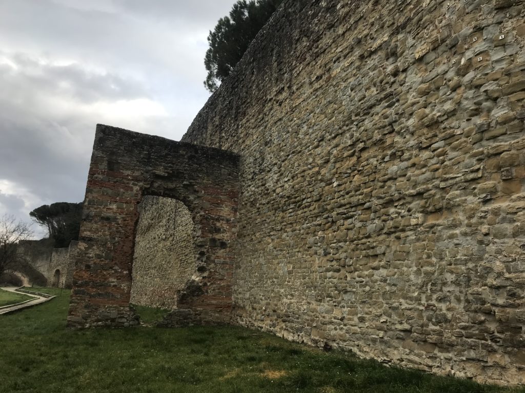 La prima cinta muraria, etrusca, risale al V secolo. Un quadrilatero rettangolare con un perimetro di circa due chilometri. Una seconda cinta muraria si rese necessaria con l’aumento della popolazione, questa volta di circa cinque chilometri. Divenuta romana, Arezzo ebbe la sua terza cinta muraria, “cinta laterizia”, con uno spesso di 4,30 metri. Plinio, Vitruvio e Livio citano la fortificazione e la sua possenza nei loro trattati. La quarta cinta muraria intorno al VII per la difesa dai Longobardi misurava circa 1600 metri. Nel XII secolo la quinta fortificazione perimetrale si estendeva per oltre due chilometri, e poi la sesta di tre chilometri sempre nel Medioevo. Tra il 1319 e il 1330 la settima linea difensiva occupava circa cinque chilometri. Dopo decenni di assedi e devastazioni, ribellioni contro il potere di Firenze si ebbe la rovina della cortina protettiva, tanto che la città resto così a lungo indifesa. Nel 1538 Cosimo I dé Medici rese il borgo di Arezzo difensivo con alte torri e merli, robusti terrapieni. Nel 1800 subì gravi danneggiamenti dalle mine delle truppe francesi. La Basilica di San Domenico, d’impronta romanica, fu costruita nel 1275. La facciata è asimmetrica con il campanile a vela. L’interno con una sola navata, 12 finestre monofore la cui distanza diminuisce avvicinandosi all’abside con una percezione di profondità prospettica e illuminazione naturale orientata anche sull’altare. Nell’abside il Crocifisso di Cimabue, il sepolcro di Gregorio X in un arco ogivale trilobato, oltre alle opere affrescate trecentesche, sculture e la preziosità degli arredi. Nel 1276, la Basilica ospitò il primo Conclave ricordato nella storia della Chiesa.