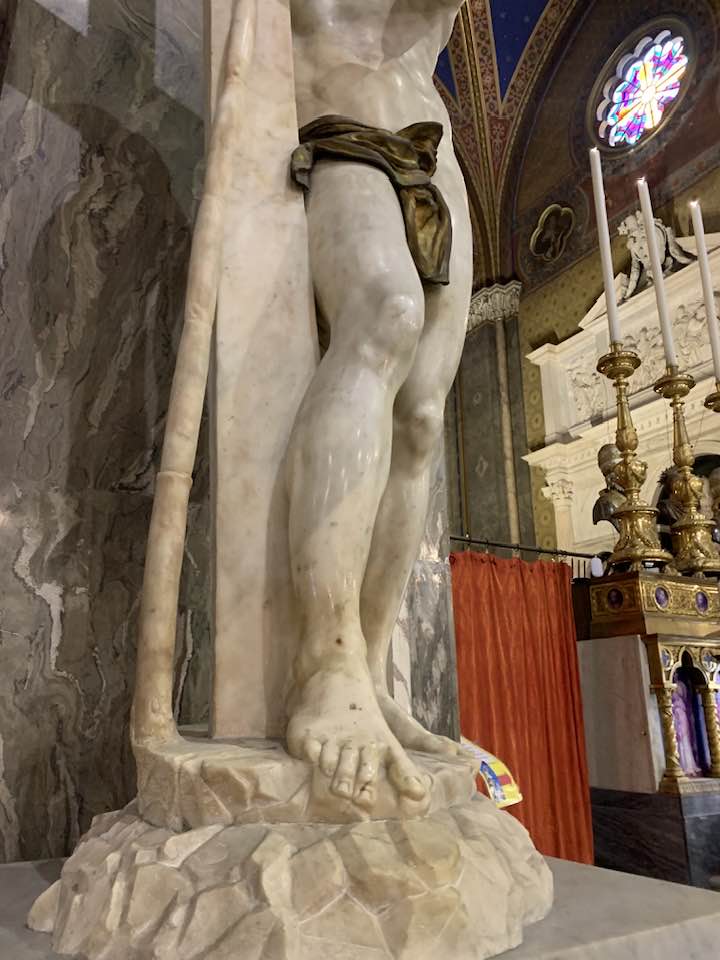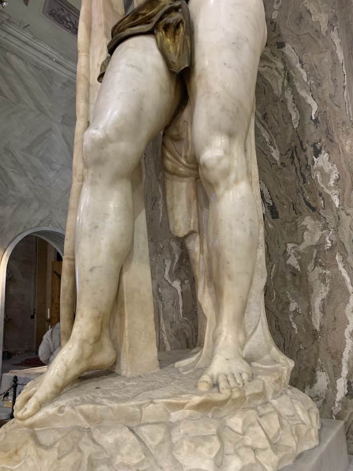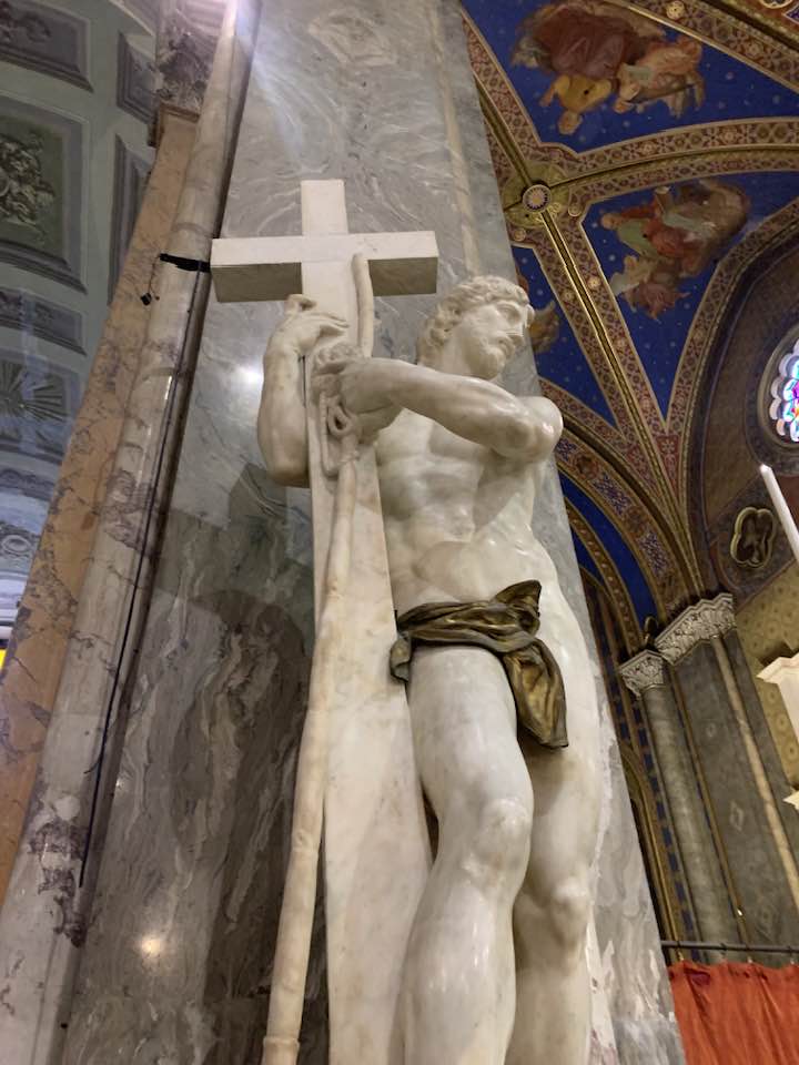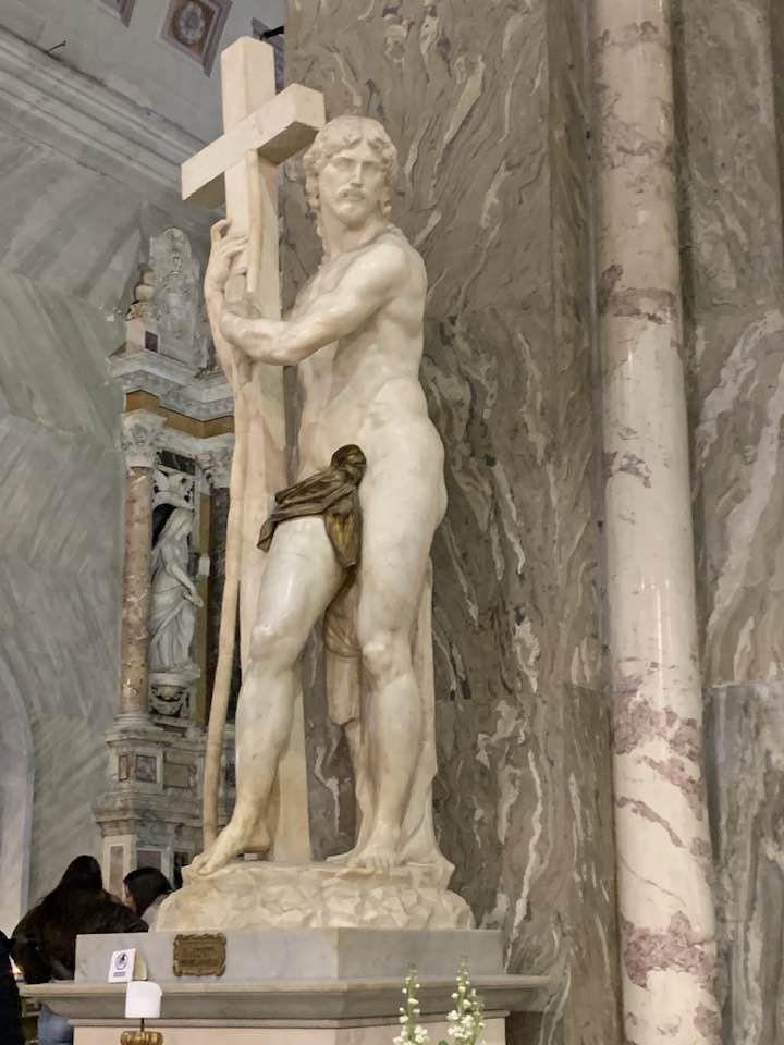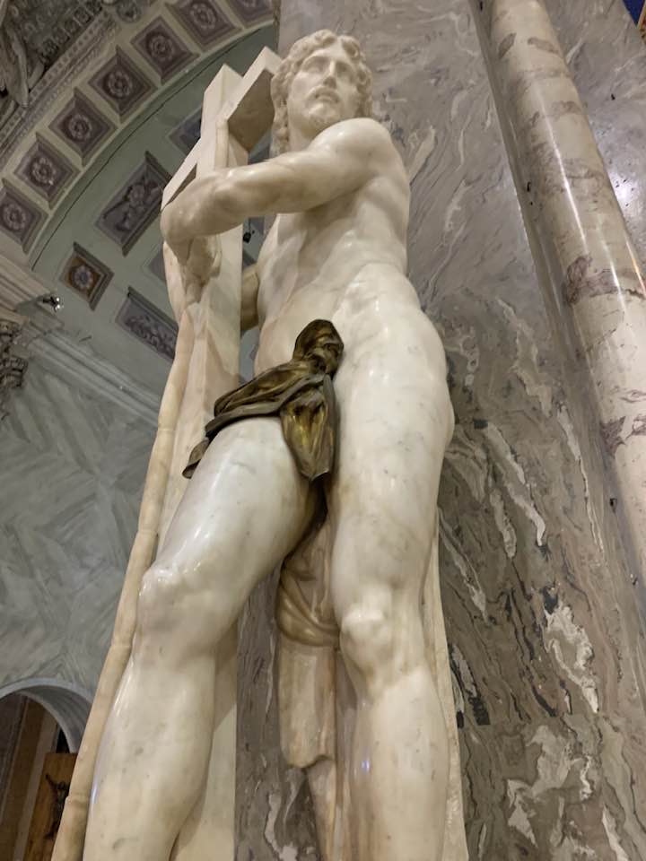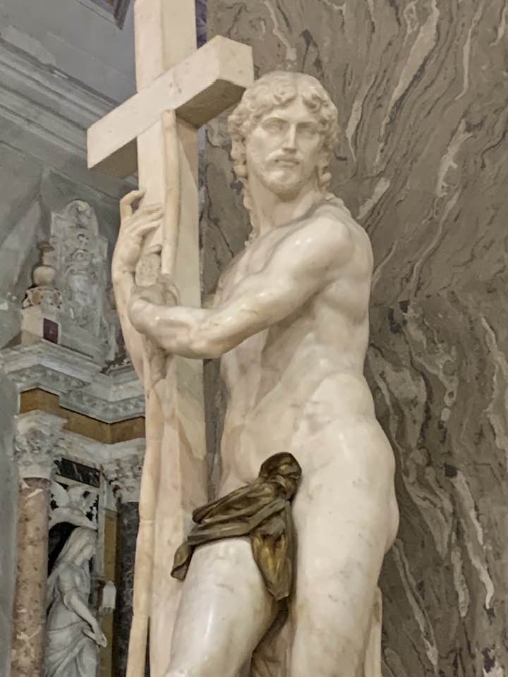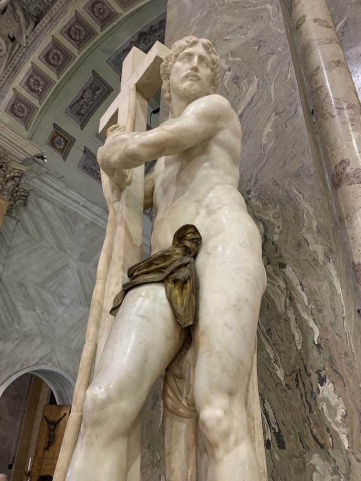 Irriverente Michelangelo, come nel suo carattere, poiché persino la scultura “Cristo alla Croce” viene scolpita nella sua nudità ritenuta inaccettabile, ma poi coperta nella sua parte intima non da lui. La statua marmorea (h. 2025 ) realizzata nel 1509 – 1520 ca. è conservata nella Basilica di Santa Maria sopra Minerva a Roma. Rocambolesca è stata la realizzazione in più versioni. Il drappeggio del bronzo dorato copre come detto le parti intime del Cristo, collocato dopo il Concilio di Trento. Non si fa scrupoli Michelangelo, progetta e realizza la scultura senza inibizioni, la nudità e la carnalità nelle sue opere costituiscono elementi imprescindibili per affermare il linguaggio della cultura senza censure o imposizioni da parte delle committenze. La scultura “Cristo alla Croce” è in perfetta torsione, elegante e molto anatomica con il baricentro posto sulla gamba sinistra, mentre quella destra è libera, si flette lievemente, il tallone si alza. Le braccia si contrappongono alla torsione del busto. La testa si volge ignorando la pesante croce di un Cristo Risorto, liberato, con il volto austero ed elegante nei tratti anatomici. Le mani cingono la croce, quella destra avvolge l’asse della croce e con l’indice piegato sembra pronunciare, indicandolo, l’atto e l’oggetto del suo martirio ma senza dargli troppo importanza, anzi è “distante”, è il passato declinato, mentre la mano destra tiene la spugna avvolta da una corda e issata dal lungo bastone di canna allungato fino al suo volto sofferente inchiodato sulla croce. L’anatomia del corpo con il suo pronunciamento muscolare rimanda allo spirito libero di Michelangelo, che nella sua vita ha dettato alle committenze i principi della scultura e della pittura che si uniscono, senza mediazioni.
