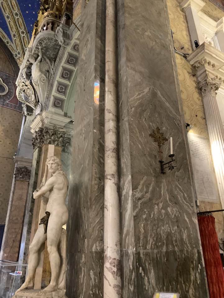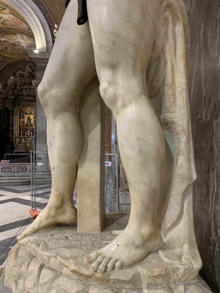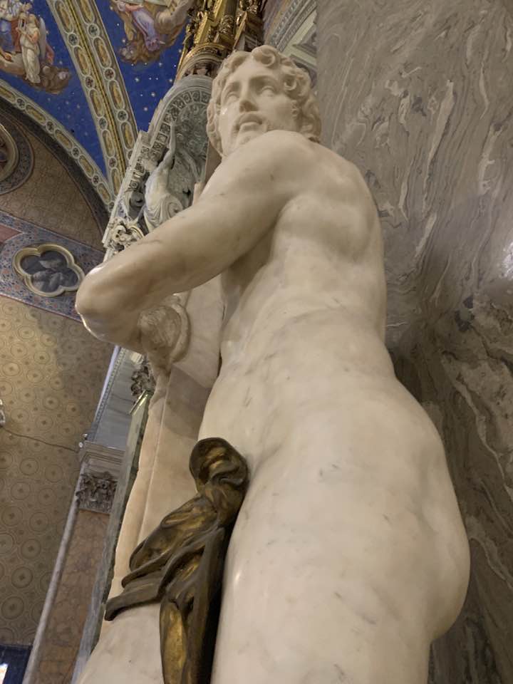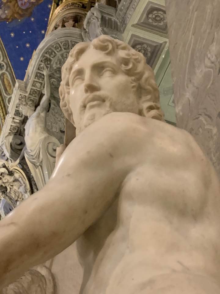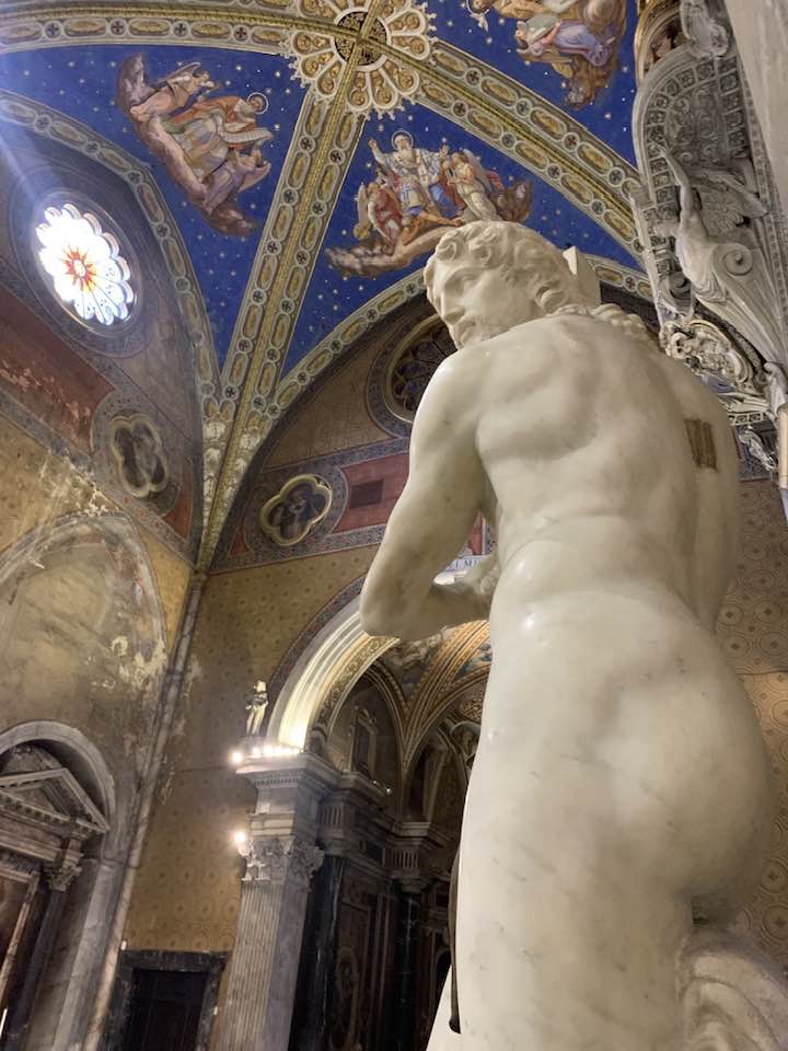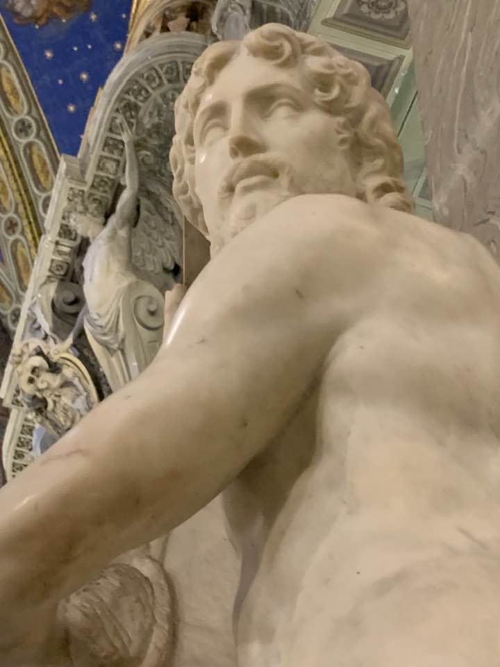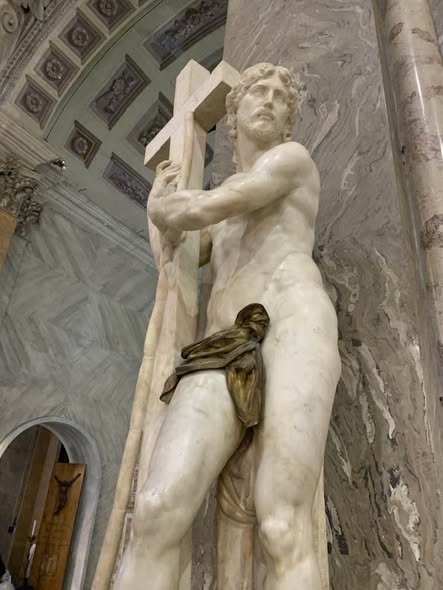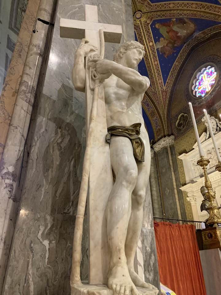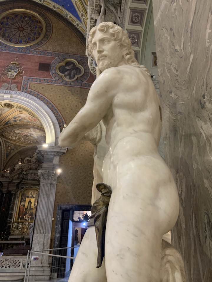 Irriverente Michelangelo, come nel suo carattere, poiché persino la scultura “Cristo alla Croce” viene scolpita nella sua nudità ritenuta inaccettabile, ma poi coperta nella sua parte intima non da lui. La statua marmorea (h. 2025 ) realizzata nel 1509 – 1520 ca. è conservata nella Basilica di Santa Maria sopra Minerva a Roma. Rocambolesca è stata la realizzazione in più versioni. Il drappeggio del bronzo dorato copre come detto le parti intime del Cristo, collocato dopo il Concilio di Trento. Non si fa scrupoli Michelangelo, progetta e realizza la scultura senza inibizioni, la nudità e la carnalità nelle sue opere costituiscono elementi imprescindibili per affermare il linguaggio della cultura senza censure o imposizioni da parte delle committenze. La scultura “Cristo alla Croce” è in perfetta torsione, elegante e molto anatomica con il baricentro posto sulla gamba sinistra, mentre quella destra è libera, si flette lievemente, il tallone si alza. Le braccia si contrappongono alla torsione del busto. La testa si volge ignorando la pesante croce di un Cristo Risorto, liberato, con il volto austero ed elegante nei tratti anatomici. Le mani cingono la croce, quella destra avvolge l’asse della croce e con l’indice piegato sembra pronunciare, indicandolo, l’atto e l’oggetto del suo martirio ma senza dargli troppo importanza, anzi è “distante”, è il passato declinato, mentre la mano destra tiene la spugna avvolta da una corda e issata dal lungo bastone di canna allungato fino al suo volto sofferente inchiodato sulla croce. L’anatomia del corpo con il suo pronunciamento muscolare rimanda allo spirito libero di Michelangelo, che nella sua vita ha dettato alle committenze i principi della scultura e della pittura che si uniscono, senza mediazioni.