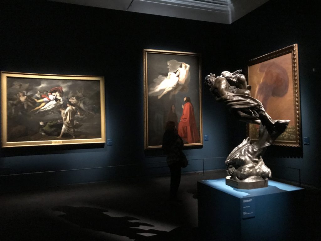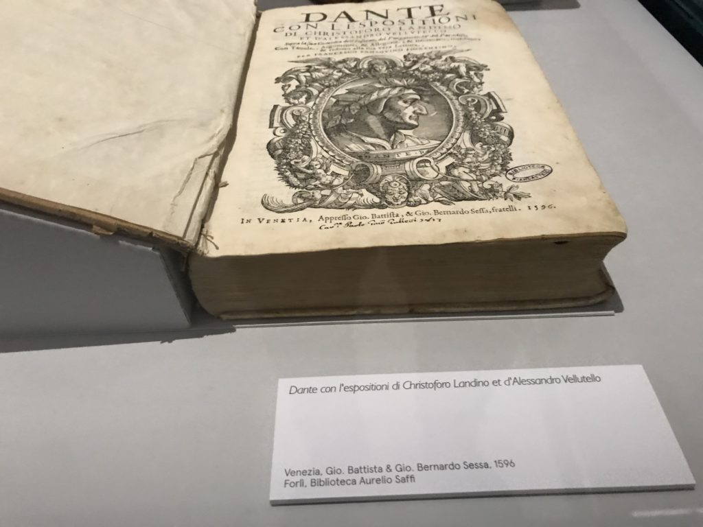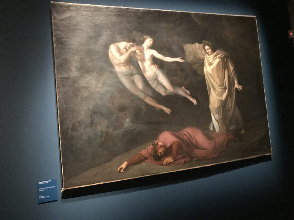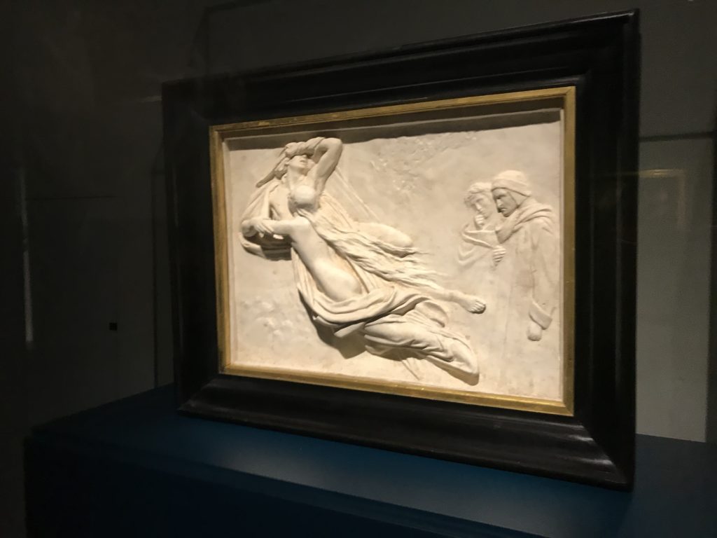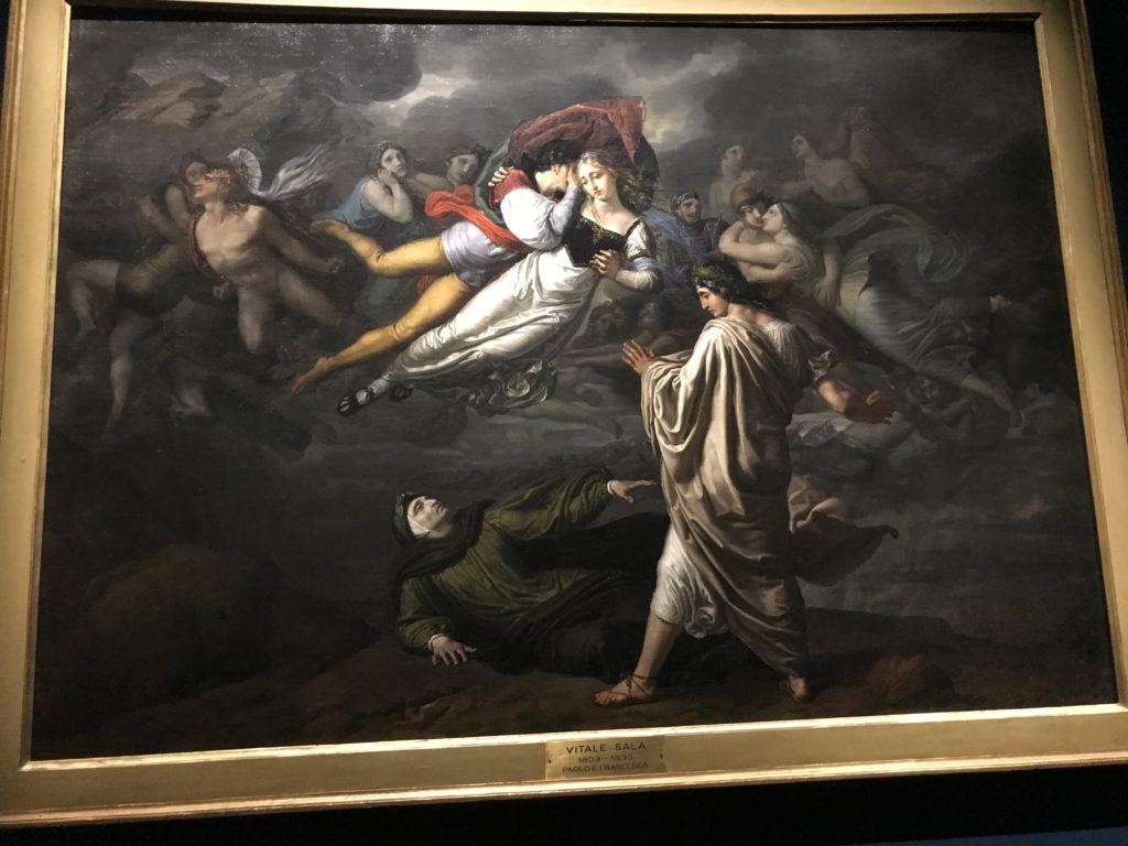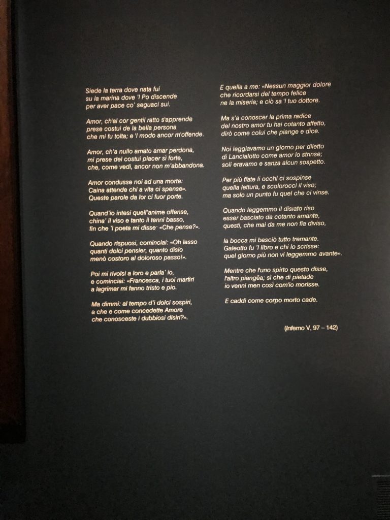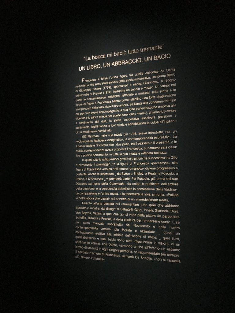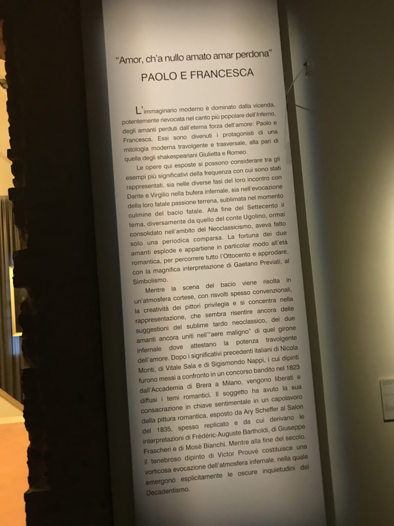 Forlì, tra il 1302 e 1313, è frequentata da Dante Alighieri, esule politico poiché ghibellino. La grande mostra multimediale sulla “Commedia”, e con rari pezzi provenienti da tutto il mondo, vuole rendere omaggio alla città romagnola. La figura di Dante è centrale, appunto, nella mostra “Dante, la visione dell’arte”, per le contaminazioni culturali in un arco temporale che va dal Duecento al Novecento. Le visioni figurative e a tratti oniriche di Cimabue, Giotto, Beato Angelico, Michelangelo, Tintoretto, Canova, Andrea del Castagno e molti altri sono state allestite, tutte, intorno al Sommo Poeta; e poi i preraffaeliti con Dante Gabriele Rossetti, i macchiaioli, i simbolisti e il Novecento di Galileo Chini, Plinio Nomellini, Felice Casorati, Lucio Fontana, Pablo Picasso. Più che una mostra, “Dante. La visione dell’arte”, nel settimo centenario della sua morte, è un evento culturale, un’occasione unica tra dipinti, sculture, disegni, illustrazioni e manoscritti. Beato Angelico, Michelangelo, Tintoretto gli autori che non ci si aspetta di vedere con alcune particolari opere (escono di rado dai loro musei), e oltre i maestri del Novecento su cui spicca Previati con il dipinto simbolista “Paolo e Francesca” di grande suggestione. La narrazione della “Divina Commedia” è l’asse centrale dell’esposizione intorno alla quale le arti visive si sono inchinate e hanno reso visuale e comunicativo per secoli, appunto, il suo testo, Michelangelo per primo, come effetto a dir poco esaltante della grande pittura scenica senza censure (inizialmente) nel “Giudizio” della Cappella Sistina. La mostra si pone su un livello internazionale, assolutamente da visitare, ho detto ai ragazzi del liceo “D. Cotugno” – L’Aquila durante l’esame di Stato. I grandi musei del pianeta: dall’Hermitage di San Pietroburgo, alla Walker Art Gallery di Liverpool, dalla National Gallery di Sofia alla Staatliche Kunstsammlungen di Dresda, dal Museum of Art di Toledo ai Musée des Beaux-Art di Nancy, di Tours, di Anger hanno fornito le loro più importanti collezioni insieme a quelli italiani: Galleria Nazionale d’Arte Moderna e Contemporanea di Roma, la Galleria Borghese, i Musei Vaticani e la Biblioteca Apostolica Vaticana, la Biblioteca Medicea Laurenziana, il Museo di Capodimonte. La visita. E’ come entrare in una dimensione sospesa che non si aspetta, bisogna poi avere il “Filo di Arianna” per muoversi nel complesso percorso espositivo – come fosse una capsula fuori dal tempo e dallo spazio – dentro musica, pittura, le parole e i versi di Dante proiettati nel complesso dei musei – convento di San Domenico come una sorta di ” lancio mediatico” insieme ai libri rari, proiezioni multimediali, allestimenti scenici, e infine trascorrere nella mostra un tempo particolare nel fascino interdisciplinare dei linguaggi e delle arti – un caleidoscopio che si muove nella griglia dei percorsi espositivi, – come non mai si potrà vedere per molti e molti anni nella grande bellezza figurativa, visionaria degli artisti, di secoli e secoli di interpretazioni su Dante, intorno a Dante, fino ai giorni d’oggi. La mostra: un’esperienza subliminale con i manoscritti e le prime edizioni a stampa della “Commedia”, i codici miniati del XIV e XV secolo, la stagione rinascimentale, il Neoclassicismo e la cultura preromantica e romantica, il Genio insomma, catalizza, anche il Risorgimento, la Prima Guerra Mondiale, e infine nella grafica e le edizioni a stampa tra la fine del Settecento e il Novecento mentre, nella scuola, Dante è sempre attuale e centrale per la formazione degli studenti, e per quel quinto canto dell’Inferno – l’ingresso nel Secondo Cerchio, i lussuriosi- divenuto un simbolo per un frastornato Dante. Vede loro che volano “due che ‘nsieme vanno,/ e paiono sì al vento esser , leggieri”… ( e come si diceva la straordinaria la pittura di Previati dei due amanti…) . Ma chi sono? Si svelano, ecco, l’incontro. Paolo e Francesca. In quel luogo buio e tetro di violenza, di bufera incessante, dove riecheggiano i pianti e gli stenti, si sente “ muggire” il vento, e i flussi di corrente contrari, e questa tempesta infernale non si arresta mai, trascina gli spiriti con la sua violenza, in particolare quando arrivano davanti al bordo del baratro infernale: la bufera delle passioni in vita è ora presente in quel luogo infimo dei lussuriosi, viceversa, Dante, utilizza parole che evocano la vita : “colombe”, “dolce”, “amor” quasi a tentare di assolverli, i due amanti, sdoganarli, i due amanti, a favore del “troppo amato…”, ma condannati infine all’ eterno dolore. Una dicotomia. Dunque lei, Francesca, parla, Paolo l’amore indissolubile piange intorno a lei, Dante è turbato, ha pena per quella categoria di dannati e Francesca è il primo peccatore a dialogare con lui che, sopraffatto, sviene. Una ulteriore prova della partecipazione emotiva davanti alla forza morale di Francesca, del suo spirito e della custodia, è l’affidamento e la protezione che ha nei confronti di Paolo quasi fosse indifeso. Ecco, ancora, torna l’interpretazione di Previati simbolista, visionario, che dipinge una versione di Paolo Malatesta e Francesca da Polenta (Paolo e Francesca, 1909, olio su tela, cm 230 x 260 ) nel vortice di quel campo visivo di una bellezza cruda, “oltre i confini della cornice”, la luminosità vibrante, elegante, immateriale dalle pennellate ondulate, i due volti cupi e solcati dalla stanchezza, i corpi giovani ma segnati dal dolore che si avvinghiano e salgono, quasi una levitazione alla ricerca della luce e dell’ossigeno sopra di loro, e le mani che si uniscono, i lunghi capelli rossi di Francesca che si sollevano dal corpo nel quadro quasi attratti da una forza occulta ascendente, i due corpi illuminati da un fascio di luce e dai colori tonali caldi e freddi nelle varianti cromatiche dell’ocra, della biacca, dei pas