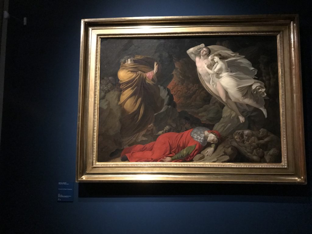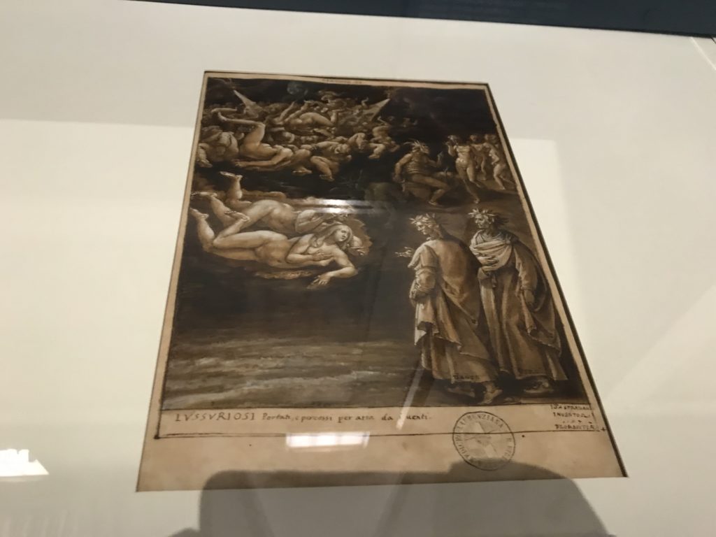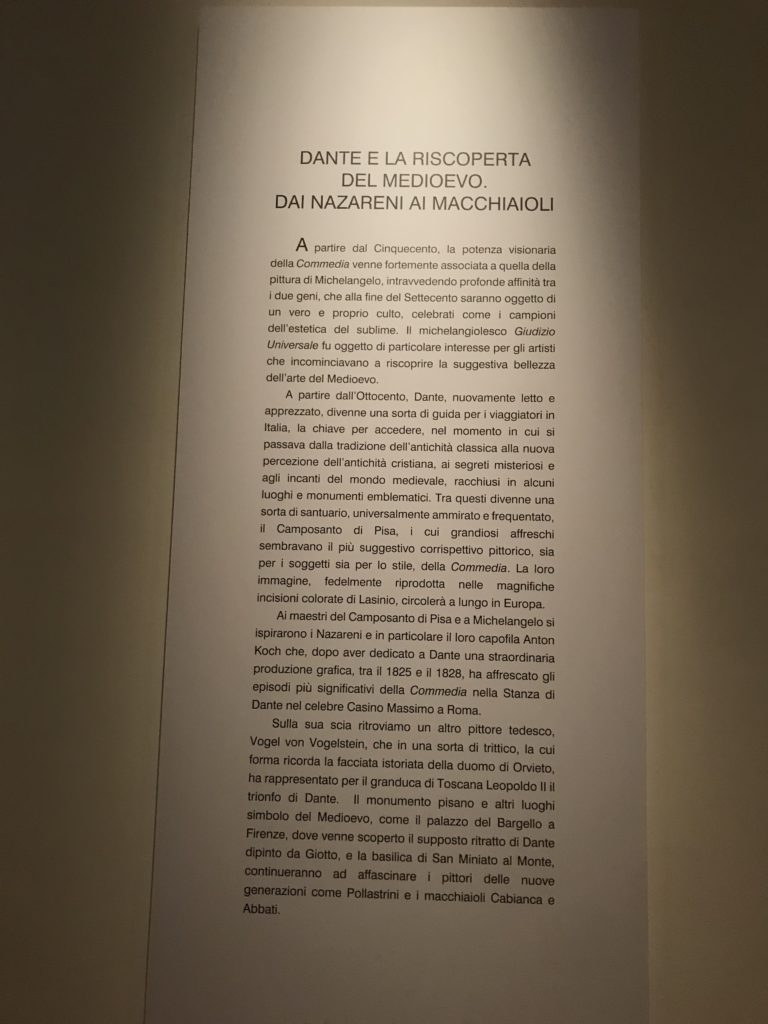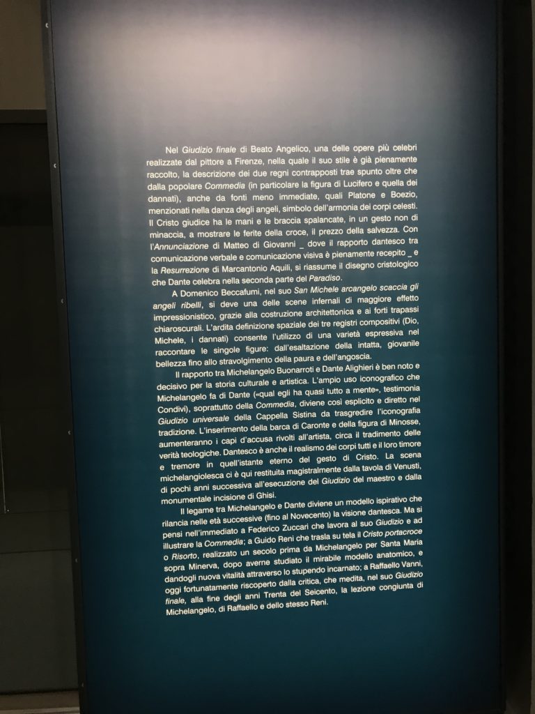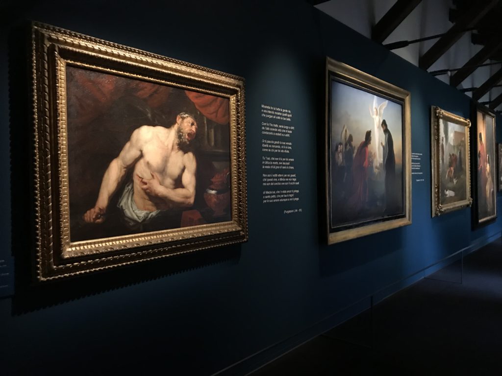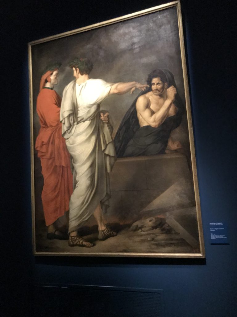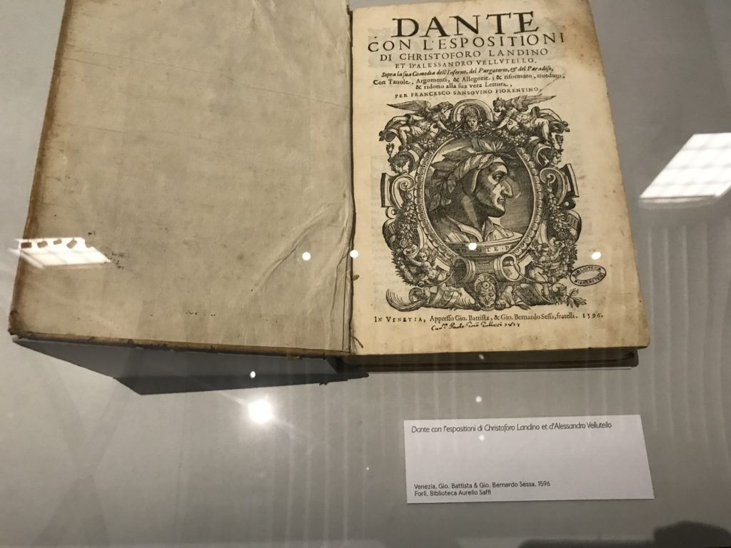 Forlì, tra il 1302 e 1313, è frequentata da Dante Alighieri, esule politico poiché ghibellino. La grande mostra multimediale sulla “Commedia”, e con rari pezzi provenienti da tutto il mondo, vuole rendere omaggio alla città romagnola. La figura di Dante è centrale, appunto, nella mostra “Dante, la visione dell’arte”, per le contaminazioni culturali in un arco temporale che va dal Duecento al Novecento. Le visioni figurative e a tratti oniriche di Cimabue, Giotto, Beato Angelico, Michelangelo, Tintoretto, Canova, Andrea del Castagno e molti altri sono state allestite, tutte, intorno al Sommo Poeta; e poi i preraffaeliti con Dante Gabriele Rossetti, i macchiaioli, i simbolisti e il Novecento di Galileo Chini, Plinio Nomellini, Felice Casorati, Lucio Fontana, Pablo Picasso. Più che una mostra, “Dante. La visione dell’arte”, nel settimo centenario della sua morte, è un evento culturale, un’occasione unica tra dipinti, sculture, disegni, illustrazioni e manoscritti. Beato Angelico, Michelangelo, Tintoretto gli autori che non ci si aspetta di vedere con alcune particolari opere (escono di rado dai loro musei), e oltre i maestri del Novecento su cui spicca Previati con il dipinto simbolista “Paolo e Francesca” di grande suggestione. La narrazione della “Divina Commedia” è l’asse centrale dell’esposizione intorno alla quale le arti visive si sono inchinate e hanno reso visuale e comunicativo per secoli, appunto, il suo testo, Michelangelo per primo, come effetto a dir poco esaltante della grande pittura scenica senza censure (inizialmente) nel “Giudizio” della Cappella Sistina. La mostra si pone su un livello internazionale, assolutamente da visitare, ho detto ai ragazzi del liceo “D. Cotugno” – L’Aquila durante l’esame di Stato. I grandi musei del pianeta: dall’Hermitage di San Pietroburgo, alla Walker Art Gallery di Liverpool, dalla National Gallery di Sofia alla Staatliche Kunstsammlungen di Dresda, dal Museum of Art di Toledo ai Musée des Beaux-Art di Nancy, di Tours, di Anger hanno fornito le loro più importanti collezioni insieme a quelli italiani: Galleria Nazionale d’Arte Moderna e Contemporanea di Roma, la Galleria Borghese, i Musei Vaticani e la Biblioteca Apostolica Vaticana, la Biblioteca Medicea Laurenziana, il Museo di Capodimonte. La visita. E’ come entrare in una dimensione sospesa che non si aspetta, bisogna poi avere il “Filo di Arianna” per muoversi nel complesso percorso espositivo – come fosse una capsula fuori dal tempo e dallo spazio – dentro musica, pittura, le parole e i versi di Dante proiettati nel complesso dei musei – convento di San Domenico come una sorta di ” lancio mediatico” insieme ai libri rari, proiezioni multimediali, allestimenti scenici, e infine trascorrere nella mostra un tempo particolare nel fascino interdisciplinare dei linguaggi e delle arti – un caleidoscopio che si muove nella griglia dei percorsi espositivi, – come non mai si potrà vedere per molti e molti anni nella grande bellezza figurativa, visionaria degli artisti, di secoli e secoli di interpretazioni su Dante, intorno a Dante, fino ai giorni d’oggi. La mostra: un’esperienza subliminale con i manoscritti e le prime edizioni a stampa della “Commedia”, i codici miniati del XIV e XV secolo, la stagione rinascimentale, il Neoclassicismo e la cultura preromantica e romantica, il Genio insomma, catalizza, anche il Risorgimento, la Prima Guerra Mondiale, e infine nella grafica e le edizioni a stampa tra la fine del Settecento e il Novecento mentre, nella scuola, Dante è sempre attuale e centrale per la formazione degli studenti, e per quel quinto canto dell’Inferno – l’ingresso nel Secondo Cerchio, i lussuriosi- divenuto un simbolo per un frastornato Dante. Vede loro che volano “due che ‘nsieme vanno,/ e paiono sì al vento esser , leggieri”… ( e come si diceva la straordinaria la pittura di Previati dei due amanti…) . Ma chi sono? Si svelano, ecco, l’incontro. Paolo e Francesca. In quel luogo buio e tetro di violenza, di bufera incessante, dove riecheggiano i pianti e gli stenti, si sente “ muggire” il vento, e i flussi di corrente contrari, e questa tempesta infernale non si arresta mai, trascina gli spiriti con la sua violenza, in particolare quando arrivano davanti al bordo del baratro infernale: la bufera delle passioni in vita è ora presente in quel luogo infimo dei lussuriosi, viceversa, Dante, utilizza parole che evocano la vita : “colombe”, “dolce”, “amor” quasi a tentare di assolverli, i due amanti, sdoganarli, i due amanti, a favore del “troppo amato…”, ma condannati infine all’ eterno dolore. Una dicotomia. Dunque lei, Francesca, parla, Paolo l’amore indissolubile piange intorno a lei, Dante è turbato, ha pena per quella categoria di dannati e Francesca è il primo peccatore a dialogare con lui che, sopraffatto, sviene. Una ulteriore prova della partecipazione emotiva davanti alla forza morale di Francesca, del suo spirito e della custodia, è l’affidamento e la protezione che ha nei confronti di Paolo quasi fosse indifeso. Ecco, ancora, torna l’interpretazione di Previati simbolista, visionario, che dipinge una versione di Paolo Malatesta e Francesca da Polenta (Paolo e Francesca, 1909, olio su tela, cm 230 x 260 ) nel vortice di quel campo visivo di una bellezza cruda, “oltre i confini della cornice”, la luminosità vibrante, elegante, immateriale dalle pennellate ondulate, i due volti cupi e solcati dalla stanchezza, i corpi giovani ma segnati dal dolore che si avvinghiano e salgono, quasi una levitazione alla ricerca della luce e dell’ossigeno sopra di loro, e le mani che si uniscono, i lunghi capelli rossi di Francesca che si sollevano dal corpo nel quadro quasi attratti da una forza occulta ascendente, i due corpi illuminati da un fascio di luce e dai colori tonali caldi e freddi nelle varianti cromatiche dell’ocra, della biacca, dei pas