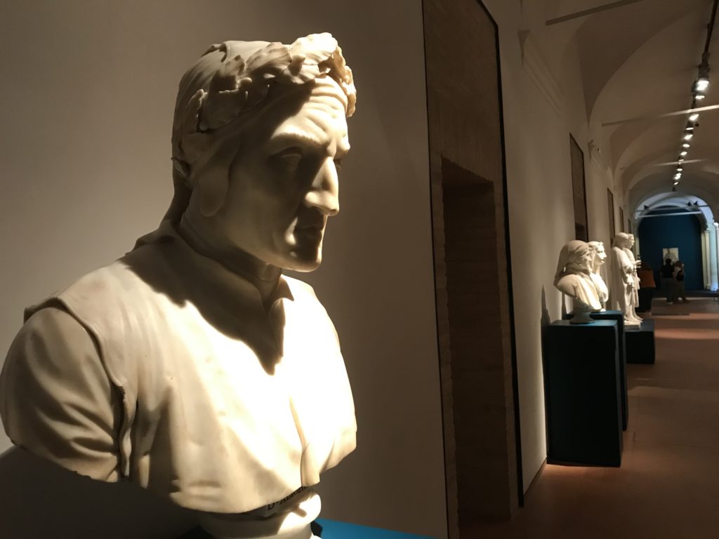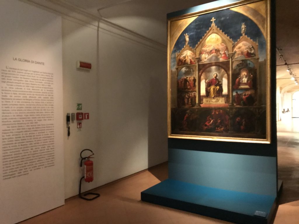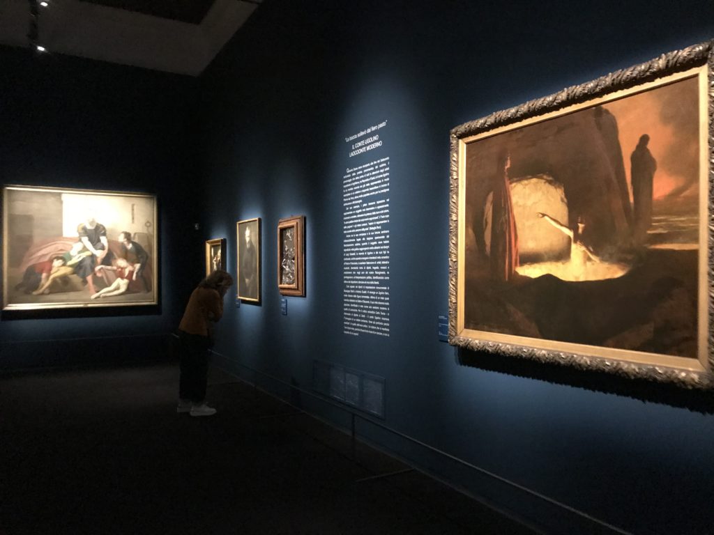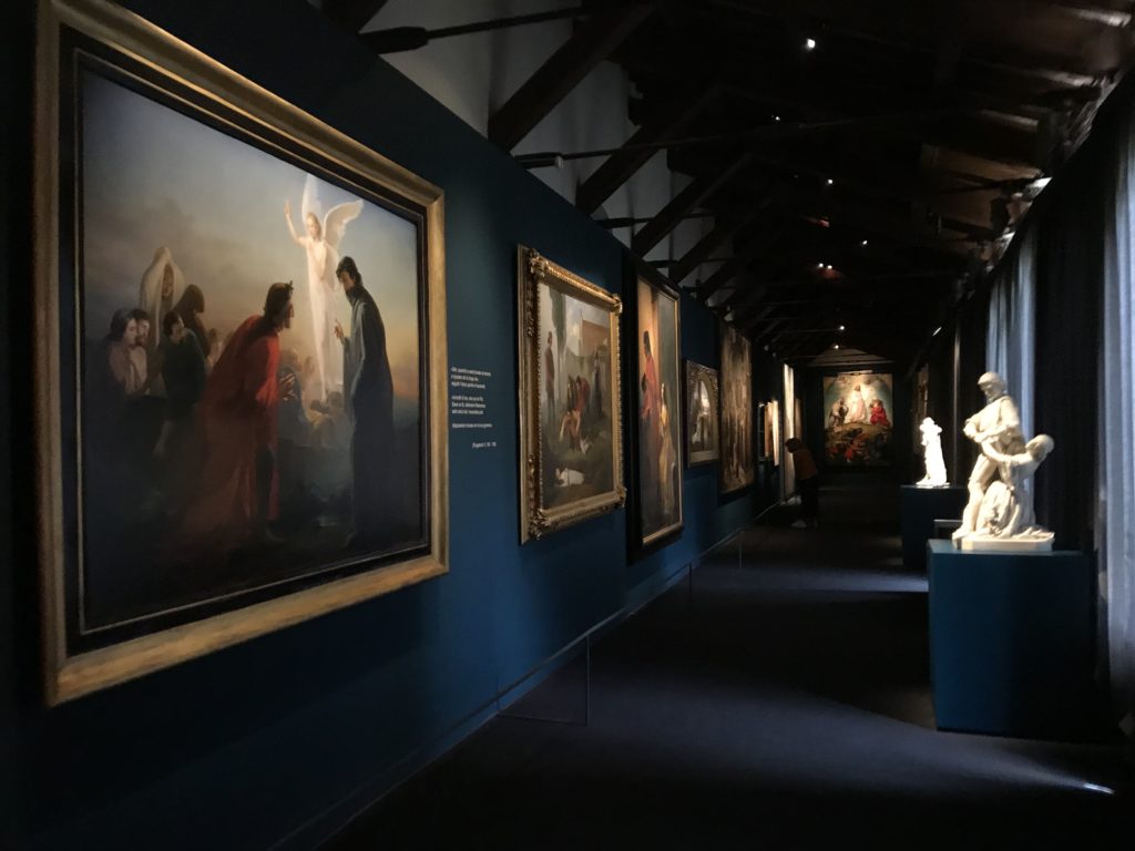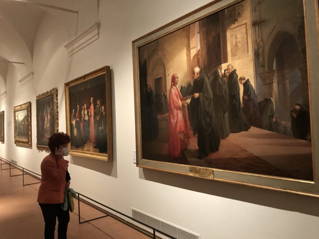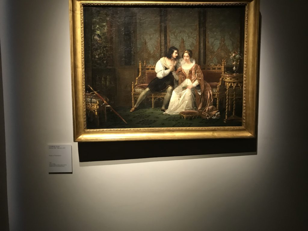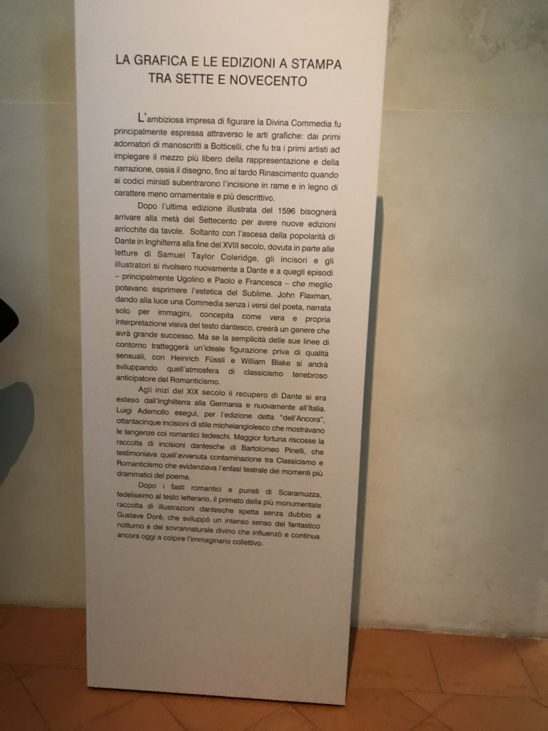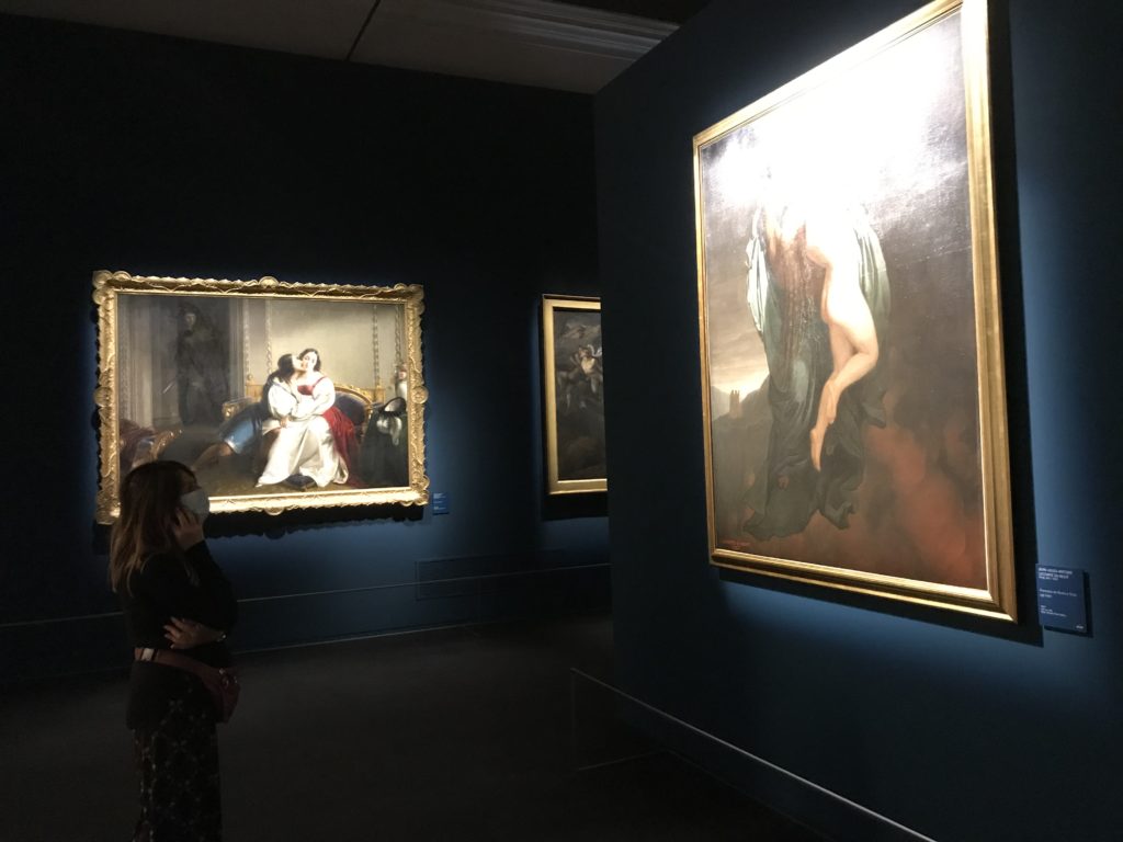 Forlì, tra il 1302 e 1313, è frequentata da Dante Alighieri, esule politico poiché ghibellino. La grande mostra multimediale sulla “Commedia”, e con rari pezzi provenienti da tutto il mondo, vuole rendere omaggio alla città romagnola. La figura di Dante è centrale, appunto, nella mostra “Dante, la visione dell’arte”, per le contaminazioni culturali in un arco temporale che va dal Duecento al Novecento. Le visioni figurative e a tratti oniriche di Cimabue, Giotto, Beato Angelico, Michelangelo, Tintoretto, Canova, Andrea del Castagno e molti altri sono state allestite, tutte, intorno al Sommo Poeta; e poi i preraffaeliti con Dante Gabriele Rossetti, i macchiaioli, i simbolisti e il Novecento di Galileo Chini, Plinio Nomellini, Felice Casorati, Lucio Fontana, Pablo Picasso. Più che una mostra, “Dante. La visione dell’arte”, nel settimo centenario della sua morte, è un evento culturale, un’occasione unica tra dipinti, sculture, disegni, illustrazioni e manoscritti. Beato Angelico, Michelangelo, Tintoretto gli autori che non ci si aspetta di vedere con alcune particolari opere (escono di rado dai loro musei), e oltre i maestri del Novecento su cui spicca Previati con il dipinto simbolista “Paolo e Francesca” di grande suggestione. La narrazione della “Divina Commedia” è l’asse centrale dell’esposizione intorno alla quale le arti visive si sono inchinate e hanno reso visuale e comunicativo per secoli, appunto, il suo testo, Michelangelo per primo, come effetto a dir poco esaltante della grande pittura scenica senza censure (inizialmente) nel “Giudizio” della Cappella Sistina. La mostra si pone su un livello internazionale, assolutamente da visitare, ho detto ai ragazzi del liceo “D. Cotugno” – L’Aquila durante l’esame di Stato. I grandi musei del pianeta: dall’Hermitage di San Pietroburgo, alla Walker Art Gallery di Liverpool, dalla National Gallery di Sofia alla Staatliche Kunstsammlungen di Dresda, dal Museum of Art di Toledo ai Musée des Beaux-Art di Nancy, di Tours, di Anger hanno fornito le loro più importanti collezioni insieme a quelli italiani: Galleria Nazionale d’Arte Moderna e Contemporanea di Roma, la Galleria Borghese, i Musei Vaticani e la Biblioteca Apostolica Vaticana, la Biblioteca Medicea Laurenziana, il Museo di Capodimonte. La visita. E’ come entrare in una dimensione sospesa che non si aspetta, bisogna poi avere il “Filo di Arianna” per muoversi nel complesso percorso espositivo – come fosse una capsula fuori dal tempo e dallo spazio – dentro musica, pittura, le parole e i versi di Dante proiettati nel complesso dei musei – convento di San Domenico come una sorta di ” lancio mediatico” insieme ai libri rari, proiezioni multimediali, allestimenti scenici, e infine trascorrere nella mostra un tempo particolare nel fascino interdisciplinare dei linguaggi e delle arti – un caleidoscopio che si muove nella griglia dei percorsi espositivi, – come non mai si potrà vedere per molti e molti anni nella grande bellezza figurativa, visionaria degli artisti, di secoli e secoli di interpretazioni su Dante, intorno a Dante, fino ai giorni d’oggi. La mostra: un’esperienza subliminale con i manoscritti e le prime edizioni a stampa della “Commedia”, i codici miniati del XIV e XV secolo, la stagione rinascimentale, il Neoclassicismo e la cultura preromantica e romantica, il Genio insomma, catalizza, anche il Risorgimento, la Prima Guerra Mondiale, e infine nella grafica e le edizioni a stampa tra la fine del Settecento e il Novecento mentre, nella scuola, Dante è sempre attuale e centrale per la formazione degli studenti, e per quel quinto canto dell’Inferno – l’ingresso nel Secondo Cerchio, i lussuriosi- divenuto un simbolo per un frastornato Dante. Vede loro che volano “due che ‘nsieme vanno,/ e paiono sì al vento esser , leggieri”… ( e come si diceva la straordinaria la pittura di Previati dei due amanti…) . Ma chi sono? Si svelano, ecco, l’incontro. Paolo e Francesca. In quel luogo buio e tetro di violenza, di bufera incessante, dove riecheggiano i pianti e gli stenti, si sente “ muggire” il vento, e i flussi di corrente contrari, e questa tempesta infernale non si arresta mai, trascina gli spiriti con la sua violenza, in particolare quando arrivano davanti al bordo del baratro infernale: la bufera delle passioni in vita è ora presente in quel luogo infimo dei lussuriosi, viceversa, Dante, utilizza parole che evocano la vita : “colombe”, “dolce”, “amor” quasi a tentare di assolverli, i due amanti, sdoganarli, i due amanti, a favore del “troppo amato…”, ma condannati infine all’ eterno dolore. Una dicotomia. Dunque lei, Francesca, parla, Paolo l’amore indissolubile piange intorno a lei, Dante è turbato, ha pena per quella categoria di dannati e Francesca è il primo peccatore a dialogare con lui che, sopraffatto, sviene. Una ulteriore prova della partecipazione emotiva davanti alla forza morale di Francesca, del suo spirito e della custodia, è l’affidamento e la protezione che ha nei confronti di Paolo quasi fosse indifeso. Ecco, ancora, torna l’interpretazione di Previati simbolista, visionario, che dipinge una versione di Paolo Malatesta e Francesca da Polenta (Paolo e Francesca, 1909, olio su tela, cm 230 x 260 ) nel vortice di quel campo visivo di una bellezza cruda, “oltre i confini della cornice”, la luminosità vibrante, elegante, immateriale dalle pennellate ondulate, i due volti cupi e solcati dalla stanchezza, i corpi giovani ma segnati dal dolore che si avvinghiano e salgono, quasi una levitazione alla ricerca della luce e dell’ossigeno sopra di loro, e le mani che si uniscono, i lunghi capelli rossi di Francesca che si sollevano dal corpo nel quadro quasi attratti da una forza occulta ascendente, i due corpi illuminati da un fascio di luce e dai colori tonali caldi e freddi nelle varianti cromatiche dell’ocra, della biacca, dei pas