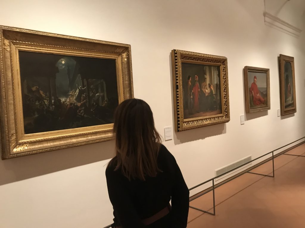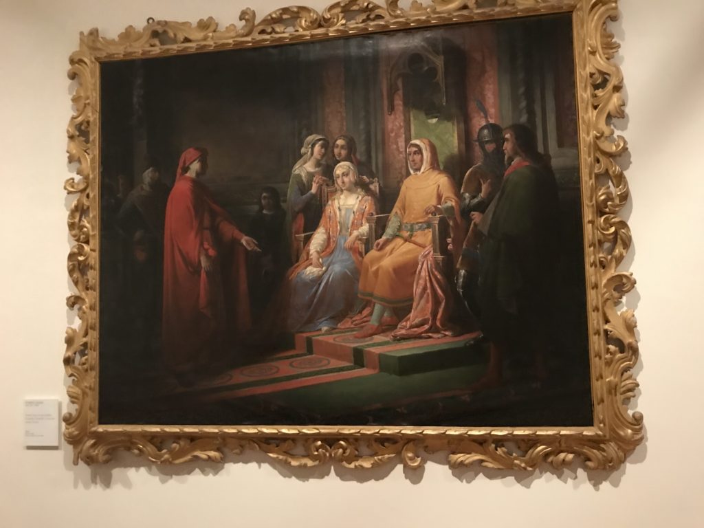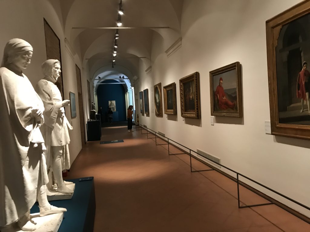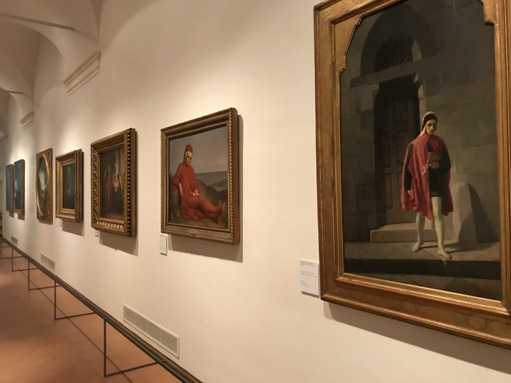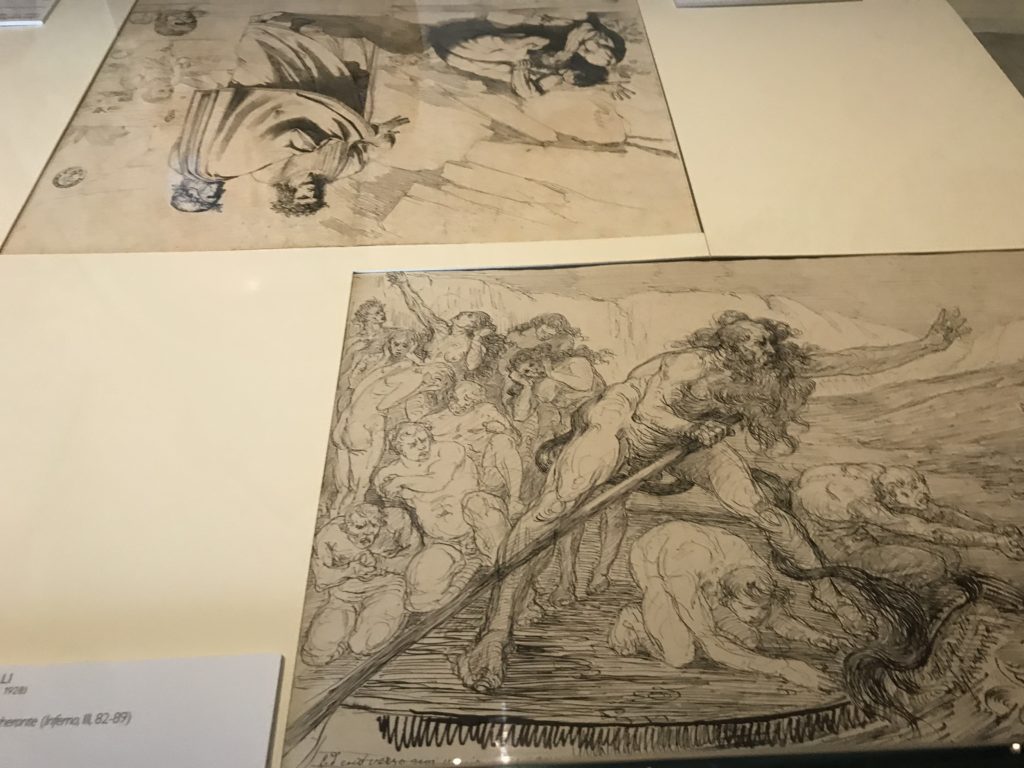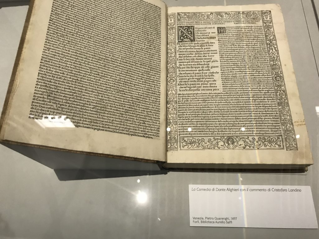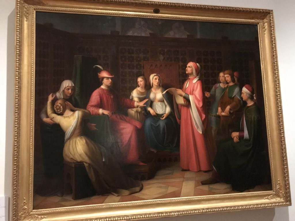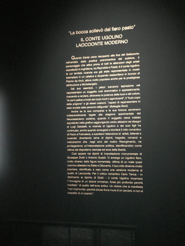Forlì, tra il 1302 e 1313, è frequentata da Dante Alighieri, esule politico poiché ghibellino. La grande mostra multimediale sulla “Commedia”, e con rari pezzi provenienti da tutto il mondo, vuole rendere omaggio alla città romagnola. La figura di Dante è centrale, appunto, nella mostra “Dante, la visione dell’arte”, per le contaminazioni culturali in un arco temporale che va dal Duecento al Novecento. Le visioni figurative e a tratti oniriche di Cimabue, Giotto, Beato Angelico, Michelangelo, Tintoretto, Canova, Andrea del Castagno e molti altri sono state allestite, tutte, intorno al Sommo Poeta; e poi i preraffaeliti con Dante Gabriele Rossetti, i macchiaioli, i simbolisti e il Novecento di Galileo Chini, Plinio Nomellini, Felice Casorati, Lucio Fontana, Pablo Picasso. Più che una mostra, “Dante. La visione dell’arte”, nel settimo centenario della sua morte, è un evento culturale, un’occasione unica tra dipinti, sculture, disegni, illustrazioni e manoscritti. Beato Angelico, Michelangelo, Tintoretto gli autori che non ci si aspetta di vedere con alcune particolari opere (escono di rado dai loro musei), e oltre i maestri del Novecento su cui spicca Previati con il dipinto simbolista “Paolo e Francesca” di grande suggestione. La narrazione della “Divina Commedia” è l’asse centrale dell’esposizione intorno alla quale le arti visive si sono inchinate e hanno reso visuale e comunicativo per secoli, appunto, il suo testo, Michelangelo per primo, come effetto a dir poco esaltante della grande pittura scenica senza censure (inizialmente) nel “Giudizio” della Cappella Sistina. La mostra si pone su un livello internazionale, assolutamente da visitare, ho detto ai ragazzi del liceo “D. Cotugno” – L’Aquila durante l’esame di Stato. I grandi musei del pianeta: dall’Hermitage di San Pietroburgo, alla Walker Art Gallery di Liverpool, dalla National Gallery di Sofia alla Staatliche Kunstsammlungen di Dresda, dal Museum of Art di Toledo ai Musée des Beaux-Art di Nancy, di Tours, di Anger hanno fornito le loro più importanti collezioni insieme a quelli italiani: Galleria Nazionale d’Arte Moderna e Contemporanea di Roma, la Galleria Borghese, i Musei Vaticani e la Biblioteca Apostolica Vaticana, la Biblioteca Medicea Laurenziana, il Museo di Capodimonte. La visita. E’ come entrare in una dimensione sospesa che non si aspetta, bisogna poi avere il “Filo di Arianna” per muoversi nel complesso percorso espositivo – come fosse una capsula fuori dal tempo e dallo spazio – dentro musica, pittura, le parole e i versi di Dante proiettati nel complesso dei musei – convento di San Domenico come una sorta di ” lancio mediatico” insieme ai libri rari, proiezioni multimediali, allestimenti scenici, e infine trascorrere nella mostra un tempo particolare nel fascino interdisciplinare dei linguaggi e delle arti – un caleidoscopio che si muove nella griglia dei percorsi espositivi, – come non mai si potrà vedere per molti e molti anni nella grande bellezza figurativa, visionaria degli artisti, di secoli e secoli di interpretazioni su Dante, intorno a Dante, fino ai giorni d’oggi. La mostra: un’esperienza subliminale con i manoscritti e le prime edizioni a stampa della “Commedia”, i codici miniati del XIV e XV secolo, la stagione rinascimentale, il Neoclassicismo e la cultura preromantica e romantica, il Genio insomma, catalizza, anche il Risorgimento, la Prima Guerra Mondiale, e infine nella grafica e le edizioni a stampa tra la fine del Settecento e il Novecento mentre, nella scuola, Dante è sempre attuale e centrale per la formazione degli studenti, e per quel quinto canto dell’Inferno – l’ingresso nel Secondo Cerchio, i lussuriosi- divenuto un simbolo per un frastornato Dante. Vede loro che volano “due che ‘nsieme vanno,/ e paiono sì al vento esser , leggieri”… ( e come si diceva la straordinaria la pittura di Previati dei due amanti…) . Ma chi sono? Si svelano, ecco, l’incontro. Paolo e Francesca. In quel luogo buio e tetro di violenza, di bufera incessante, dove riecheggiano i pianti e gli stenti, si sente “ muggire” il vento, e i flussi di corrente contrari, e questa tempesta infernale non si arresta mai, trascina gli spiriti con la sua violenza, in particolare quando arrivano davanti al bordo del baratro infernale: la bufera delle passioni in vita è ora presente in quel luogo infimo dei lussuriosi, viceversa, Dante, utilizza parole che evocano la vita : “colombe”, “dolce”, “amor” quasi a tentare di assolverli, i due amanti, sdoganarli, i due amanti, a favore del “troppo amato…”, ma condannati infine all’ eterno dolore. Una dicotomia. Dunque lei, Francesca, parla, Paolo l’amore indissolubile piange intorno a lei, Dante è turbato, ha pena per quella categoria di dannati e Francesca è il primo peccatore a dialogare con lui che, sopraffatto, sviene. Una ulteriore prova della partecipazione emotiva davanti alla forza morale di Francesca, del suo spirito e della custodia, è l’affidamento e la protezione che ha nei confronti di Paolo quasi fosse indifeso. Ecco, ancora, torna l’interpretazione di Previati simbolista, visionario, che dipinge una versione di Paolo Malatesta e Francesca da Polenta (Paolo e Francesca, 1909, olio su tela, cm 230 x 260 ) nel vortice di quel campo visivo di una bellezza cruda, “oltre i confini della cornice”, la luminosità vibrante, elegante, immateriale dalle pennellate ondulate, i due volti cupi e solcati dalla stanchezza, i corpi giovani ma segnati dal dolore che si avvinghiano e salgono, quasi una levitazione alla ricerca della luce e dell’ossigeno sopra di loro, e le mani che si uniscono, i lunghi capelli rossi di Francesca che si sollevano dal corpo nel quadro quasi attratti da una forza occulta ascendente, i due corpi illuminati da un fascio di luce e dai colori tonali caldi e freddi nelle varianti cromatiche dell’ocra, della biacca, dei pas