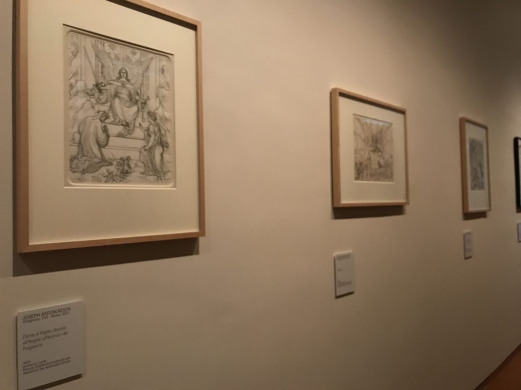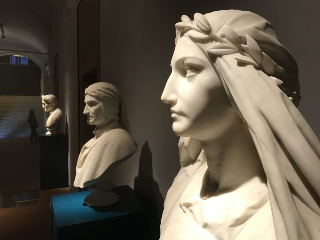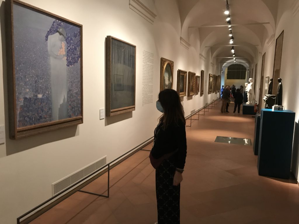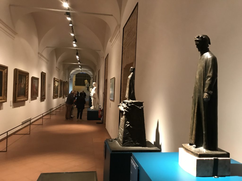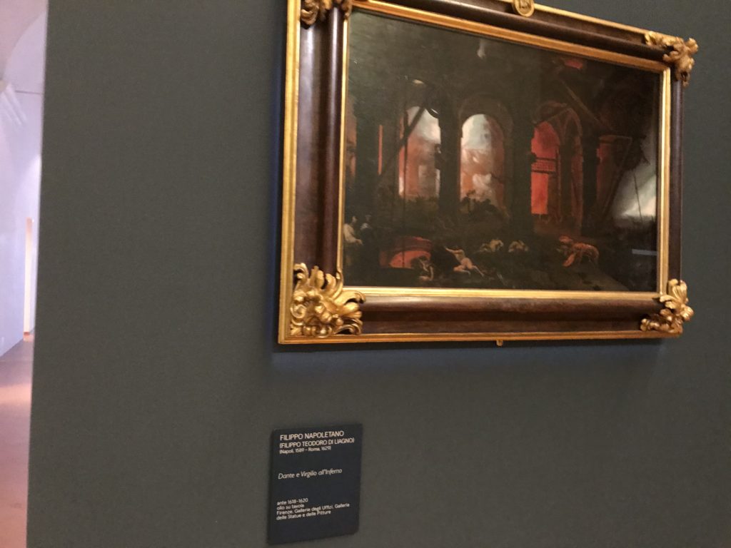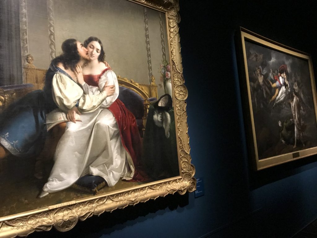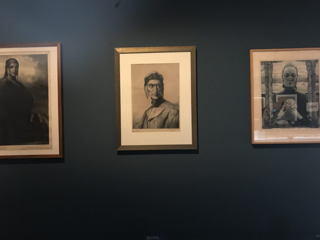 Forlì, tra il 1302 e 1313, è frequentata da Dante Alighieri, esule politico poiché ghibellino. La grande mostra multimediale sulla “Commedia”, e con rari pezzi provenienti da tutto il mondo, vuole rendere omaggio alla città romagnola. La figura di Dante è centrale, appunto, nella mostra “Dante, la visione dell’arte”, per le contaminazioni culturali in un arco temporale che va dal Duecento al Novecento. Le visioni figurative e a tratti oniriche di Cimabue, Giotto, Beato Angelico, Michelangelo, Tintoretto, Canova, Andrea del Castagno e molti altri sono state allestite, tutte, intorno al Sommo Poeta; e poi i preraffaeliti con Dante Gabriele Rossetti, i macchiaioli, i simbolisti e il Novecento di Galileo Chini, Plinio Nomellini, Felice Casorati, Lucio Fontana, Pablo Picasso. Più che una mostra, “Dante. La visione dell’arte”, nel settimo centenario della sua morte, è un evento culturale, un’occasione unica tra dipinti, sculture, disegni, illustrazioni e manoscritti. Beato Angelico, Michelangelo, Tintoretto gli autori che non ci si aspetta di vedere con alcune particolari opere (escono di rado dai loro musei), e oltre i maestri del Novecento su cui spicca Previati con il dipinto simbolista “Paolo e Francesca” di grande suggestione. La narrazione della “Divina Commedia” è l’asse centrale dell’esposizione intorno alla quale le arti visive si sono inchinate e hanno reso visuale e comunicativo per secoli, appunto, il suo testo, Michelangelo per primo, come effetto a dir poco esaltante della grande pittura scenica senza censure (inizialmente) nel “Giudizio” della Cappella Sistina. La mostra si pone su un livello internazionale, assolutamente da visitare, ho detto ai ragazzi del liceo “D. Cotugno” – L’Aquila durante l’esame di Stato. I grandi musei del pianeta: dall’Hermitage di San Pietroburgo, alla Walker Art Gallery di Liverpool, dalla National Gallery di Sofia alla Staatliche Kunstsammlungen di Dresda, dal Museum of Art di Toledo ai Musée des Beaux-Art di Nancy, di Tours, di Anger hanno fornito le loro più importanti collezioni insieme a quelli italiani: Galleria Nazionale d’Arte Moderna e Contemporanea di Roma, la Galleria Borghese, i Musei Vaticani e la Biblioteca Apostolica Vaticana, la Biblioteca Medicea Laurenziana, il Museo di Capodimonte. La visita. E’ come entrare in una dimensione sospesa che non si aspetta, bisogna poi avere il “Filo di Arianna” per muoversi nel complesso percorso espositivo – come fosse una capsula fuori dal tempo e dallo spazio – dentro musica, pittura, le parole e i versi di Dante proiettati nel complesso dei musei – convento di San Domenico come una sorta di ” lancio mediatico” insieme ai libri rari, proiezioni multimediali, allestimenti scenici, e infine trascorrere nella mostra un tempo particolare nel fascino interdisciplinare dei linguaggi e delle arti – un caleidoscopio che si muove nella griglia dei percorsi espositivi, – come non mai si potrà vedere per molti e molti anni nella grande bellezza figurativa, visionaria degli artisti, di secoli e secoli di interpretazioni su Dante, intorno a Dante, fino ai giorni d’oggi. La mostra: un’esperienza subliminale con i manoscritti e le prime edizioni a stampa della “Commedia”, i codici miniati del XIV e XV secolo, la stagione rinascimentale, il Neoclassicismo e la cultura preromantica e romantica, il Genio insomma, catalizza, anche il Risorgimento, la Prima Guerra Mondiale, e infine nella grafica e le edizioni a stampa tra la fine del Settecento e il Novecento mentre, nella scuola, Dante è sempre attuale e centrale per la formazione degli studenti, e per quel quinto canto dell’Inferno – l’ingresso nel Secondo Cerchio, i lussuriosi- divenuto un simbolo per un frastornato Dante. Vede loro che volano “due che ‘nsieme vanno,/ e paiono sì al vento esser , leggieri”… ( e come si diceva la straordinaria la pittura di Previati dei due amanti…) . Ma chi sono? Si svelano, ecco, l’incontro. Paolo e Francesca. In quel luogo buio e tetro di violenza, di bufera incessante, dove riecheggiano i pianti e gli stenti, si sente “ muggire” il vento, e i flussi di corrente contrari, e questa tempesta infernale non si arresta mai, trascina gli spiriti con la sua violenza, in particolare quando arrivano davanti al bordo del baratro infernale: la bufera delle passioni in vita è ora presente in quel luogo infimo dei lussuriosi, viceversa, Dante, utilizza parole che evocano la vita : “colombe”, “dolce”, “amor” quasi a tentare di assolverli, i due amanti, sdoganarli, i due amanti, a favore del “troppo amato…”, ma condannati infine all’ eterno dolore. Una dicotomia. Dunque lei, Francesca, parla, Paolo l’amore indissolubile piange intorno a lei, Dante è turbato, ha pena per quella categoria di dannati e Francesca è il primo peccatore a dialogare con lui che, sopraffatto, sviene. Una ulteriore prova della partecipazione emotiva davanti alla forza morale di Francesca, del suo spirito e della custodia, è l’affidamento e la protezione che ha nei confronti di Paolo quasi fosse indifeso. Ecco, ancora, torna l’interpretazione di Previati simbolista, visionario, che dipinge una versione di Paolo Malatesta e Francesca da Polenta (Paolo e Francesca, 1909, olio su tela, cm 230 x 260 ) nel vortice di quel campo visivo di una bellezza cruda, “oltre i confini della cornice”, la luminosità vibrante, elegante, immateriale dalle pennellate ondulate, i due volti cupi e solcati dalla stanchezza, i corpi giovani ma segnati dal dolore che si avvinghiano e salgono, quasi una levitazione alla ricerca della luce e dell’ossigeno sopra di loro, e le mani che si uniscono, i lunghi capelli rossi di Francesca che si sollevano dal corpo nel quadro quasi attratti da una forza occulta ascendente, i due corpi illuminati da un fascio di luce e dai colori tonali caldi e freddi nelle varianti cromatiche dell’ocra, della biacca, dei pas