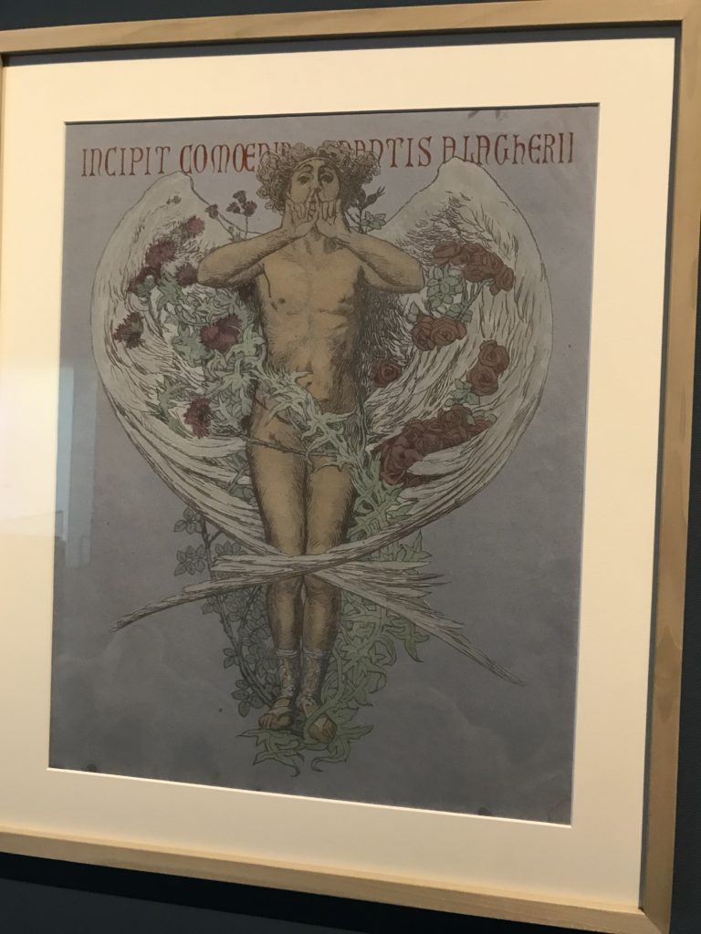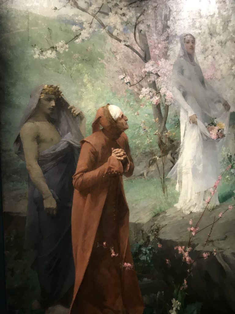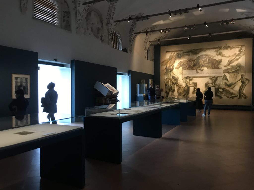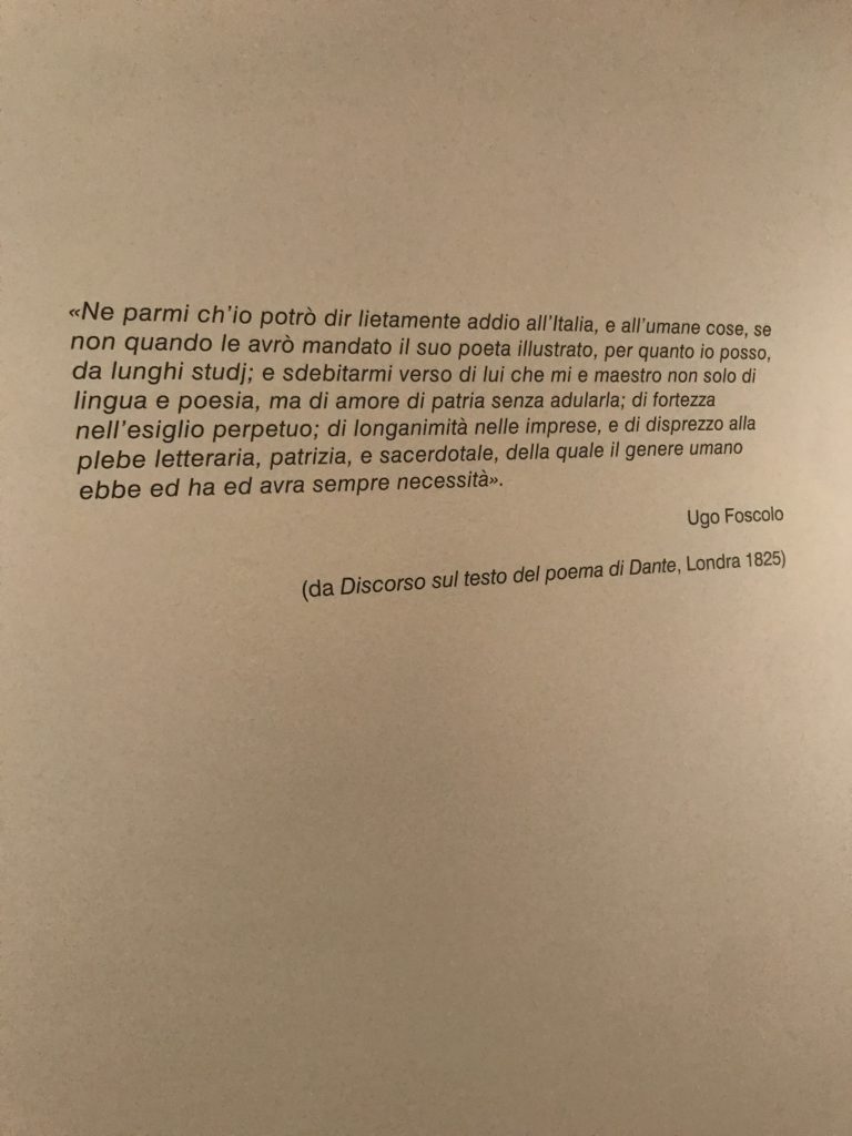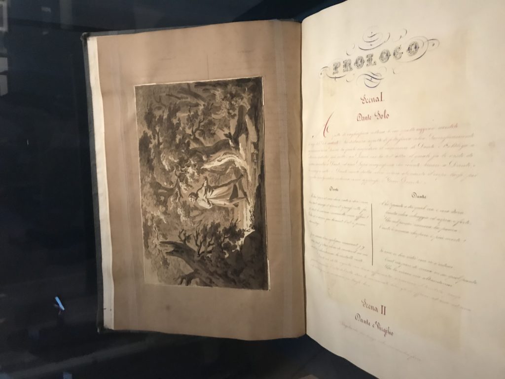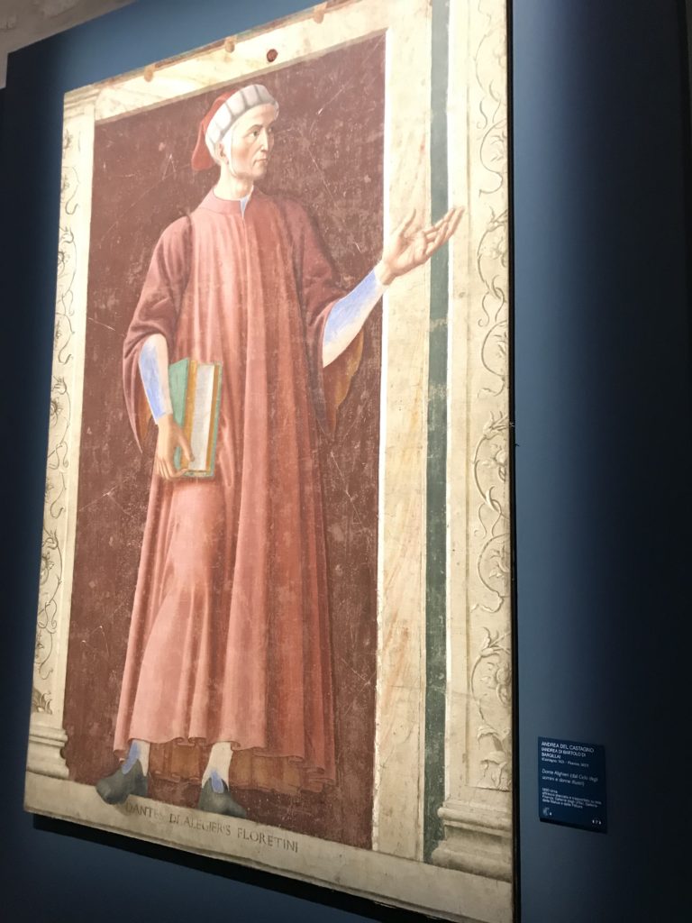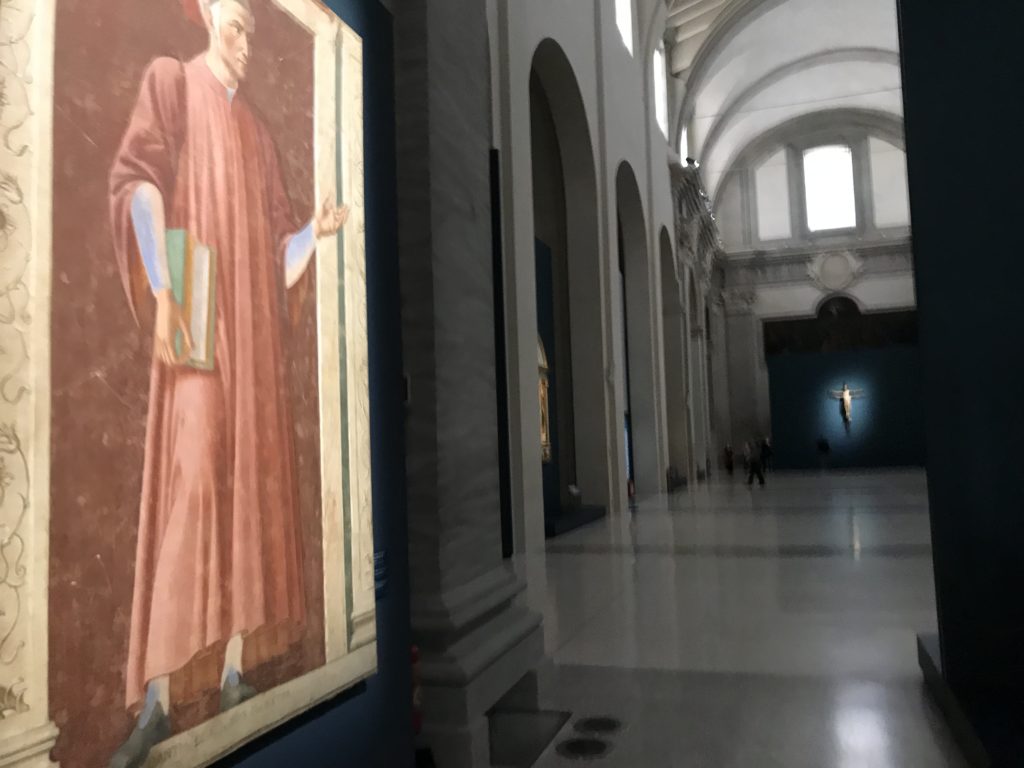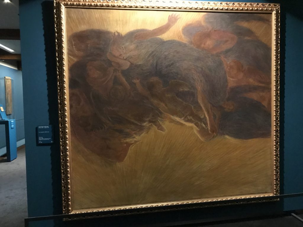 Forlì, tra il 1302 e 1313, è frequentata da Dante Alighieri, esule politico poiché ghibellino. La grande mostra multimediale sulla “Commedia”, e con rari pezzi provenienti da tutto il mondo, vuole rendere omaggio alla città romagnola. La figura di Dante è centrale, appunto, nella mostra “Dante, la visione dell’arte”, per le contaminazioni culturali in un arco temporale che va dal Duecento al Novecento. Le visioni figurative e a tratti oniriche di Cimabue, Giotto, Beato Angelico, Michelangelo, Tintoretto, Canova, Andrea del Castagno e molti altri sono state allestite, tutte, intorno al Sommo Poeta; e poi i preraffaeliti con Dante Gabriele Rossetti, i macchiaioli, i simbolisti e il Novecento di Galileo Chini, Plinio Nomellini, Felice Casorati, Lucio Fontana, Pablo Picasso. Più che una mostra, “Dante. La visione dell’arte”, nel settimo centenario della sua morte, è un evento culturale, un’occasione unica tra dipinti, sculture, disegni, illustrazioni e manoscritti. Beato Angelico, Michelangelo, Tintoretto gli autori che non ci si aspetta di vedere con alcune particolari opere (escono di rado dai loro musei), e oltre i maestri del Novecento su cui spicca Previati con il dipinto simbolista “Paolo e Francesca” di grande suggestione. La narrazione della “Divina Commedia” è l’asse centrale dell’esposizione intorno alla quale le arti visive si sono inchinate e hanno reso visuale e comunicativo per secoli, appunto, il suo testo, Michelangelo per primo, come effetto a dir poco esaltante della grande pittura scenica senza censure (inizialmente) nel “Giudizio” della Cappella Sistina. La mostra si pone su un livello internazionale, assolutamente da visitare, ho detto ai ragazzi del liceo “D. Cotugno” – L’Aquila durante l’esame di Stato. I grandi musei del pianeta: dall’Hermitage di San Pietroburgo, alla Walker Art Gallery di Liverpool, dalla National Gallery di Sofia alla Staatliche Kunstsammlungen di Dresda, dal Museum of Art di Toledo ai Musée des Beaux-Art di Nancy, di Tours, di Anger hanno fornito le loro più importanti collezioni insieme a quelli italiani: Galleria Nazionale d’Arte Moderna e Contemporanea di Roma, la Galleria Borghese, i Musei Vaticani e la Biblioteca Apostolica Vaticana, la Biblioteca Medicea Laurenziana, il Museo di Capodimonte. La visita. E’ come entrare in una dimensione sospesa che non si aspetta, bisogna poi avere il “Filo di Arianna” per muoversi nel complesso percorso espositivo – come fosse una capsula fuori dal tempo e dallo spazio – dentro musica, pittura, le parole e i versi di Dante proiettati nel complesso dei musei – convento di San Domenico come una sorta di ” lancio mediatico” insieme ai libri rari, proiezioni multimediali, allestimenti scenici, e infine trascorrere nella mostra un tempo particolare nel fascino interdisciplinare dei linguaggi e delle arti – un caleidoscopio che si muove nella griglia dei percorsi espositivi, – come non mai si potrà vedere per molti e molti anni nella grande bellezza figurativa, visionaria degli artisti, di secoli e secoli di interpretazioni su Dante, intorno a Dante, fino ai giorni d’oggi. La mostra: un’esperienza subliminale con i manoscritti e le prime edizioni a stampa della “Commedia”, i codici miniati del XIV e XV secolo, la stagione rinascimentale, il Neoclassicismo e la cultura preromantica e romantica, il Genio insomma, catalizza, anche il Risorgimento, la Prima Guerra Mondiale, e infine nella grafica e le edizioni a stampa tra la fine del Settecento e il Novecento mentre, nella scuola, Dante è sempre attuale e centrale per la formazione degli studenti, e per quel quinto canto dell’Inferno – l’ingresso nel Secondo Cerchio, i lussuriosi- divenuto un simbolo per un frastornato Dante. Vede loro che volano “due che ‘nsieme vanno,/ e paiono sì al vento esser , leggieri”… ( e come si diceva la straordinaria la pittura di Previati dei due amanti…) . Ma chi sono? Si svelano, ecco, l’incontro. Paolo e Francesca. In quel luogo buio e tetro di violenza, di bufera incessante, dove riecheggiano i pianti e gli stenti, si sente “ muggire” il vento, e i flussi di corrente contrari, e questa tempesta infernale non si arresta mai, trascina gli spiriti con la sua violenza, in particolare quando arrivano davanti al bordo del baratro infernale: la bufera delle passioni in vita è ora presente in quel luogo infimo dei lussuriosi, viceversa, Dante, utilizza parole che evocano la vita : “colombe”, “dolce”, “amor” quasi a tentare di assolverli, i due amanti, sdoganarli, i due amanti, a favore del “troppo amato…”, ma condannati infine all’ eterno dolore. Una dicotomia. Dunque lei, Francesca, parla, Paolo l’amore indissolubile piange intorno a lei, Dante è turbato, ha pena per quella categoria di dannati e Francesca è il primo peccatore a dialogare con lui che, sopraffatto, sviene. Una ulteriore prova della partecipazione emotiva davanti alla forza morale di Francesca, del suo spirito e della custodia, è l’affidamento e la protezione che ha nei confronti di Paolo quasi fosse indifeso. Ecco, ancora, torna l’interpretazione di Previati simbolista, visionario, che dipinge una versione di Paolo Malatesta e Francesca da Polenta (Paolo e Francesca, 1909, olio su tela, cm 230 x 260 ) nel vortice di quel campo visivo di una bellezza cruda, “oltre i confini della cornice”, la luminosità vibrante, elegante, immateriale dalle pennellate ondulate, i due volti cupi e solcati dalla stanchezza, i corpi giovani ma segnati dal dolore che si avvinghiano e salgono, quasi una levitazione alla ricerca della luce e dell’ossigeno sopra di loro, e le mani che si uniscono, i lunghi capelli rossi di Francesca che si sollevano dal corpo nel quadro quasi attratti da una forza occulta ascendente, i due corpi illuminati da un fascio di luce e dai colori tonali caldi e freddi nelle varianti cromatiche dell’ocra, della biacca, dei pas