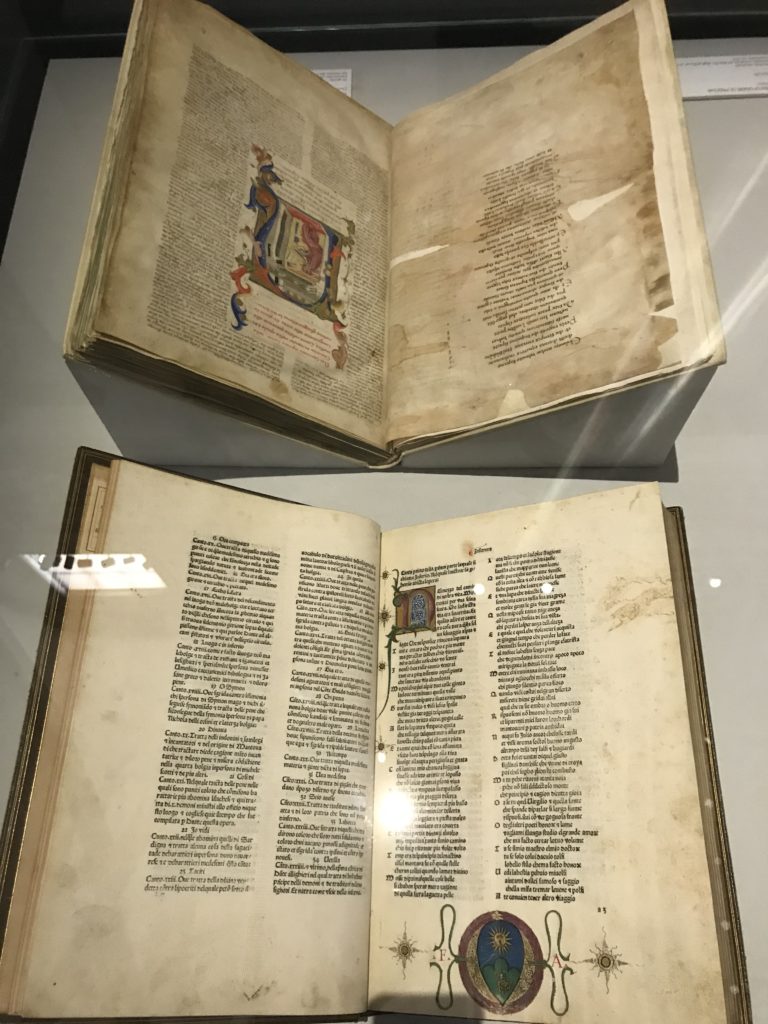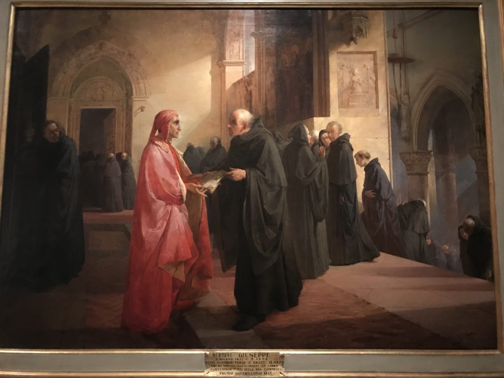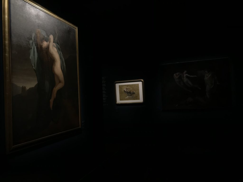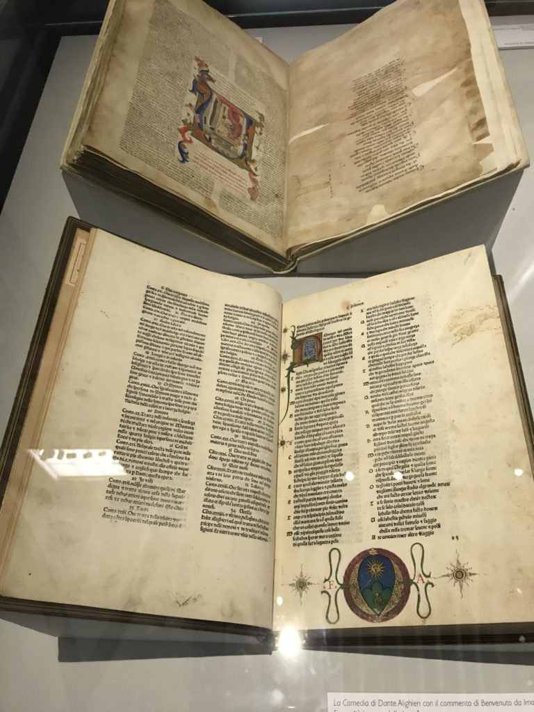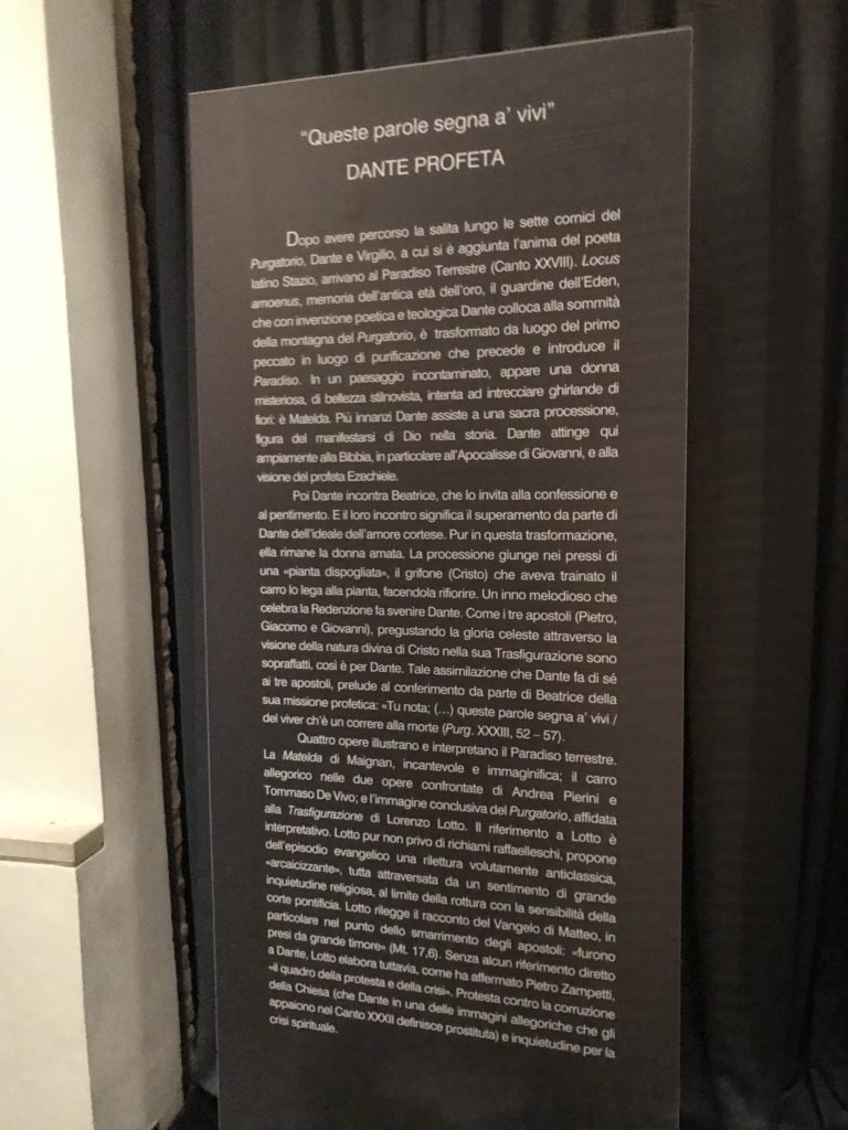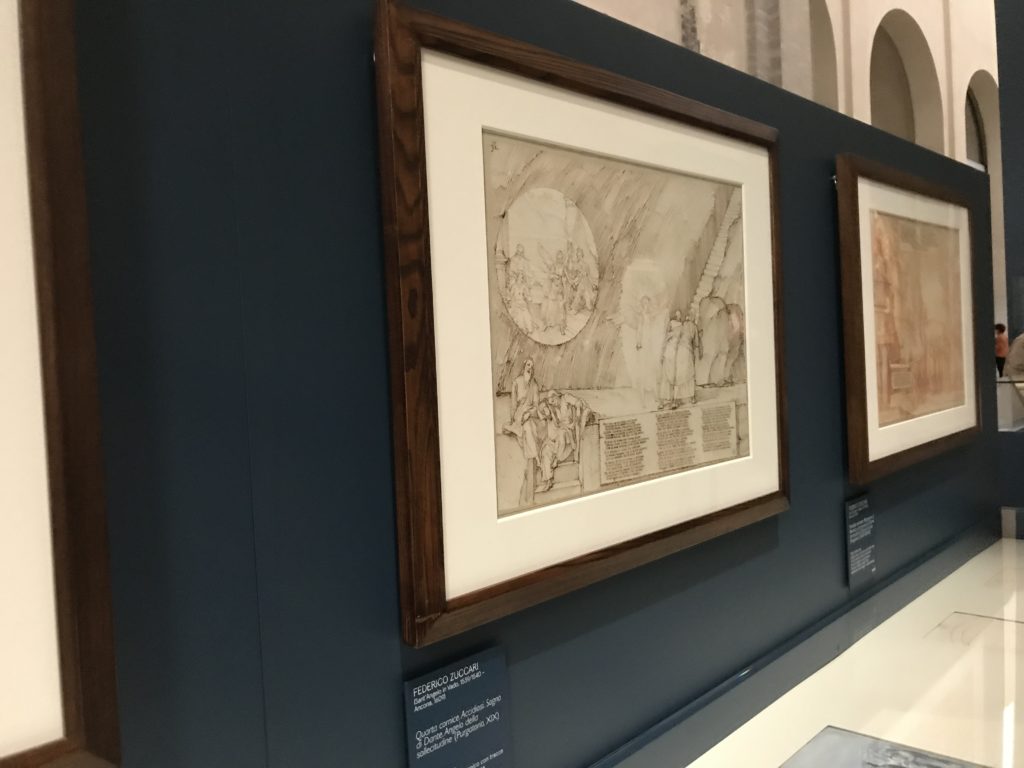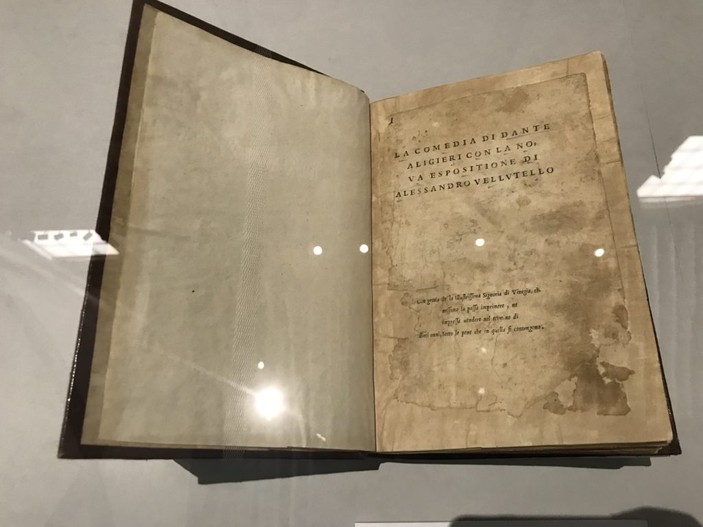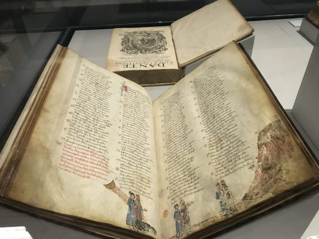 Forlì, tra il 1302 e 1313, è frequentata da Dante Alighieri, esule politico poiché ghibellino. La grande mostra multimediale sulla “Commedia”, e con rari pezzi provenienti da tutto il mondo, vuole rendere omaggio alla città romagnola. La figura di Dante è centrale, appunto, nella mostra “Dante, la visione dell’arte”, per le contaminazioni culturali in un arco temporale che va dal Duecento al Novecento. Le visioni figurative e a tratti oniriche di Cimabue, Giotto, Beato Angelico, Michelangelo, Tintoretto, Canova, Andrea del Castagno e molti altri sono state allestite, tutte, intorno al Sommo Poeta; e poi i preraffaeliti con Dante Gabriele Rossetti, i macchiaioli, i simbolisti e il Novecento di Galileo Chini, Plinio Nomellini, Felice Casorati, Lucio Fontana, Pablo Picasso. Più che una mostra, “Dante. La visione dell’arte”, nel settimo centenario della sua morte, è un evento culturale, un’occasione unica tra dipinti, sculture, disegni, illustrazioni e manoscritti. Beato Angelico, Michelangelo, Tintoretto gli autori che non ci si aspetta di vedere con alcune particolari opere (escono di rado dai loro musei), e oltre i maestri del Novecento su cui spicca Previati con il dipinto simbolista “Paolo e Francesca” di grande suggestione. La narrazione della “Divina Commedia” è l’asse centrale dell’esposizione intorno alla quale le arti visive si sono inchinate e hanno reso visuale e comunicativo per secoli, appunto, il suo testo, Michelangelo per primo, come effetto a dir poco esaltante della grande pittura scenica senza censure (inizialmente) nel “Giudizio” della Cappella Sistina. La mostra si pone su un livello internazionale, assolutamente da visitare, ho detto ai ragazzi del liceo “D. Cotugno” – L’Aquila durante l’esame di Stato. I grandi musei del pianeta: dall’Hermitage di San Pietroburgo, alla Walker Art Gallery di Liverpool, dalla National Gallery di Sofia alla Staatliche Kunstsammlungen di Dresda, dal Museum of Art di Toledo ai Musée des Beaux-Art di Nancy, di Tours, di Anger hanno fornito le loro più importanti collezioni insieme a quelli italiani: Galleria Nazionale d’Arte Moderna e Contemporanea di Roma, la Galleria Borghese, i Musei Vaticani e la Biblioteca Apostolica Vaticana, la Biblioteca Medicea Laurenziana, il Museo di Capodimonte. La visita. E’ come entrare in una dimensione sospesa che non si aspetta, bisogna poi avere il “Filo di Arianna” per muoversi nel complesso percorso espositivo – come fosse una capsula fuori dal tempo e dallo spazio – dentro musica, pittura, le parole e i versi di Dante proiettati nel complesso dei musei – convento di San Domenico come una sorta di ” lancio mediatico” insieme ai libri rari, proiezioni multimediali, allestimenti scenici, e infine trascorrere nella mostra un tempo particolare nel fascino interdisciplinare dei linguaggi e delle arti – un caleidoscopio che si muove nella griglia dei percorsi espositivi, – come non mai si potrà vedere per molti e molti anni nella grande bellezza figurativa, visionaria degli artisti, di secoli e secoli di interpretazioni su Dante, intorno a Dante, fino ai giorni d’oggi. La mostra: un’esperienza subliminale con i manoscritti e le prime edizioni a stampa della “Commedia”, i codici miniati del XIV e XV secolo, la stagione rinascimentale, il Neoclassicismo e la cultura preromantica e romantica, il Genio insomma, catalizza, anche il Risorgimento, la Prima Guerra Mondiale, e infine nella grafica e le edizioni a stampa tra la fine del Settecento e il Novecento mentre, nella scuola, Dante è sempre attuale e centrale per la formazione degli studenti, e per quel quinto canto dell’Inferno – l’ingresso nel Secondo Cerchio, i lussuriosi- divenuto un simbolo per un frastornato Dante. Vede loro che volano “due che ‘nsieme vanno,/ e paiono sì al vento esser , leggieri”… ( e come si diceva la straordinaria la pittura di Previati dei due amanti…) . Ma chi sono? Si svelano, ecco, l’incontro. Paolo e Francesca. In quel luogo buio e tetro di violenza, di bufera incessante, dove riecheggiano i pianti e gli stenti, si sente “ muggire” il vento, e i flussi di corrente contrari, e questa tempesta infernale non si arresta mai, trascina gli spiriti con la sua violenza, in particolare quando arrivano davanti al bordo del baratro infernale: la bufera delle passioni in vita è ora presente in quel luogo infimo dei lussuriosi, viceversa, Dante, utilizza parole che evocano la vita : “colombe”, “dolce”, “amor” quasi a tentare di assolverli, i due amanti, sdoganarli, i due amanti, a favore del “troppo amato…”, ma condannati infine all’ eterno dolore. Una dicotomia. Dunque lei, Francesca, parla, Paolo l’amore indissolubile piange intorno a lei, Dante è turbato, ha pena per quella categoria di dannati e Francesca è il primo peccatore a dialogare con lui che, sopraffatto, sviene. Una ulteriore prova della partecipazione emotiva davanti alla forza morale di Francesca, del suo spirito e della custodia, è l’affidamento e la protezione che ha nei confronti di Paolo quasi fosse indifeso. Ecco, ancora, torna l’interpretazione di Previati simbolista, visionario, che dipinge una versione di Paolo Malatesta e Francesca da Polenta (Paolo e Francesca, 1909, olio su tela, cm 230 x 260 ) nel vortice di quel campo visivo di una bellezza cruda, “oltre i confini della cornice”, la luminosità vibrante, elegante, immateriale dalle pennellate ondulate, i due volti cupi e solcati dalla stanchezza, i corpi giovani ma segnati dal dolore che si avvinghiano e salgono, quasi una levitazione alla ricerca della luce e dell’ossigeno sopra di loro, e le mani che si uniscono, i lunghi capelli rossi di Francesca che si sollevano dal corpo nel quadro quasi attratti da una forza occulta ascendente, i due corpi illuminati da un fascio di luce e dai colori tonali caldi e freddi nelle varianti cromatiche dell’ocra, della biacca, dei pas