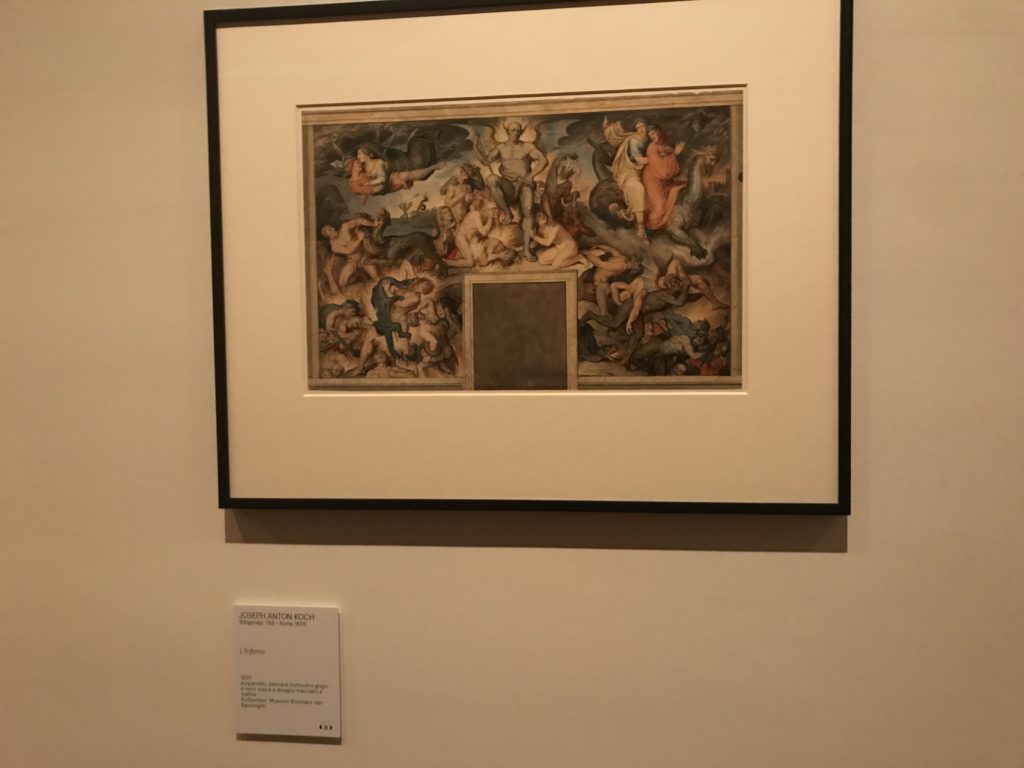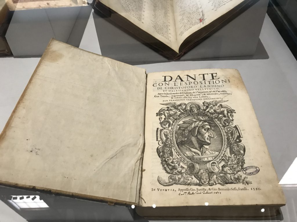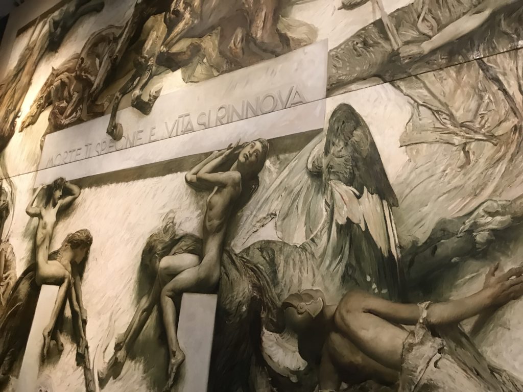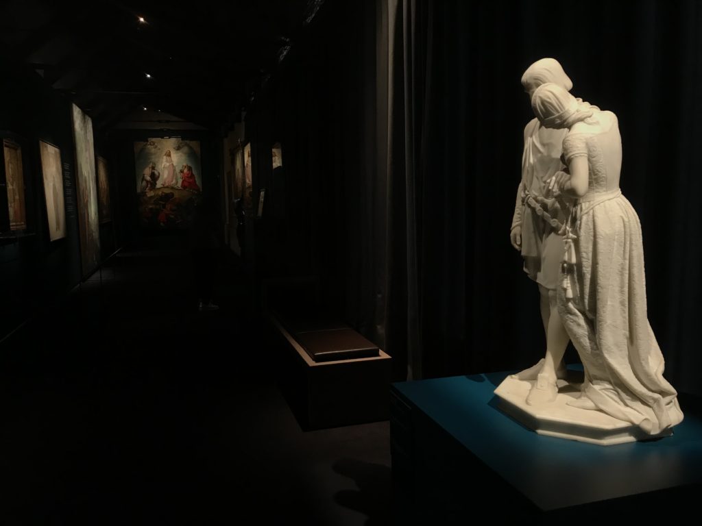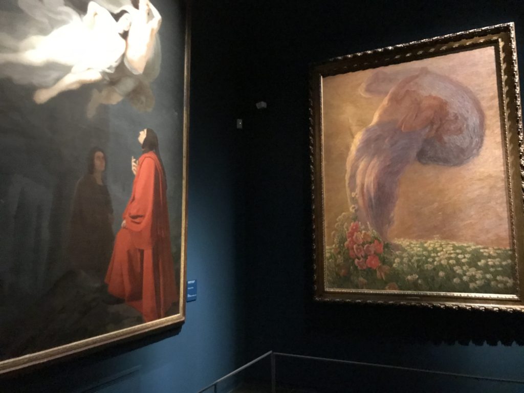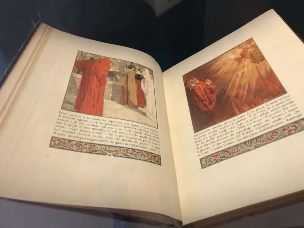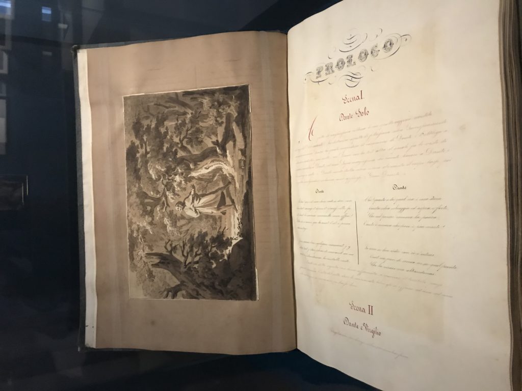 Forlì, tra il 1302 e 1313, è frequentata da Dante Alighieri, esule politico poiché ghibellino. La grande mostra multimediale sulla “Commedia”, e con rari pezzi provenienti da tutto il mondo, vuole rendere omaggio alla città romagnola. La figura di Dante è centrale, appunto, nella mostra “Dante, la visione dell’arte”, per le contaminazioni culturali in un arco temporale che va dal Duecento al Novecento. Le visioni figurative e a tratti oniriche di Cimabue, Giotto, Beato Angelico, Michelangelo, Tintoretto, Canova, Andrea del Castagno e molti altri sono state allestite, tutte, intorno al Sommo Poeta; e poi i preraffaeliti con Dante Gabriele Rossetti, i macchiaioli, i simbolisti e il Novecento di Galileo Chini, Plinio Nomellini, Felice Casorati, Lucio Fontana, Pablo Picasso. Più che una mostra, “Dante. La visione dell’arte”, nel settimo centenario della sua morte, è un evento culturale, un’occasione unica tra dipinti, sculture, disegni, illustrazioni e manoscritti. Beato Angelico, Michelangelo, Tintoretto gli autori che non ci si aspetta di vedere con alcune particolari opere (escono di rado dai loro musei), e oltre i maestri del Novecento su cui spicca Previati con il dipinto simbolista “Paolo e Francesca” di grande suggestione. La narrazione della “Divina Commedia” è l’asse centrale dell’esposizione intorno alla quale le arti visive si sono inchinate e hanno reso visuale e comunicativo per secoli, appunto, il suo testo, Michelangelo per primo, come effetto a dir poco esaltante della grande pittura scenica senza censure (inizialmente) nel “Giudizio” della Cappella Sistina. La mostra si pone su un livello internazionale, assolutamente da visitare, ho detto ai ragazzi del liceo “D. Cotugno” – L’Aquila durante l’esame di Stato. I grandi musei del pianeta: dall’Hermitage di San Pietroburgo, alla Walker Art Gallery di Liverpool, dalla National Gallery di Sofia alla Staatliche Kunstsammlungen di Dresda, dal Museum of Art di Toledo ai Musée des Beaux-Art di Nancy, di Tours, di Anger hanno fornito le loro più importanti collezioni insieme a quelli italiani: Galleria Nazionale d’Arte Moderna e Contemporanea di Roma, la Galleria Borghese, i Musei Vaticani e la Biblioteca Apostolica Vaticana, la Biblioteca Medicea Laurenziana, il Museo di Capodimonte. La visita. E’ come entrare in una dimensione sospesa che non si aspetta, bisogna poi avere il “Filo di Arianna” per muoversi nel complesso percorso espositivo – come fosse una capsula fuori dal tempo e dallo spazio – dentro musica, pittura, le parole e i versi di Dante proiettati nel complesso dei musei – convento di San Domenico come una sorta di ” lancio mediatico” insieme ai libri rari, proiezioni multimediali, allestimenti scenici, e infine trascorrere nella mostra un tempo particolare nel fascino interdisciplinare dei linguaggi e delle arti – un caleidoscopio che si muove nella griglia dei percorsi espositivi, – come non mai si potrà vedere per molti e molti anni nella grande bellezza figurativa, visionaria degli artisti, di secoli e secoli di interpretazioni su Dante, intorno a Dante, fino ai giorni d’oggi. La mostra: un’esperienza subliminale con i manoscritti e le prime edizioni a stampa della “Commedia”, i codici miniati del XIV e XV secolo, la stagione rinascimentale, il Neoclassicismo e la cultura preromantica e romantica, il Genio insomma, catalizza, anche il Risorgimento, la Prima Guerra Mondiale, e infine nella grafica e le edizioni a stampa tra la fine del Settecento e il Novecento mentre, nella scuola, Dante è sempre attuale e centrale per la formazione degli studenti, e per quel quinto canto dell’Inferno – l’ingresso nel Secondo Cerchio, i lussuriosi- divenuto un simbolo per un frastornato Dante. Vede loro che volano “due che ‘nsieme vanno,/ e paiono sì al vento esser , leggieri”… ( e come si diceva la straordinaria la pittura di Previati dei due amanti…) . Ma chi sono? Si svelano, ecco, l’incontro. Paolo e Francesca. In quel luogo buio e tetro di violenza, di bufera incessante, dove riecheggiano i pianti e gli stenti, si sente “ muggire” il vento, e i flussi di corrente contrari, e questa tempesta infernale non si arresta mai, trascina gli spiriti con la sua violenza, in particolare quando arrivano davanti al bordo del baratro infernale: la bufera delle passioni in vita è ora presente in quel luogo infimo dei lussuriosi, viceversa, Dante, utilizza parole che evocano la vita : “colombe”, “dolce”, “amor” quasi a tentare di assolverli, i due amanti, sdoganarli, i due amanti, a favore del “troppo amato…”, ma condannati infine all’ eterno dolore. Una dicotomia. Dunque lei, Francesca, parla, Paolo l’amore indissolubile piange intorno a lei, Dante è turbato, ha pena per quella categoria di dannati e Francesca è il primo peccatore a dialogare con lui che, sopraffatto, sviene. Una ulteriore prova della partecipazione emotiva davanti alla forza morale di Francesca, del suo spirito e della custodia, è l’affidamento e la protezione che ha nei confronti di Paolo quasi fosse indifeso. Ecco, ancora, torna l’interpretazione di Previati simbolista, visionario, che dipinge una versione di Paolo Malatesta e Francesca da Polenta (Paolo e Francesca, 1909, olio su tela, cm 230 x 260 ) nel vortice di quel campo visivo di una bellezza cruda, “oltre i confini della cornice”, la luminosità vibrante, elegante, immateriale dalle pennellate ondulate, i due volti cupi e solcati dalla stanchezza, i corpi giovani ma segnati dal dolore che si avvinghiano e salgono, quasi una levitazione alla ricerca della luce e dell’ossigeno sopra di loro, e le mani che si uniscono, i lunghi capelli rossi di Francesca che si sollevano dal corpo nel quadro quasi attratti da una forza occulta ascendente, i due corpi illuminati da un fascio di luce e dai colori tonali caldi e freddi nelle varianti cromatiche dell’ocra, della biacca, dei pas