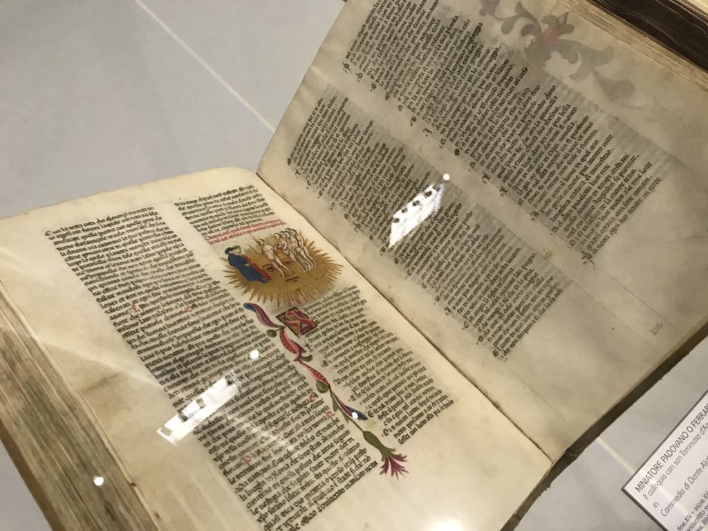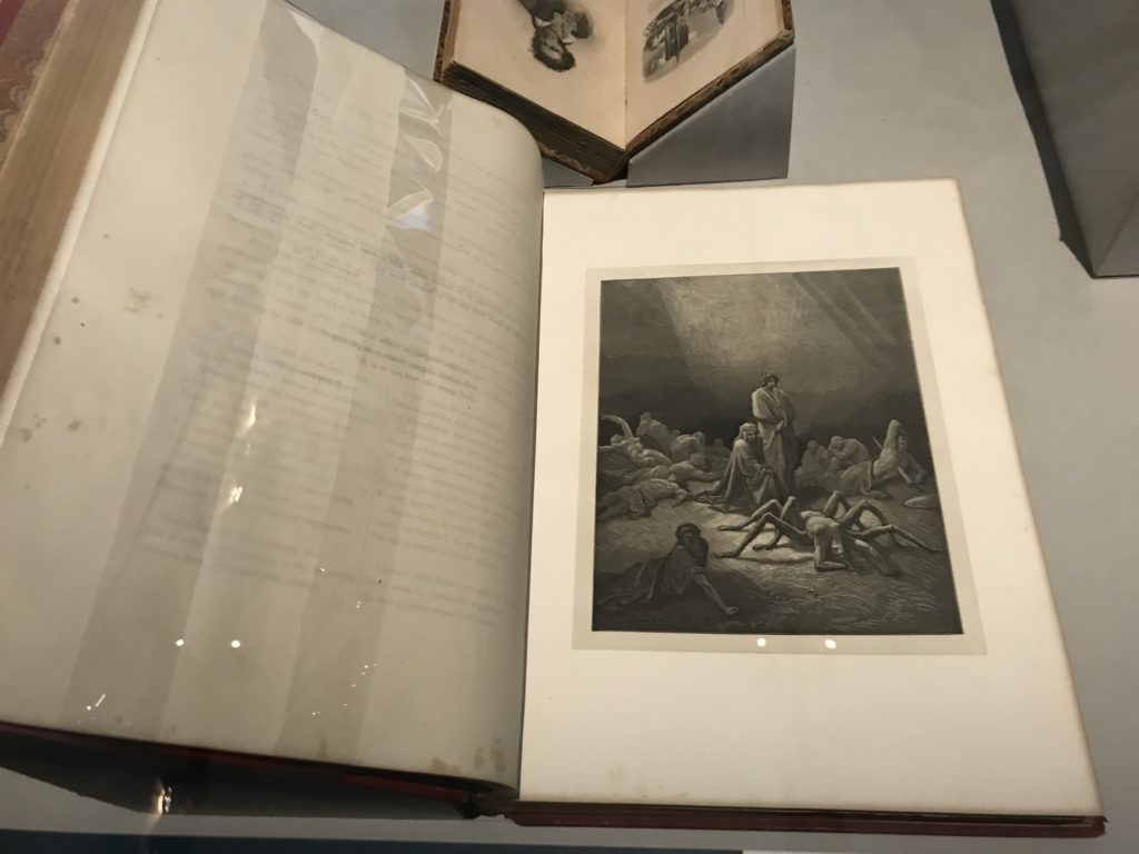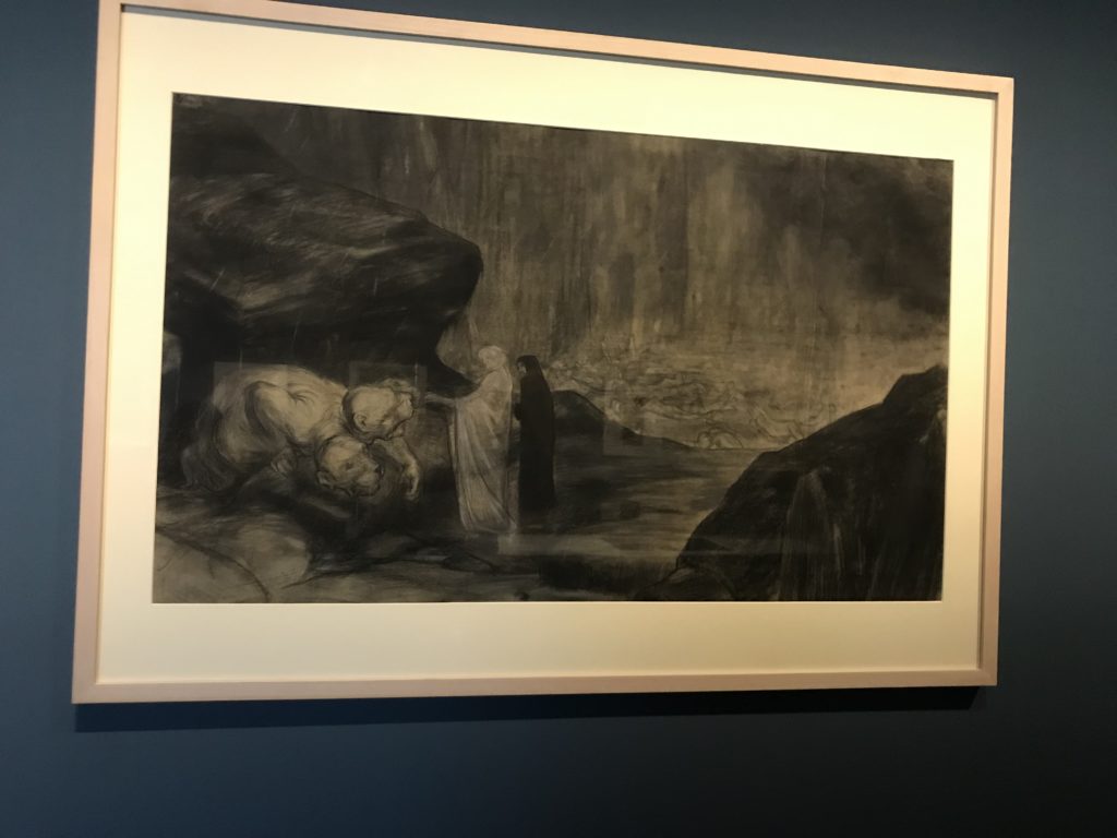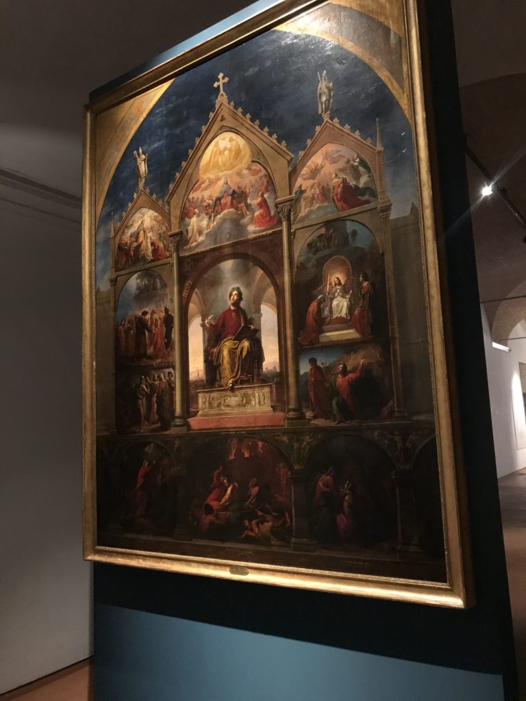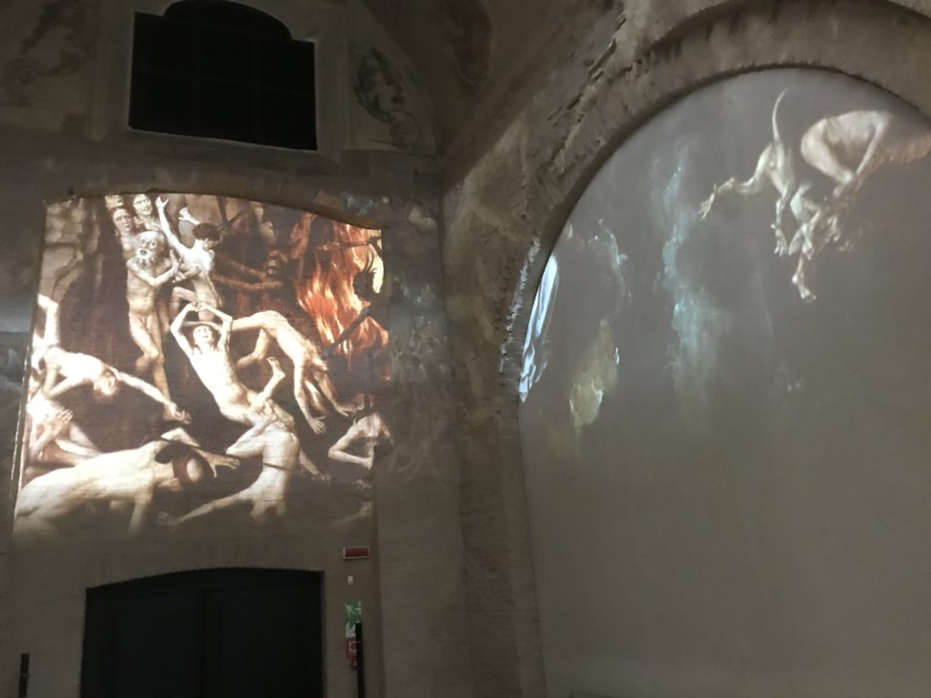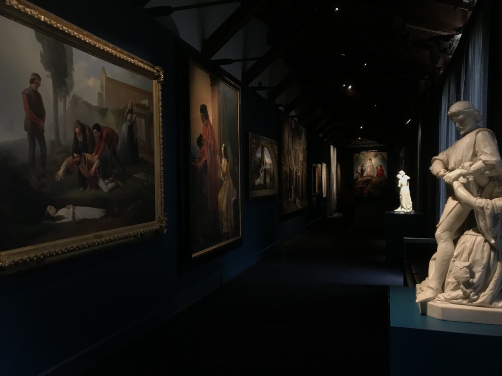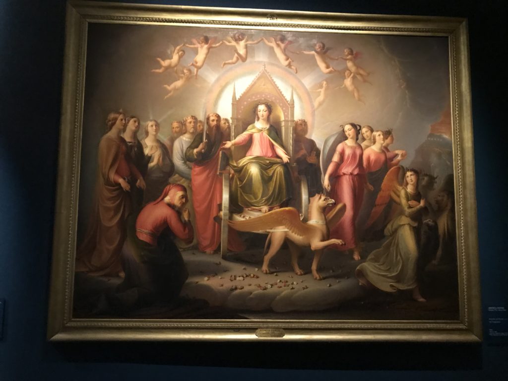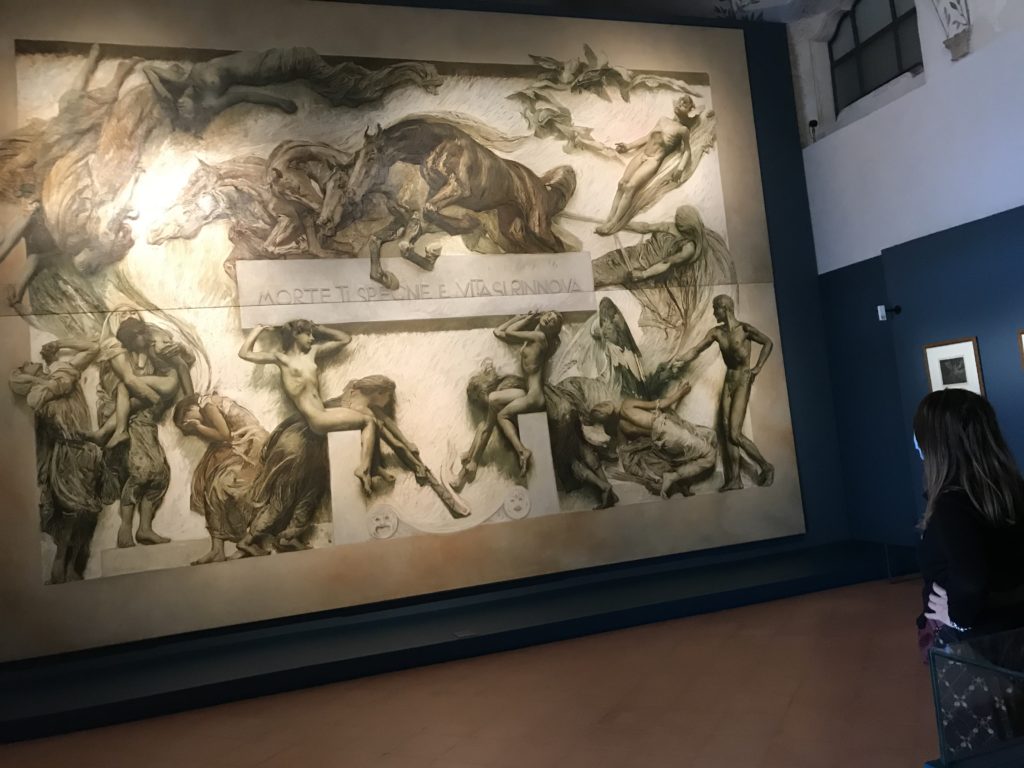 Forlì, tra il 1302 e 1313, è frequentata da Dante Alighieri, esule politico poiché ghibellino. La grande mostra multimediale sulla “Commedia”, e con rari pezzi provenienti da tutto il mondo, vuole rendere omaggio alla città romagnola. La figura di Dante è centrale, appunto, nella mostra “Dante, la visione dell’arte”, per le contaminazioni culturali in un arco temporale che va dal Duecento al Novecento. Le visioni figurative e a tratti oniriche di Cimabue, Giotto, Beato Angelico, Michelangelo, Tintoretto, Canova, Andrea del Castagno e molti altri sono state allestite, tutte, intorno al Sommo Poeta; e poi i preraffaeliti con Dante Gabriele Rossetti, i macchiaioli, i simbolisti e il Novecento di Galileo Chini, Plinio Nomellini, Felice Casorati, Lucio Fontana, Pablo Picasso. Più che una mostra, “Dante. La visione dell’arte”, nel settimo centenario della sua morte, è un evento culturale, un’occasione unica tra dipinti, sculture, disegni, illustrazioni e manoscritti. Beato Angelico, Michelangelo, Tintoretto gli autori che non ci si aspetta di vedere con alcune particolari opere (escono di rado dai loro musei), e oltre i maestri del Novecento su cui spicca Previati con il dipinto simbolista “Paolo e Francesca” di grande suggestione. La narrazione della “Divina Commedia” è l’asse centrale dell’esposizione intorno alla quale le arti visive si sono inchinate e hanno reso visuale e comunicativo per secoli, appunto, il suo testo, Michelangelo per primo, come effetto a dir poco esaltante della grande pittura scenica senza censure (inizialmente) nel “Giudizio” della Cappella Sistina. La mostra si pone su un livello internazionale, assolutamente da visitare, ho detto ai ragazzi del liceo “D. Cotugno” – L’Aquila durante l’esame di Stato. I grandi musei del pianeta: dall’Hermitage di San Pietroburgo, alla Walker Art Gallery di Liverpool, dalla National Gallery di Sofia alla Staatliche Kunstsammlungen di Dresda, dal Museum of Art di Toledo ai Musée des Beaux-Art di Nancy, di Tours, di Anger hanno fornito le loro più importanti collezioni insieme a quelli italiani: Galleria Nazionale d’Arte Moderna e Contemporanea di Roma, la Galleria Borghese, i Musei Vaticani e la Biblioteca Apostolica Vaticana, la Biblioteca Medicea Laurenziana, il Museo di Capodimonte. La visita. E’ come entrare in una dimensione sospesa che non si aspetta, bisogna poi avere il “Filo di Arianna” per muoversi nel complesso percorso espositivo – come fosse una capsula fuori dal tempo e dallo spazio – dentro musica, pittura, le parole e i versi di Dante proiettati nel complesso dei musei – convento di San Domenico come una sorta di ” lancio mediatico” insieme ai libri rari, proiezioni multimediali, allestimenti scenici, e infine trascorrere nella mostra un tempo particolare nel fascino interdisciplinare dei linguaggi e delle arti – un caleidoscopio che si muove nella griglia dei percorsi espositivi, – come non mai si potrà vedere per molti e molti anni nella grande bellezza figurativa, visionaria degli artisti, di secoli e secoli di interpretazioni su Dante, intorno a Dante, fino ai giorni d’oggi. La mostra: un’esperienza subliminale con i manoscritti e le prime edizioni a stampa della “Commedia”, i codici miniati del XIV e XV secolo, la stagione rinascimentale, il Neoclassicismo e la cultura preromantica e romantica, il Genio insomma, catalizza, anche il Risorgimento, la Prima Guerra Mondiale, e infine nella grafica e le edizioni a stampa tra la fine del Settecento e il Novecento mentre, nella scuola, Dante è sempre attuale e centrale per la formazione degli studenti, e per quel quinto canto dell’Inferno – l’ingresso nel Secondo Cerchio, i lussuriosi- divenuto un simbolo per un frastornato Dante. Vede loro che volano “due che ‘nsieme vanno,/ e paiono sì al vento esser , leggieri”… ( e come si diceva la straordinaria la pittura di Previati dei due amanti…) . Ma chi sono? Si svelano, ecco, l’incontro. Paolo e Francesca. In quel luogo buio e tetro di violenza, di bufera incessante, dove riecheggiano i pianti e gli stenti, si sente “ muggire” il vento, e i flussi di corrente contrari, e questa tempesta infernale non si arresta mai, trascina gli spiriti con la sua violenza, in particolare quando arrivano davanti al bordo del baratro infernale: la bufera delle passioni in vita è ora presente in quel luogo infimo dei lussuriosi, viceversa, Dante, utilizza parole che evocano la vita : “colombe”, “dolce”, “amor” quasi a tentare di assolverli, i due amanti, sdoganarli, i due amanti, a favore del “troppo amato…”, ma condannati infine all’ eterno dolore. Una dicotomia. Dunque lei, Francesca, parla, Paolo l’amore indissolubile piange intorno a lei, Dante è turbato, ha pena per quella categoria di dannati e Francesca è il primo peccatore a dialogare con lui che, sopraffatto, sviene. Una ulteriore prova della partecipazione emotiva davanti alla forza morale di Francesca, del suo spirito e della custodia, è l’affidamento e la protezione che ha nei confronti di Paolo quasi fosse indifeso. Ecco, ancora, torna l’interpretazione di Previati simbolista, visionario, che dipinge una versione di Paolo Malatesta e Francesca da Polenta (Paolo e Francesca, 1909, olio su tela, cm 230 x 260 ) nel vortice di quel campo visivo di una bellezza cruda, “oltre i confini della cornice”, la luminosità vibrante, elegante, immateriale dalle pennellate ondulate, i due volti cupi e solcati dalla stanchezza, i corpi giovani ma segnati dal dolore che si avvinghiano e salgono, quasi una levitazione alla ricerca della luce e dell’ossigeno sopra di loro, e le mani che si uniscono, i lunghi capelli rossi di Francesca che si sollevano dal corpo nel quadro quasi attratti da una forza occulta ascendente, i due corpi illuminati da un fascio di luce e dai colori tonali caldi e freddi nelle varianti cromatiche dell’ocra, della biacca, dei pas