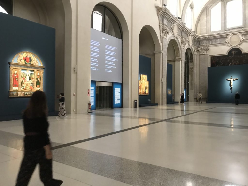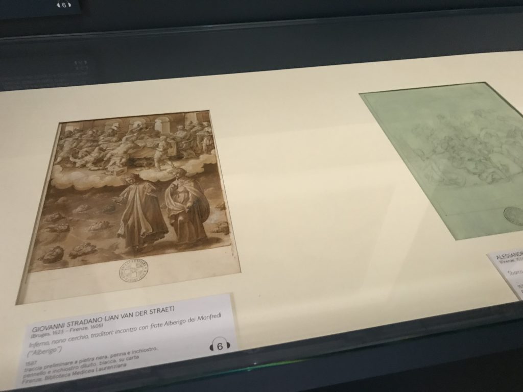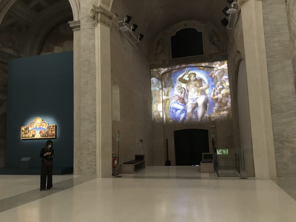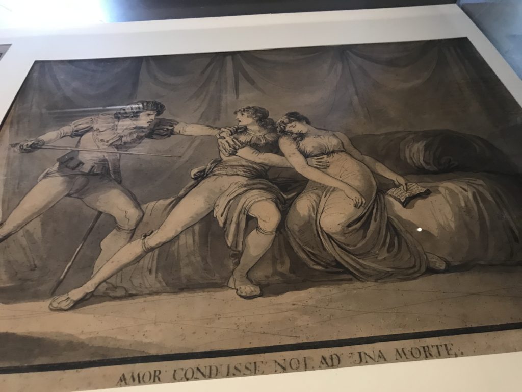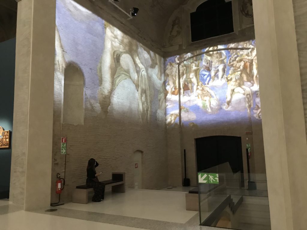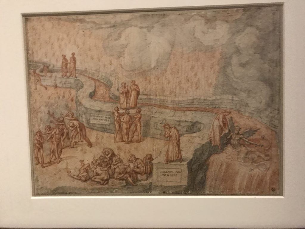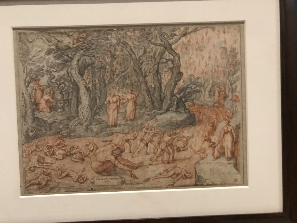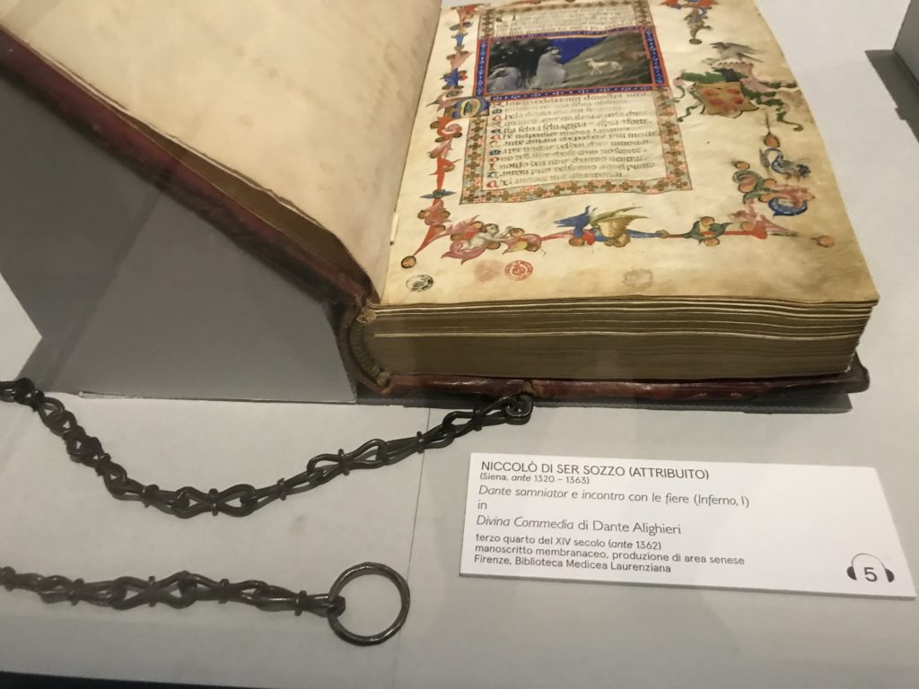 Forlì, tra il 1302 e 1313, è frequentata da Dante Alighieri, esule politico poiché ghibellino. La grande mostra multimediale sulla “Commedia”, e con rari pezzi provenienti da tutto il mondo, vuole rendere omaggio alla città romagnola. La figura di Dante è centrale, appunto, nella mostra “Dante, la visione dell’arte”, per le contaminazioni culturali in un arco temporale che va dal Duecento al Novecento. Le visioni figurative e a tratti oniriche di Cimabue, Giotto, Beato Angelico, Michelangelo, Tintoretto, Canova, Andrea del Castagno e molti altri sono state allestite, tutte, intorno al Sommo Poeta; e poi i preraffaeliti con Dante Gabriele Rossetti, i macchiaioli, i simbolisti e il Novecento di Galileo Chini, Plinio Nomellini, Felice Casorati, Lucio Fontana, Pablo Picasso. Più che una mostra, “Dante. La visione dell’arte”, nel settimo centenario della sua morte, è un evento culturale, un’occasione unica tra dipinti, sculture, disegni, illustrazioni e manoscritti. Beato Angelico, Michelangelo, Tintoretto gli autori che non ci si aspetta di vedere con alcune particolari opere (escono di rado dai loro musei), e oltre i maestri del Novecento su cui spicca Previati con il dipinto simbolista “Paolo e Francesca” di grande suggestione. La narrazione della “Divina Commedia” è l’asse centrale dell’esposizione intorno alla quale le arti visive si sono inchinate e hanno reso visuale e comunicativo per secoli, appunto, il suo testo, Michelangelo per primo, come effetto a dir poco esaltante della grande pittura scenica senza censure (inizialmente) nel “Giudizio” della Cappella Sistina. La mostra si pone su un livello internazionale, assolutamente da visitare, ho detto ai ragazzi del liceo “D. Cotugno” – L’Aquila durante l’esame di Stato. I grandi musei del pianeta: dall’Hermitage di San Pietroburgo, alla Walker Art Gallery di Liverpool, dalla National Gallery di Sofia alla Staatliche Kunstsammlungen di Dresda, dal Museum of Art di Toledo ai Musée des Beaux-Art di Nancy, di Tours, di Anger hanno fornito le loro più importanti collezioni insieme a quelli italiani: Galleria Nazionale d’Arte Moderna e Contemporanea di Roma, la Galleria Borghese, i Musei Vaticani e la Biblioteca Apostolica Vaticana, la Biblioteca Medicea Laurenziana, il Museo di Capodimonte. La visita. E’ come entrare in una dimensione sospesa che non si aspetta, bisogna poi avere il “Filo di Arianna” per muoversi nel complesso percorso espositivo – come fosse una capsula fuori dal tempo e dallo spazio – dentro musica, pittura, le parole e i versi di Dante proiettati nel complesso dei musei – convento di San Domenico come una sorta di ” lancio mediatico” insieme ai libri rari, proiezioni multimediali, allestimenti scenici, e infine trascorrere nella mostra un tempo particolare nel fascino interdisciplinare dei linguaggi e delle arti – un caleidoscopio che si muove nella griglia dei percorsi espositivi, – come non mai si potrà vedere per molti e molti anni nella grande bellezza figurativa, visionaria degli artisti, di secoli e secoli di interpretazioni su Dante, intorno a Dante, fino ai giorni d’oggi. La mostra: un’esperienza subliminale con i manoscritti e le prime edizioni a stampa della “Commedia”, i codici miniati del XIV e XV secolo, la stagione rinascimentale, il Neoclassicismo e la cultura preromantica e romantica, il Genio insomma, catalizza, anche il Risorgimento, la Prima Guerra Mondiale, e infine nella grafica e le edizioni a stampa tra la fine del Settecento e il Novecento mentre, nella scuola, Dante è sempre attuale e centrale per la formazione degli studenti, e per quel quinto canto dell’Inferno – l’ingresso nel Secondo Cerchio, i lussuriosi- divenuto un simbolo per un frastornato Dante. Vede loro che volano “due che ‘nsieme vanno,/ e paiono sì al vento esser , leggieri”… ( e come si diceva la straordinaria la pittura di Previati dei due amanti…) . Ma chi sono? Si svelano, ecco, l’incontro. Paolo e Francesca. In quel luogo buio e tetro di violenza, di bufera incessante, dove riecheggiano i pianti e gli stenti, si sente “ muggire” il vento, e i flussi di corrente contrari, e questa tempesta infernale non si arresta mai, trascina gli spiriti con la sua violenza, in particolare quando arrivano davanti al bordo del baratro infernale: la bufera delle passioni in vita è ora presente in quel luogo infimo dei lussuriosi, viceversa, Dante, utilizza parole che evocano la vita : “colombe”, “dolce”, “amor” quasi a tentare di assolverli, i due amanti, sdoganarli, i due amanti, a favore del “troppo amato…”, ma condannati infine all’ eterno dolore. Una dicotomia. Dunque lei, Francesca, parla, Paolo l’amore indissolubile piange intorno a lei, Dante è turbato, ha pena per quella categoria di dannati e Francesca è il primo peccatore a dialogare con lui che, sopraffatto, sviene. Una ulteriore prova della partecipazione emotiva davanti alla forza morale di Francesca, del suo spirito e della custodia, è l’affidamento e la protezione che ha nei confronti di Paolo quasi fosse indifeso. Ecco, ancora, torna l’interpretazione di Previati simbolista, visionario, che dipinge una versione di Paolo Malatesta e Francesca da Polenta (Paolo e Francesca, 1909, olio su tela, cm 230 x 260 ) nel vortice di quel campo visivo di una bellezza cruda, “oltre i confini della cornice”, la luminosità vibrante, elegante, immateriale dalle pennellate ondulate, i due volti cupi e solcati dalla stanchezza, i corpi giovani ma segnati dal dolore che si avvinghiano e salgono, quasi una levitazione alla ricerca della luce e dell’ossigeno sopra di loro, e le mani che si uniscono, i lunghi capelli rossi di Francesca che si sollevano dal corpo nel quadro quasi attratti da una forza occulta ascendente, i due corpi illuminati da un fascio di luce e dai colori tonali caldi e freddi nelle varianti cromatiche dell’ocra, della biacca, dei pas