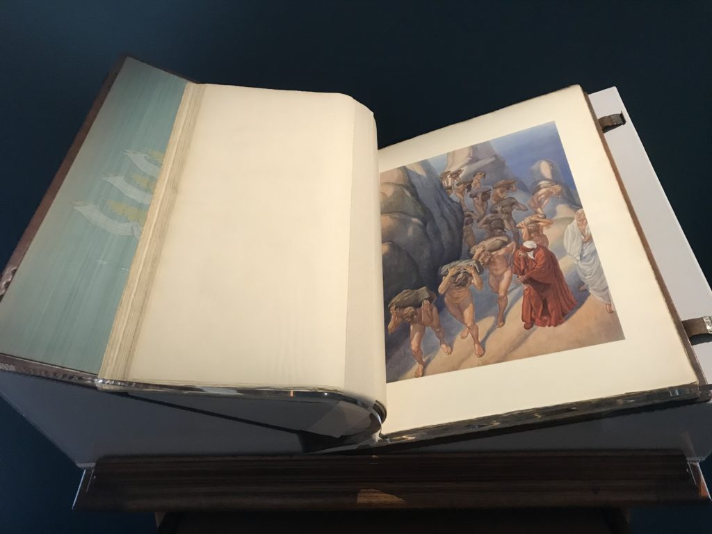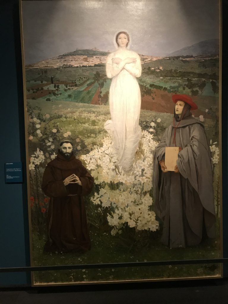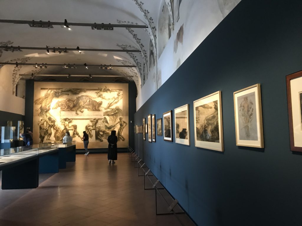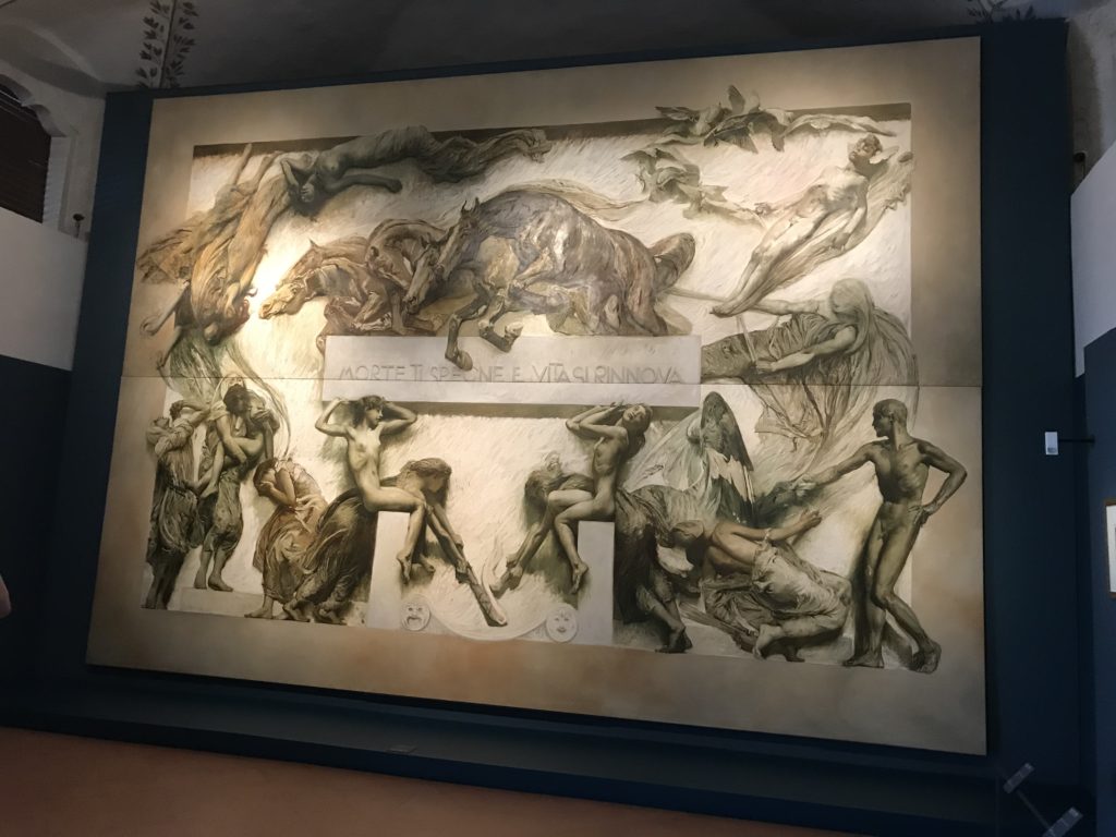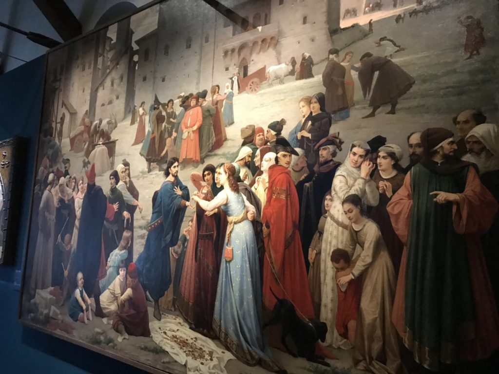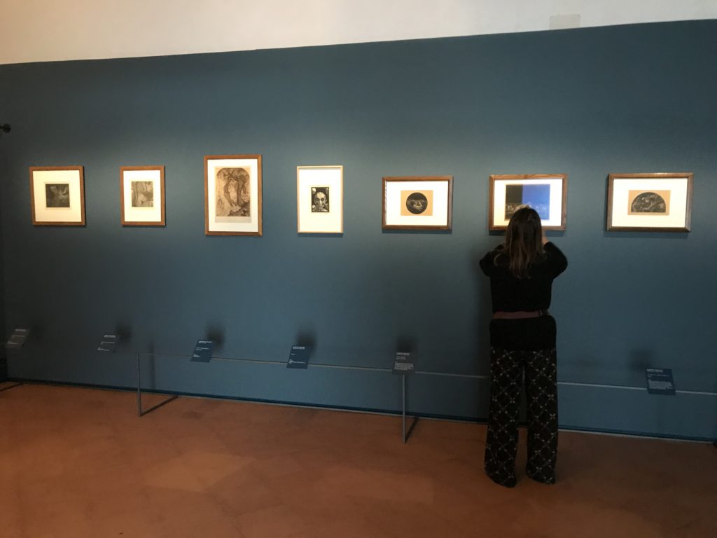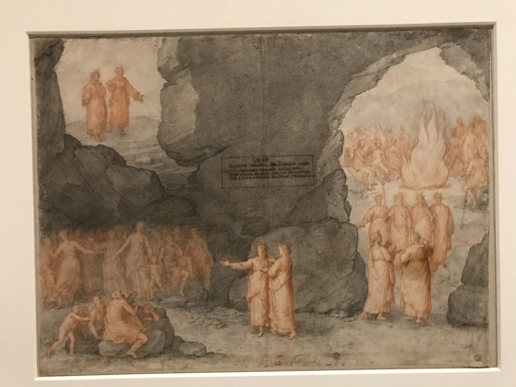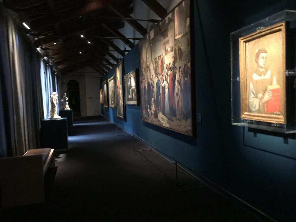 Forlì, tra il 1302 e 1313, è frequentata da Dante Alighieri, esule politico poiché ghibellino. La grande mostra multimediale sulla “Commedia”, e con rari pezzi provenienti da tutto il mondo, vuole rendere omaggio alla città romagnola. La figura di Dante è centrale, appunto, nella mostra “Dante, la visione dell’arte”, per le contaminazioni culturali in un arco temporale che va dal Duecento al Novecento. Le visioni figurative e a tratti oniriche di Cimabue, Giotto, Beato Angelico, Michelangelo, Tintoretto, Canova, Andrea del Castagno e molti altri sono state allestite, tutte, intorno al Sommo Poeta; e poi i preraffaeliti con Dante Gabriele Rossetti, i macchiaioli, i simbolisti e il Novecento di Galileo Chini, Plinio Nomellini, Felice Casorati, Lucio Fontana, Pablo Picasso. Più che una mostra, “Dante. La visione dell’arte”, nel settimo centenario della sua morte, è un evento culturale, un’occasione unica tra dipinti, sculture, disegni, illustrazioni e manoscritti. Beato Angelico, Michelangelo, Tintoretto gli autori che non ci si aspetta di vedere con alcune particolari opere (escono di rado dai loro musei), e oltre i maestri del Novecento su cui spicca Previati con il dipinto simbolista “Paolo e Francesca” di grande suggestione. La narrazione della “Divina Commedia” è l’asse centrale dell’esposizione intorno alla quale le arti visive si sono inchinate e hanno reso visuale e comunicativo per secoli, appunto, il suo testo, Michelangelo per primo, come effetto a dir poco esaltante della grande pittura scenica senza censure (inizialmente) nel “Giudizio” della Cappella Sistina. La mostra si pone su un livello internazionale, assolutamente da visitare, ho detto ai ragazzi del liceo “D. Cotugno” – L’Aquila durante l’esame di Stato. I grandi musei del pianeta: dall’Hermitage di San Pietroburgo, alla Walker Art Gallery di Liverpool, dalla National Gallery di Sofia alla Staatliche Kunstsammlungen di Dresda, dal Museum of Art di Toledo ai Musée des Beaux-Art di Nancy, di Tours, di Anger hanno fornito le loro più importanti collezioni insieme a quelli italiani: Galleria Nazionale d’Arte Moderna e Contemporanea di Roma, la Galleria Borghese, i Musei Vaticani e la Biblioteca Apostolica Vaticana, la Biblioteca Medicea Laurenziana, il Museo di Capodimonte. La visita. E’ come entrare in una dimensione sospesa che non si aspetta, bisogna poi avere il “Filo di Arianna” per muoversi nel complesso percorso espositivo – come fosse una capsula fuori dal tempo e dallo spazio – dentro musica, pittura, le parole e i versi di Dante proiettati nel complesso dei musei – convento di San Domenico come una sorta di ” lancio mediatico” insieme ai libri rari, proiezioni multimediali, allestimenti scenici, e infine trascorrere nella mostra un tempo particolare nel fascino interdisciplinare dei linguaggi e delle arti – un caleidoscopio che si muove nella griglia dei percorsi espositivi, – come non mai si potrà vedere per molti e molti anni nella grande bellezza figurativa, visionaria degli artisti, di secoli e secoli di interpretazioni su Dante, intorno a Dante, fino ai giorni d’oggi. La mostra: un’esperienza subliminale con i manoscritti e le prime edizioni a stampa della “Commedia”, i codici miniati del XIV e XV secolo, la stagione rinascimentale, il Neoclassicismo e la cultura preromantica e romantica, il Genio insomma, catalizza, anche il Risorgimento, la Prima Guerra Mondiale, e infine nella grafica e le edizioni a stampa tra la fine del Settecento e il Novecento mentre, nella scuola, Dante è sempre attuale e centrale per la formazione degli studenti, e per quel quinto canto dell’Inferno – l’ingresso nel Secondo Cerchio, i lussuriosi- divenuto un simbolo per un frastornato Dante. Vede loro che volano “due che ‘nsieme vanno,/ e paiono sì al vento esser , leggieri”… ( e come si diceva la straordinaria la pittura di Previati dei due amanti…) . Ma chi sono? Si svelano, ecco, l’incontro. Paolo e Francesca. In quel luogo buio e tetro di violenza, di bufera incessante, dove riecheggiano i pianti e gli stenti, si sente “ muggire” il vento, e i flussi di corrente contrari, e questa tempesta infernale non si arresta mai, trascina gli spiriti con la sua violenza, in particolare quando arrivano davanti al bordo del baratro infernale: la bufera delle passioni in vita è ora presente in quel luogo infimo dei lussuriosi, viceversa, Dante, utilizza parole che evocano la vita : “colombe”, “dolce”, “amor” quasi a tentare di assolverli, i due amanti, sdoganarli, i due amanti, a favore del “troppo amato…”, ma condannati infine all’ eterno dolore. Una dicotomia. Dunque lei, Francesca, parla, Paolo l’amore indissolubile piange intorno a lei, Dante è turbato, ha pena per quella categoria di dannati e Francesca è il primo peccatore a dialogare con lui che, sopraffatto, sviene. Una ulteriore prova della partecipazione emotiva davanti alla forza morale di Francesca, del suo spirito e della custodia, è l’affidamento e la protezione che ha nei confronti di Paolo quasi fosse indifeso. Ecco, ancora, torna l’interpretazione di Previati simbolista, visionario, che dipinge una versione di Paolo Malatesta e Francesca da Polenta (Paolo e Francesca, 1909, olio su tela, cm 230 x 260 ) nel vortice di quel campo visivo di una bellezza cruda, “oltre i confini della cornice”, la luminosità vibrante, elegante, immateriale dalle pennellate ondulate, i due volti cupi e solcati dalla stanchezza, i corpi giovani ma segnati dal dolore che si avvinghiano e salgono, quasi una levitazione alla ricerca della luce e dell’ossigeno sopra di loro, e le mani che si uniscono, i lunghi capelli rossi di Francesca che si sollevano dal corpo nel quadro quasi attratti da una forza occulta ascendente, i due corpi illuminati da un fascio di luce e dai colori tonali caldi e freddi nelle varianti cromatiche dell’ocra, della biacca, dei pas