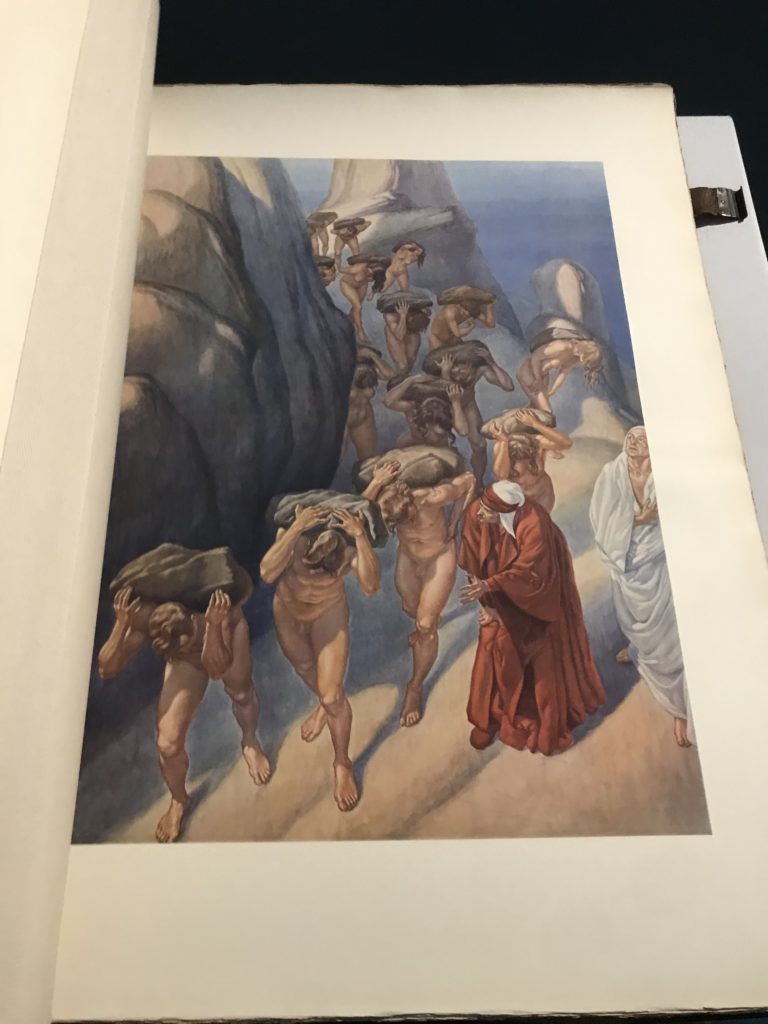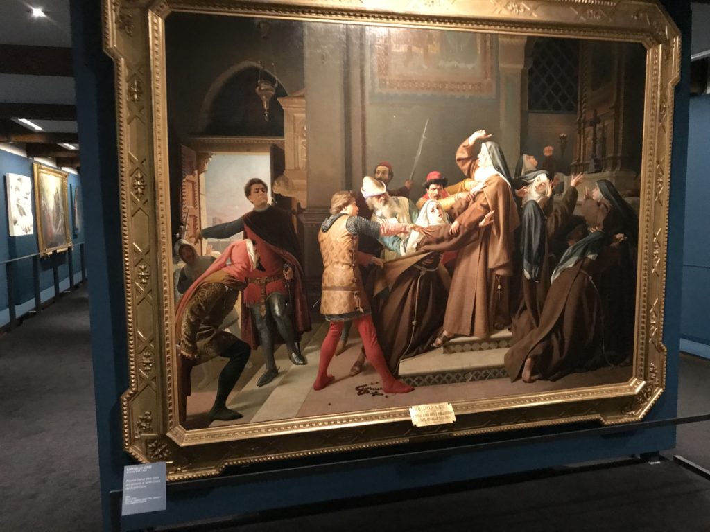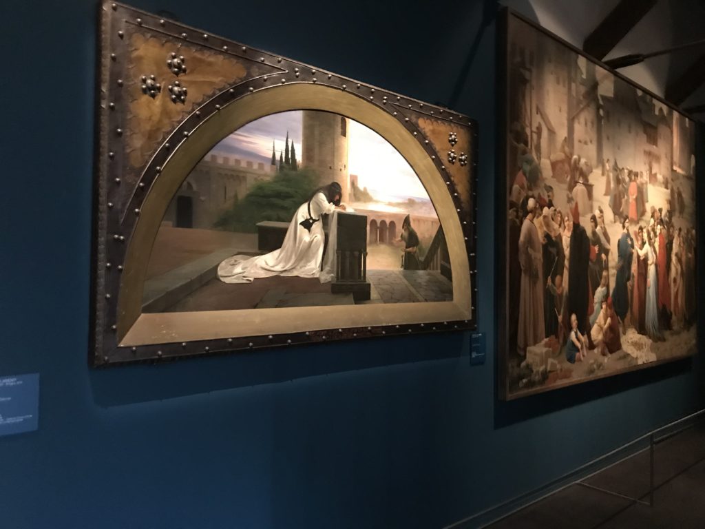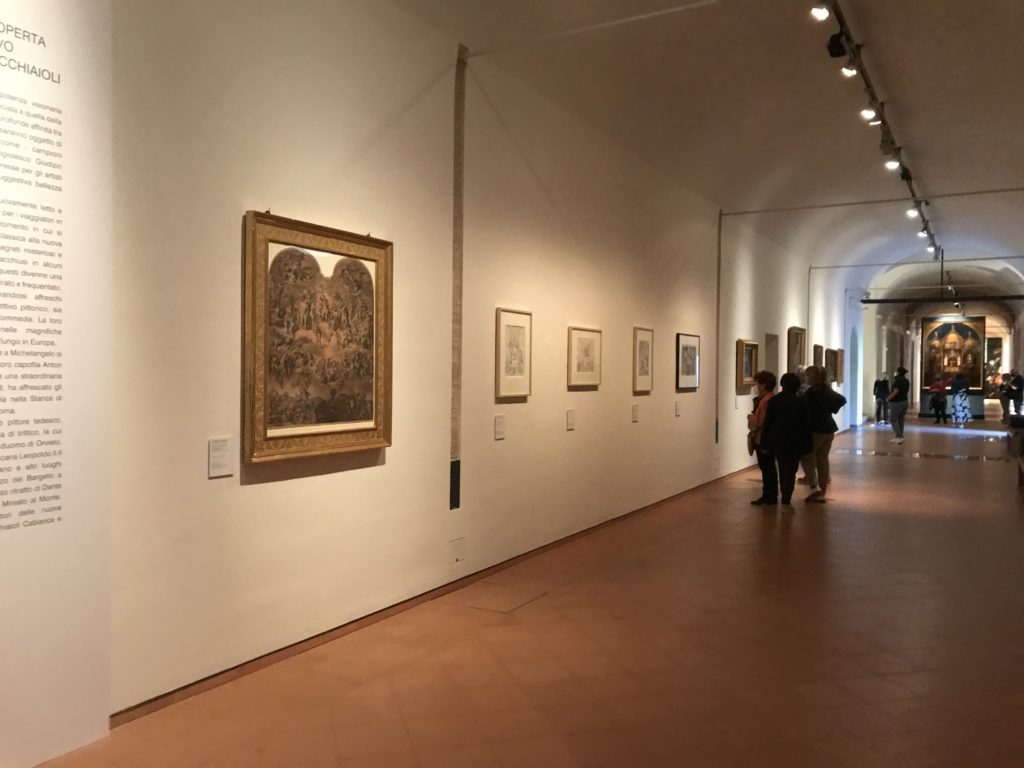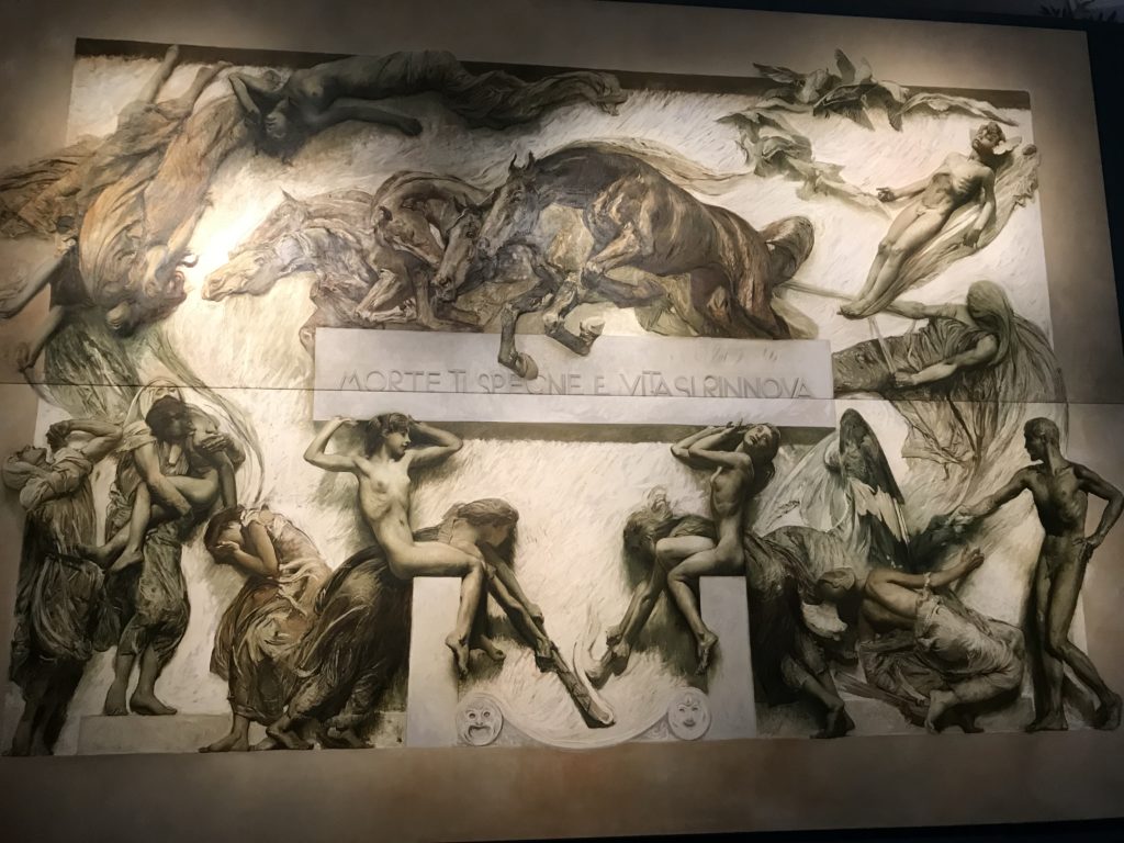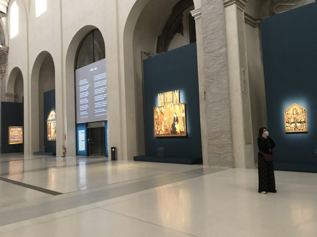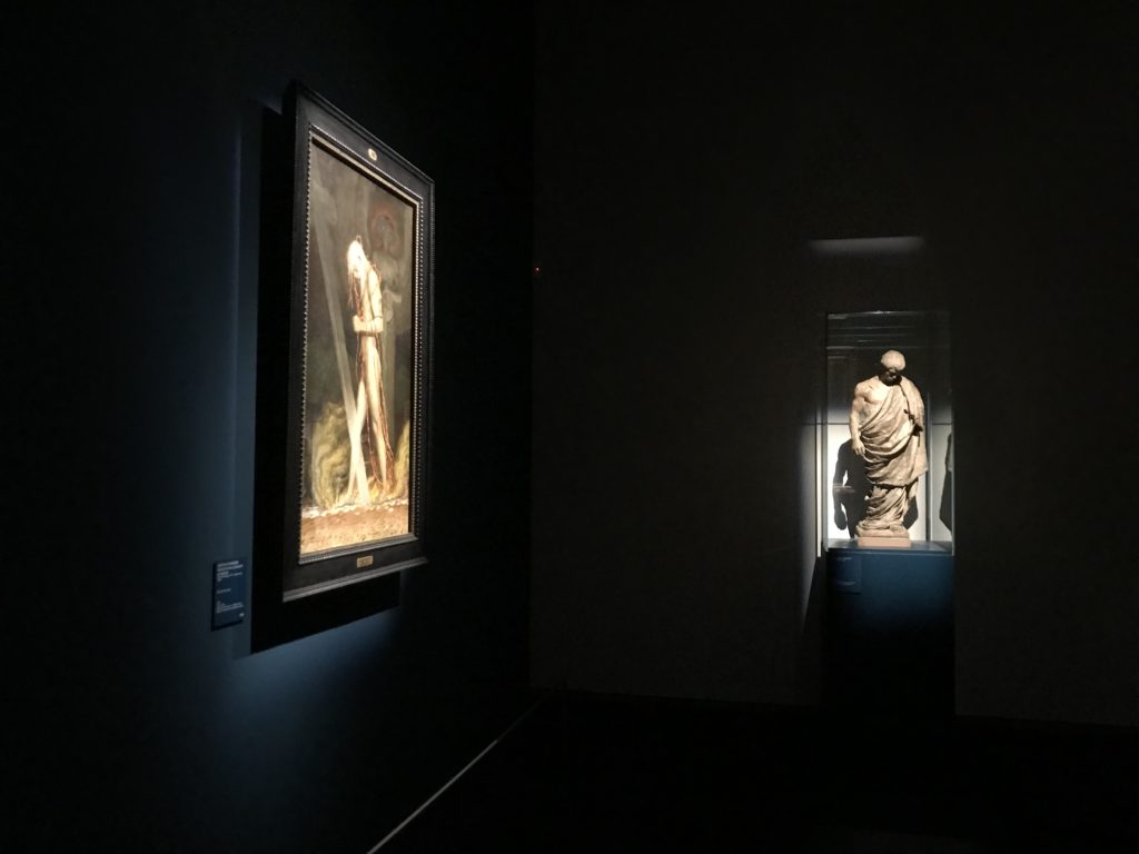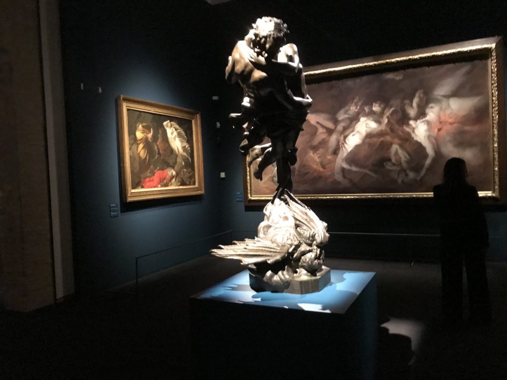 Forlì, tra il 1302 e 1313, è frequentata da Dante Alighieri, esule politico poiché ghibellino. La grande mostra multimediale sulla “Commedia”, e con rari pezzi provenienti da tutto il mondo, vuole rendere omaggio alla città romagnola. La figura di Dante è centrale, appunto, nella mostra “Dante, la visione dell’arte”, per le contaminazioni culturali in un arco temporale che va dal Duecento al Novecento. Le visioni figurative e a tratti oniriche di Cimabue, Giotto, Beato Angelico, Michelangelo, Tintoretto, Canova, Andrea del Castagno e molti altri sono state allestite, tutte, intorno al Sommo Poeta; e poi i preraffaeliti con Dante Gabriele Rossetti, i macchiaioli, i simbolisti e il Novecento di Galileo Chini, Plinio Nomellini, Felice Casorati, Lucio Fontana, Pablo Picasso. Più che una mostra, “Dante. La visione dell’arte”, nel settimo centenario della sua morte, è un evento culturale, un’occasione unica tra dipinti, sculture, disegni, illustrazioni e manoscritti. Beato Angelico, Michelangelo, Tintoretto gli autori che non ci si aspetta di vedere con alcune particolari opere (escono di rado dai loro musei), e oltre i maestri del Novecento su cui spicca Previati con il dipinto simbolista “Paolo e Francesca” di grande suggestione. La narrazione della “Divina Commedia” è l’asse centrale dell’esposizione intorno alla quale le arti visive si sono inchinate e hanno reso visuale e comunicativo per secoli, appunto, il suo testo, Michelangelo per primo, come effetto a dir poco esaltante della grande pittura scenica senza censure (inizialmente) nel “Giudizio” della Cappella Sistina. La mostra si pone su un livello internazionale, assolutamente da visitare, ho detto ai ragazzi del liceo “D. Cotugno” – L’Aquila durante l’esame di Stato. I grandi musei del pianeta: dall’Hermitage di San Pietroburgo, alla Walker Art Gallery di Liverpool, dalla National Gallery di Sofia alla Staatliche Kunstsammlungen di Dresda, dal Museum of Art di Toledo ai Musée des Beaux-Art di Nancy, di Tours, di Anger hanno fornito le loro più importanti collezioni insieme a quelli italiani: Galleria Nazionale d’Arte Moderna e Contemporanea di Roma, la Galleria Borghese, i Musei Vaticani e la Biblioteca Apostolica Vaticana, la Biblioteca Medicea Laurenziana, il Museo di Capodimonte. La visita. E’ come entrare in una dimensione sospesa che non si aspetta, bisogna poi avere il “Filo di Arianna” per muoversi nel complesso percorso espositivo – come fosse una capsula fuori dal tempo e dallo spazio – dentro musica, pittura, le parole e i versi di Dante proiettati nel complesso dei musei – convento di San Domenico come una sorta di ” lancio mediatico” insieme ai libri rari, proiezioni multimediali, allestimenti scenici, e infine trascorrere nella mostra un tempo particolare nel fascino interdisciplinare dei linguaggi e delle arti – un caleidoscopio che si muove nella griglia dei percorsi espositivi, – come non mai si potrà vedere per molti e molti anni nella grande bellezza figurativa, visionaria degli artisti, di secoli e secoli di interpretazioni su Dante, intorno a Dante, fino ai giorni d’oggi. La mostra: un’esperienza subliminale con i manoscritti e le prime edizioni a stampa della “Commedia”, i codici miniati del XIV e XV secolo, la stagione rinascimentale, il Neoclassicismo e la cultura preromantica e romantica, il Genio insomma, catalizza, anche il Risorgimento, la Prima Guerra Mondiale, e infine nella grafica e le edizioni a stampa tra la fine del Settecento e il Novecento mentre, nella scuola, Dante è sempre attuale e centrale per la formazione degli studenti, e per quel quinto canto dell’Inferno – l’ingresso nel Secondo Cerchio, i lussuriosi- divenuto un simbolo per un frastornato Dante. Vede loro che volano “due che ‘nsieme vanno,/ e paiono sì al vento esser , leggieri”… ( e come si diceva la straordinaria la pittura di Previati dei due amanti…) . Ma chi sono? Si svelano, ecco, l’incontro. Paolo e Francesca. In quel luogo buio e tetro di violenza, di bufera incessante, dove riecheggiano i pianti e gli stenti, si sente “ muggire” il vento, e i flussi di corrente contrari, e questa tempesta infernale non si arresta mai, trascina gli spiriti con la sua violenza, in particolare quando arrivano davanti al bordo del baratro infernale: la bufera delle passioni in vita è ora presente in quel luogo infimo dei lussuriosi, viceversa, Dante, utilizza parole che evocano la vita : “colombe”, “dolce”, “amor” quasi a tentare di assolverli, i due amanti, sdoganarli, i due amanti, a favore del “troppo amato…”, ma condannati infine all’ eterno dolore. Una dicotomia. Dunque lei, Francesca, parla, Paolo l’amore indissolubile piange intorno a lei, Dante è turbato, ha pena per quella categoria di dannati e Francesca è il primo peccatore a dialogare con lui che, sopraffatto, sviene. Una ulteriore prova della partecipazione emotiva davanti alla forza morale di Francesca, del suo spirito e della custodia, è l’affidamento e la protezione che ha nei confronti di Paolo quasi fosse indifeso. Ecco, ancora, torna l’interpretazione di Previati simbolista, visionario, che dipinge una versione di Paolo Malatesta e Francesca da Polenta (Paolo e Francesca, 1909, olio su tela, cm 230 x 260 ) nel vortice di quel campo visivo di una bellezza cruda, “oltre i confini della cornice”, la luminosità vibrante, elegante, immateriale dalle pennellate ondulate, i due volti cupi e solcati dalla stanchezza, i corpi giovani ma segnati dal dolore che si avvinghiano e salgono, quasi una levitazione alla ricerca della luce e dell’ossigeno sopra di loro, e le mani che si uniscono, i lunghi capelli rossi di Francesca che si sollevano dal corpo nel quadro quasi attratti da una forza occulta ascendente, i due corpi illuminati da un fascio di luce e dai colori tonali caldi e freddi nelle varianti cromatiche dell’ocra, della biacca, dei pas