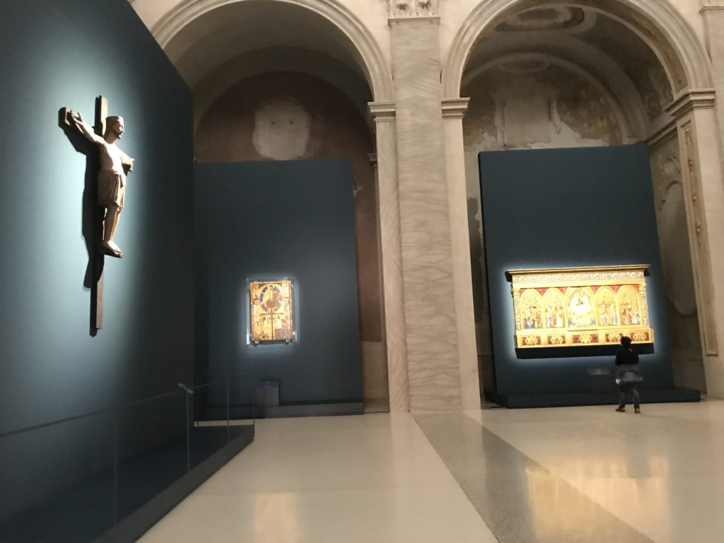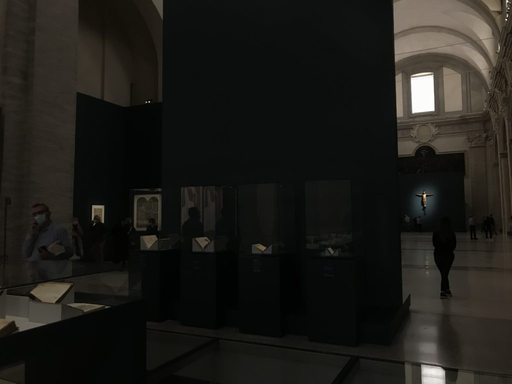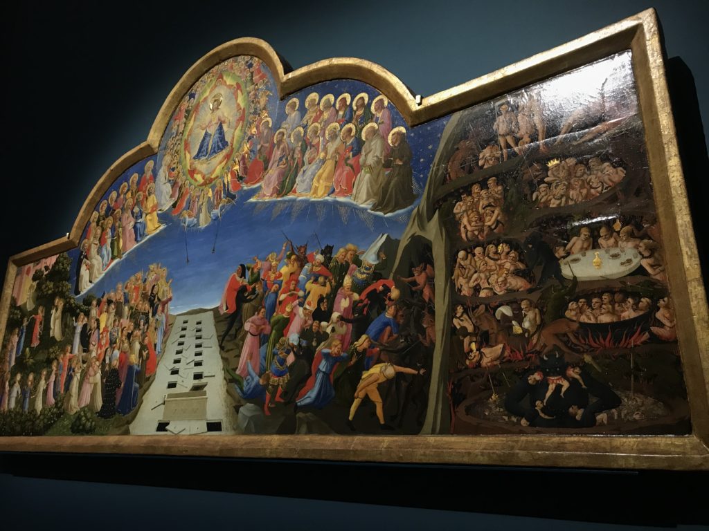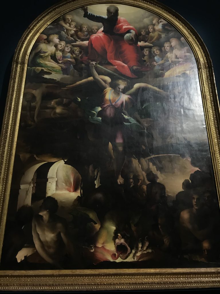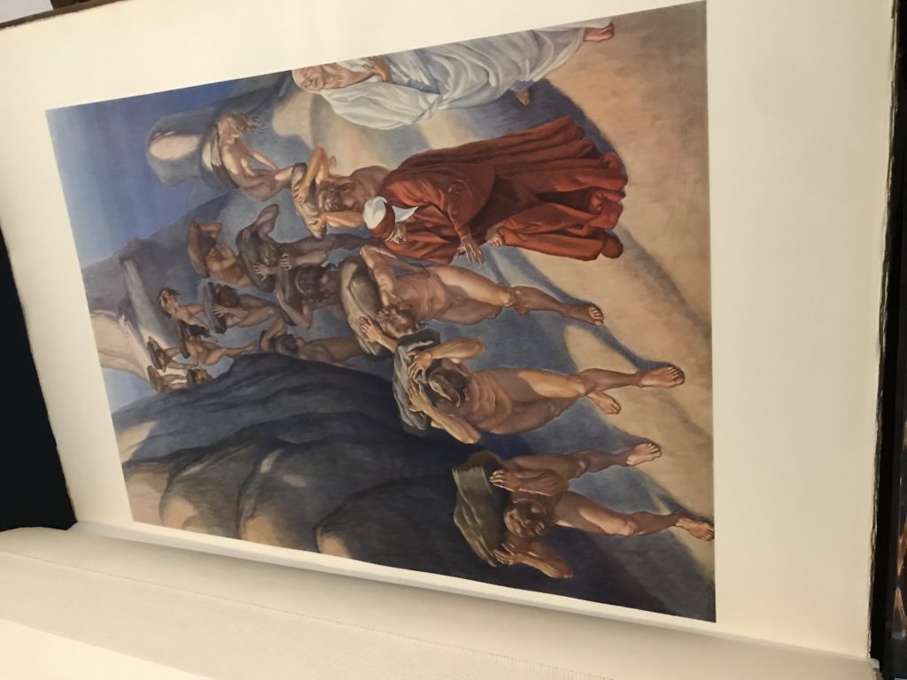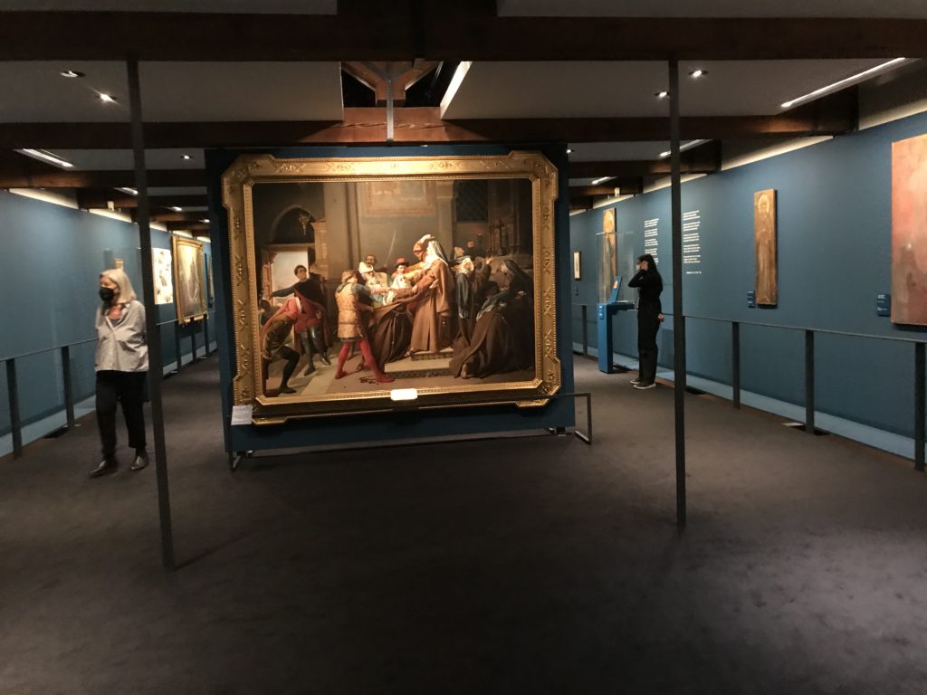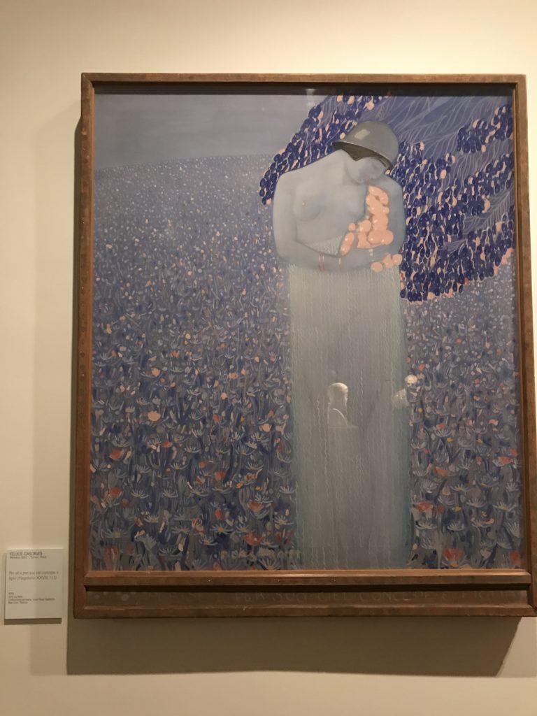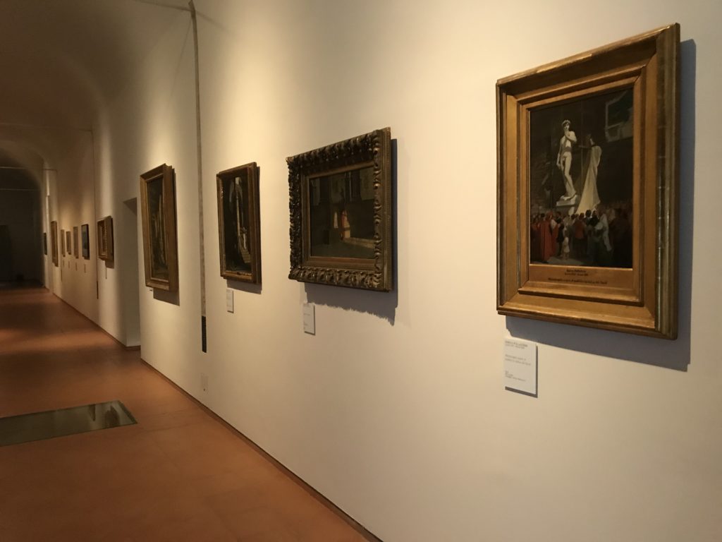 Forlì, tra il 1302 e 1313, è frequentata da Dante Alighieri, esule politico poiché ghibellino. La grande mostra multimediale sulla “Commedia”, e con rari pezzi provenienti da tutto il mondo, vuole rendere omaggio alla città romagnola. La figura di Dante è centrale, appunto, nella mostra “Dante, la visione dell’arte”, per le contaminazioni culturali in un arco temporale che va dal Duecento al Novecento. Le visioni figurative e a tratti oniriche di Cimabue, Giotto, Beato Angelico, Michelangelo, Tintoretto, Canova, Andrea del Castagno e molti altri sono state allestite, tutte, intorno al Sommo Poeta; e poi i preraffaeliti con Dante Gabriele Rossetti, i macchiaioli, i simbolisti e il Novecento di Galileo Chini, Plinio Nomellini, Felice Casorati, Lucio Fontana, Pablo Picasso. Più che una mostra, “Dante. La visione dell’arte”, nel settimo centenario della sua morte, è un evento culturale, un’occasione unica tra dipinti, sculture, disegni, illustrazioni e manoscritti. Beato Angelico, Michelangelo, Tintoretto gli autori che non ci si aspetta di vedere con alcune particolari opere (escono di rado dai loro musei), e oltre i maestri del Novecento su cui spicca Previati con il dipinto simbolista “Paolo e Francesca” di grande suggestione. La narrazione della “Divina Commedia” è l’asse centrale dell’esposizione intorno alla quale le arti visive si sono inchinate e hanno reso visuale e comunicativo per secoli, appunto, il suo testo, Michelangelo per primo, come effetto a dir poco esaltante della grande pittura scenica senza censure (inizialmente) nel “Giudizio” della Cappella Sistina. La mostra si pone su un livello internazionale, assolutamente da visitare, ho detto ai ragazzi del liceo “D. Cotugno” – L’Aquila durante l’esame di Stato. I grandi musei del pianeta: dall’Hermitage di San Pietroburgo, alla Walker Art Gallery di Liverpool, dalla National Gallery di Sofia alla Staatliche Kunstsammlungen di Dresda, dal Museum of Art di Toledo ai Musée des Beaux-Art di Nancy, di Tours, di Anger hanno fornito le loro più importanti collezioni insieme a quelli italiani: Galleria Nazionale d’Arte Moderna e Contemporanea di Roma, la Galleria Borghese, i Musei Vaticani e la Biblioteca Apostolica Vaticana, la Biblioteca Medicea Laurenziana, il Museo di Capodimonte. La visita. E’ come entrare in una dimensione sospesa che non si aspetta, bisogna poi avere il “Filo di Arianna” per muoversi nel complesso percorso espositivo – come fosse una capsula fuori dal tempo e dallo spazio – dentro musica, pittura, le parole e i versi di Dante proiettati nel complesso dei musei – convento di San Domenico come una sorta di ” lancio mediatico” insieme ai libri rari, proiezioni multimediali, allestimenti scenici, e infine trascorrere nella mostra un tempo particolare nel fascino interdisciplinare dei linguaggi e delle arti – un caleidoscopio che si muove nella griglia dei percorsi espositivi, – come non mai si potrà vedere per molti e molti anni nella grande bellezza figurativa, visionaria degli artisti, di secoli e secoli di interpretazioni su Dante, intorno a Dante, fino ai giorni d’oggi. La mostra: un’esperienza subliminale con i manoscritti e le prime edizioni a stampa della “Commedia”, i codici miniati del XIV e XV secolo, la stagione rinascimentale, il Neoclassicismo e la cultura preromantica e romantica, il Genio insomma, catalizza, anche il Risorgimento, la Prima Guerra Mondiale, e infine nella grafica e le edizioni a stampa tra la fine del Settecento e il Novecento mentre, nella scuola, Dante è sempre attuale e centrale per la formazione degli studenti, e per quel quinto canto dell’Inferno – l’ingresso nel Secondo Cerchio, i lussuriosi- divenuto un simbolo per un frastornato Dante. Vede loro che volano “due che ‘nsieme vanno,/ e paiono sì al vento esser , leggieri”… ( e come si diceva la straordinaria la pittura di Previati dei due amanti…) . Ma chi sono? Si svelano, ecco, l’incontro. Paolo e Francesca. In quel luogo buio e tetro di violenza, di bufera incessante, dove riecheggiano i pianti e gli stenti, si sente “ muggire” il vento, e i flussi di corrente contrari, e questa tempesta infernale non si arresta mai, trascina gli spiriti con la sua violenza, in particolare quando arrivano davanti al bordo del baratro infernale: la bufera delle passioni in vita è ora presente in quel luogo infimo dei lussuriosi, viceversa, Dante, utilizza parole che evocano la vita : “colombe”, “dolce”, “amor” quasi a tentare di assolverli, i due amanti, sdoganarli, i due amanti, a favore del “troppo amato…”, ma condannati infine all’ eterno dolore. Una dicotomia. Dunque lei, Francesca, parla, Paolo l’amore indissolubile piange intorno a lei, Dante è turbato, ha pena per quella categoria di dannati e Francesca è il primo peccatore a dialogare con lui che, sopraffatto, sviene. Una ulteriore prova della partecipazione emotiva davanti alla forza morale di Francesca, del suo spirito e della custodia, è l’affidamento e la protezione che ha nei confronti di Paolo quasi fosse indifeso. Ecco, ancora, torna l’interpretazione di Previati simbolista, visionario, che dipinge una versione di Paolo Malatesta e Francesca da Polenta (Paolo e Francesca, 1909, olio su tela, cm 230 x 260 ) nel vortice di quel campo visivo di una bellezza cruda, “oltre i confini della cornice”, la luminosità vibrante, elegante, immateriale dalle pennellate ondulate, i due volti cupi e solcati dalla stanchezza, i corpi giovani ma segnati dal dolore che si avvinghiano e salgono, quasi una levitazione alla ricerca della luce e dell’ossigeno sopra di loro, e le mani che si uniscono, i lunghi capelli rossi di Francesca che si sollevano dal corpo nel quadro quasi attratti da una forza occulta ascendente, i due corpi illuminati da un fascio di luce e dai colori tonali caldi e freddi nelle varianti cromatiche dell’ocra, della biacca, dei pas