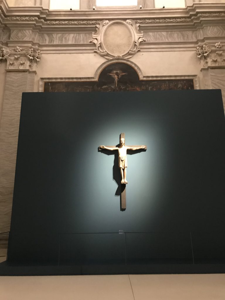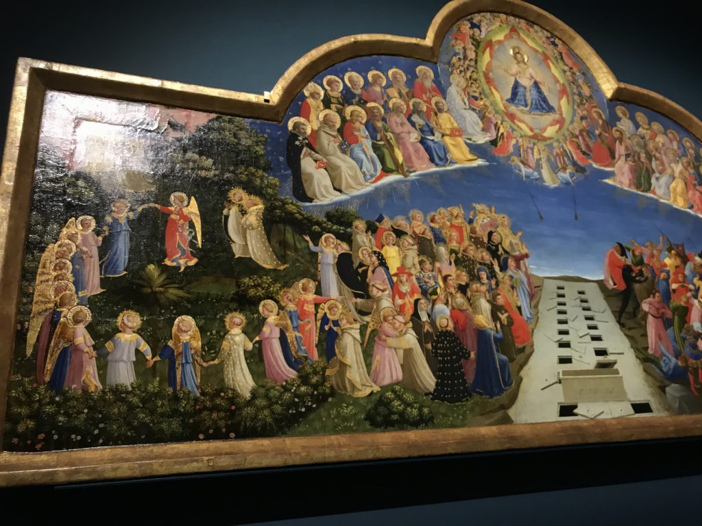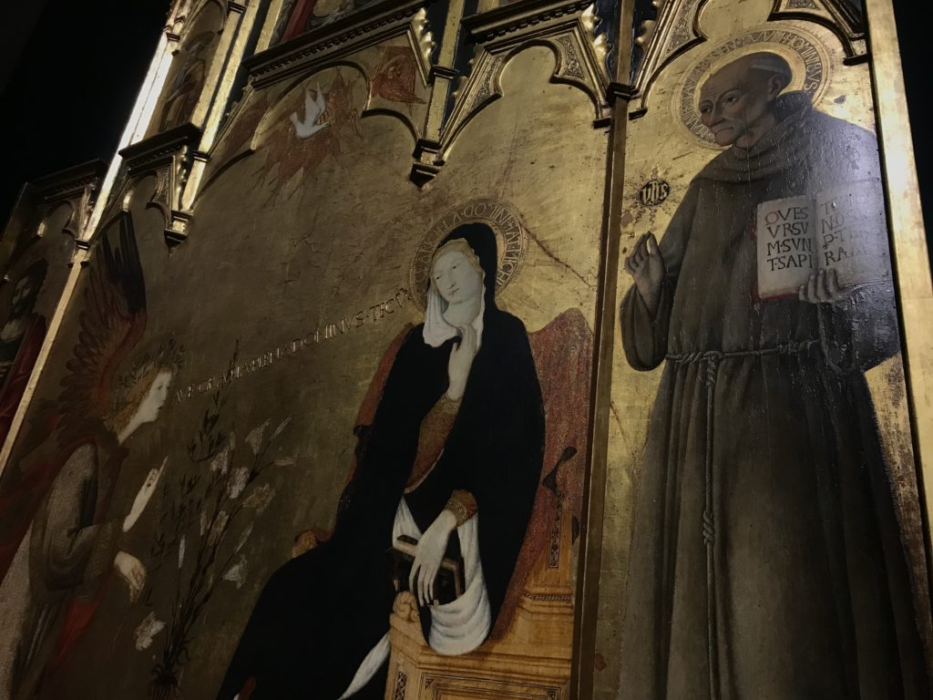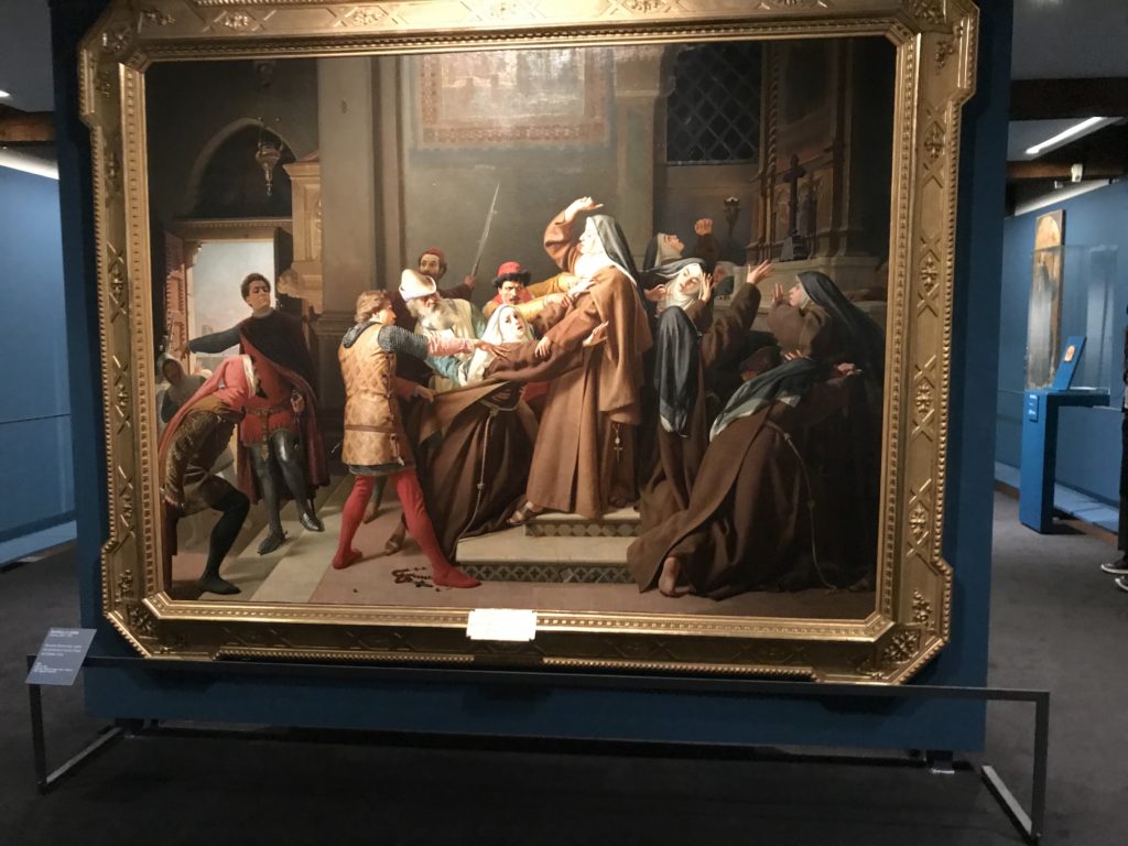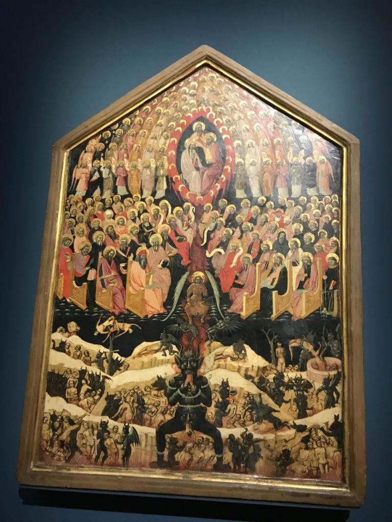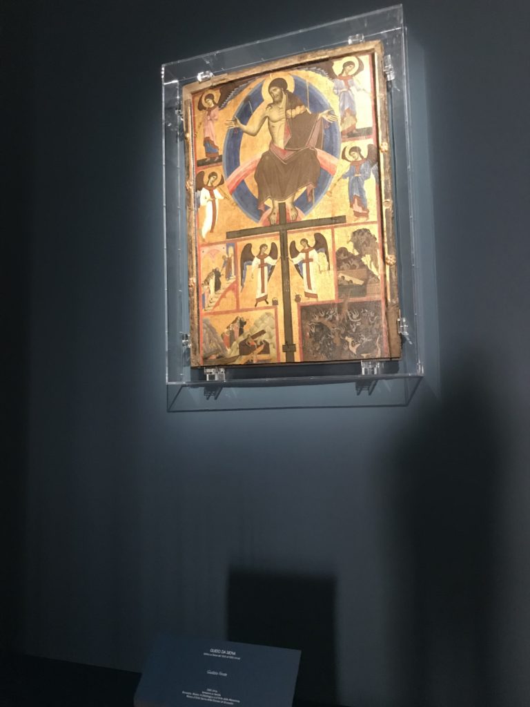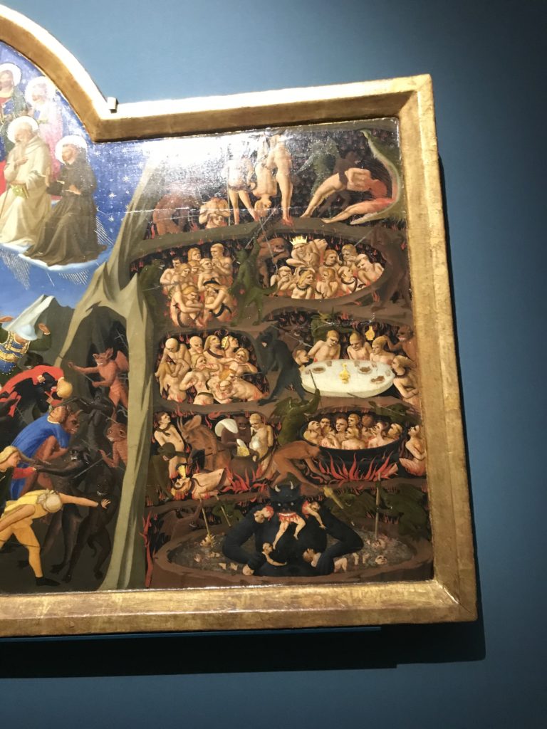 Forlì, tra il 1302 e 1313, è frequentata da Dante Alighieri, esule politico poiché ghibellino. La grande mostra multimediale sulla “Commedia”, e con rari pezzi provenienti da tutto il mondo, vuole rendere omaggio alla città romagnola. La figura di Dante è centrale, appunto, nella mostra “Dante, la visione dell’arte”, per le contaminazioni culturali in un arco temporale che va dal Duecento al Novecento. Le visioni figurative e a tratti oniriche di Cimabue, Giotto, Beato Angelico, Michelangelo, Tintoretto, Canova, Andrea del Castagno e molti altri sono state allestite, tutte, intorno al Sommo Poeta; e poi i preraffaeliti con Dante Gabriele Rossetti, i macchiaioli, i simbolisti e il Novecento di Galileo Chini, Plinio Nomellini, Felice Casorati, Lucio Fontana, Pablo Picasso. Più che una mostra, “Dante. La visione dell’arte”, nel settimo centenario della sua morte, è un evento culturale, un’occasione unica tra dipinti, sculture, disegni, illustrazioni e manoscritti. Beato Angelico, Michelangelo, Tintoretto gli autori che non ci si aspetta di vedere con alcune particolari opere (escono di rado dai loro musei), e oltre i maestri del Novecento su cui spicca Previati con il dipinto simbolista “Paolo e Francesca” di grande suggestione. La narrazione della “Divina Commedia” è l’asse centrale dell’esposizione intorno alla quale le arti visive si sono inchinate e hanno reso visuale e comunicativo per secoli, appunto, il suo testo, Michelangelo per primo, come effetto a dir poco esaltante della grande pittura scenica senza censure (inizialmente) nel “Giudizio” della Cappella Sistina. La mostra si pone su un livello internazionale, assolutamente da visitare, ho detto ai ragazzi del liceo “D. Cotugno” – L’Aquila durante l’esame di Stato. I grandi musei del pianeta: dall’Hermitage di San Pietroburgo, alla Walker Art Gallery di Liverpool, dalla National Gallery di Sofia alla Staatliche Kunstsammlungen di Dresda, dal Museum of Art di Toledo ai Musée des Beaux-Art di Nancy, di Tours, di Anger hanno fornito le loro più importanti collezioni insieme a quelli italiani: Galleria Nazionale d’Arte Moderna e Contemporanea di Roma, la Galleria Borghese, i Musei Vaticani e la Biblioteca Apostolica Vaticana, la Biblioteca Medicea Laurenziana, il Museo di Capodimonte. La visita. E’ come entrare in una dimensione sospesa che non si aspetta, bisogna poi avere il “Filo di Arianna” per muoversi nel complesso percorso espositivo – come fosse una capsula fuori dal tempo e dallo spazio – dentro musica, pittura, le parole e i versi di Dante proiettati nel complesso dei musei – convento di San Domenico come una sorta di ” lancio mediatico” insieme ai libri rari, proiezioni multimediali, allestimenti scenici, e infine trascorrere nella mostra un tempo particolare nel fascino interdisciplinare dei linguaggi e delle arti – un caleidoscopio che si muove nella griglia dei percorsi espositivi, – come non mai si potrà vedere per molti e molti anni nella grande bellezza figurativa, visionaria degli artisti, di secoli e secoli di interpretazioni su Dante, intorno a Dante, fino ai giorni d’oggi. La mostra: un’esperienza subliminale con i manoscritti e le prime edizioni a stampa della “Commedia”, i codici miniati del XIV e XV secolo, la stagione rinascimentale, il Neoclassicismo e la cultura preromantica e romantica, il Genio insomma, catalizza, anche il Risorgimento, la Prima Guerra Mondiale, e infine nella grafica e le edizioni a stampa tra la fine del Settecento e il Novecento mentre, nella scuola, Dante è sempre attuale e centrale per la formazione degli studenti, e per quel quinto canto dell’Inferno – l’ingresso nel Secondo Cerchio, i lussuriosi- divenuto un simbolo per un frastornato Dante. Vede loro che volano “due che ‘nsieme vanno,/ e paiono sì al vento esser , leggieri”… ( e come si diceva la straordinaria la pittura di Previati dei due amanti…) . Ma chi sono? Si svelano, ecco, l’incontro. Paolo e Francesca. In quel luogo buio e tetro di violenza, di bufera incessante, dove riecheggiano i pianti e gli stenti, si sente “ muggire” il vento, e i flussi di corrente contrari, e questa tempesta infernale non si arresta mai, trascina gli spiriti con la sua violenza, in particolare quando arrivano davanti al bordo del baratro infernale: la bufera delle passioni in vita è ora presente in quel luogo infimo dei lussuriosi, viceversa, Dante, utilizza parole che evocano la vita : “colombe”, “dolce”, “amor” quasi a tentare di assolverli, i due amanti, sdoganarli, i due amanti, a favore del “troppo amato…”, ma condannati infine all’ eterno dolore. Una dicotomia. Dunque lei, Francesca, parla, Paolo l’amore indissolubile piange intorno a lei, Dante è turbato, ha pena per quella categoria di dannati e Francesca è il primo peccatore a dialogare con lui che, sopraffatto, sviene. Una ulteriore prova della partecipazione emotiva davanti alla forza morale di Francesca, del suo spirito e della custodia, è l’affidamento e la protezione che ha nei confronti di Paolo quasi fosse indifeso. Ecco, ancora, torna l’interpretazione di Previati simbolista, visionario, che dipinge una versione di Paolo Malatesta e Francesca da Polenta (Paolo e Francesca, 1909, olio su tela, cm 230 x 260 ) nel vortice di quel campo visivo di una bellezza cruda, “oltre i confini della cornice”, la luminosità vibrante, elegante, immateriale dalle pennellate ondulate, i due volti cupi e solcati dalla stanchezza, i corpi giovani ma segnati dal dolore che si avvinghiano e salgono, quasi una levitazione alla ricerca della luce e dell’ossigeno sopra di loro, e le mani che si uniscono, i lunghi capelli rossi di Francesca che si sollevano dal corpo nel quadro quasi attratti da una forza occulta ascendente, i due corpi illuminati da un fascio di luce e dai colori tonali caldi e freddi nelle varianti cromatiche dell’ocra, della biacca, dei pas