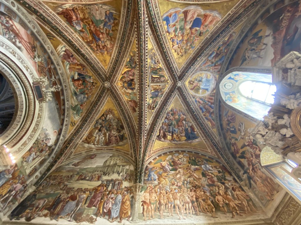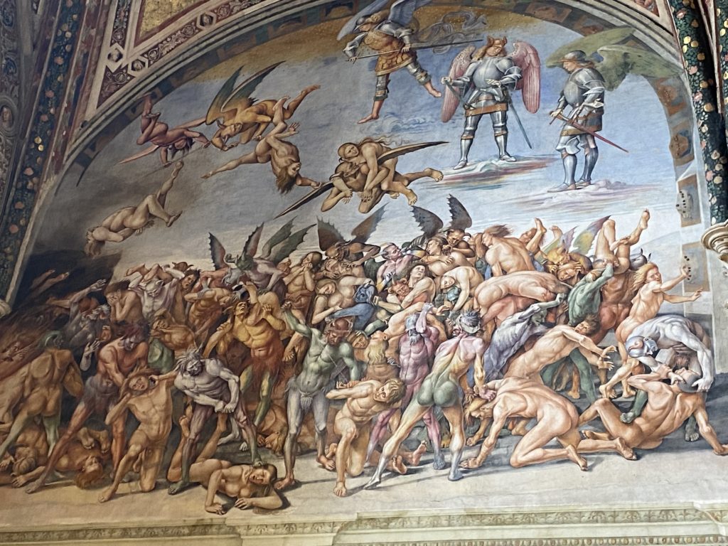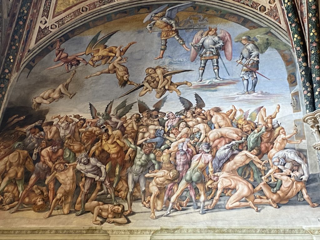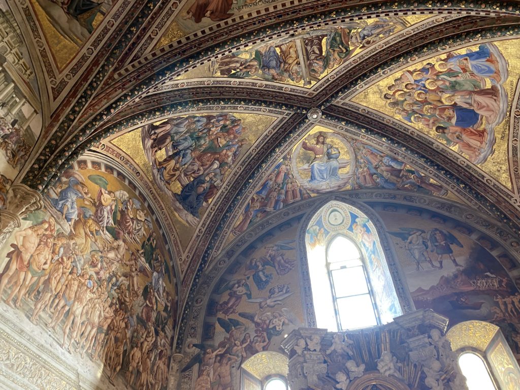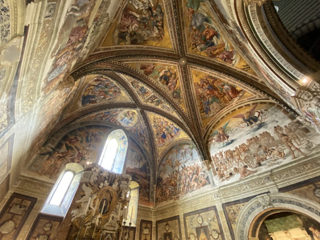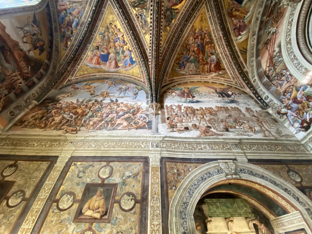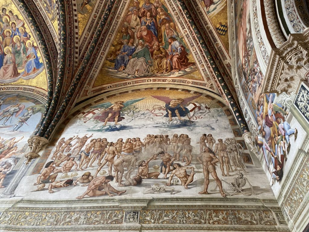 Cappella di San Brizio o cappella Nova, è collocata nel lato meridionale del transetto, ultimo a destra, del Duomo di Orvieto. Inizialmente, nella detta Cappella, furono realizzate le vele da Beato Angelico e Benozzo Gozzoli nel 1447. Luca Signorelli completa nel 1499 fino al 1502, e l’opera della Cappella prende il nome indicato nel “Giudizio Universale”. Sintetizza la fine dell’umanità, la redenzione dell’Anticristo e la Resurrezione dei morti e della carne. I grandi scenari onirici dell’affresco di Cristo Giudice, il Paradiso, l’Inferno compongono il ciclo iconografico e drammatico osservato nelle stesse scene apocalittiche. L’effetto prospettico – illusionistico delle pareti dipinte, divise in due registri e organizzate come quinte teatrali scenicamente con pilastri verticali e cornici orizzontali. La pittura mette in atto il clima storico dell’epoca: gli sconvolgimenti dovuti alle guerre, conflitti religiosi, epidemie e carestie alle soglie del nuovo secolo. Il focus dell’opera di Signorini nelle “Storie degli ultimi giorni” si caratterizza per la possente spaziale originalità degli eventi trattati e costituisce un unicum nel panorama della seconda ondata del Rinascimento maturo. Le scene: prediche e fatti dell’Anticristo, Finimondo, Resurrezione della Carne, Dannati, Beati, Paradiso, Inferno. La cappella affrescata e una continua lotta tra il bene e il male che si rincorrono, ma senza mediazione alcuna. Lasciano sul terreno le rovine e gli strascichi del doloroso dilemma. Non c’è pausa nelle composizioni incalzanti, non c’è tregua, la visione è di grande impatto visivo, sovrasta, interroga, sconcerta: tutto il mondo conosciuto e lì. “L’invenzione” delle scene, la pittura che diviene arringa contro l’umanità tutta, la complessità, i particolari, e infine i dettagli di grande efficacia resi materia della comunicazione visuale inedita nel quadro della pittura degli Stati italiani. Signorelli è l’inventore di una “macchina” tumultuosa, apparentemente confusa, poiché proprio così deve essere. La sua genialità, la sua visione escatologica della vita deve sconcertare il fruitore dell’opera enciclopedica, riversargli addosso tutto il male che diviene immagine, annichilire l’uomo, sottometterlo alle forze del male che visualizzano i peggiori nostri incubi sopiti ma non sconfitti per incontrare infine il Cristianesimo e la sua verità nella parola di Dio. Elementi soprannaturali, guerre, omicidi come si diceva, demoni alati e mostruosi, pioggia infuocata, avvolgono le genti: la catastrofe è appena iniziata. Il biblico maremoto solleva le navi con le onde. La città è pronta a capitolare. Il sole e la luna sono oscurati, ma poi la narrazione degli affreschi cede alla salvezza, e quando tutto sembrava perduto, l’uomo è salvo nella sua ragione profonda e nelle sue conseguenti azioni.