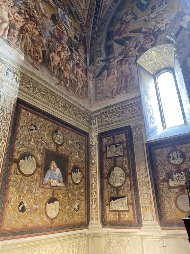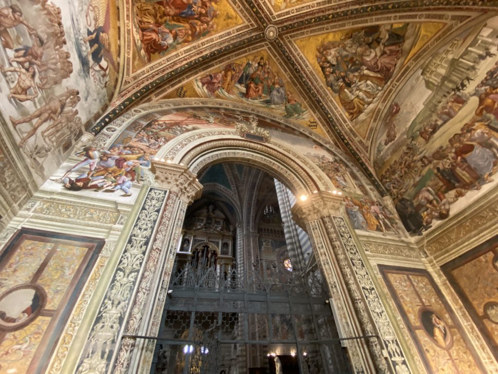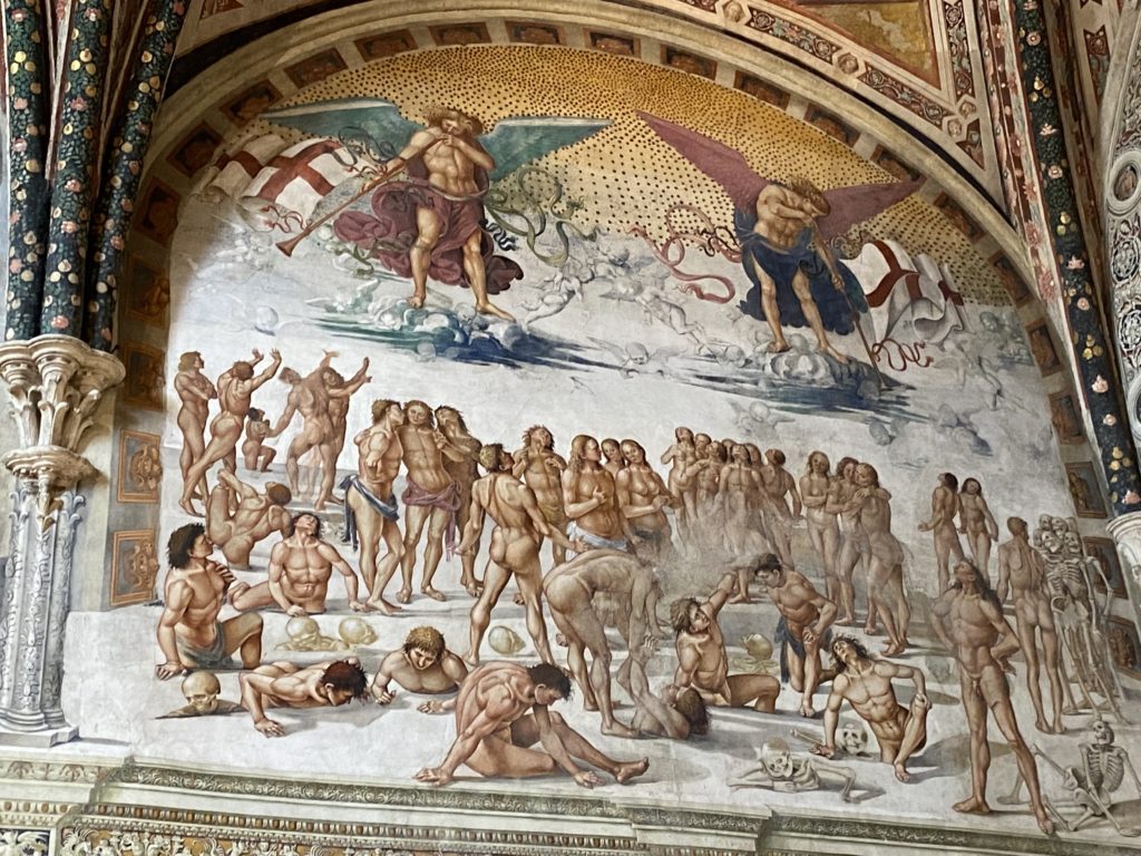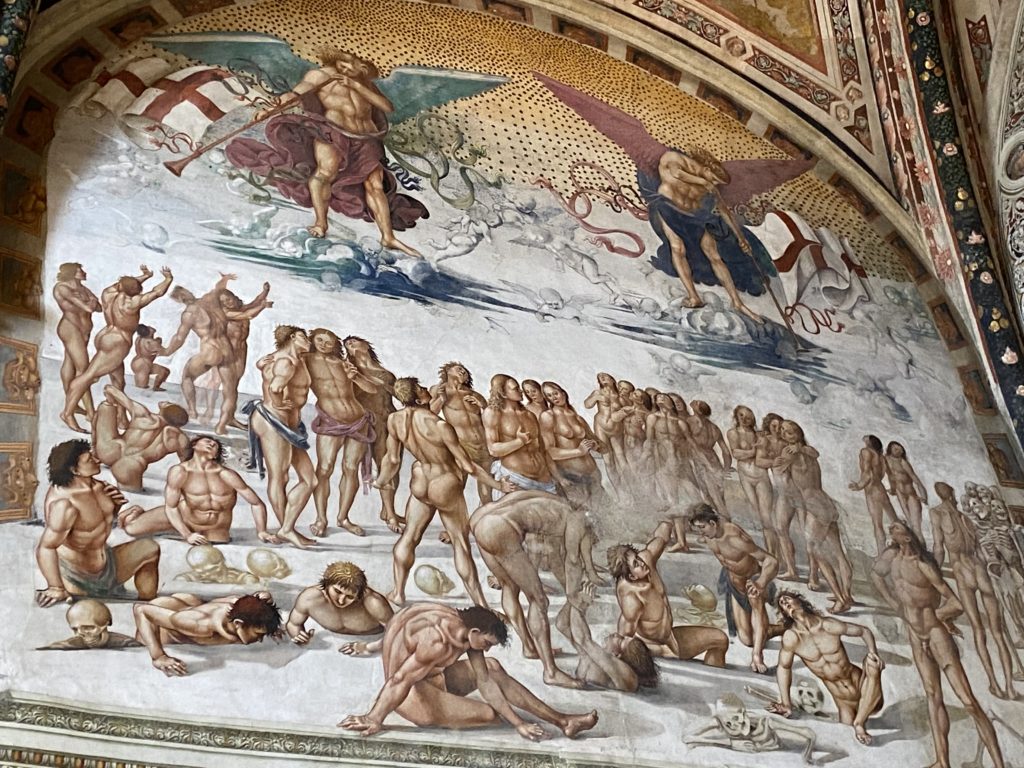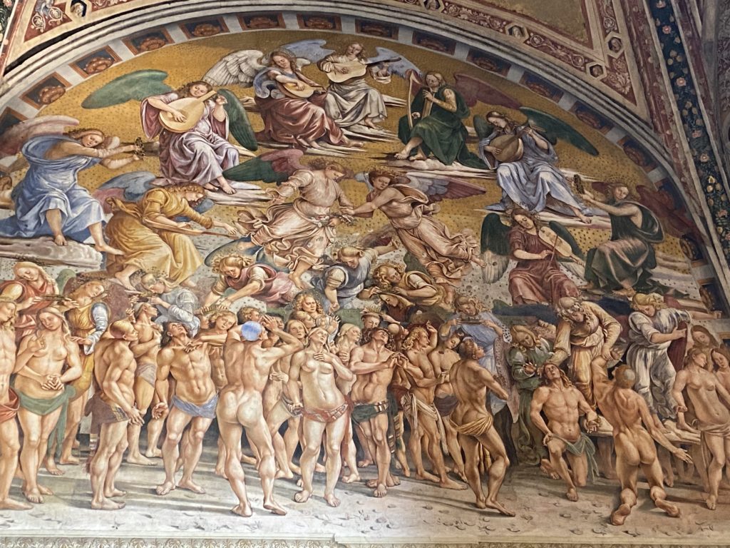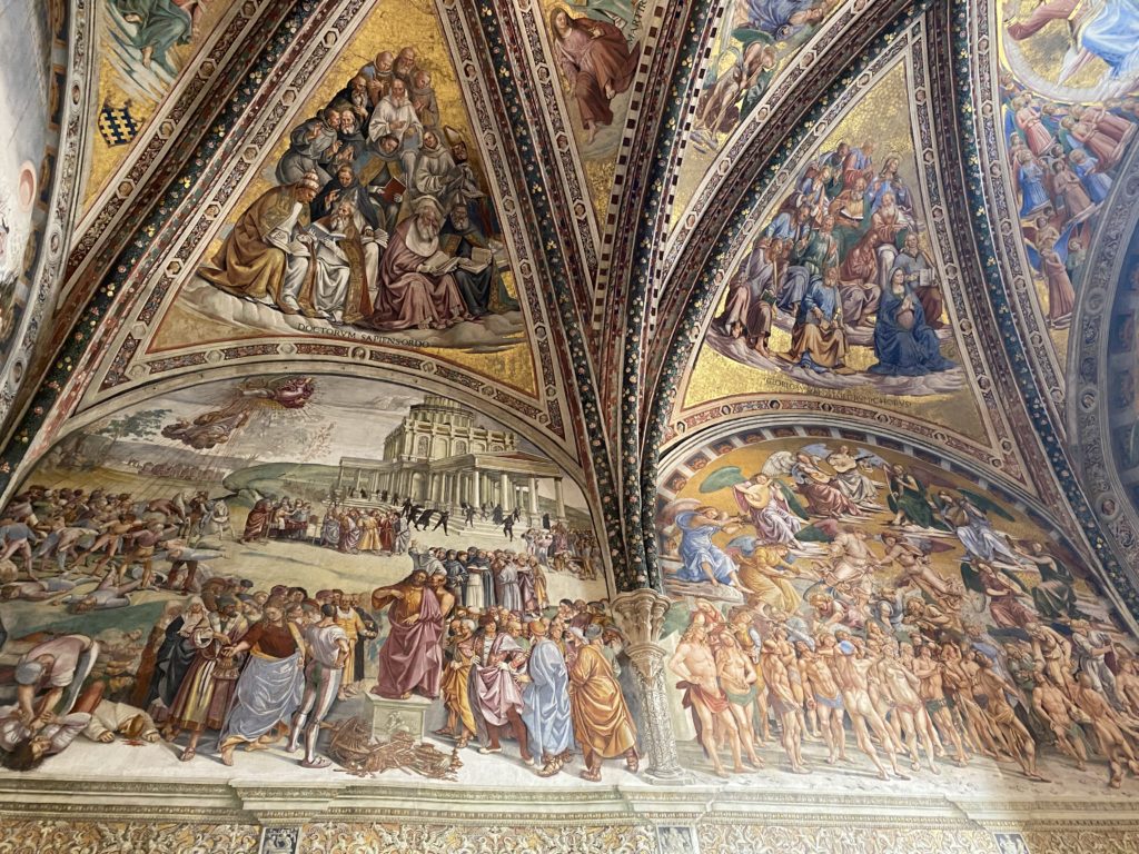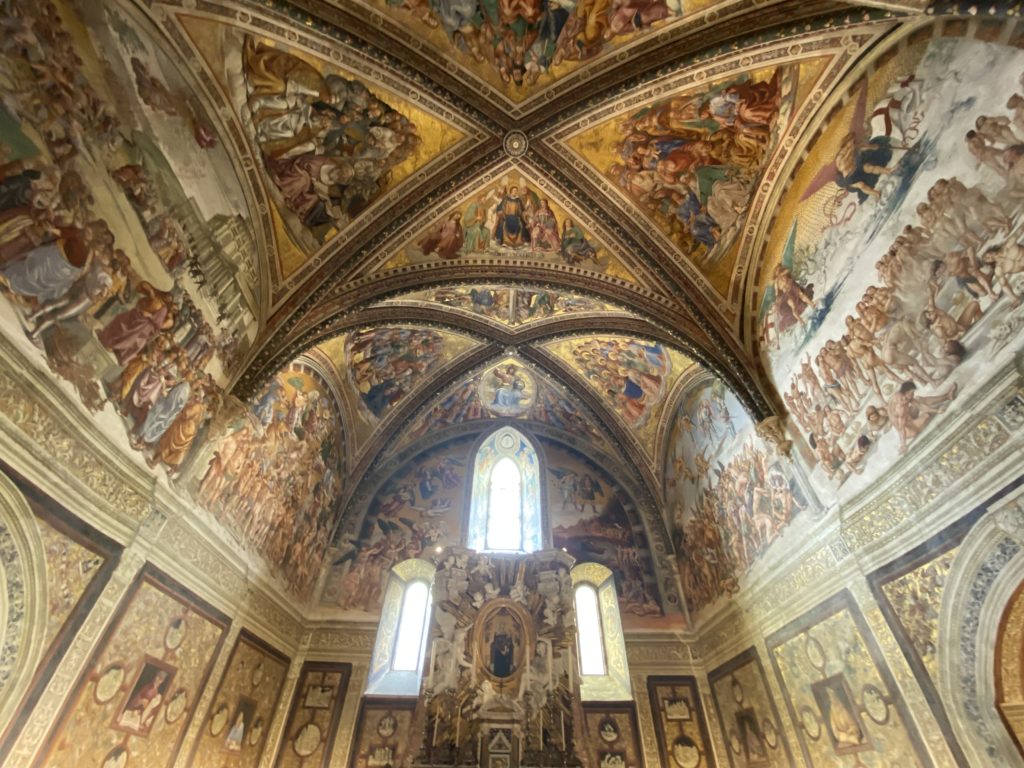 Cappella di San Brizio o cappella Nova, è collocata nel lato meridionale del transetto, ultimo a destra, del Duomo di Orvieto. Inizialmente, nella detta Cappella, furono realizzate le vele da Beato Angelico e Benozzo Gozzoli nel 1447. Luca Signorelli completa nel 1499 fino al 1502, e l’opera della Cappella prende il nome indicato nel “Giudizio Universale”. Sintetizza la fine dell’umanità, la redenzione dell’Anticristo e la Resurrezione dei morti e della carne. I grandi scenari onirici dell’affresco di Cristo Giudice, il Paradiso, l’Inferno compongono il ciclo iconografico e drammatico osservato nelle stesse scene apocalittiche. L’effetto prospettico – illusionistico delle pareti dipinte, divise in due registri e organizzate come quinte teatrali scenicamente con pilastri verticali e cornici orizzontali. La pittura mette in atto il clima storico dell’epoca: gli sconvolgimenti dovuti alle guerre, conflitti religiosi, epidemie e carestie alle soglie del nuovo secolo. Il focus dell’opera di Signorini nelle “Storie degli ultimi giorni” si caratterizza per la possente spaziale originalità degli eventi trattati e costituisce un unicum nel panorama della seconda ondata del Rinascimento maturo. Le scene: prediche e fatti dell’Anticristo, Finimondo, Resurrezione della Carne, Dannati, Beati, Paradiso, Inferno. La cappella affrescata e una continua lotta tra il bene e il male che si rincorrono, ma senza mediazione alcuna. Lasciano sul terreno le rovine e gli strascichi del doloroso dilemma. Non c’è pausa nelle composizioni incalzanti, non c’è tregua, la visione è di grande impatto visivo, sovrasta, interroga, sconcerta: tutto il mondo conosciuto e lì. “L’invenzione” delle scene, la pittura che diviene arringa contro l’umanità tutta, la complessità, i particolari, e infine i dettagli di grande efficacia resi materia della comunicazione visuale inedita nel quadro della pittura degli Stati italiani. Signorelli è l’inventore di una “macchina” tumultuosa, apparentemente confusa, poiché proprio così deve essere. La sua genialità, la sua visione escatologica della vita deve sconcertare il fruitore dell’opera enciclopedica, riversargli addosso tutto il male che diviene immagine, annichilire l’uomo, sottometterlo alle forze del male che visualizzano i peggiori nostri incubi sopiti ma non sconfitti per incontrare infine il Cristianesimo e la sua verità nella parola di Dio. Elementi soprannaturali, guerre, omicidi come si diceva, demoni alati e mostruosi, pioggia infuocata, avvolgono le genti: la catastrofe è appena iniziata. Il biblico maremoto solleva le navi con le onde. La città è pronta a capitolare. Il sole e la luna sono oscurati, ma poi la narrazione degli affreschi cede alla salvezza, e quando tutto sembrava perduto, l’uomo è salvo nella sua ragione profonda e nelle sue conseguenti azioni.
