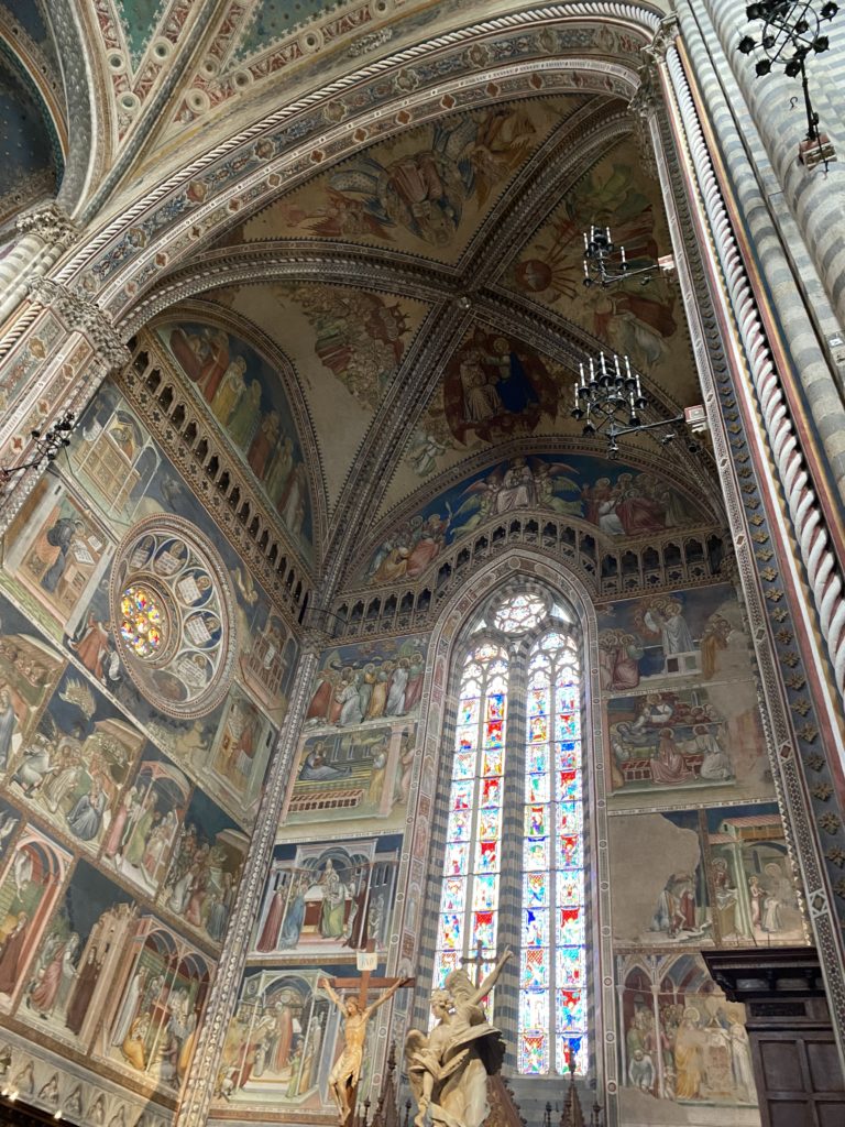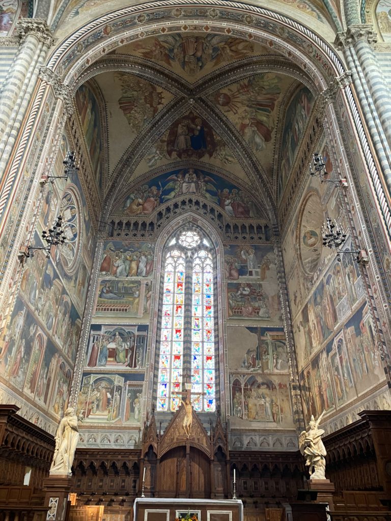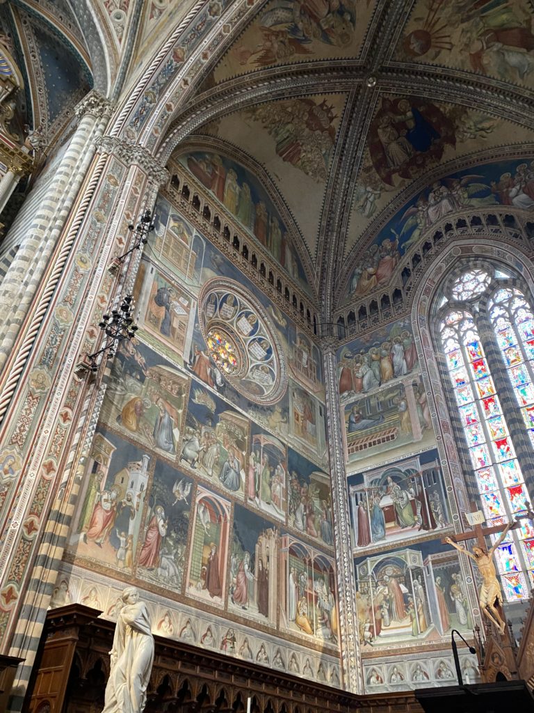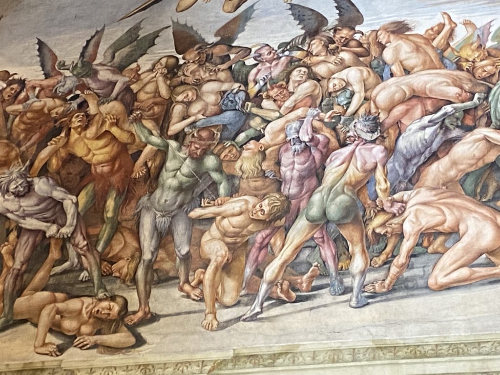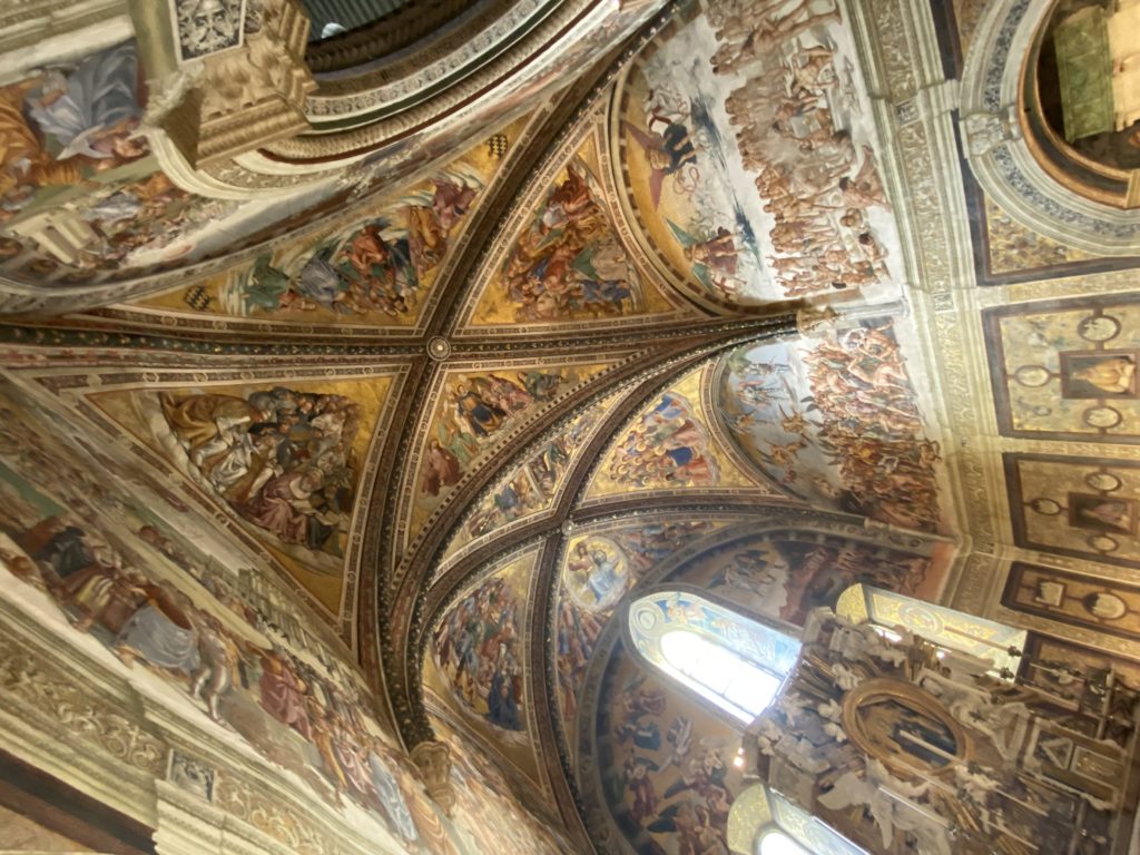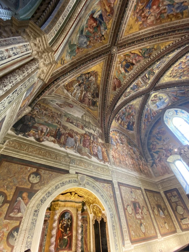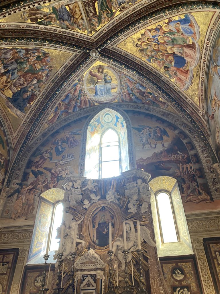 Cappella di San Brizio o cappella Nova, è collocata nel lato meridionale del transetto, ultimo a destra, del Duomo di Orvieto. Inizialmente, nella detta Cappella, furono realizzate le vele da Beato Angelico e Benozzo Gozzoli nel 1447. Luca Signorelli completa nel 1499 fino al 1502, e l’opera della Cappella prende il nome indicato nel “Giudizio Universale”. Sintetizza la fine dell’umanità, la redenzione dell’Anticristo e la Resurrezione dei morti e della carne. I grandi scenari onirici dell’affresco di Cristo Giudice, il Paradiso, l’Inferno compongono il ciclo iconografico e drammatico osservato nelle stesse scene apocalittiche. L’effetto prospettico – illusionistico delle pareti dipinte, divise in due registri e organizzate come quinte teatrali scenicamente con pilastri verticali e cornici orizzontali. La pittura mette in atto il clima storico dell’epoca: gli sconvolgimenti dovuti alle guerre, conflitti religiosi, epidemie e carestie alle soglie del nuovo secolo. Il focus dell’opera di Signorini nelle “Storie degli ultimi giorni” si caratterizza per la possente spaziale originalità degli eventi trattati e costituisce un unicum nel panorama della seconda ondata del Rinascimento maturo. Le scene: prediche e fatti dell’Anticristo, Finimondo, Resurrezione della Carne, Dannati, Beati, Paradiso, Inferno. La cappella affrescata e una continua lotta tra il bene e il male che si rincorrono, ma senza mediazione alcuna. Lasciano sul terreno le rovine e gli strascichi del doloroso dilemma. Non c’è pausa nelle composizioni incalzanti, non c’è tregua, la visione è di grande impatto visivo, sovrasta, interroga, sconcerta: tutto il mondo conosciuto e lì. “L’invenzione” delle scene, la pittura che diviene arringa contro l’umanità tutta, la complessità, i particolari, e infine i dettagli di grande efficacia resi materia della comunicazione visuale inedita nel quadro della pittura degli Stati italiani. Signorelli è l’inventore di una “macchina” tumultuosa, apparentemente confusa, poiché proprio così deve essere. La sua genialità, la sua visione escatologica della vita deve sconcertare il fruitore dell’opera enciclopedica, riversargli addosso tutto il male che diviene immagine, annichilire l’uomo, sottometterlo alle forze del male che visualizzano i peggiori nostri incubi sopiti ma non sconfitti per incontrare infine il Cristianesimo e la sua verità nella parola di Dio. Elementi soprannaturali, guerre, omicidi come si diceva, demoni alati e mostruosi, pioggia infuocata, avvolgono le genti: la catastrofe è appena iniziata. Il biblico maremoto solleva le navi con le onde. La città è pronta a capitolare. Il sole e la luna sono oscurati, ma poi la narrazione degli affreschi cede alla salvezza, e quando tutto sembrava perduto, l’uomo è salvo nella sua ragione profonda e nelle sue conseguenti azioni.