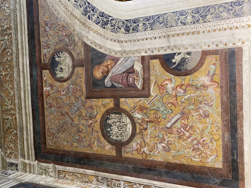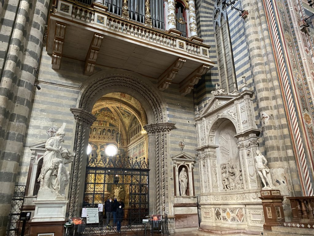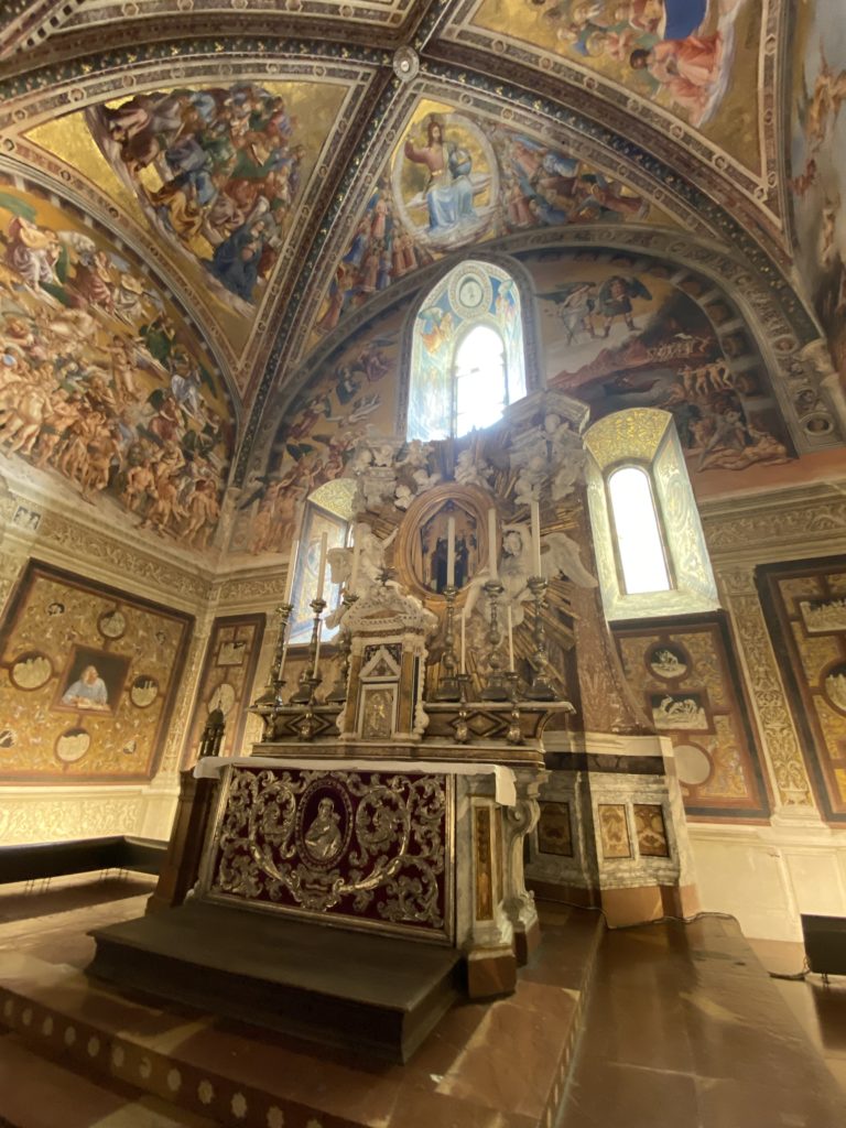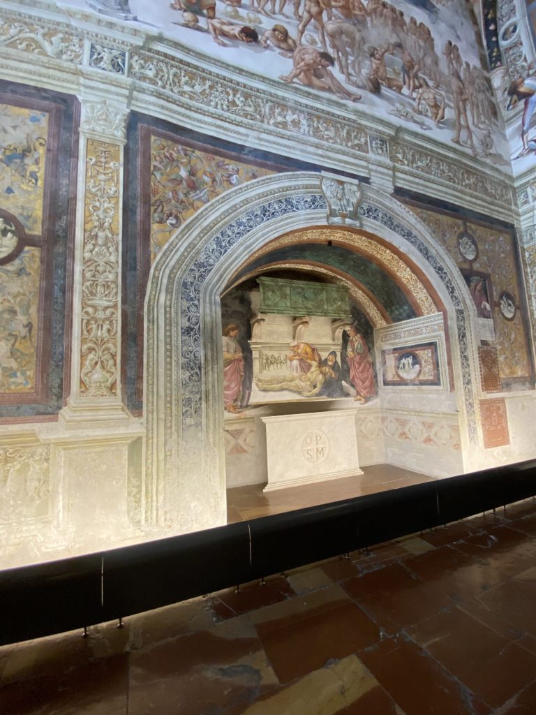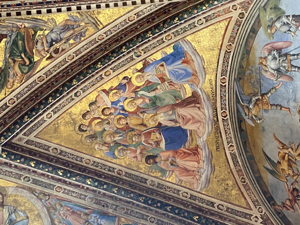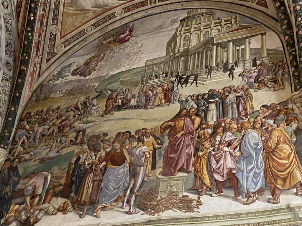 Cappella di San Brizio o cappella Nova, è collocata nel lato meridionale del transetto, ultimo a destra, del Duomo di Orvieto. Inizialmente, nella detta Cappella, furono realizzate le vele da Beato Angelico e Benozzo Gozzoli nel 1447. Luca Signorelli completa nel 1499 fino al 1502, e l’opera della Cappella prende il nome indicato nel “Giudizio Universale”. Sintetizza la fine dell’umanità, la redenzione dell’Anticristo e la Resurrezione dei morti e della carne. I grandi scenari onirici dell’affresco di Cristo Giudice, il Paradiso, l’Inferno compongono il ciclo iconografico e drammatico osservato nelle stesse scene apocalittiche. L’effetto prospettico – illusionistico delle pareti dipinte, divise in due registri e organizzate come quinte teatrali scenicamente con pilastri verticali e cornici orizzontali. La pittura mette in atto il clima storico dell’epoca: gli sconvolgimenti dovuti alle guerre, conflitti religiosi, epidemie e carestie alle soglie del nuovo secolo. Il focus dell’opera di Signorini nelle “Storie degli ultimi giorni” si caratterizza per la possente spaziale originalità degli eventi trattati e costituisce un unicum nel panorama della seconda ondata del Rinascimento maturo. Le scene: prediche e fatti dell’Anticristo, Finimondo, Resurrezione della Carne, Dannati, Beati, Paradiso, Inferno. La cappella affrescata e una continua lotta tra il bene e il male che si rincorrono, ma senza mediazione alcuna. Lasciano sul terreno le rovine e gli strascichi del doloroso dilemma. Non c’è pausa nelle composizioni incalzanti, non c’è tregua, la visione è di grande impatto visivo, sovrasta, interroga, sconcerta: tutto il mondo conosciuto e lì. “L’invenzione” delle scene, la pittura che diviene arringa contro l’umanità tutta, la complessità, i particolari, e infine i dettagli di grande efficacia resi materia della comunicazione visuale inedita nel quadro della pittura degli Stati italiani. Signorelli è l’inventore di una “macchina” tumultuosa, apparentemente confusa, poiché proprio così deve essere. La sua genialità, la sua visione escatologica della vita deve sconcertare il fruitore dell’opera enciclopedica, riversargli addosso tutto il male che diviene immagine, annichilire l’uomo, sottometterlo alle forze del male che visualizzano i peggiori nostri incubi sopiti ma non sconfitti per incontrare infine il Cristianesimo e la sua verità nella parola di Dio. Elementi soprannaturali, guerre, omicidi come si diceva, demoni alati e mostruosi, pioggia infuocata, avvolgono le genti: la catastrofe è appena iniziata. Il biblico maremoto solleva le navi con le onde. La città è pronta a capitolare. Il sole e la luna sono oscurati, ma poi la narrazione degli affreschi cede alla salvezza, e quando tutto sembrava perduto, l’uomo è salvo nella sua ragione profonda e nelle sue conseguenti azioni.