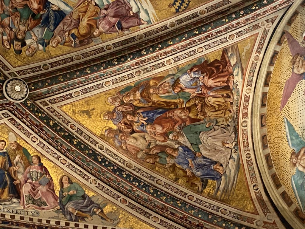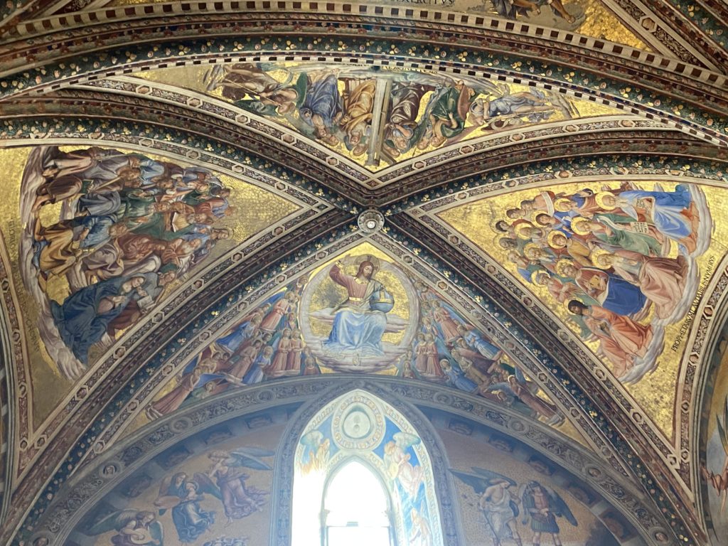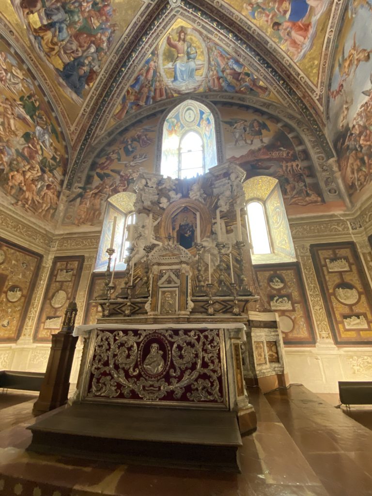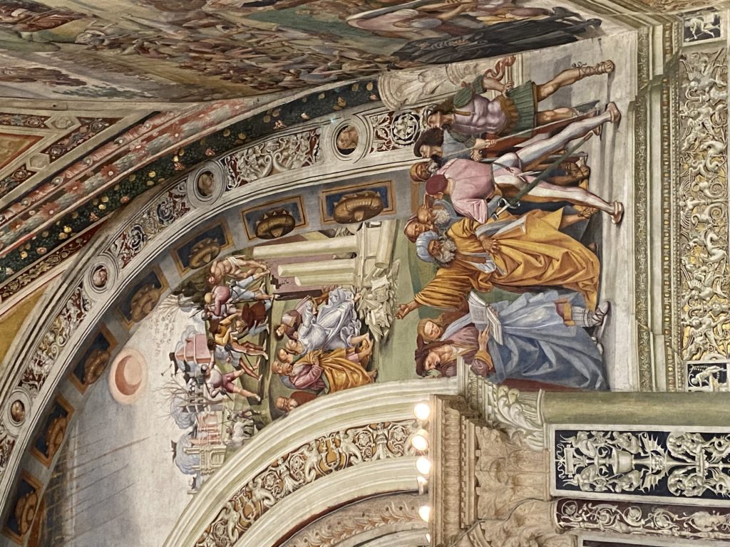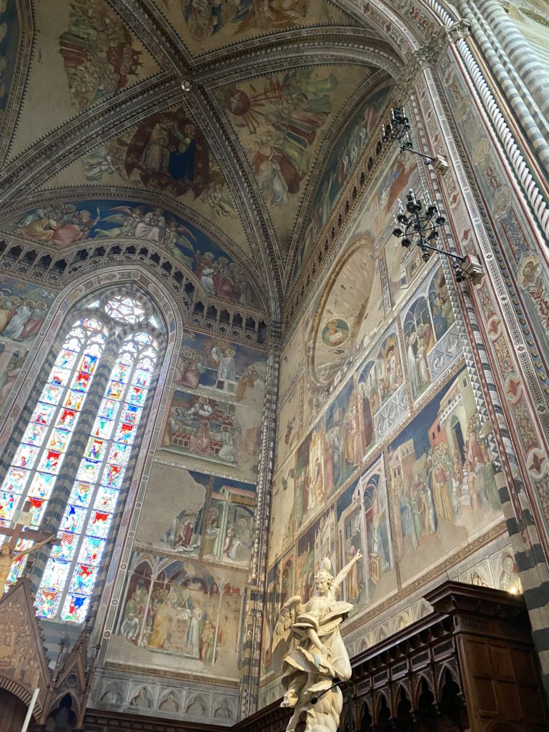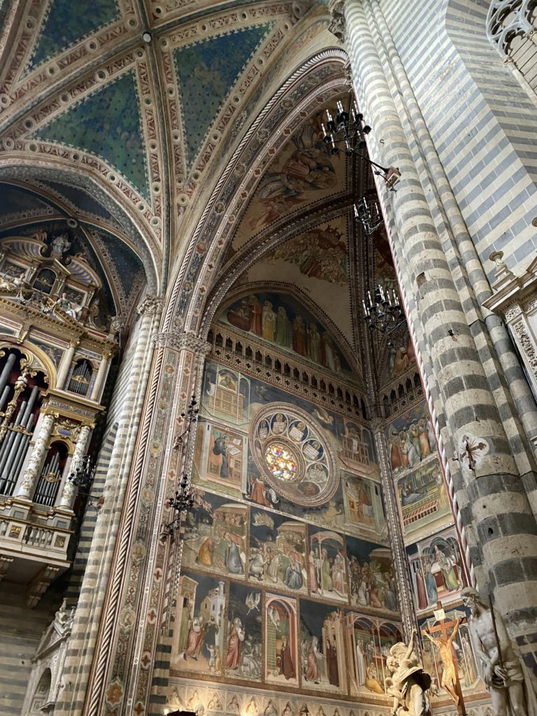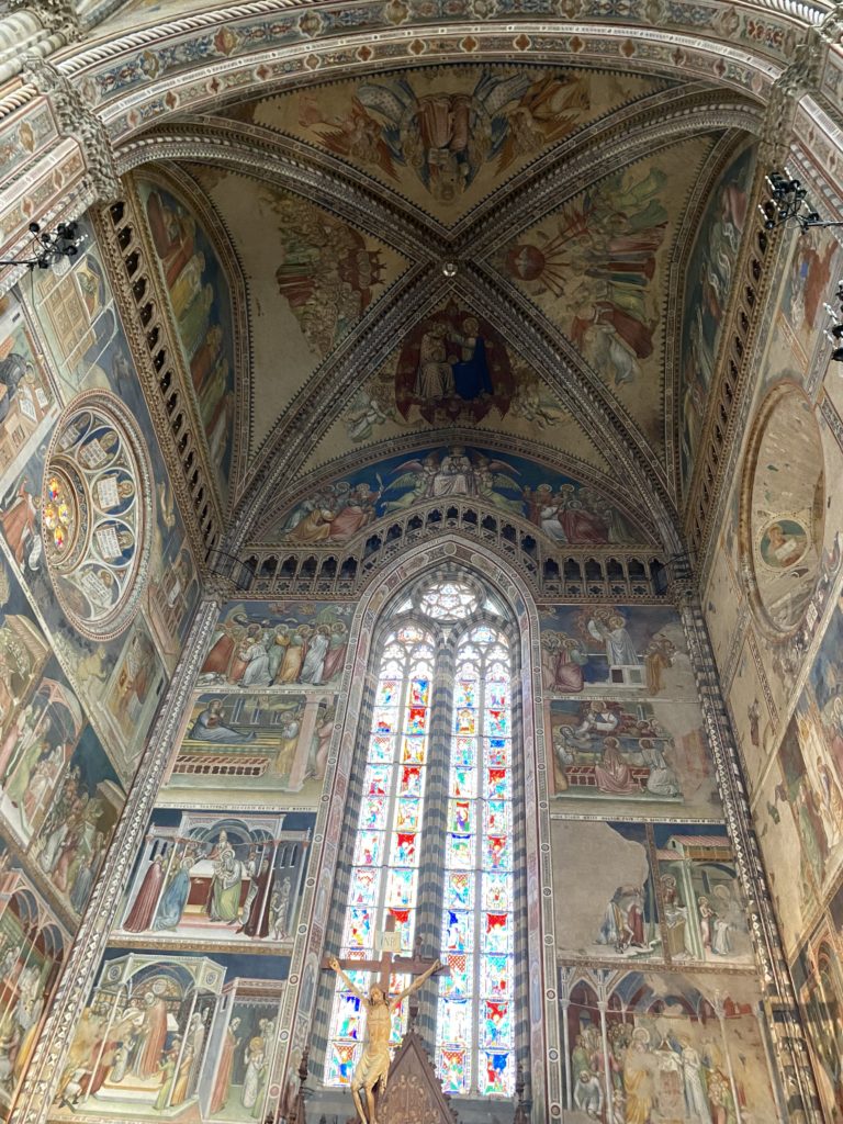 Cappella di San Brizio o cappella Nova, è collocata nel lato meridionale del transetto, ultimo a destra, del Duomo di Orvieto. Inizialmente, nella detta Cappella, furono realizzate le vele da Beato Angelico e Benozzo Gozzoli nel 1447. Luca Signorelli completa nel 1499 fino al 1502, e l’opera della Cappella prende il nome indicato nel “Giudizio Universale”. Sintetizza la fine dell’umanità, la redenzione dell’Anticristo e la Resurrezione dei morti e della carne. I grandi scenari onirici dell’affresco di Cristo Giudice, il Paradiso, l’Inferno compongono il ciclo iconografico e drammatico osservato nelle stesse scene apocalittiche. L’effetto prospettico – illusionistico delle pareti dipinte, divise in due registri e organizzate come quinte teatrali scenicamente con pilastri verticali e cornici orizzontali. La pittura mette in atto il clima storico dell’epoca: gli sconvolgimenti dovuti alle guerre, conflitti religiosi, epidemie e carestie alle soglie del nuovo secolo. Il focus dell’opera di Signorini nelle “Storie degli ultimi giorni” si caratterizza per la possente spaziale originalità degli eventi trattati e costituisce un unicum nel panorama della seconda ondata del Rinascimento maturo. Le scene: prediche e fatti dell’Anticristo, Finimondo, Resurrezione della Carne, Dannati, Beati, Paradiso, Inferno. La cappella affrescata e una continua lotta tra il bene e il male che si rincorrono, ma senza mediazione alcuna. Lasciano sul terreno le rovine e gli strascichi del doloroso dilemma. Non c’è pausa nelle composizioni incalzanti, non c’è tregua, la visione è di grande impatto visivo, sovrasta, interroga, sconcerta: tutto il mondo conosciuto e lì. “L’invenzione” delle scene, la pittura che diviene arringa contro l’umanità tutta, la complessità, i particolari, e infine i dettagli di grande efficacia resi materia della comunicazione visuale inedita nel quadro della pittura degli Stati italiani. Signorelli è l’inventore di una “macchina” tumultuosa, apparentemente confusa, poiché proprio così deve essere. La sua genialità, la sua visione escatologica della vita deve sconcertare il fruitore dell’opera enciclopedica, riversargli addosso tutto il male che diviene immagine, annichilire l’uomo, sottometterlo alle forze del male che visualizzano i peggiori nostri incubi sopiti ma non sconfitti per incontrare infine il Cristianesimo e la sua verità nella parola di Dio. Elementi soprannaturali, guerre, omicidi come si diceva, demoni alati e mostruosi, pioggia infuocata, avvolgono le genti: la catastrofe è appena iniziata. Il biblico maremoto solleva le navi con le onde. La città è pronta a capitolare. Il sole e la luna sono oscurati, ma poi la narrazione degli affreschi cede alla salvezza, e quando tutto sembrava perduto, l’uomo è salvo nella sua ragione profonda e nelle sue conseguenti azioni.