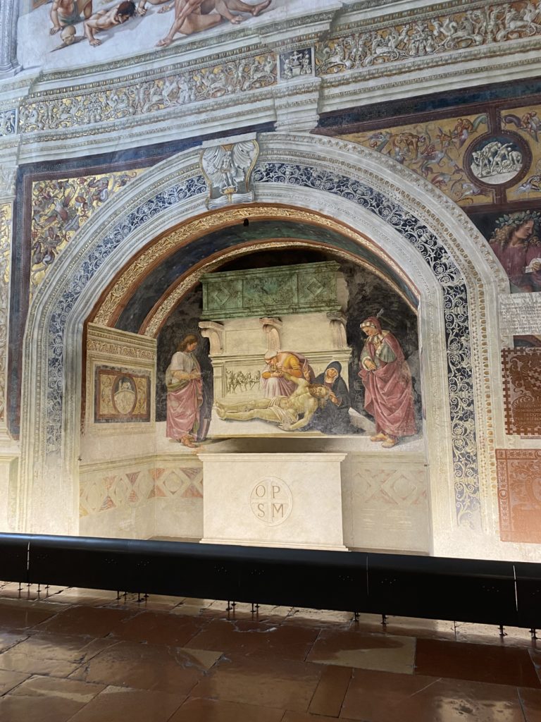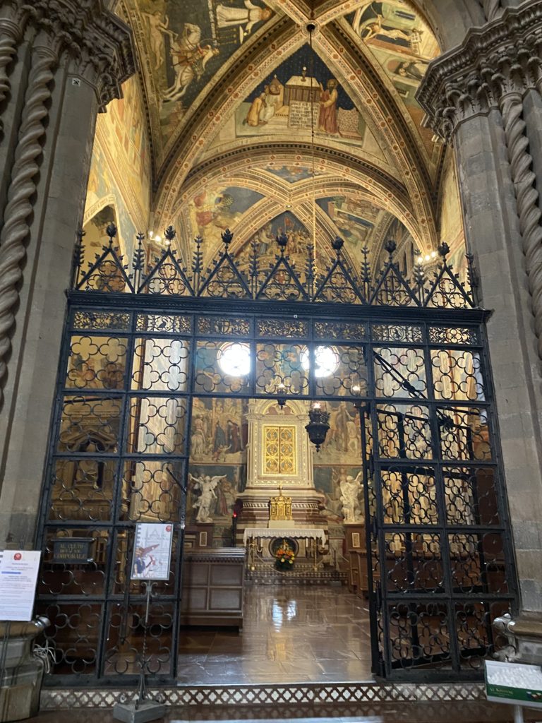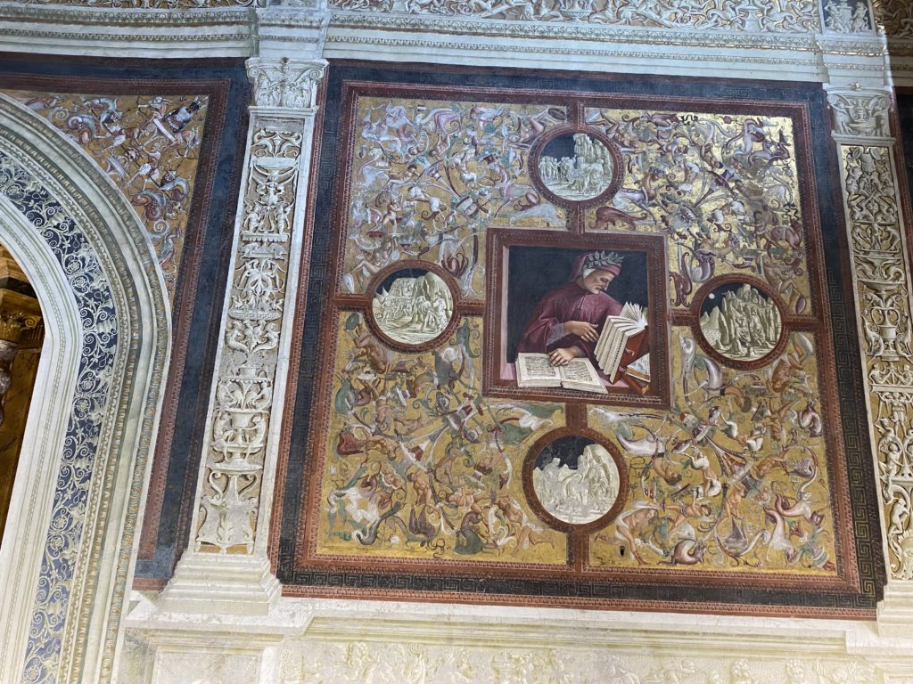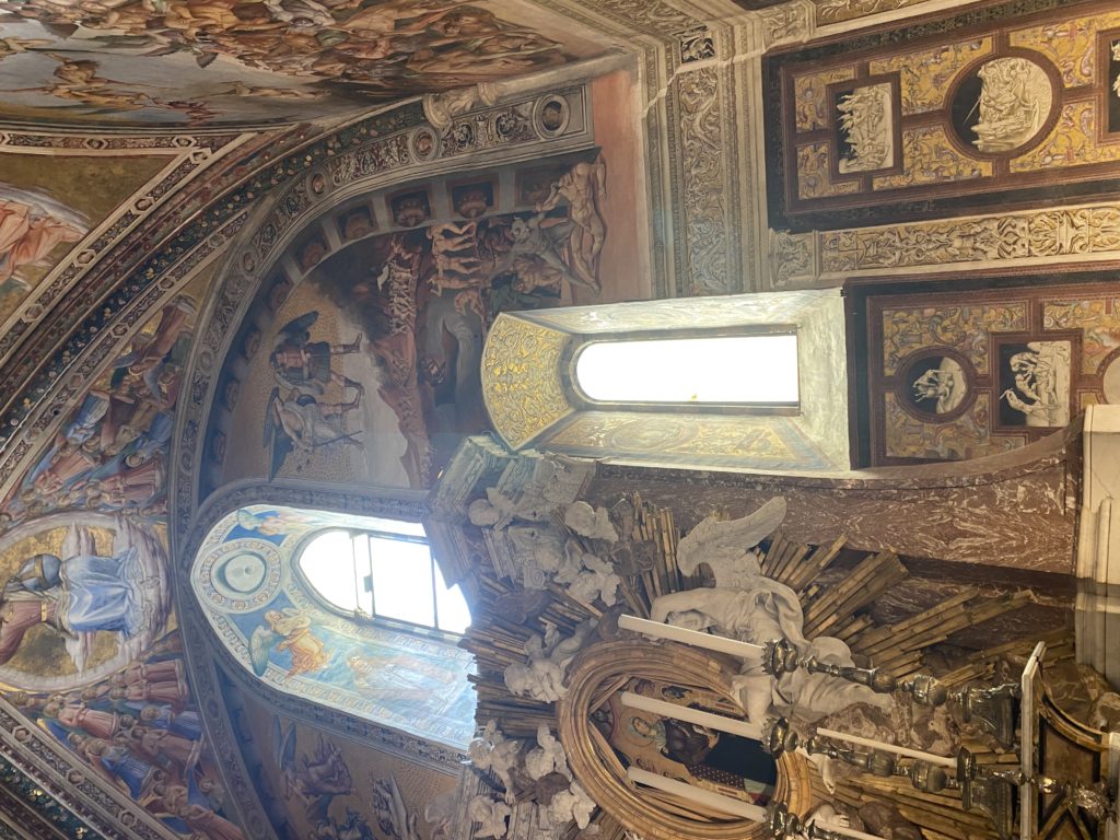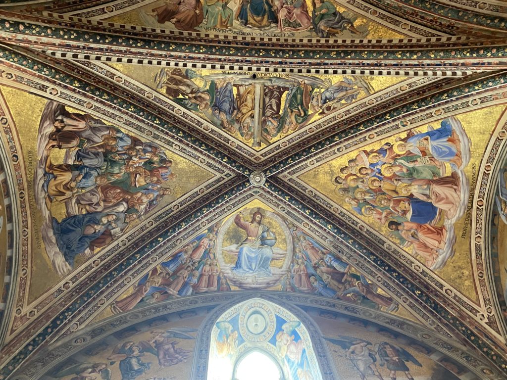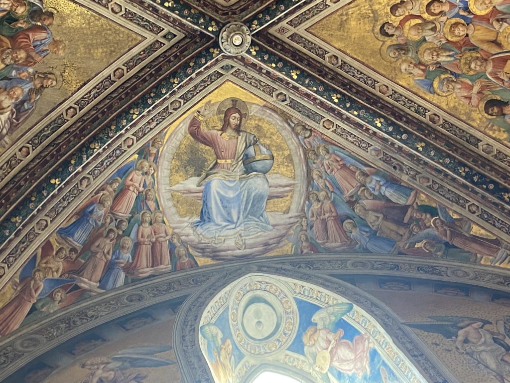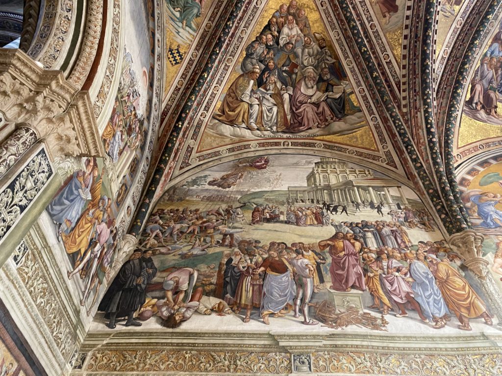 Cappella di San Brizio o cappella Nova, è collocata nel lato meridionale del transetto, ultimo a destra, del Duomo di Orvieto. Inizialmente, nella detta Cappella, furono realizzate le vele da Beato Angelico e Benozzo Gozzoli nel 1447. Luca Signorelli completa nel 1499 fino al 1502, e l’opera della Cappella prende il nome indicato nel “Giudizio Universale”. Sintetizza la fine dell’umanità, la redenzione dell’Anticristo e la Resurrezione dei morti e della carne. I grandi scenari onirici dell’affresco di Cristo Giudice, il Paradiso, l’Inferno compongono il ciclo iconografico e drammatico osservato nelle stesse scene apocalittiche. L’effetto prospettico – illusionistico delle pareti dipinte, divise in due registri e organizzate come quinte teatrali scenicamente con pilastri verticali e cornici orizzontali. La pittura mette in atto il clima storico dell’epoca: gli sconvolgimenti dovuti alle guerre, conflitti religiosi, epidemie e carestie alle soglie del nuovo secolo. Il focus dell’opera di Signorini nelle “Storie degli ultimi giorni” si caratterizza per la possente spaziale originalità degli eventi trattati e costituisce un unicum nel panorama della seconda ondata del Rinascimento maturo. Le scene: prediche e fatti dell’Anticristo, Finimondo, Resurrezione della Carne, Dannati, Beati, Paradiso, Inferno. La cappella affrescata e una continua lotta tra il bene e il male che si rincorrono, ma senza mediazione alcuna. Lasciano sul terreno le rovine e gli strascichi del doloroso dilemma. Non c’è pausa nelle composizioni incalzanti, non c’è tregua, la visione è di grande impatto visivo, sovrasta, interroga, sconcerta: tutto il mondo conosciuto e lì. “L’invenzione” delle scene, la pittura che diviene arringa contro l’umanità tutta, la complessità, i particolari, e infine i dettagli di grande efficacia resi materia della comunicazione visuale inedita nel quadro della pittura degli Stati italiani. Signorelli è l’inventore di una “macchina” tumultuosa, apparentemente confusa, poiché proprio così deve essere. La sua genialità, la sua visione escatologica della vita deve sconcertare il fruitore dell’opera enciclopedica, riversargli addosso tutto il male che diviene immagine, annichilire l’uomo, sottometterlo alle forze del male che visualizzano i peggiori nostri incubi sopiti ma non sconfitti per incontrare infine il Cristianesimo e la sua verità nella parola di Dio. Elementi soprannaturali, guerre, omicidi come si diceva, demoni alati e mostruosi, pioggia infuocata, avvolgono le genti: la catastrofe è appena iniziata. Il biblico maremoto solleva le navi con le onde. La città è pronta a capitolare. Il sole e la luna sono oscurati, ma poi la narrazione degli affreschi cede alla salvezza, e quando tutto sembrava perduto, l’uomo è salvo nella sua ragione profonda e nelle sue conseguenti azioni.