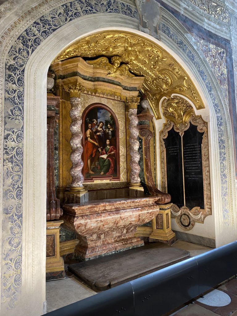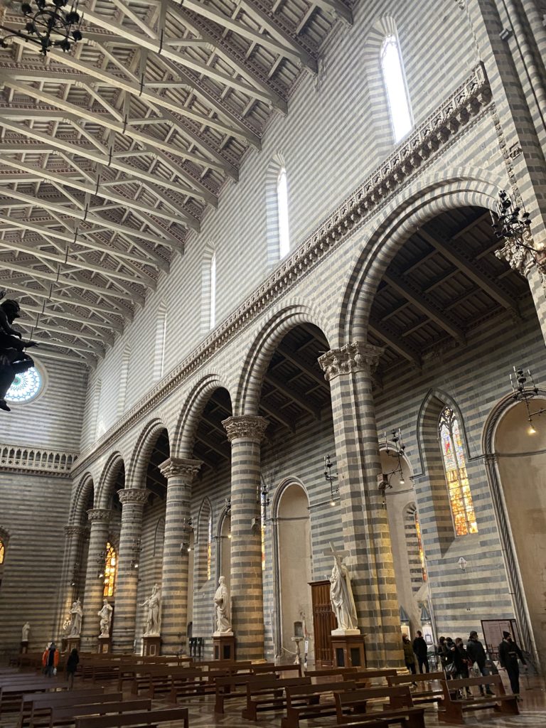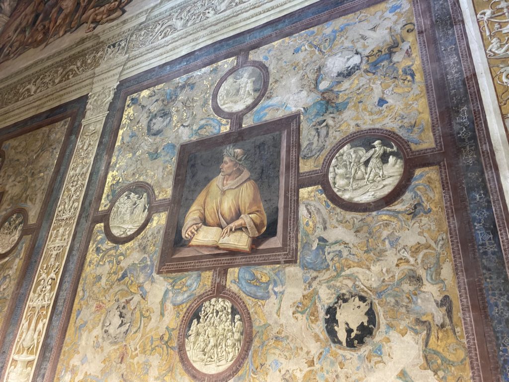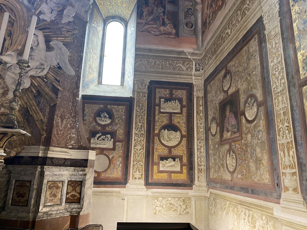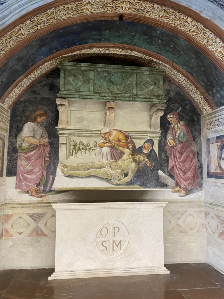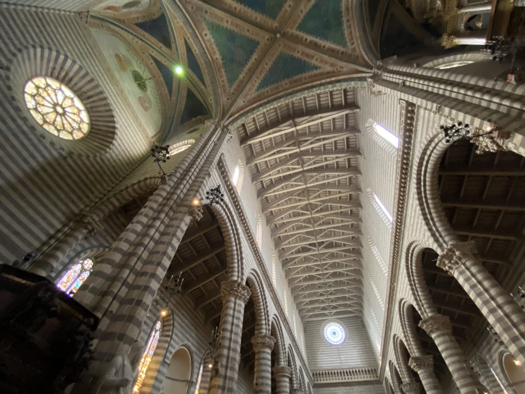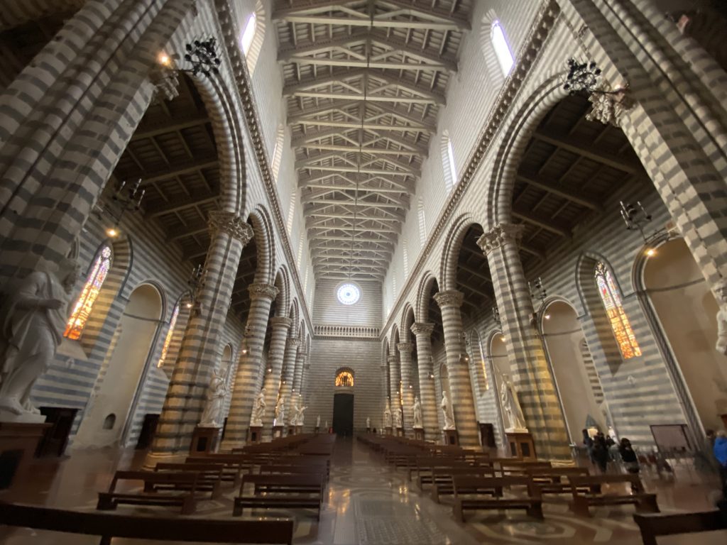 Cappella di San Brizio o cappella Nova, è collocata nel lato meridionale del transetto, ultimo a destra, del Duomo di Orvieto. Inizialmente, nella detta Cappella, furono realizzate le vele da Beato Angelico e Benozzo Gozzoli nel 1447. Luca Signorelli completa nel 1499 fino al 1502, e l’opera della Cappella prende il nome indicato nel “Giudizio Universale”. Sintetizza la fine dell’umanità, la redenzione dell’Anticristo e la Resurrezione dei morti e della carne. I grandi scenari onirici dell’affresco di Cristo Giudice, il Paradiso, l’Inferno compongono il ciclo iconografico e drammatico osservato nelle stesse scene apocalittiche. L’effetto prospettico – illusionistico delle pareti dipinte, divise in due registri e organizzate come quinte teatrali scenicamente con pilastri verticali e cornici orizzontali. La pittura mette in atto il clima storico dell’epoca: gli sconvolgimenti dovuti alle guerre, conflitti religiosi, epidemie e carestie alle soglie del nuovo secolo. Il focus dell’opera di Signorini nelle “Storie degli ultimi giorni” si caratterizza per la possente spaziale originalità degli eventi trattati e costituisce un unicum nel panorama della seconda ondata del Rinascimento maturo. Le scene: prediche e fatti dell’Anticristo, Finimondo, Resurrezione della Carne, Dannati, Beati, Paradiso, Inferno. La cappella affrescata e una continua lotta tra il bene e il male che si rincorrono, ma senza mediazione alcuna. Lasciano sul terreno le rovine e gli strascichi del doloroso dilemma. Non c’è pausa nelle composizioni incalzanti, non c’è tregua, la visione è di grande impatto visivo, sovrasta, interroga, sconcerta: tutto il mondo conosciuto e lì. “L’invenzione” delle scene, la pittura che diviene arringa contro l’umanità tutta, la complessità, i particolari, e infine i dettagli di grande efficacia resi materia della comunicazione visuale inedita nel quadro della pittura degli Stati italiani. Signorelli è l’inventore di una “macchina” tumultuosa, apparentemente confusa, poiché proprio così deve essere. La sua genialità, la sua visione escatologica della vita deve sconcertare il fruitore dell’opera enciclopedica, riversargli addosso tutto il male che diviene immagine, annichilire l’uomo, sottometterlo alle forze del male che visualizzano i peggiori nostri incubi sopiti ma non sconfitti per incontrare infine il Cristianesimo e la sua verità nella parola di Dio. Elementi soprannaturali, guerre, omicidi come si diceva, demoni alati e mostruosi, pioggia infuocata, avvolgono le genti: la catastrofe è appena iniziata. Il biblico maremoto solleva le navi con le onde. La città è pronta a capitolare. Il sole e la luna sono oscurati, ma poi la narrazione degli affreschi cede alla salvezza, e quando tutto sembrava perduto, l’uomo è salvo nella sua ragione profonda e nelle sue conseguenti azioni.