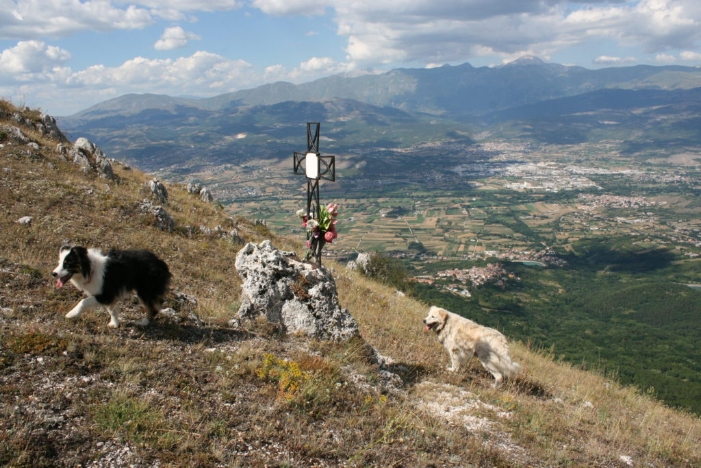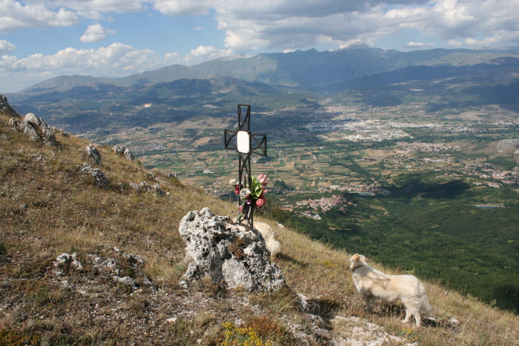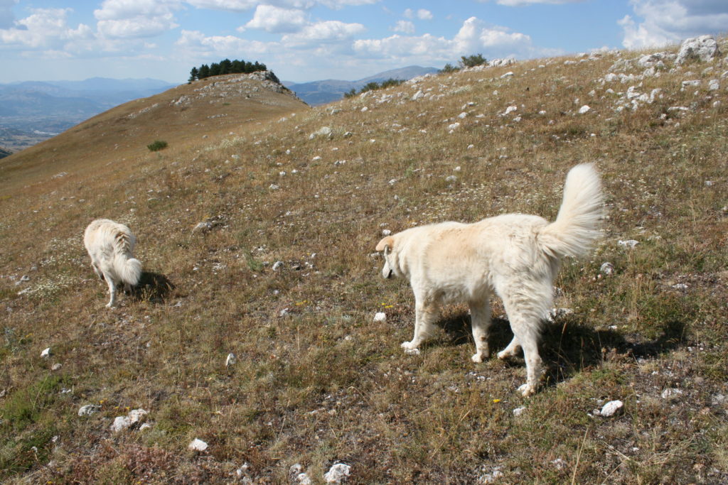Lo riescono a vedere il gregge, lo tengono sotto controllo, ma fiutano qualcosa, sono sottovento. Si allontanano e poi si fermano, puntano forse una minaccia. Vigili i mastini abruzzesi, non si distraggono mai, annusano il vento, guardano il paesaggio della Conca aquilana nel perimetro difensivo del gregge che loro hanno definito.