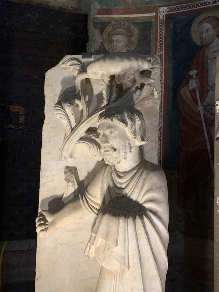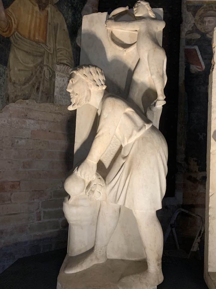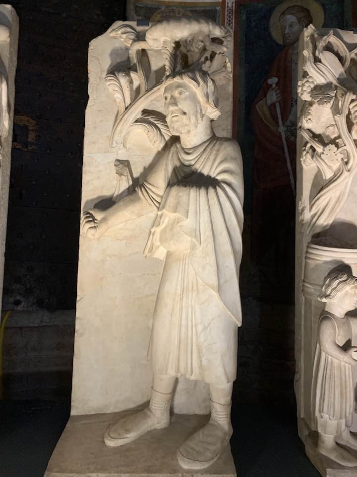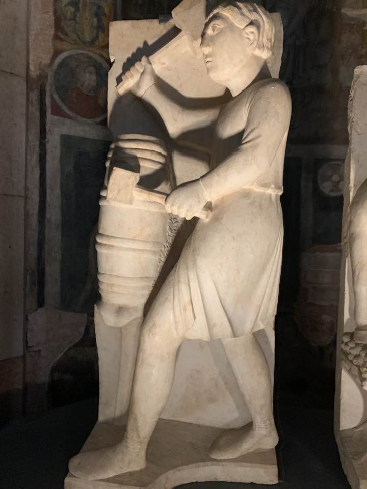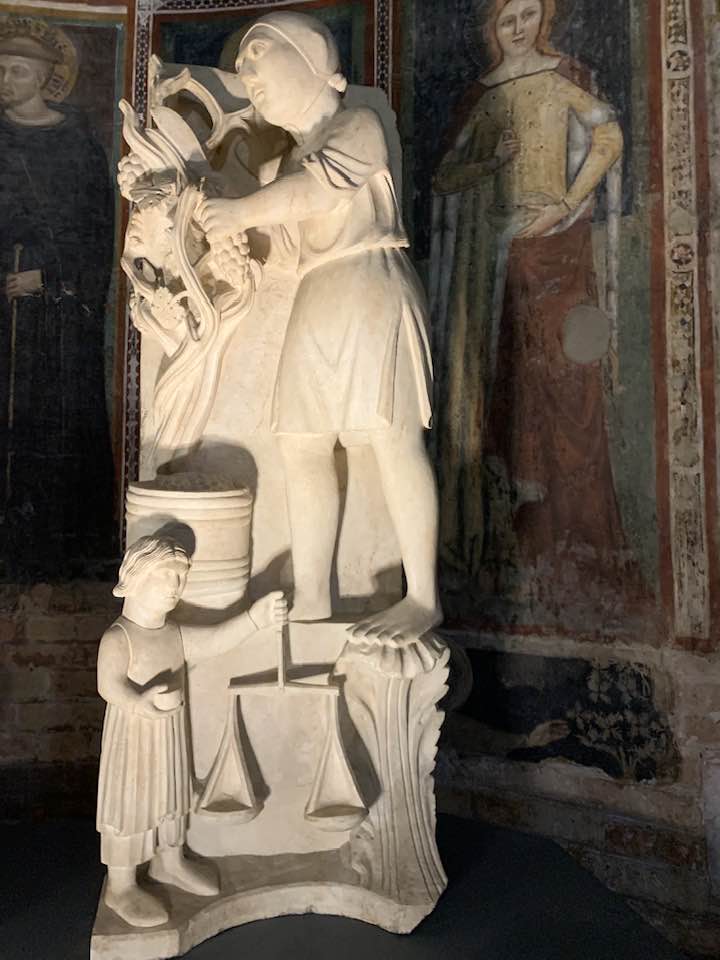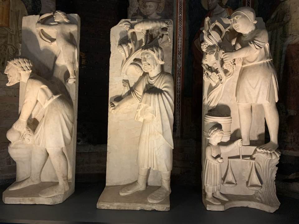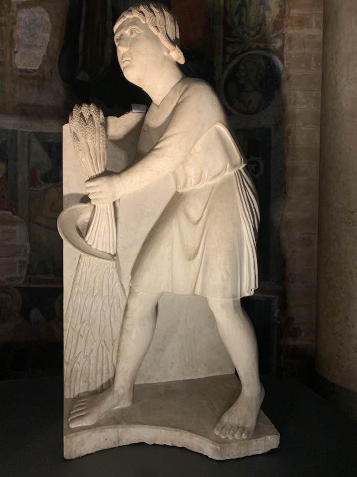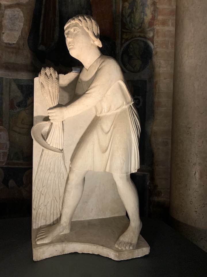 Il Gotico italiano: in questa cornice si iscrive lo scultore e architetto Antelami con l’uso di una scultura innovativa, tecnica di passaggio tra il Romanico e il Gotico. Spazio, profondità nell’esecuzione a tutto tondo e plasticità nelle sculture dei mesi, come nell’allegoria del mese di novembre, in cui un contadino raccoglie le rape, mentre in alto campeggia il segno – simbolo zodiacale del Sagittario. Il tempo scorre, le attività agricole e gli uomini sono i testimoni delle stagioni, simbologie realizzate nei primi anni del Duecento. Il Medioevo si presenta così con le pose che assumono i personaggi, gli abiti eleganti, le vesti regali di alcuni, le capigliature ben acconciate e nobili, gli sguardi immateriali, le pose nell’atto di esplicare il lavoro di cultura materiale e il rapporto con la terra.