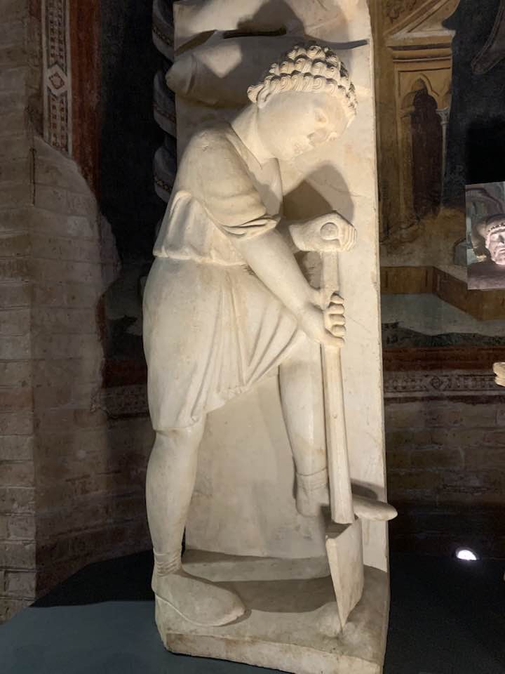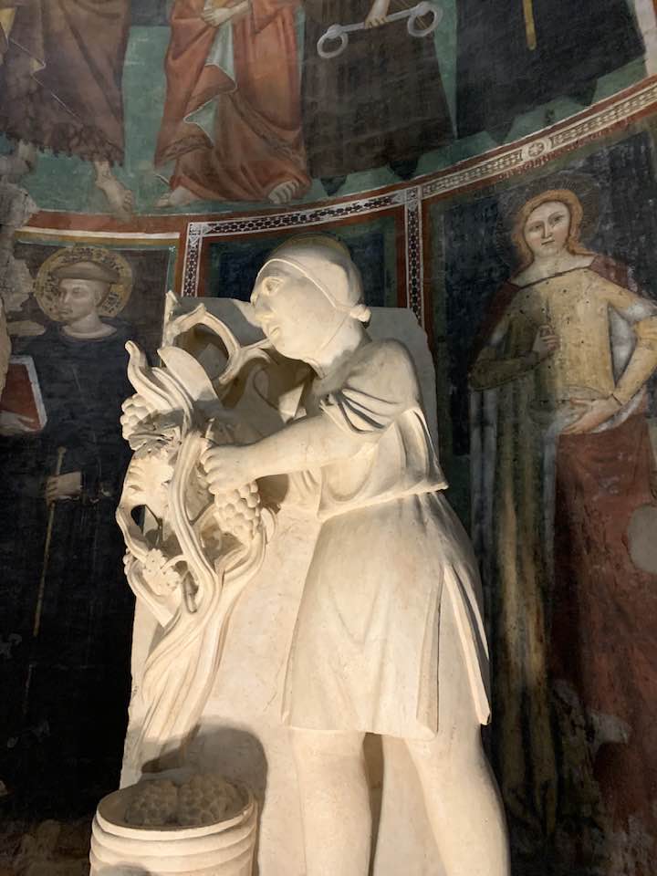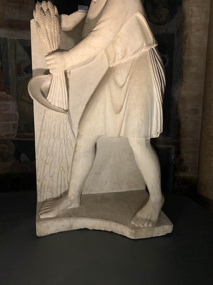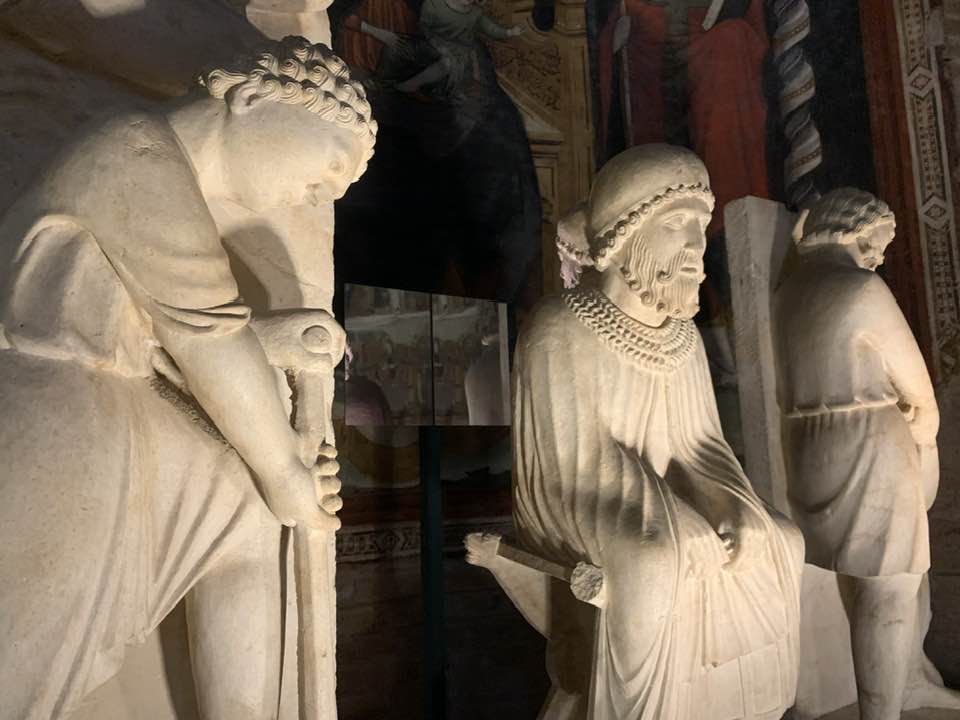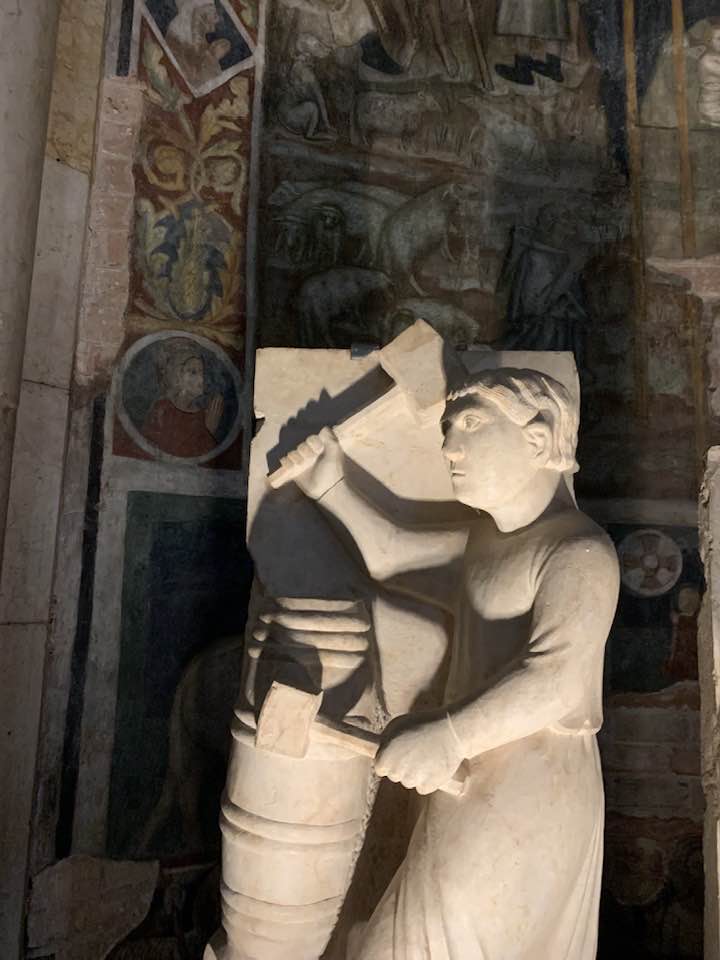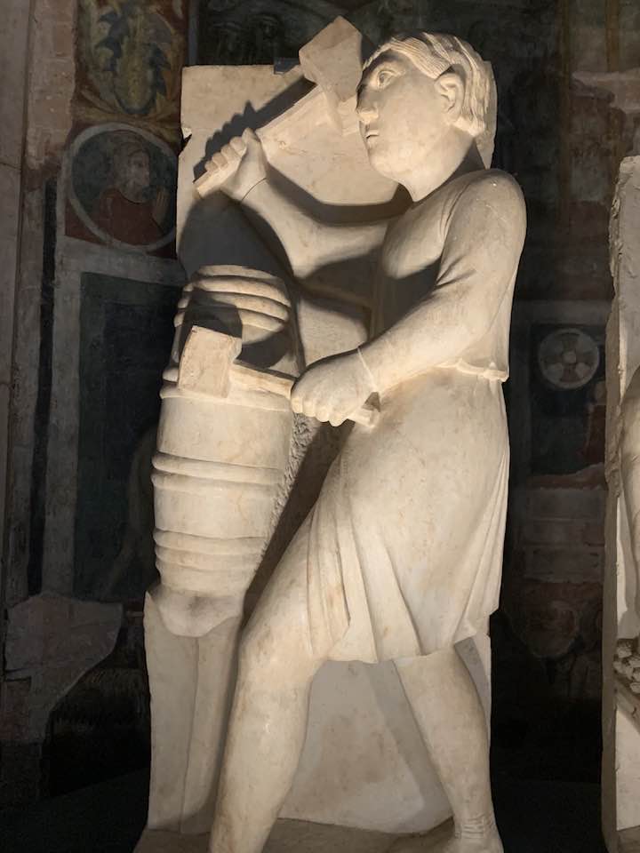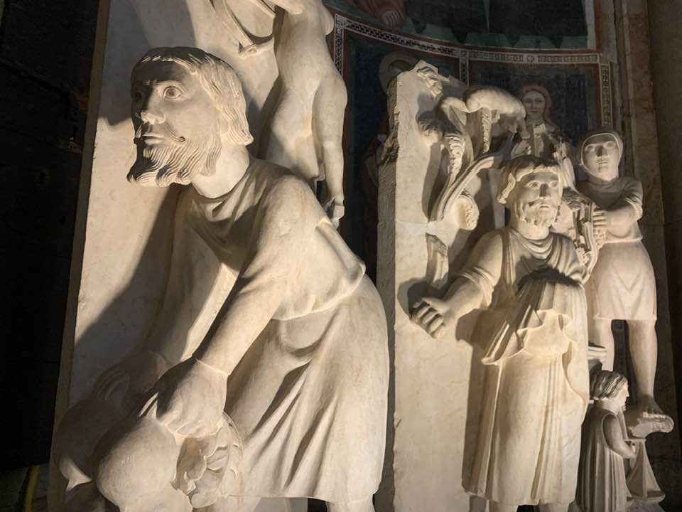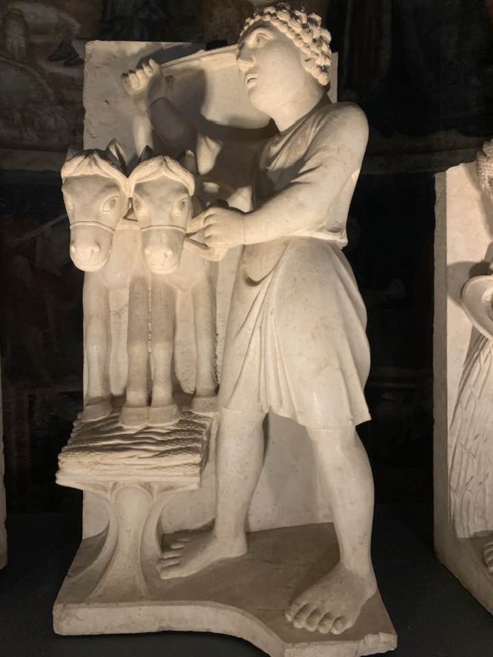Il Gotico italiano: in questa cornice si iscrive lo scultore e architetto Antelami con l’uso di una scultura innovativa, tecnica di passaggio tra il Romanico e il Gotico. Spazio, profondità nell’esecuzione a tutto tondo e plasticità nelle sculture dei mesi, come nell’allegoria del mese di novembre, in cui un contadino raccoglie le rape, mentre in alto campeggia il segno – simbolo zodiacale del Sagittario. Il tempo scorre, le attività agricole e gli uomini sono i testimoni delle stagioni, simbologie realizzate nei primi anni del Duecento. Il Medioevo si presenta così con le pose che assumono i personaggi, gli abiti eleganti, le vesti regali di alcuni, le capigliature ben acconciate e nobili, gli sguardi immateriali, le pose nell’atto di esplicare il lavoro di cultura materiale e il rapporto con la terra.