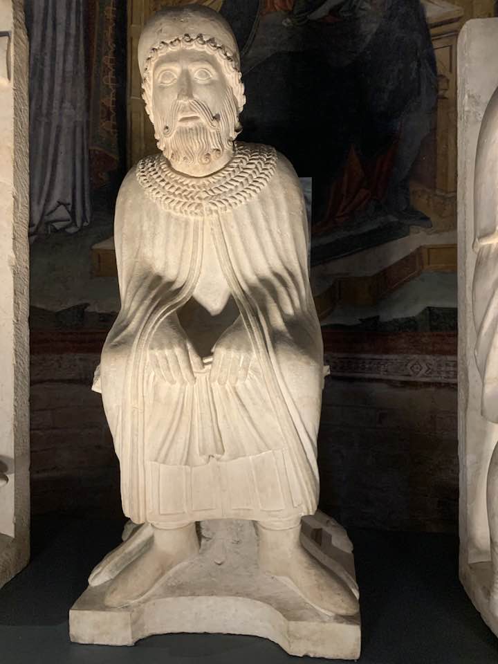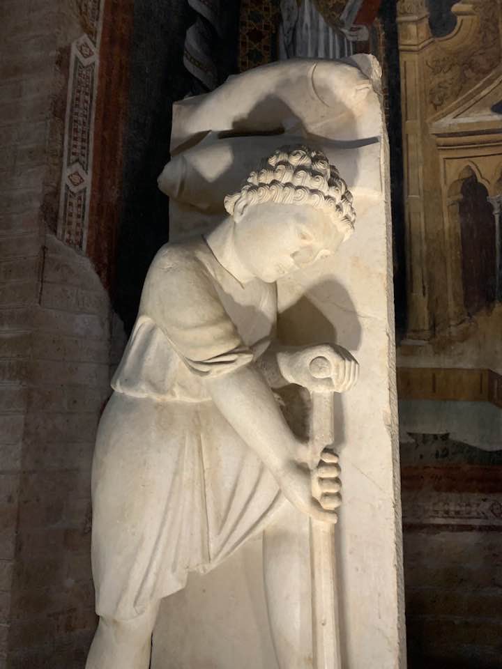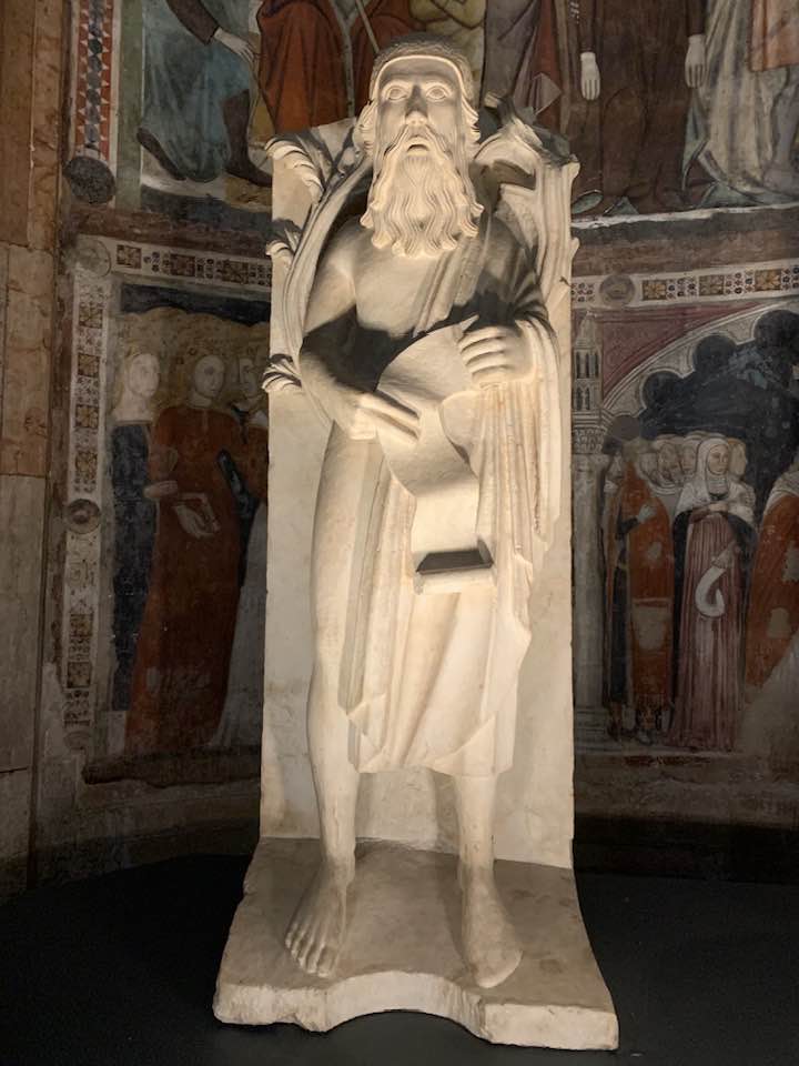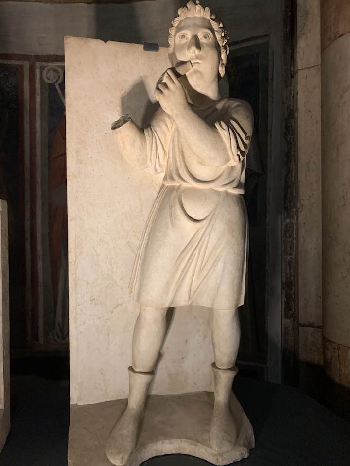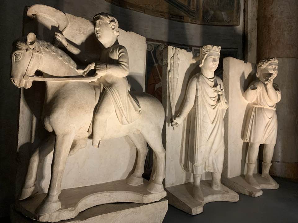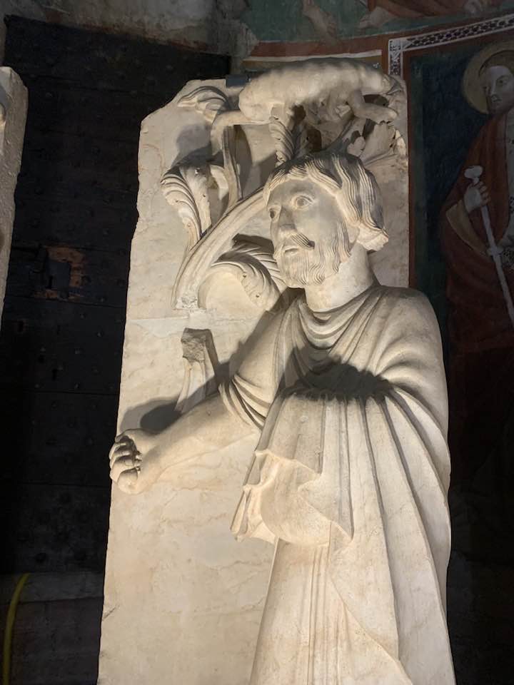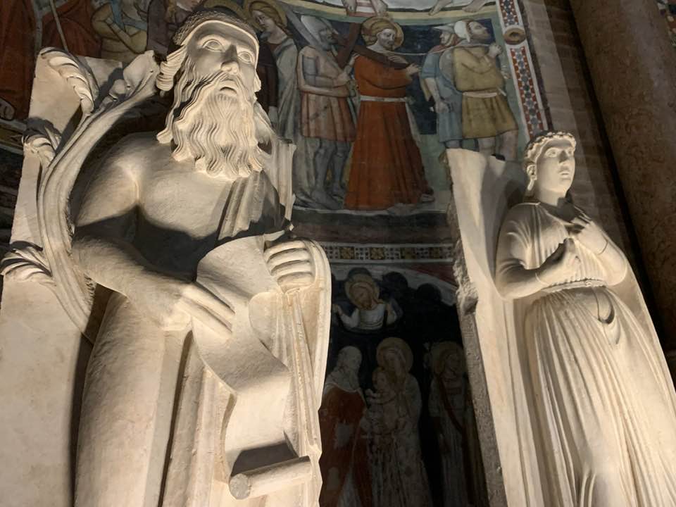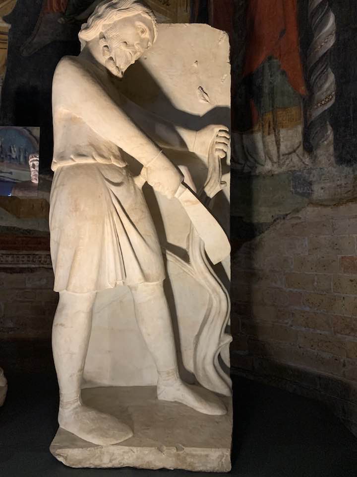 Il Gotico italiano: in questa cornice si iscrive lo scultore e architetto Antelami con l’uso di una scultura innovativa, tecnica di passaggio tra il Romanico e il Gotico. Spazio, profondità nell’esecuzione a tutto tondo e plasticità nelle sculture dei mesi, come nell’allegoria del mese di novembre, in cui un contadino raccoglie le rape, mentre in alto campeggia il segno – simbolo zodiacale del Sagittario. Il tempo scorre, le attività agricole e gli uomini sono i testimoni delle stagioni, simbologie realizzate nei primi anni del Duecento. Il Medioevo si presenta così con le pose che assumono i personaggi, gli abiti eleganti, le vesti regali di alcuni, le capigliature ben acconciate e nobili, gli sguardi immateriali, le pose nell’atto di esplicare il lavoro di cultura materiale e il rapporto con la terra.