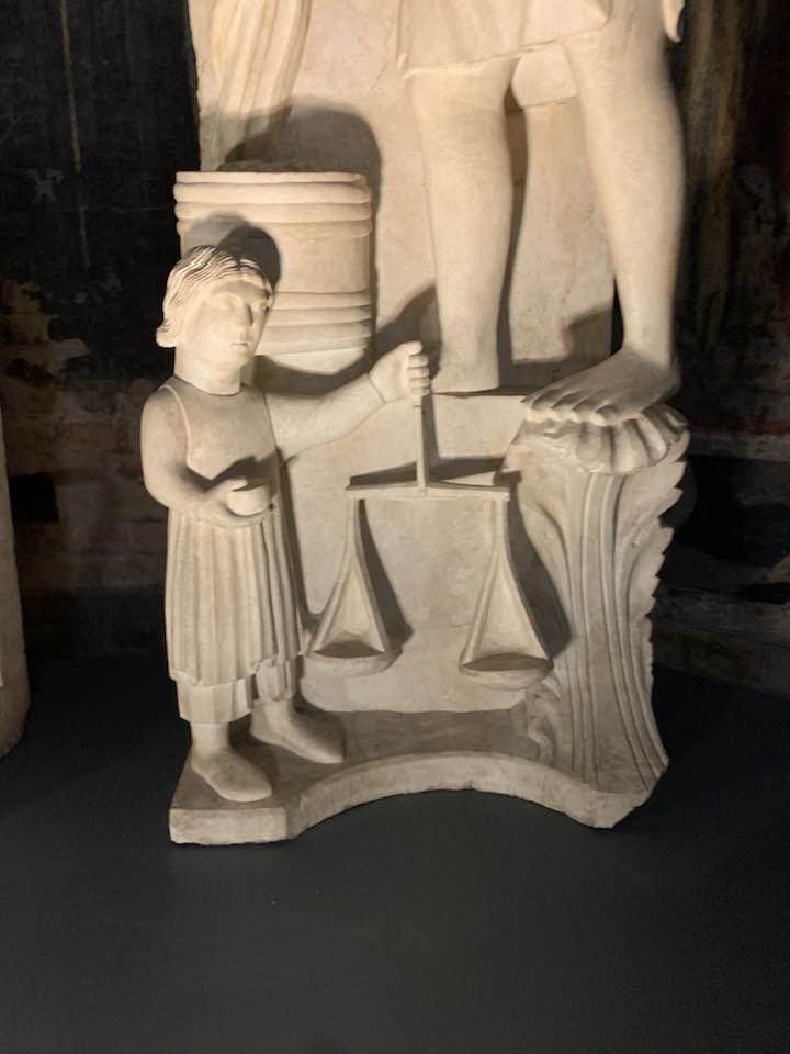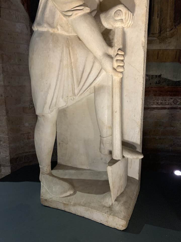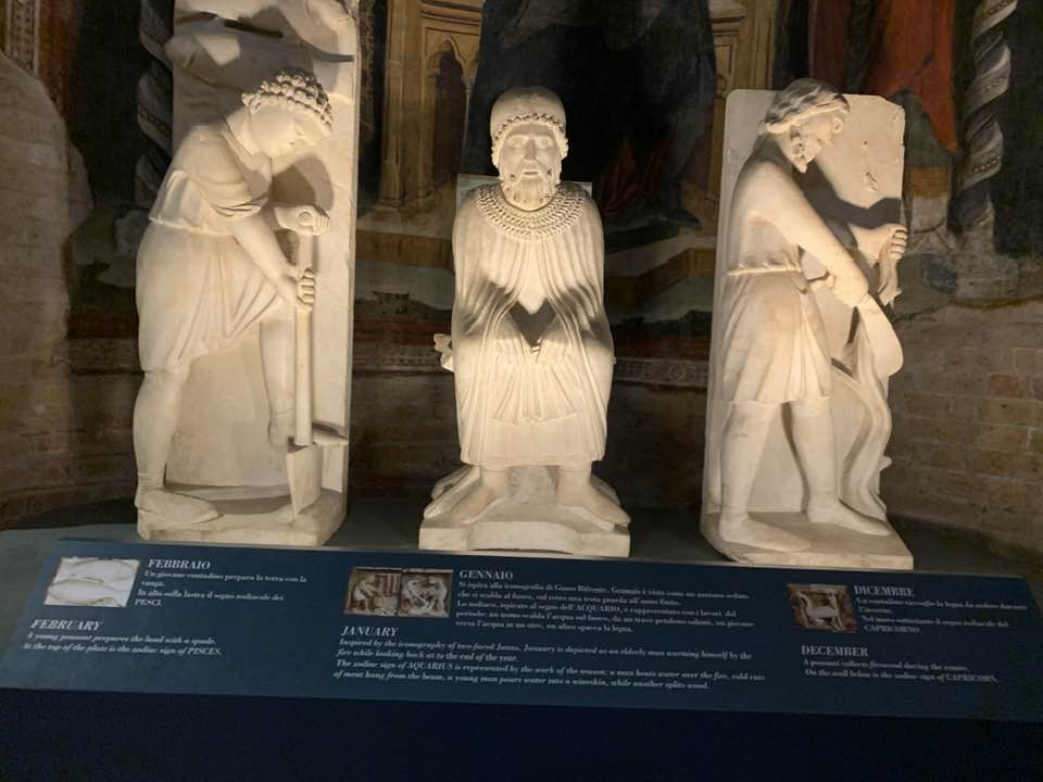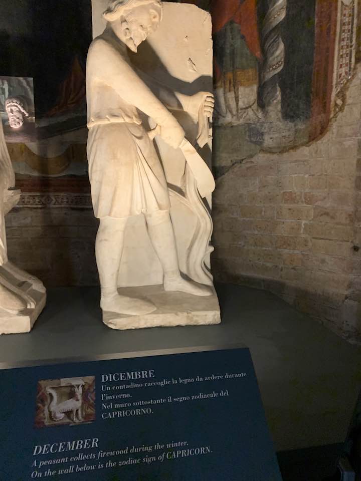La metafora dei mesi ci porta a considerare il mese di ottobre in cui, come un ossimoro, il vino invecchia e anche l’uomo segue il suo ciclo, fino a gennaio, mese del primo assaggio del vino, e l’uomo che diventa, nel paradigma, anziano. La natura si evolve, il contadino ha scarpe rinforzate e compatte intorno al piede con un mantello, e in un incavo ripone le sementi che sparge sui campi. Novembre è rappresentato con il mangime per allevare i maiali preso dalle piante di quercia, cioè le ghiande, e un uomo con un vestiario a maniche lunghe intento a cavare le rape. Dicembre, simbologia di un anziano solenne e degno di esperienza che taglia i rami da un albero. Gennaio è il mese bifronte, cioè Giano, antico dio romano, che chiude l’anno e ne apre uno nuovo pieno di aspettative e siede davanti al focolare. Febbraio è un giovane che vaga nei campi per le semine, la rinascita dei terreni, cioè la nuova vita che lui impersona solennemente.