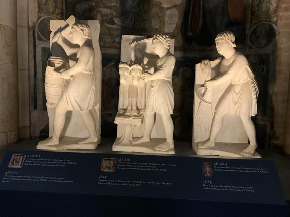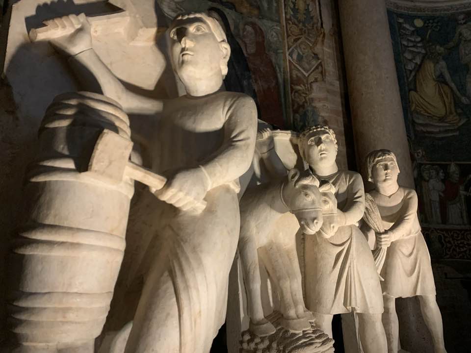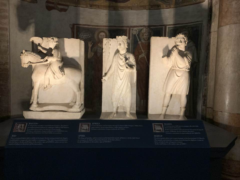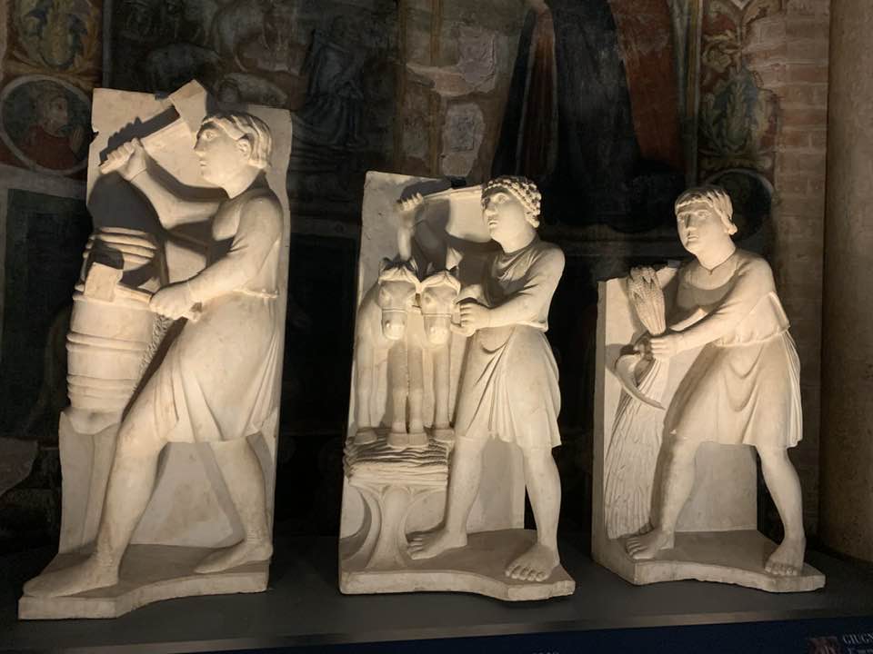 I mesi e il lavoro che diviene così un racconto medievale e anche intriso di un messaggio religioso, poiché grazie al lavoro si produce la salvezza dello spirito. Il lavoro quindi ha la sua positività, così come il mese di marzo è l’Annunciazione, mentre gennaio e febbraio sono i mesi dell’inverno, dalla stasi in attesa della rinascita che avverrà. Il ciclo dell’uomo e il divino si contemplano nel rinnovamento della natura che equivale allo stesso rinnovamento nell’uomo religioso vicino e attento alle Sacre Scritture. Il tempo quindi è il paradigma delle sculture di Antelami. Tuttavia i personaggi che sono assorti nel lavoro sono identificati in nobili personaggi elegantemente abbigliati, non quindi contadini malvestiti e affaticati nei lavori dei campi, tanto che un giovane, quasi fosse una divinità classica nella sua posa raffinata, suona l’olifante, simbolo del risveglio della primavera dopo il letargo dell’inverno. La primavera è rappresentata con un elegante capo cinto di fiori e poi i lunghi capelli che scendono sulla schiena. Giugno invece è il mese dei lavori nei campi con la mietitura, e il falcetto è simbolo del mese di luglio che invece è la trebbiatura con l’utilizzo del cavallo sopra le messi di grano. Agosto è un giovane con i calzari intento in una cantina a preparare i cerchi per le botti di vino: li stringe e ha un martello di legno. A settembre invece si raccolgono i grappoli d’uva e un uomo scalzo è intento a pestarla e trasformarla in mosto.