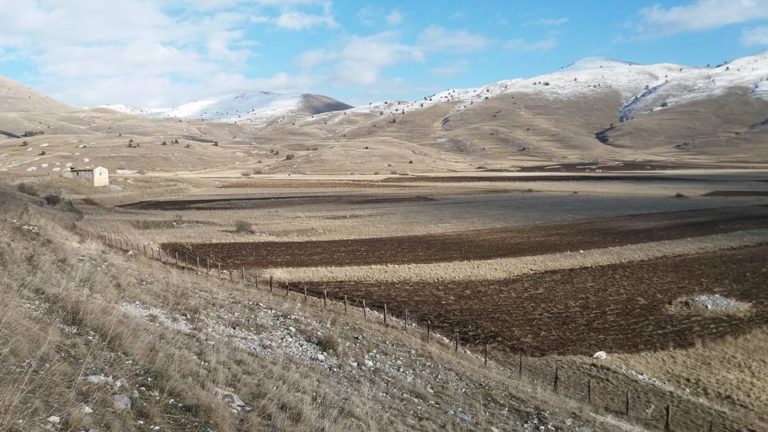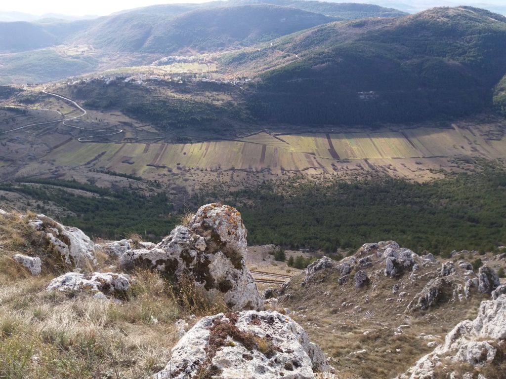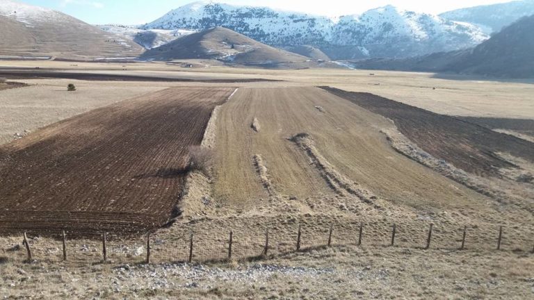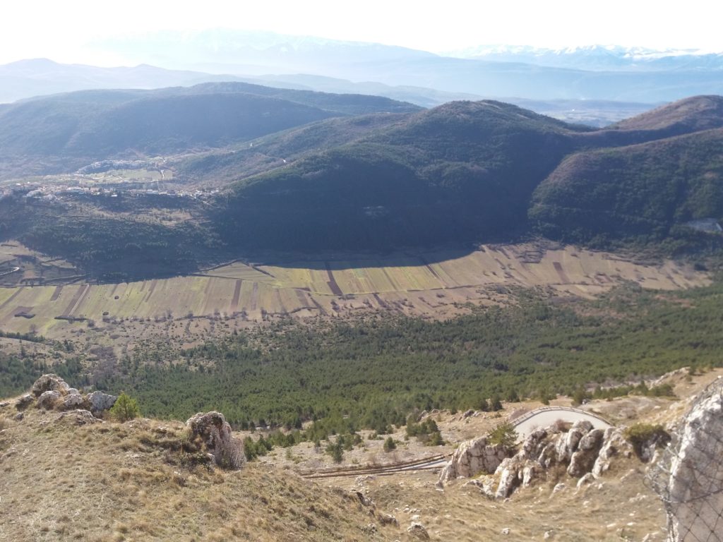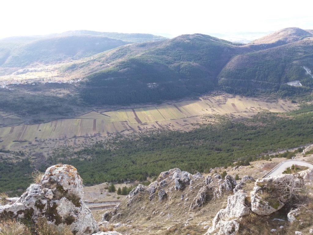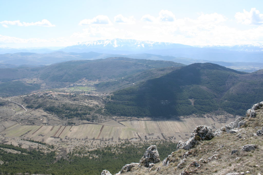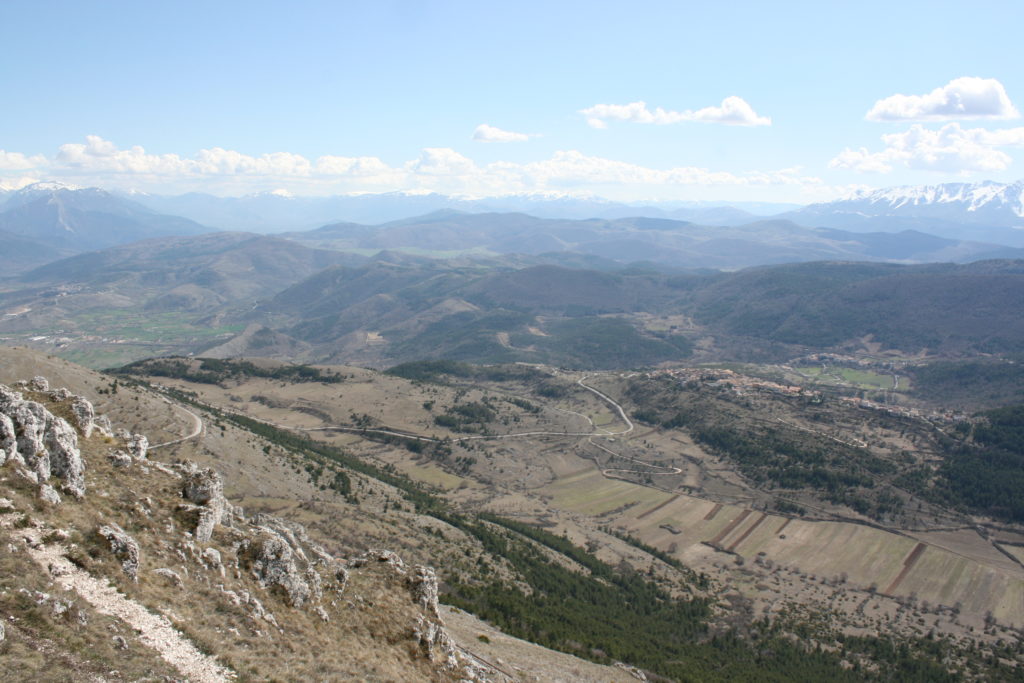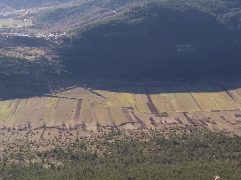 Gli abitati storici compatti delle dorsali appenniniche interne della conca aquilana e le cordigliere calcaree montane riflettono condizioni di opposizione. I borghi compatti sul piano urbanistico e i lineamenti paesistici aperti e spaziali in relazione alle tecniche di produzione. La forma dei campi, quindi aperti e nastriformi, sprovvisti di qualsiasi recinsione poiché la loro larghezza è contenuta e molto inferiore alla lunghezza. Strisce di terra di oltre 200 metri in lunghezza e da tre a quattro metri circa in larghezza, come si può osservare nei piani occidentali del Gran Gasso d’Italia, si adattano al dislivello del terreno nelle definite conche carsiche. L’orientamento era dato dai solchi dell’aratro a chiodo a tiro animale .Il camminamento di uomini e animali in una stretta carrareccia situata al fondo del piano coltivo a forma di cucchiaio.L’estrema frammentazione era conseguenza della suddivisione del terreno ai figli maschi in età di matrimonio. Il tracciato nastriforme dei terreni delle “pezze” risulta ancora oggi legato a quell’economia di sussistenza e al consumo diretto dei prodotti agricoli. Le pietre tolte dai terreni per bonificarli venivano trasportate nei borghi per edificare le abitazioni.