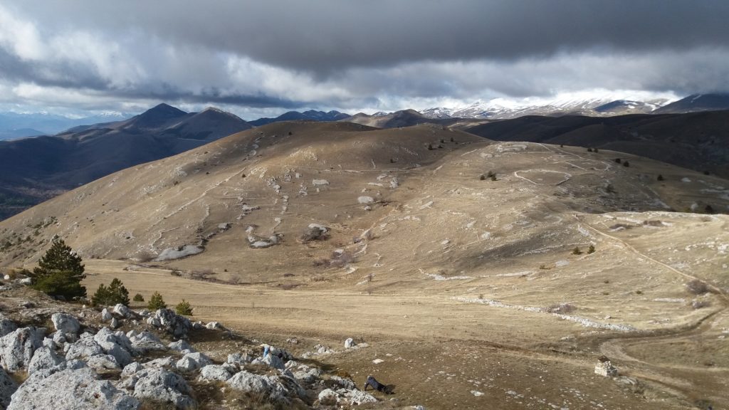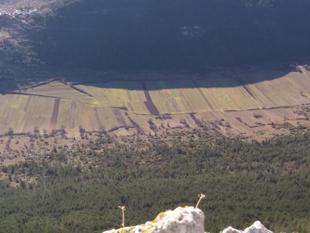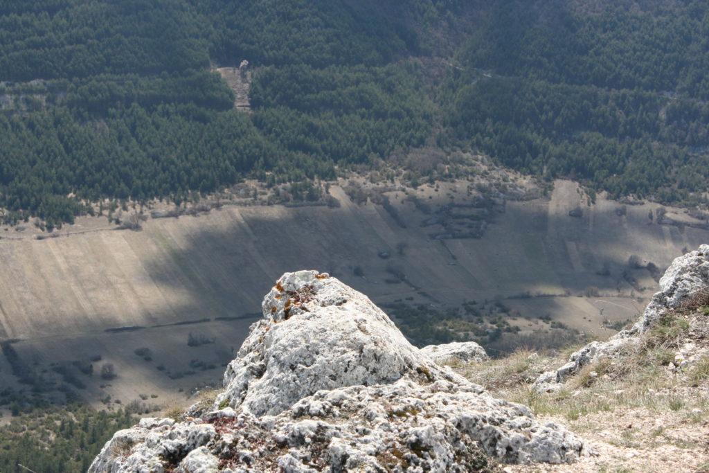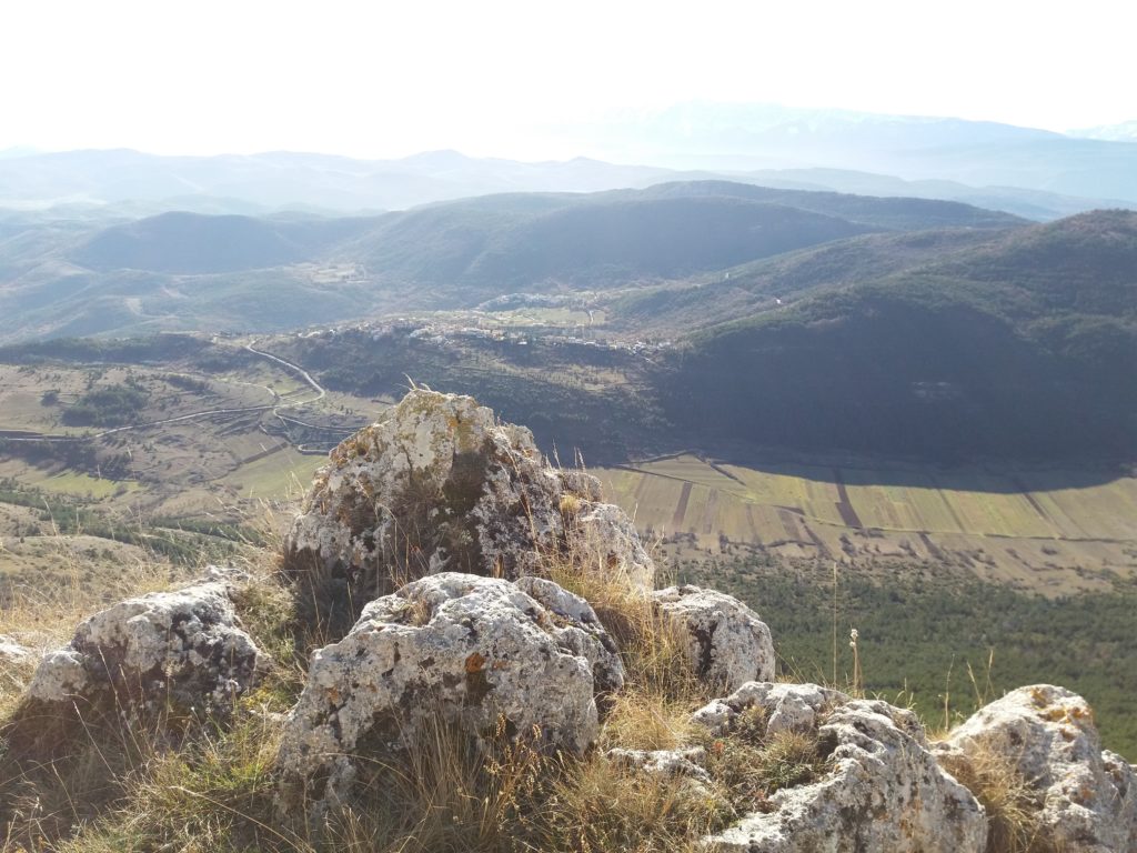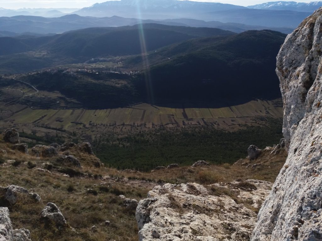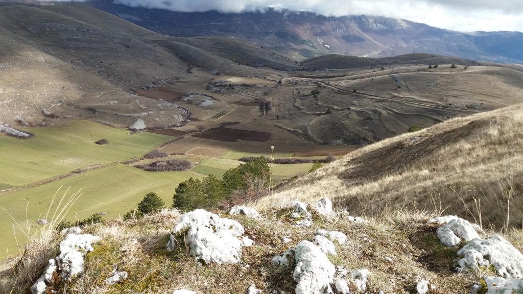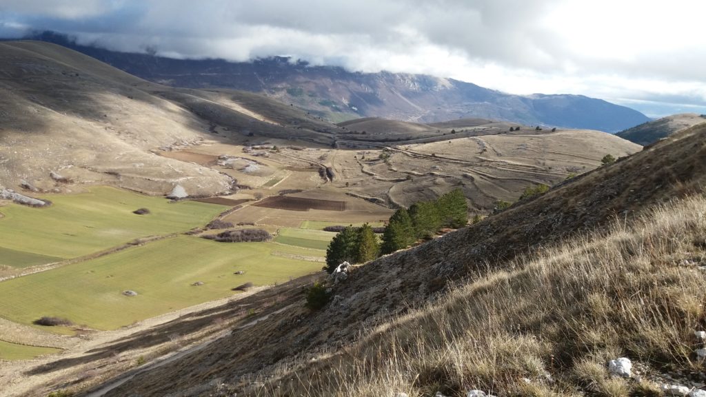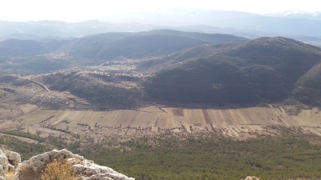 Gli abitati storici compatti delle dorsali appenniniche interne della conca aquilana e le cordigliere calcaree montane riflettono condizioni di opposizione. I borghi compatti sul piano urbanistico e i lineamenti paesistici aperti e spaziali in relazione alle tecniche di produzione. La forma dei campi, quindi aperti e nastriformi, sprovvisti di qualsiasi recinsione poiché la loro larghezza è contenuta e molto inferiore alla lunghezza. Strisce di terra di oltre 200 metri in lunghezza e da tre a quattro metri circa in larghezza, come si può osservare nei piani occidentali del Gran Gasso d’Italia, si adattano al dislivello del terreno nelle definite conche carsiche. L’orientamento era dato dai solchi dell’aratro a chiodo a tiro animale .Il camminamento di uomini e animali in una stretta carrareccia situata al fondo del piano coltivo a forma di cucchiaio.L’estrema frammentazione era conseguenza della suddivisione del terreno ai figli maschi in età di matrimonio. Il tracciato nastriforme dei terreni delle “pezze” risulta ancora oggi legato a quell’economia di sussistenza e al consumo diretto dei prodotti agricoli. Le pietre tolte dai terreni per bonificarli venivano trasportate nei borghi per edificare le abitazioni.