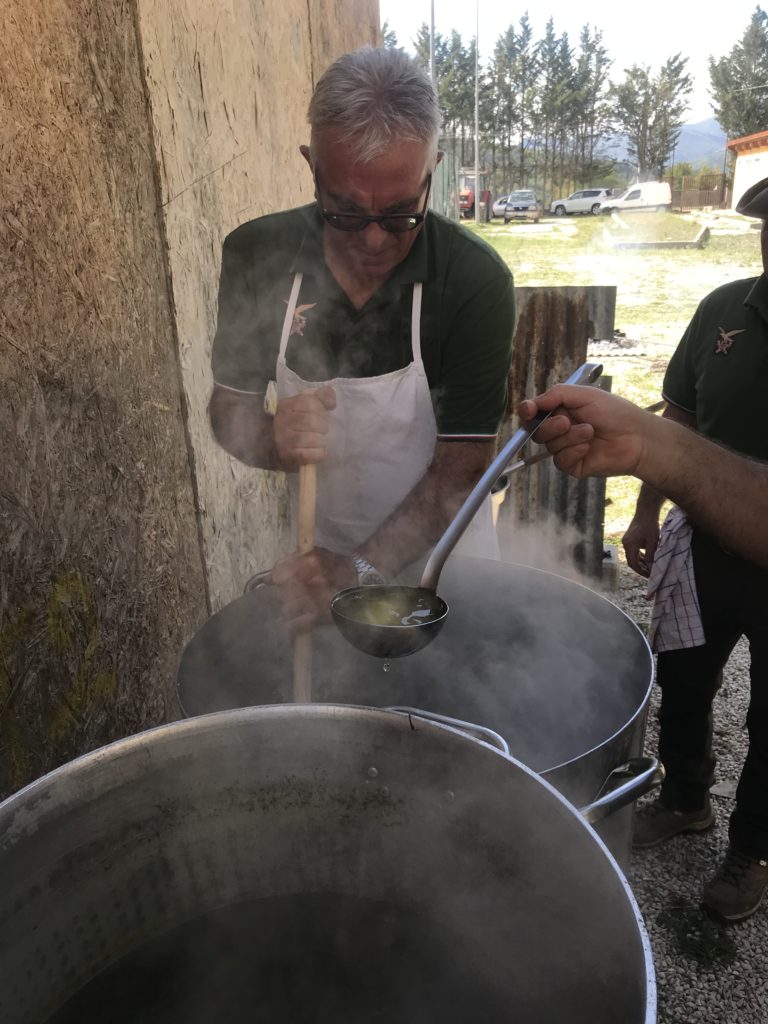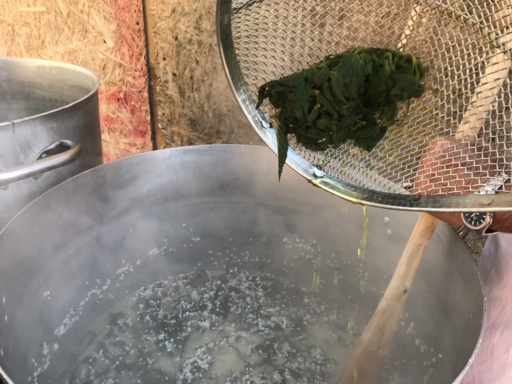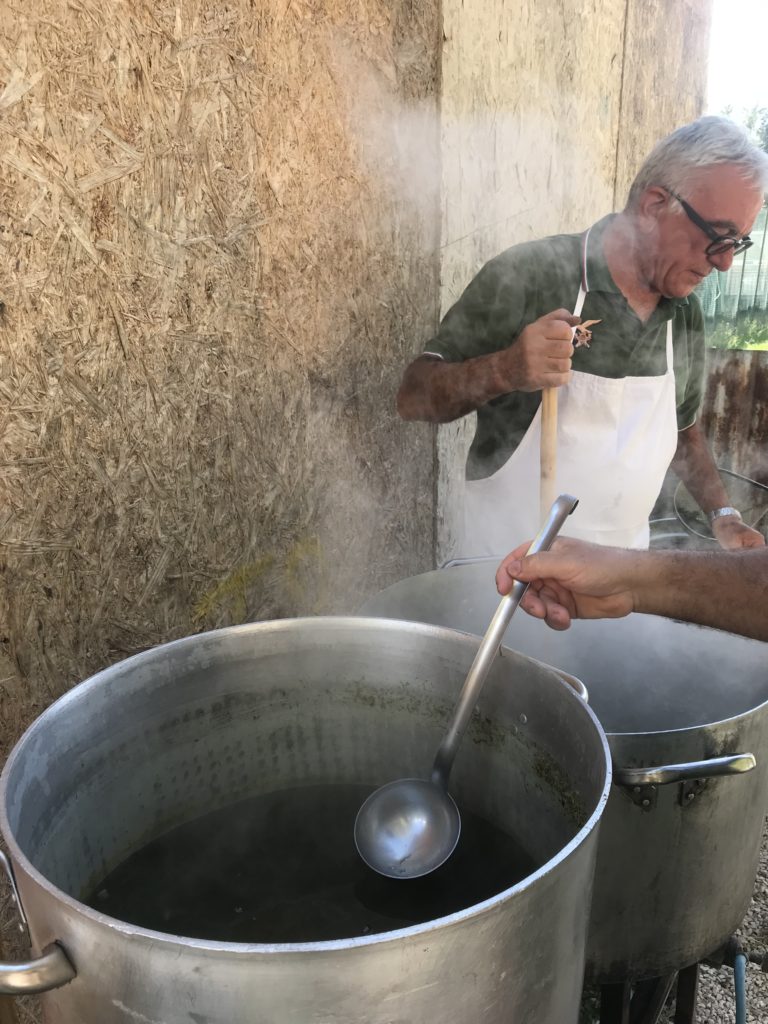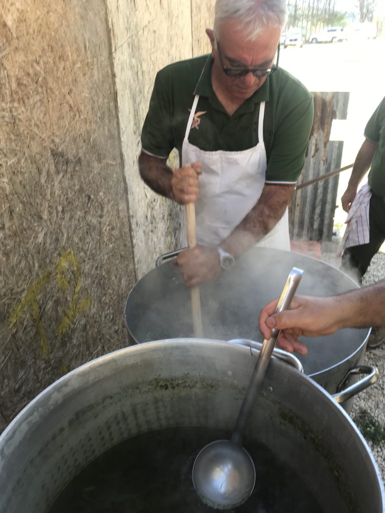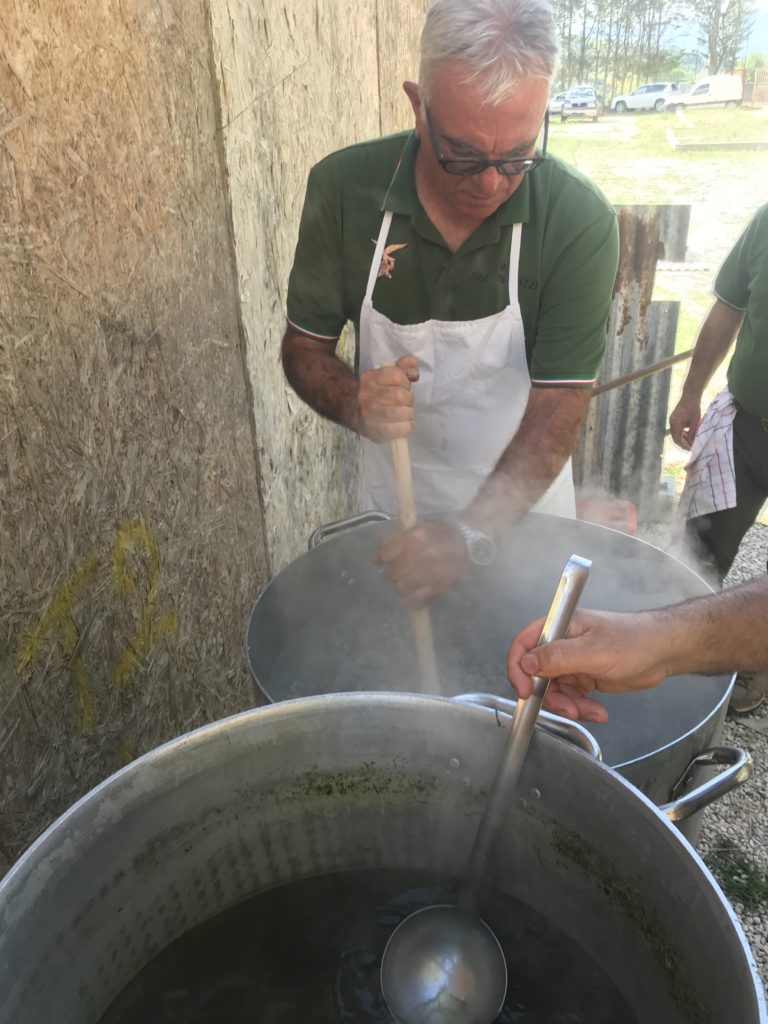 Preparazione del riso all’ortica. Brodo vegetale con sedano, carota e cipolla. Soffritto di cipolla e salsiccia, si aggiunge il riso, si fa tostare, si sfuma con vino bianco e si aggiunge infine il brodo vegetale. Al riso umido, dopo 5 minuti, si versa l’ortica lessata in cottura per 15 minuti. Dopo circa 20 minuti si spegne il fuoco e si aggiunge il parmigiano: il riso è pronto. Le panonte fritte dorate con le uova. Spezzatino di vitello con il guanciale, in umido, con sedano e carote. Uva fragola selvatica.