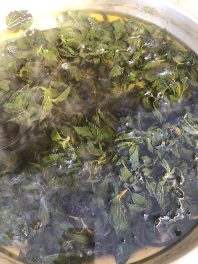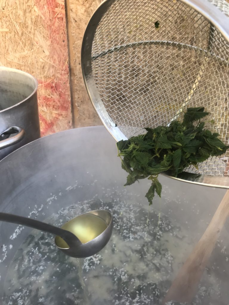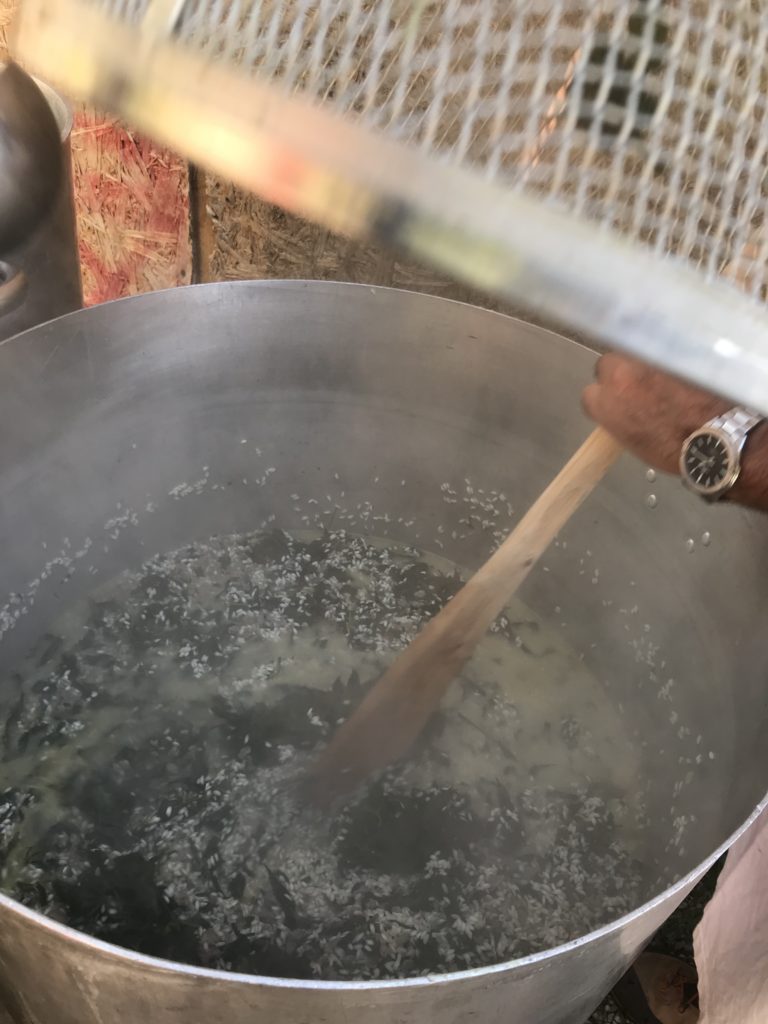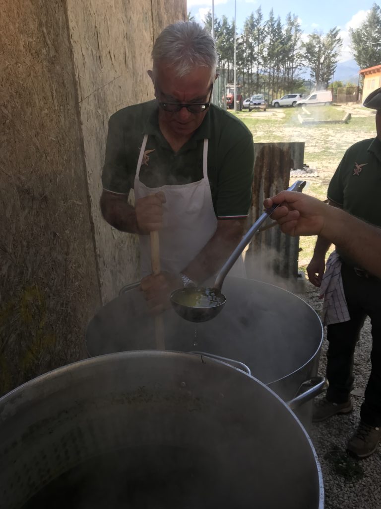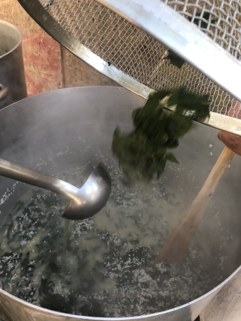 Preparazione del riso all’ortica. Brodo vegetale con sedano, carota e cipolla. Soffritto di cipolla e salsiccia, si aggiunge il riso, si fa tostare, si sfuma con vino bianco e si aggiunge infine il brodo vegetale. Al riso umido, dopo 5 minuti, si versa l’ortica lessata in cottura per 15 minuti. Dopo circa 20 minuti si spegne il fuoco e si aggiunge il parmigiano: il riso è pronto. Le panonte fritte dorate con le uova. Spezzatino di vitello con il guanciale, in umido, con sedano e carote. Uva fragola selvatica.