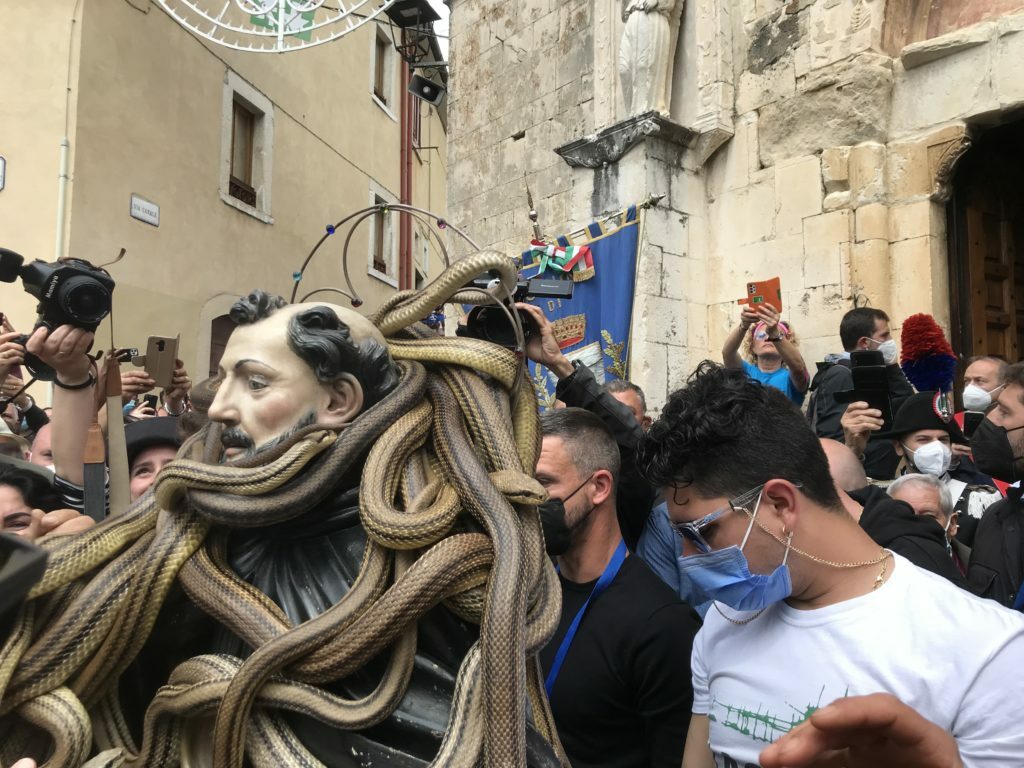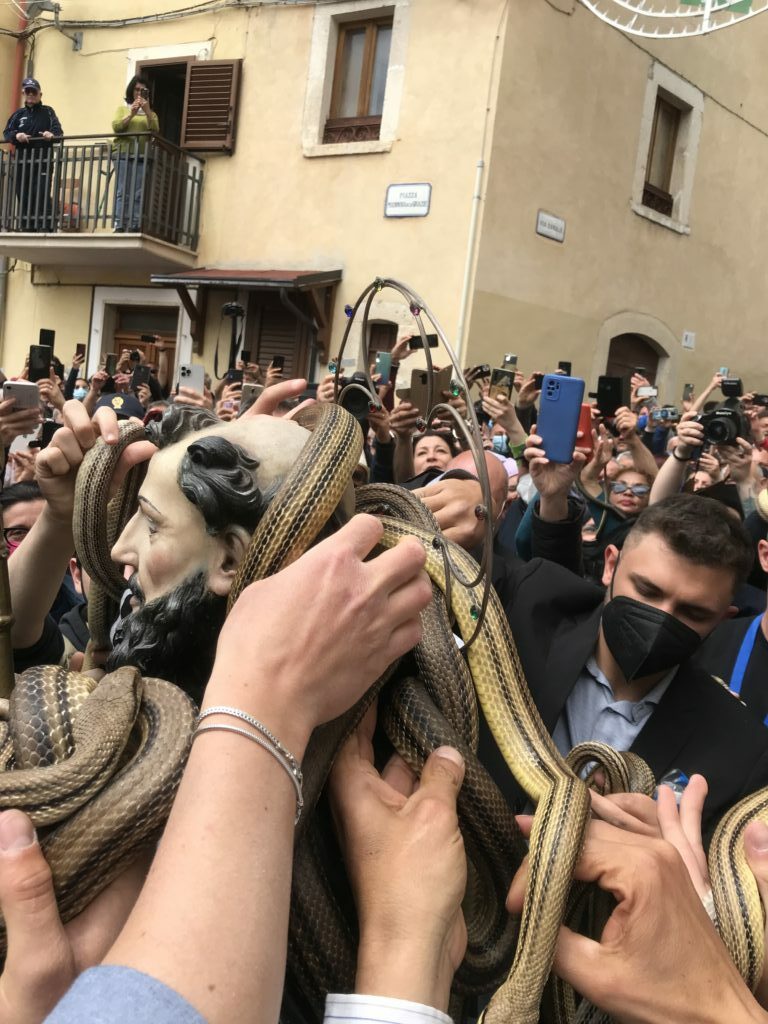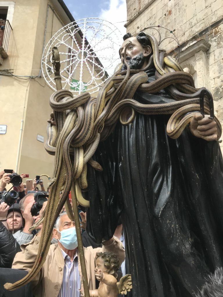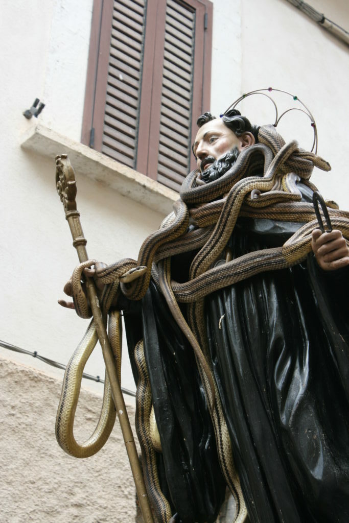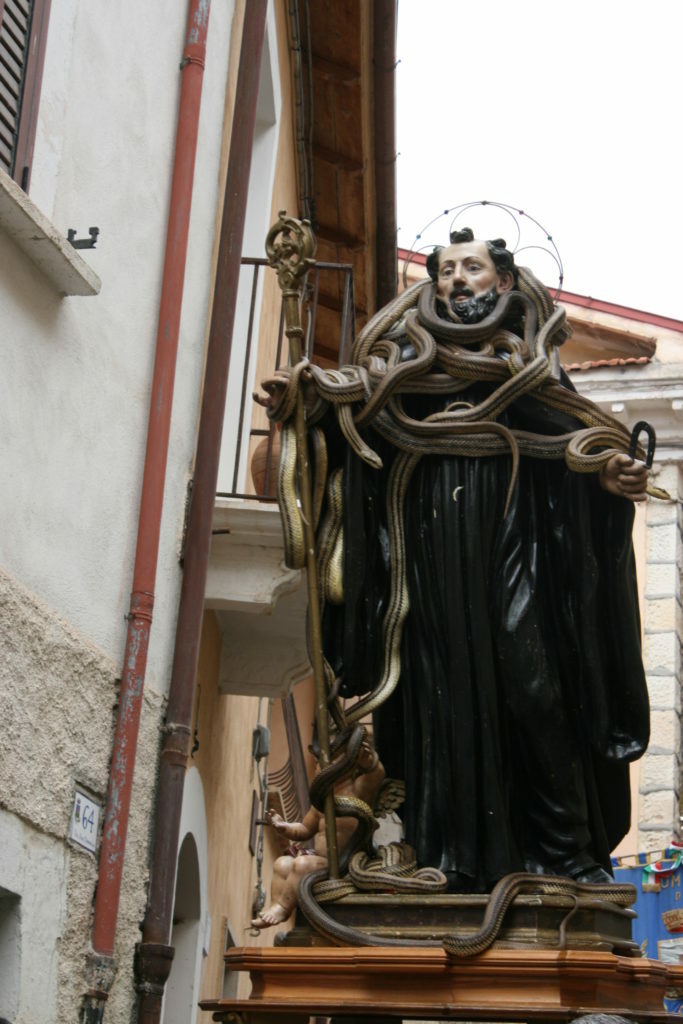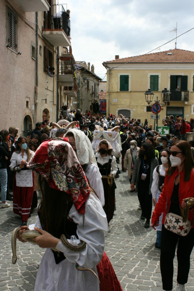 Il Bene e il Male in questo circo mediatico hollywoodiano (le ragioni originarie, storiche, del culto primitivo sono state deposte, e per sempre resettate) consacrante e insieme dissacrante negli opposti che si attraggono…, è Cocullo, a sua insaputa, un ossimoro del 1 maggio: concetti contrari ma attrattivi, enigmatici, nella processione di San Domenico avvolto con le serpi oramai, passive “attrici” arrendevoli e su loro la meraviglia e lo stupore collettivo. Davanti al Male eterno: “la serpa”, femmina e genitrice, appariscente, Jana, strega, magara, istigatrice, subdola dai poteri occulti, fattucchiera esportatrice di malefici, eterna nella notte del Sabba dove si dà convegno, esecutrice del dettato del demonio, trasfigurata e strisciante è la “serpa”, e quando prova ad alzarsi e slanciarsi con le spire dalle profondità del Creato in cui è stata scaraventata, Caravaggio, la rappresenta nel dipinto “Madonna dei Palafrenieri” – olio su tela (292×211 cm) realizzato nel 1606 -, detto anche “Madonna della Serpe”, che poggia il suo piede nudo e delicato in una postura plastica di grande finezza sulla testa dello stesso serpente, con grande delicatezza. Sopra il suo piede, quasi a riaffermare la purezza del Bene contro il Male, il piedino di Gesù Bambino con il suo volto fecondo e paffutello, che però inizia a manifestare un certo disgusto, in uno straordinario, diciamo, naturalismo di un Caravaggio “didatta” nella capacità di un metodo d’insegnamento con la sua pittura, per tutti noi, tra genio e sregolatezza. La delega della Madonna, ora lei è lontana, amministratrice nel tempo, della “serpa”, depone il suo mandato a San Domenico Abate, il suo intermediario e mediatore. La statua che lo rappresenta con i suoi attributi simbolici e apotropaici, è in processione, nell’inverosimile, realistico e dalle coincidenze impossibili appunto tra Bene e il Male, per le vie di Cocullo, in questo “combattimento gladiatorio” tra l’uomo e i serpenti, tra la folla acclamante e arsa e spumeggiante di stupore, come non potremmo mai immaginare, e il Santo serafico avvolto da una sciarpa di serpenti che sfila: l’oscurità di un culto profetico antico e primordiale, ma che oggi si acquista nelle bancarelle di Cocullo…