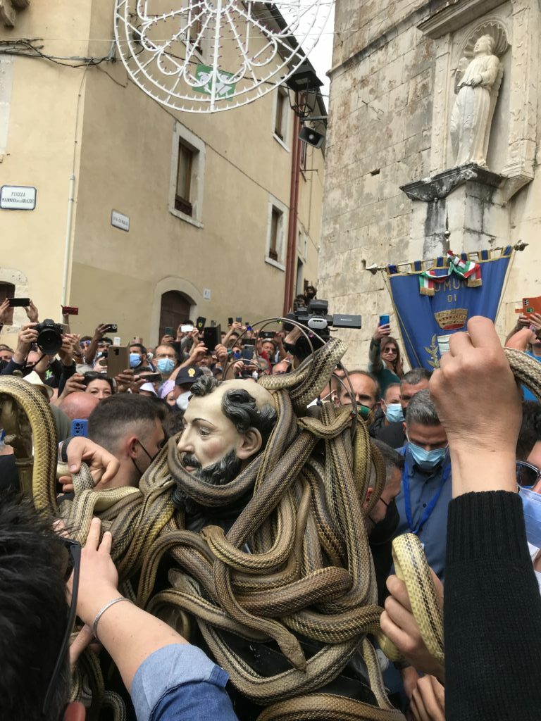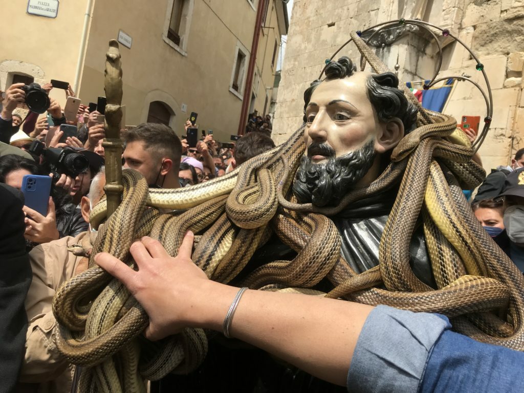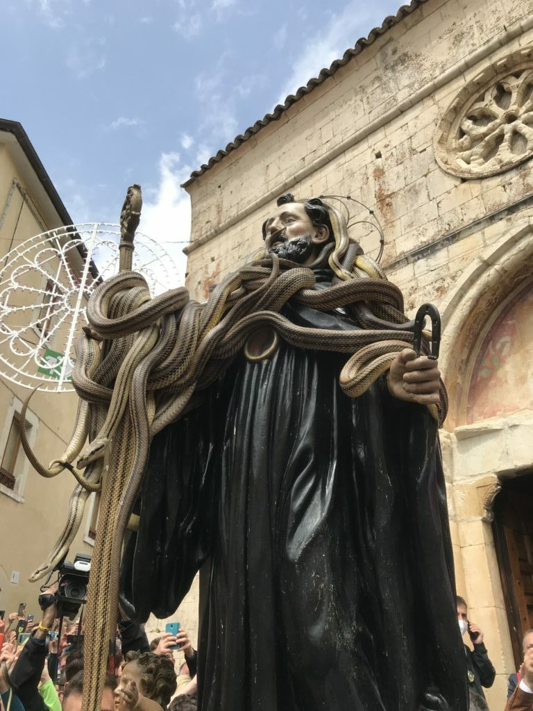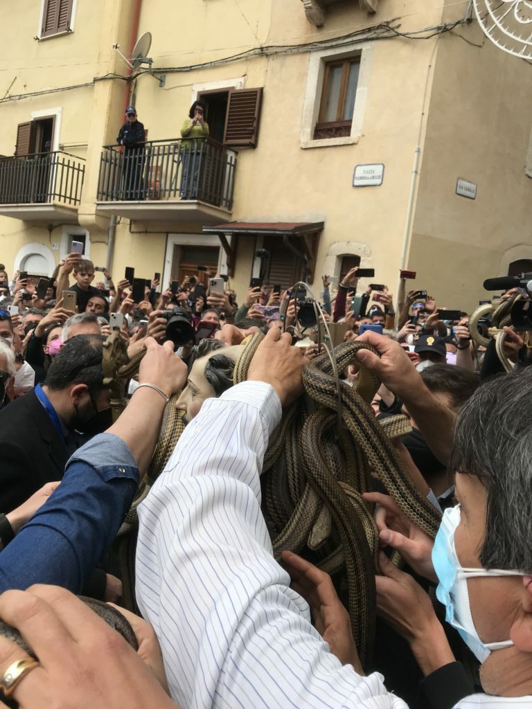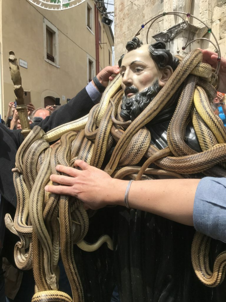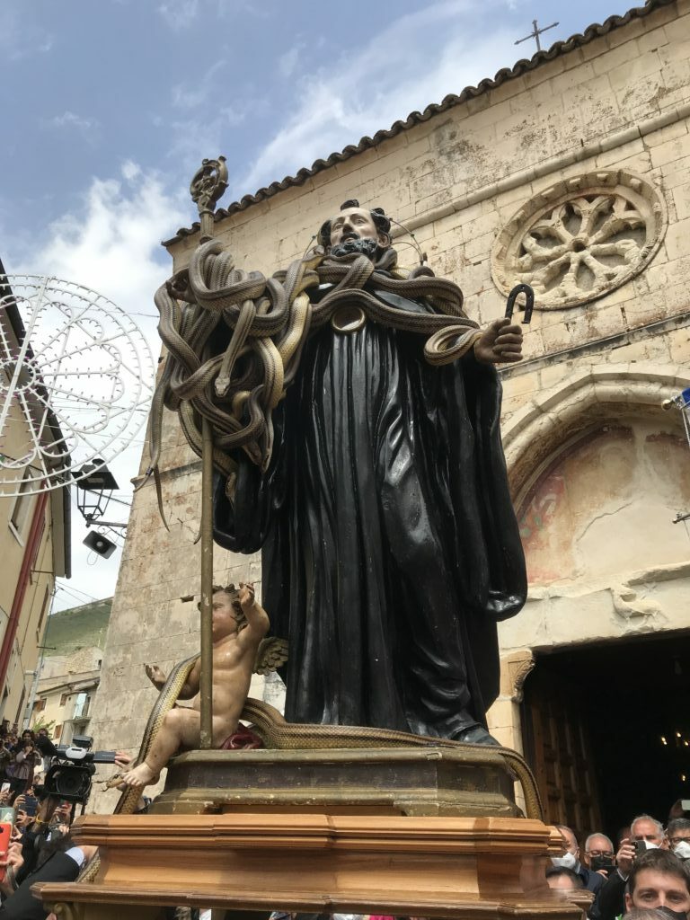 Il Bene e il Male in questo circo mediatico hollywoodiano (le ragioni originarie, storiche, del culto primitivo sono state deposte, e per sempre resettate) consacrante e insieme dissacrante negli opposti che si attraggono…, è Cocullo, a sua insaputa, un ossimoro del 1 maggio: concetti contrari ma attrattivi, enigmatici, nella processione di San Domenico avvolto con le serpi oramai, passive “attrici” arrendevoli e su loro la meraviglia e lo stupore collettivo. Davanti al Male eterno: “la serpa”, femmina e genitrice, appariscente, Jana, strega, magara, istigatrice, subdola dai poteri occulti, fattucchiera esportatrice di malefici, eterna nella notte del Sabba dove si dà convegno, esecutrice del dettato del demonio, trasfigurata e strisciante è la “serpa”, e quando prova ad alzarsi e slanciarsi con le spire dalle profondità del Creato in cui è stata scaraventata, Caravaggio, la rappresenta nel dipinto “Madonna dei Palafrenieri” – olio su tela (292×211 cm) realizzato nel 1606 -, detto anche “Madonna della Serpe”, che poggia il suo piede nudo e delicato in una postura plastica di grande finezza sulla testa dello stesso serpente, con grande delicatezza. Sopra il suo piede, quasi a riaffermare la purezza del Bene contro il Male, il piedino di Gesù Bambino con il suo volto fecondo e paffutello, che però inizia a manifestare un certo disgusto, in uno straordinario, diciamo, naturalismo di un Caravaggio “didatta” nella capacità di un metodo d’insegnamento con la sua pittura, per tutti noi, tra genio e sregolatezza. La delega della Madonna, ora lei è lontana, amministratrice nel tempo, della “serpa”, depone il suo mandato a San Domenico Abate, il suo intermediario e mediatore. La statua che lo rappresenta con i suoi attributi simbolici e apotropaici, è in processione, nell’inverosimile, realistico e dalle coincidenze impossibili appunto tra Bene e il Male, per le vie di Cocullo, in questo “combattimento gladiatorio” tra l’uomo e i serpenti, tra la folla acclamante e arsa e spumeggiante di stupore, come non potremmo mai immaginare, e il Santo serafico avvolto da una sciarpa di serpenti che sfila: l’oscurità di un culto profetico antico e primordiale, ma che oggi si acquista nelle bancarelle di Cocullo…