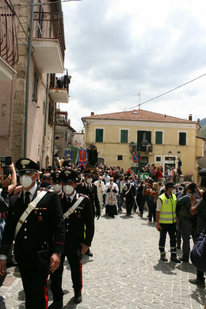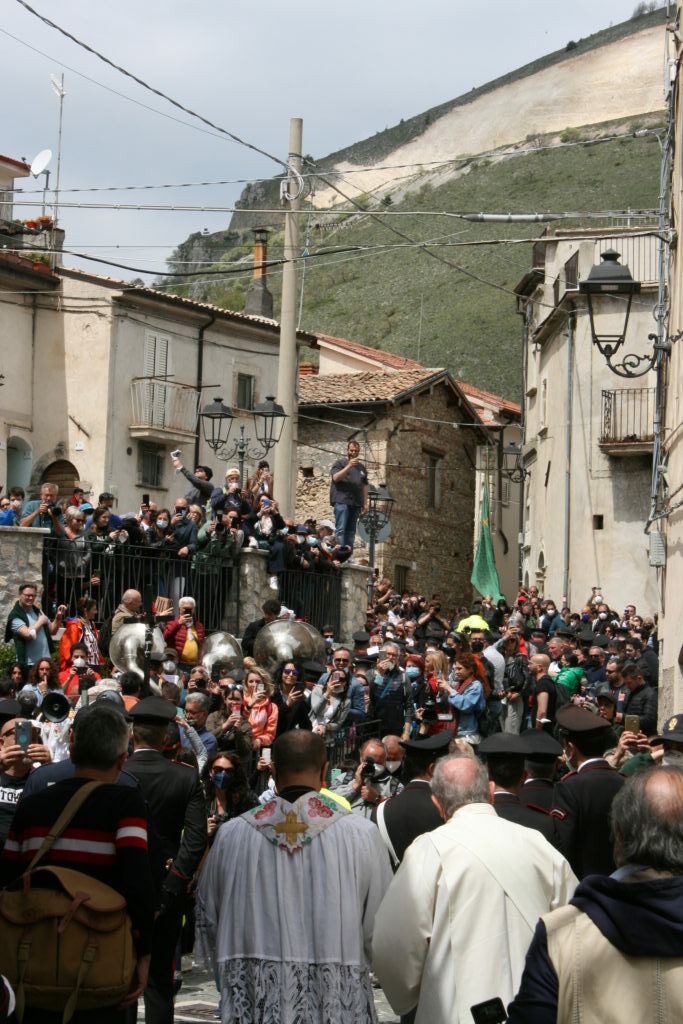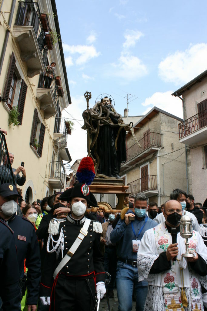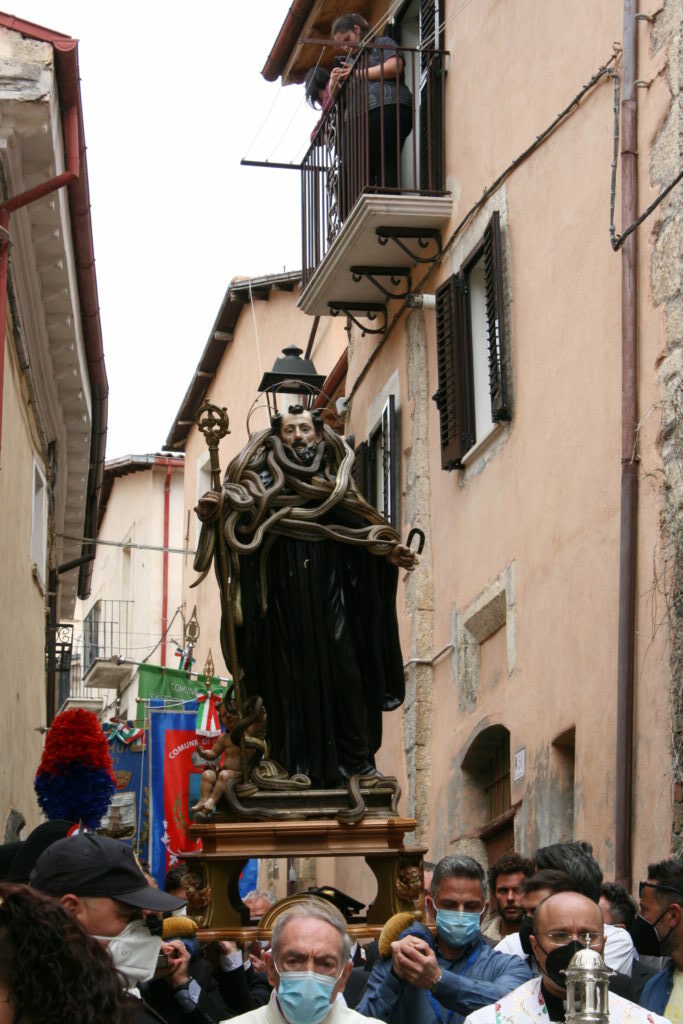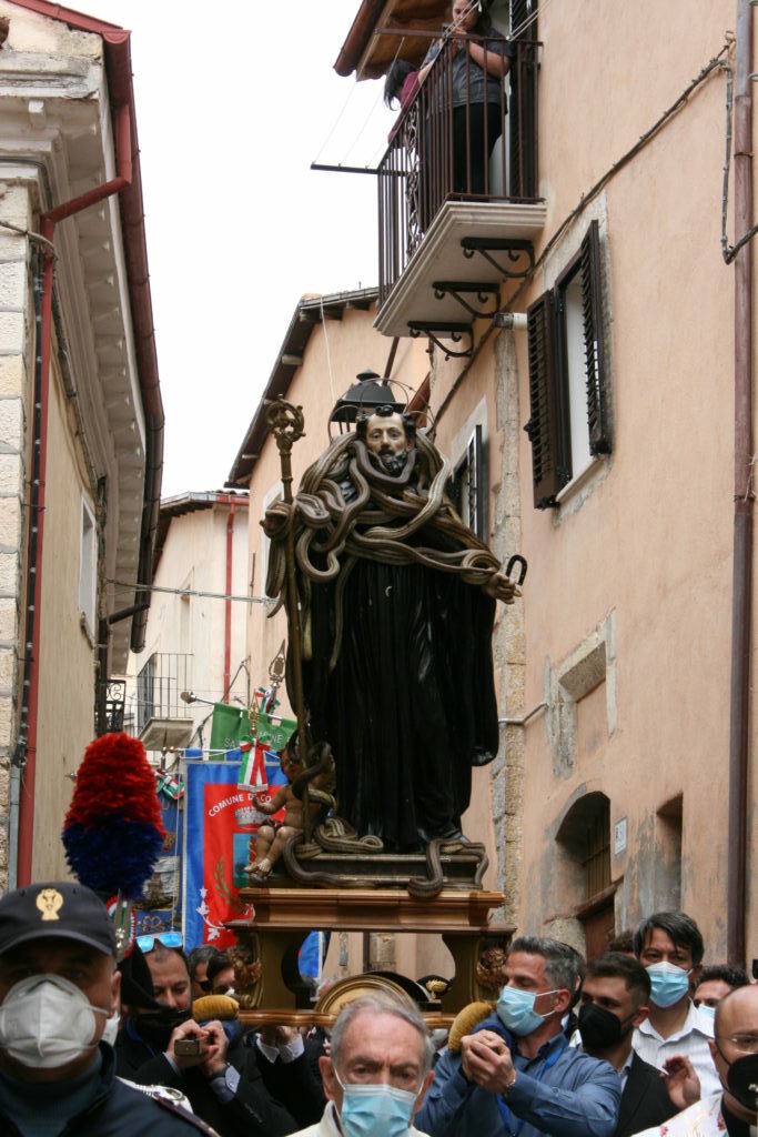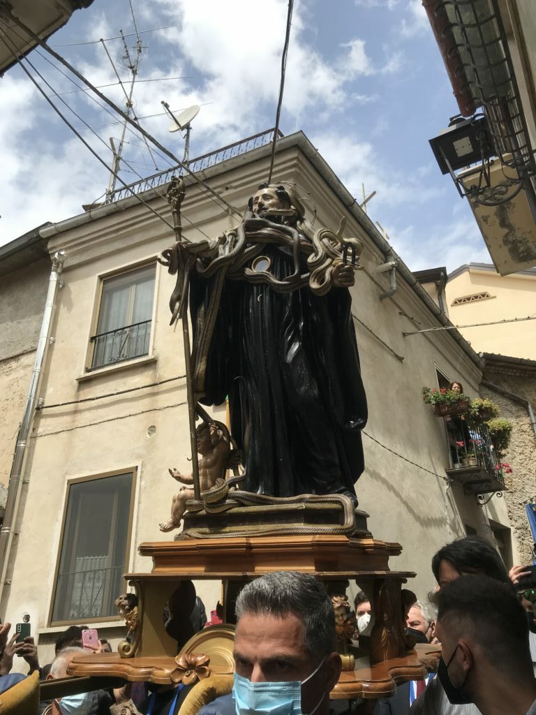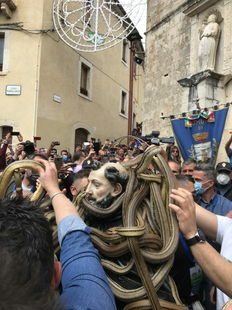 Il Bene e il Male in questo circo mediatico hollywoodiano (le ragioni originarie, storiche, del culto primitivo sono state deposte, e per sempre resettate) consacrante e insieme dissacrante negli opposti che si attraggono…, è Cocullo, a sua insaputa, un ossimoro del 1 maggio: concetti contrari ma attrattivi, enigmatici, nella processione di San Domenico avvolto con le serpi oramai, passive “attrici” arrendevoli e su loro la meraviglia e lo stupore collettivo. Davanti al Male eterno: “la serpa”, femmina e genitrice, appariscente, Jana, strega, magara, istigatrice, subdola dai poteri occulti, fattucchiera esportatrice di malefici, eterna nella notte del Sabba dove si dà convegno, esecutrice del dettato del demonio, trasfigurata e strisciante è la “serpa”, e quando prova ad alzarsi e slanciarsi con le spire dalle profondità del Creato in cui è stata scaraventata, Caravaggio, la rappresenta nel dipinto “Madonna dei Palafrenieri” – olio su tela (292×211 cm) realizzato nel 1606 -, detto anche “Madonna della Serpe”, che poggia il suo piede nudo e delicato in una postura plastica di grande finezza sulla testa dello stesso serpente, con grande delicatezza. Sopra il suo piede, quasi a riaffermare la purezza del Bene contro il Male, il piedino di Gesù Bambino con il suo volto fecondo e paffutello, che però inizia a manifestare un certo disgusto, in uno straordinario, diciamo, naturalismo di un Caravaggio “didatta” nella capacità di un metodo d’insegnamento con la sua pittura, per tutti noi, tra genio e sregolatezza. La delega della Madonna, ora lei è lontana, amministratrice nel tempo, della “serpa”, depone il suo mandato a San Domenico Abate, il suo intermediario e mediatore. La statua che lo rappresenta con i suoi attributi simbolici e apotropaici, è in processione, nell’inverosimile, realistico e dalle coincidenze impossibili appunto tra Bene e il Male, per le vie di Cocullo, in questo “combattimento gladiatorio” tra l’uomo e i serpenti, tra la folla acclamante e arsa e spumeggiante di stupore, come non potremmo mai immaginare, e il Santo serafico avvolto da una sciarpa di serpenti che sfila: l’oscurità di un culto profetico antico e primordiale, ma che oggi si acquista nelle bancarelle di Cocullo…