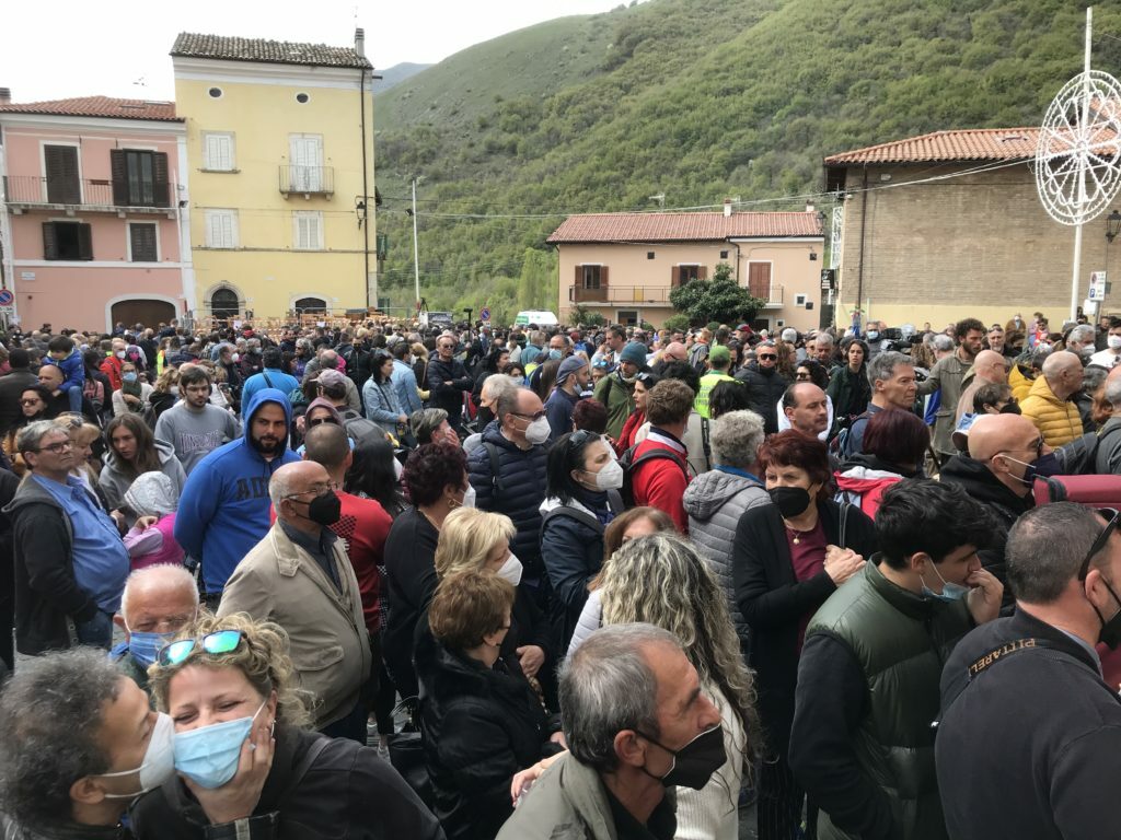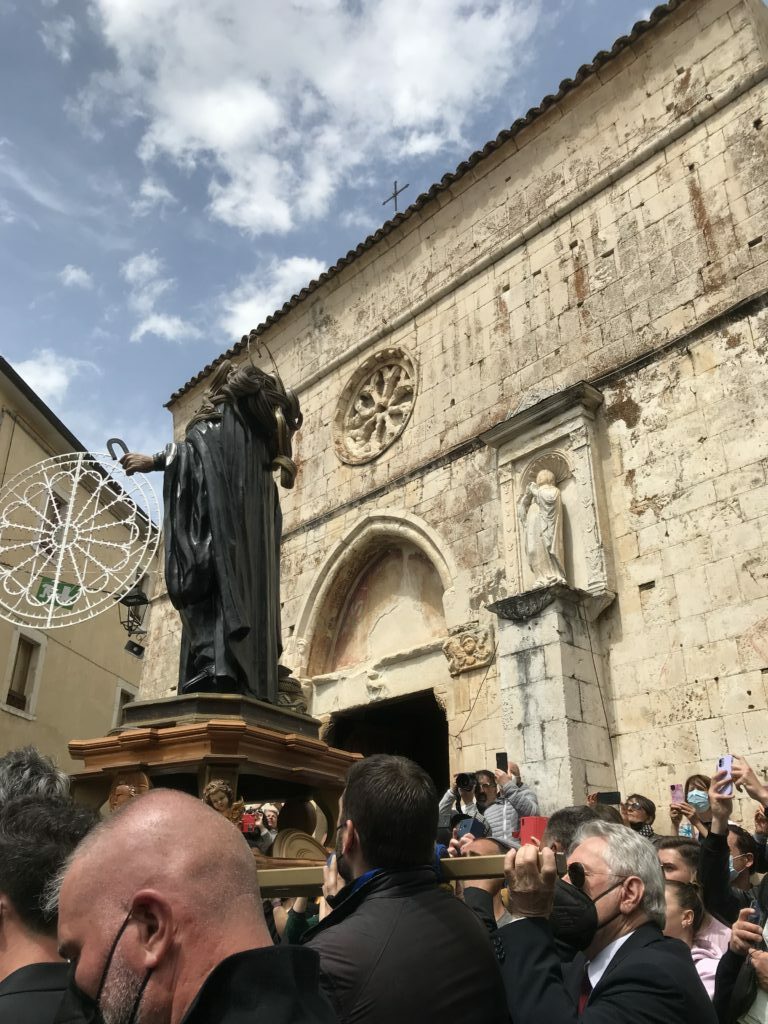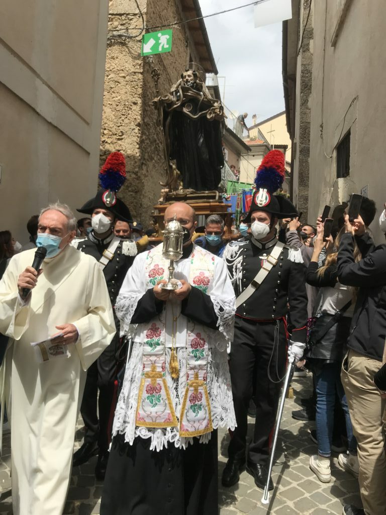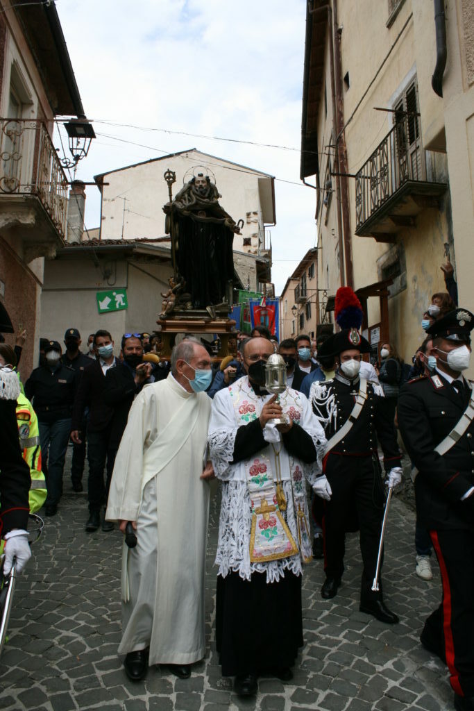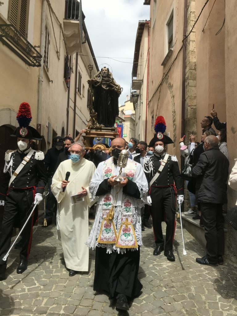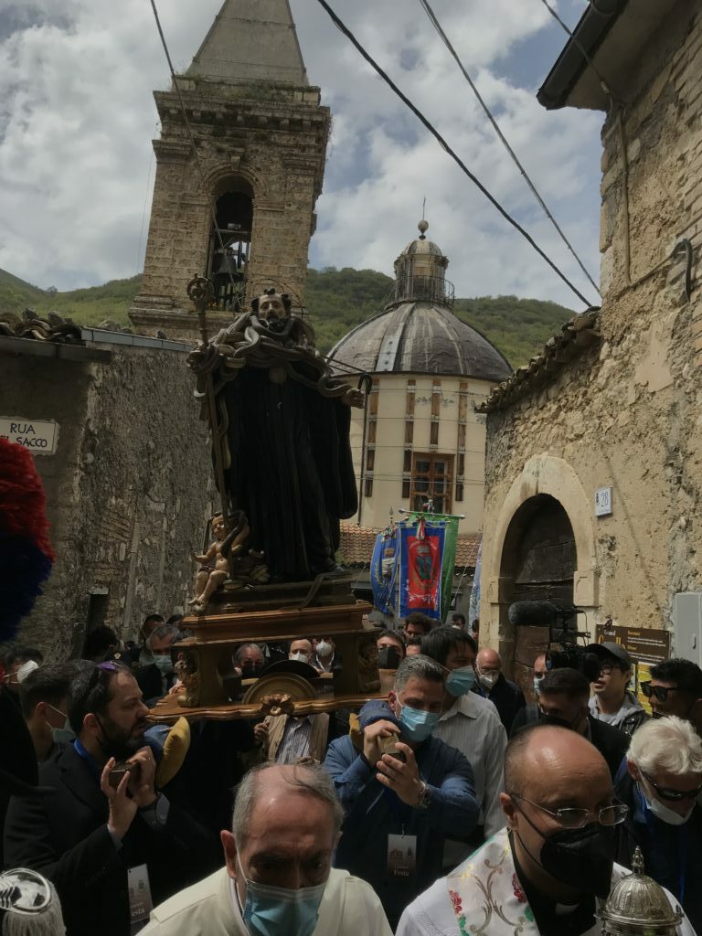 Il Bene e il Male in questo circo mediatico hollywoodiano (le ragioni originarie, storiche, del culto primitivo sono state deposte, e per sempre resettate) consacrante e insieme dissacrante negli opposti che si attraggono…, è Cocullo, a sua insaputa, un ossimoro del 1 maggio: concetti contrari ma attrattivi, enigmatici, nella processione di San Domenico avvolto con le serpi oramai, passive “attrici” arrendevoli e su loro la meraviglia e lo stupore collettivo. Davanti al Male eterno: “la serpa”, femmina e genitrice, appariscente, Jana, strega, magara, istigatrice, subdola dai poteri occulti, fattucchiera esportatrice di malefici, eterna nella notte del Sabba dove si dà convegno, esecutrice del dettato del demonio, trasfigurata e strisciante è la “serpa”, e quando prova ad alzarsi e slanciarsi con le spire dalle profondità del Creato in cui è stata scaraventata, Caravaggio, la rappresenta nel dipinto “Madonna dei Palafrenieri” – olio su tela (292×211 cm) realizzato nel 1606 -, detto anche “Madonna della Serpe”, che poggia il suo piede nudo e delicato in una postura plastica di grande finezza sulla testa dello stesso serpente, con grande delicatezza. Sopra il suo piede, quasi a riaffermare la purezza del Bene contro il Male, il piedino di Gesù Bambino con il suo volto fecondo e paffutello, che però inizia a manifestare un certo disgusto, in uno straordinario, diciamo, naturalismo di un Caravaggio “didatta” nella capacità di un metodo d’insegnamento con la sua pittura, per tutti noi, tra genio e sregolatezza. La delega della Madonna, ora lei è lontana, amministratrice nel tempo, della “serpa”, depone il suo mandato a San Domenico Abate, il suo intermediario e mediatore. La statua che lo rappresenta con i suoi attributi simbolici e apotropaici, è in processione, nell’inverosimile, realistico e dalle coincidenze impossibili appunto tra Bene e il Male, per le vie di Cocullo, in questo “combattimento gladiatorio” tra l’uomo e i serpenti, tra la folla acclamante e arsa e spumeggiante di stupore, come non potremmo mai immaginare, e il Santo serafico avvolto da una sciarpa di serpenti che sfila: l’oscurità di un culto profetico antico e primordiale, ma che oggi si acquista nelle bancarelle di Cocullo…