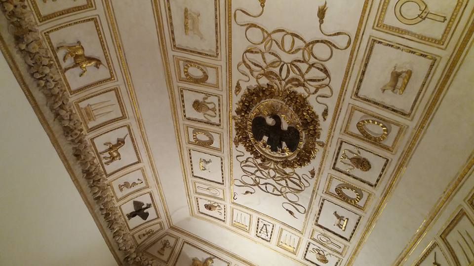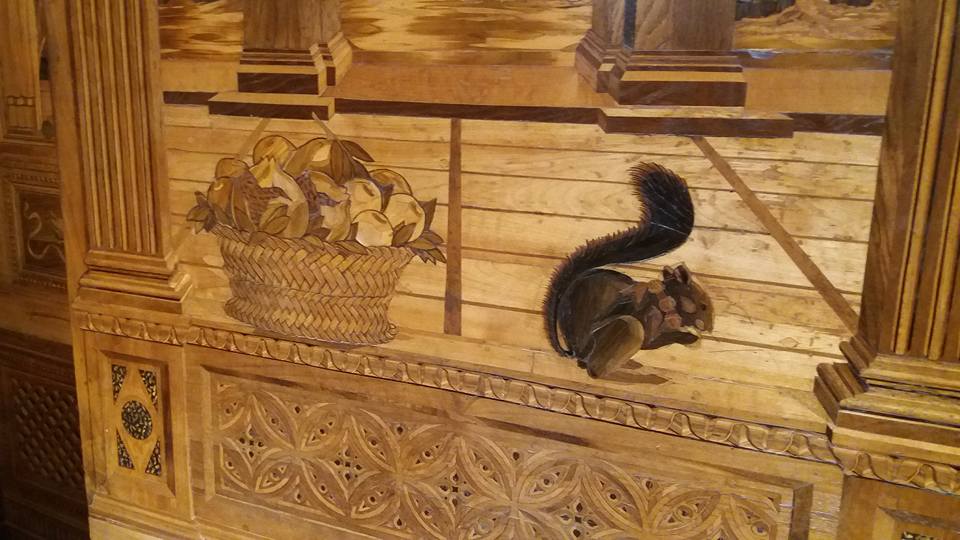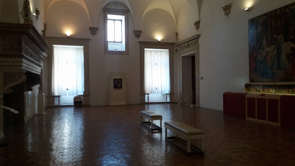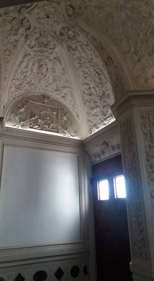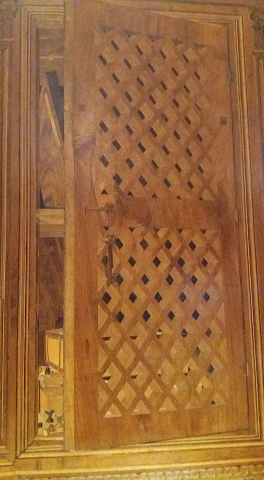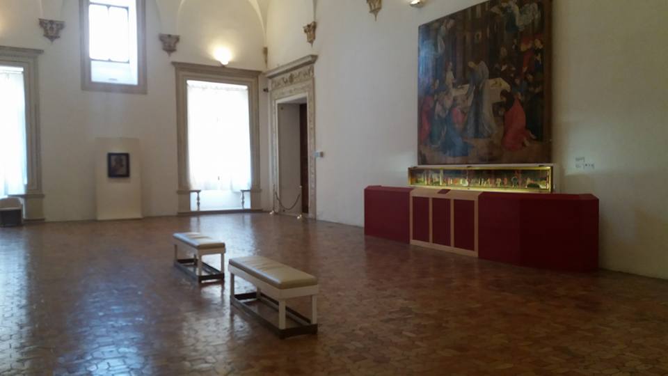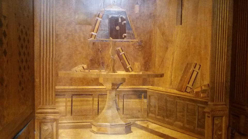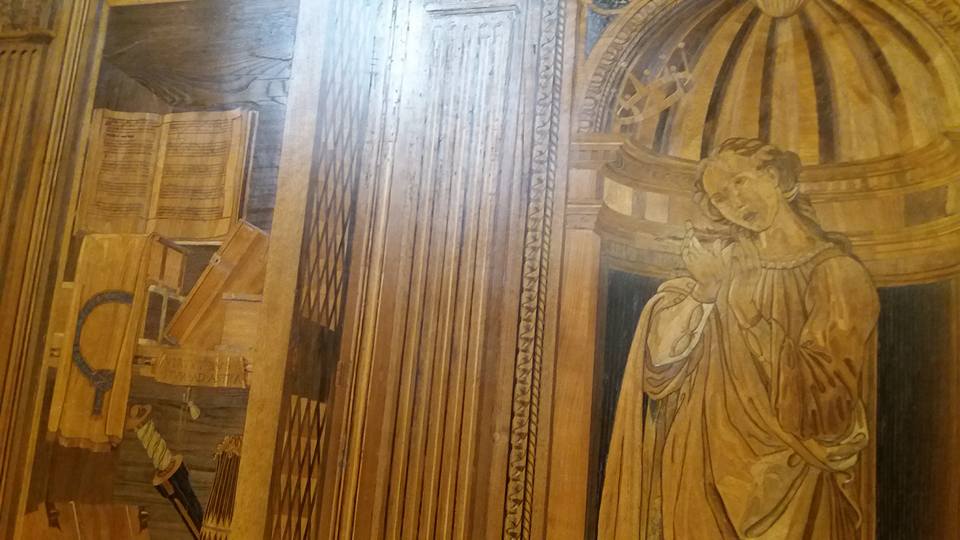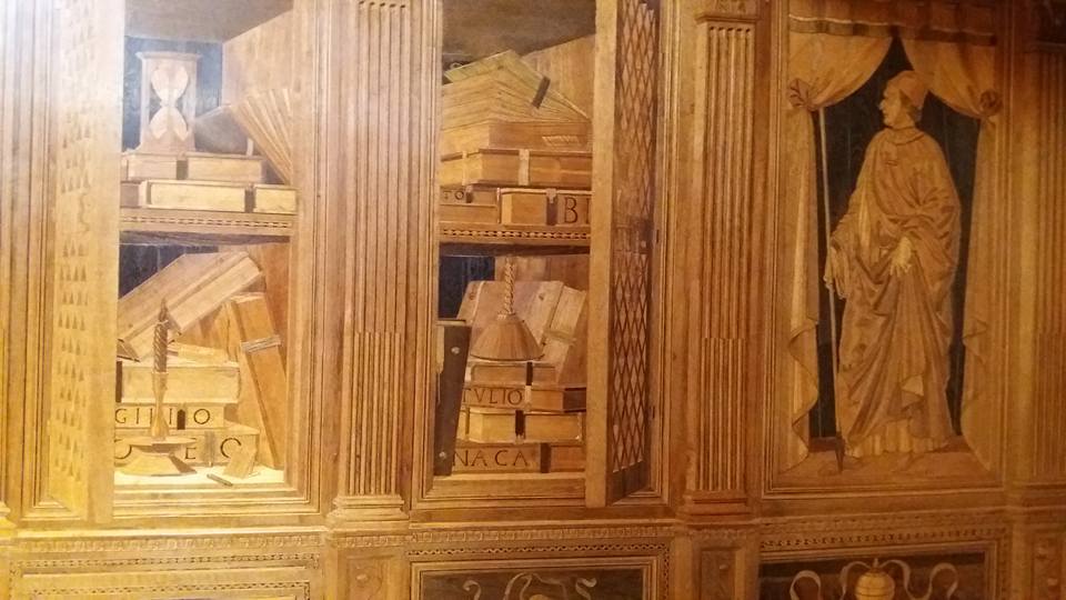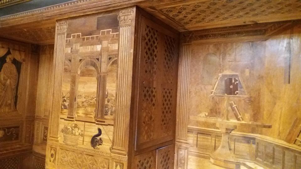 Lo studiolo di Urbino, ideato da Federico da Montefeltro nella sua residenza (realizzato tra il 1473 e il 1476 da artisti fiamminghi) . Il piano nobile del Palazzo Ducale di Urbino. Le tarsie lignee celebrano la corte, la figura di Federico in un gusto sfarzoso. Una quantità di legni pregiati creano prospettiva, modellano le figure in una allegoria dell’uomo e la natura centrale nella visione del Rinascimento.