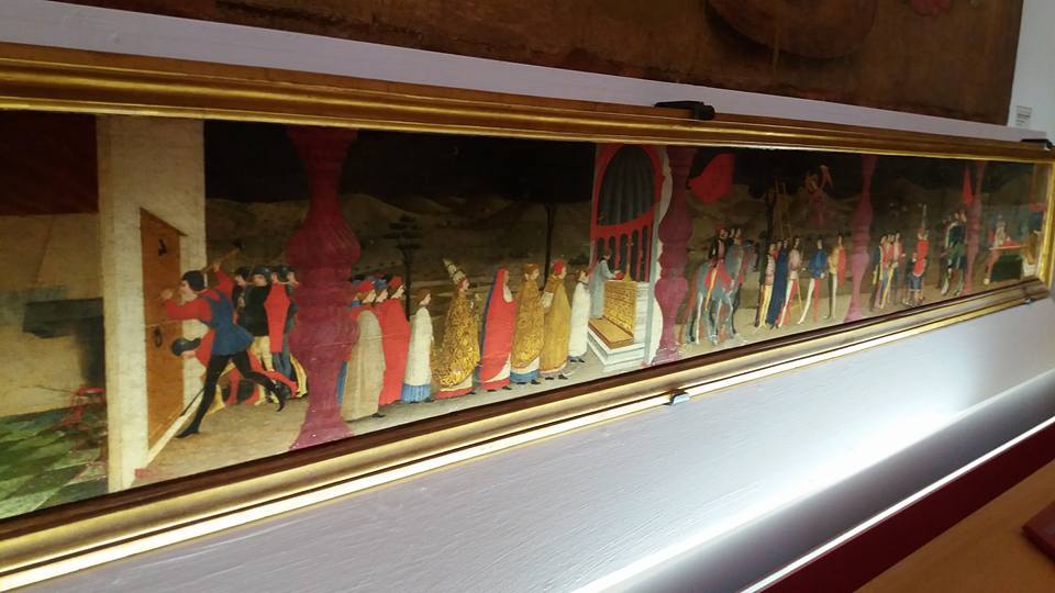 Paolo Uccello, tavola del Miracolo dell’Ostia profanata (1467 – 68). Fotogrammi di un film, scene di una narrazione . E’ notte nelle sei scene divise da colonnine tortili. Una donna ruba un’ostia consacrata e la vende a un usuraio ebreo. L’ebreo e la sua famiglia cuociono l’ostia, arrivano le figure armate, si riconsacra l’ostia, la donna sacrilega viene impiccata, l’ebreo e la sua famiglia vengono bruciati sul rogo, gli angeli e i demoni che si contendono l’anima della donna. Una pittura rappresentata in forma inconsueta, ma efficace nella denuncia del Cristianesimo contro i mercanti ebrei.