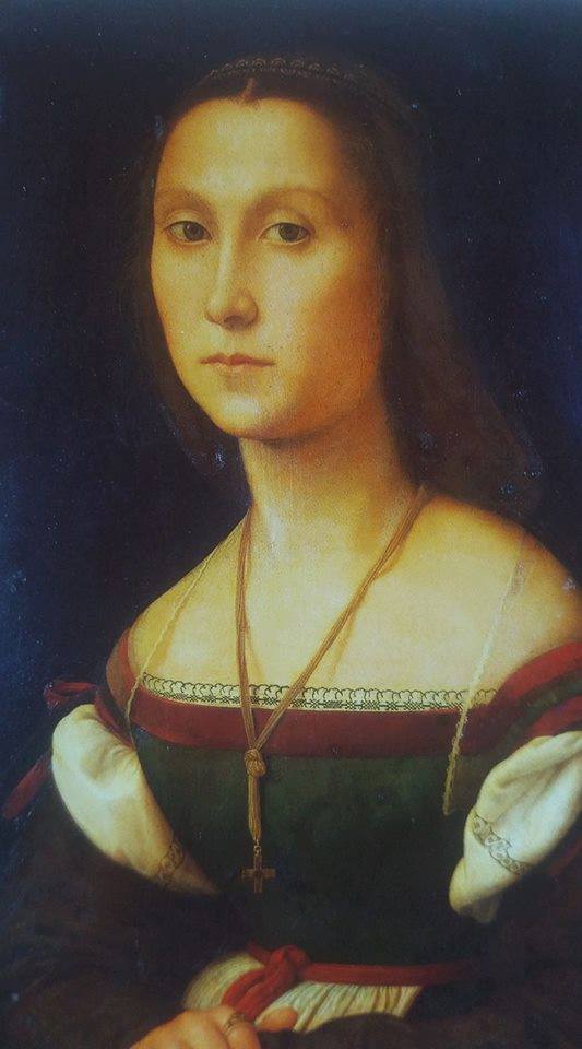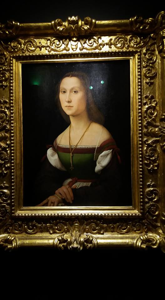 Ritratto di Gentildonna detto “La Muta” ( 1505 -07) di Raffaello Sanzio. Mezza figura leggermente di tre quarti, voltata verso sinistra, ma il pendente con croce, costituito da una catena d’oro a maglie fitte e appiattite che segue la plasticità del corpo, viceversa, la stessa croce con pietra a cabochon (forse uno smeraldo) si gira, si posiziona frontale, non segue il corpo, si libera e fronteggia anche con una leggera ombra l’osservatore che guarda dell’opera d’arte: una raffinatezza pittorica, un punto di vista di alta sensibilità, un dettaglio umanistico nel grembo del Rinascimento.