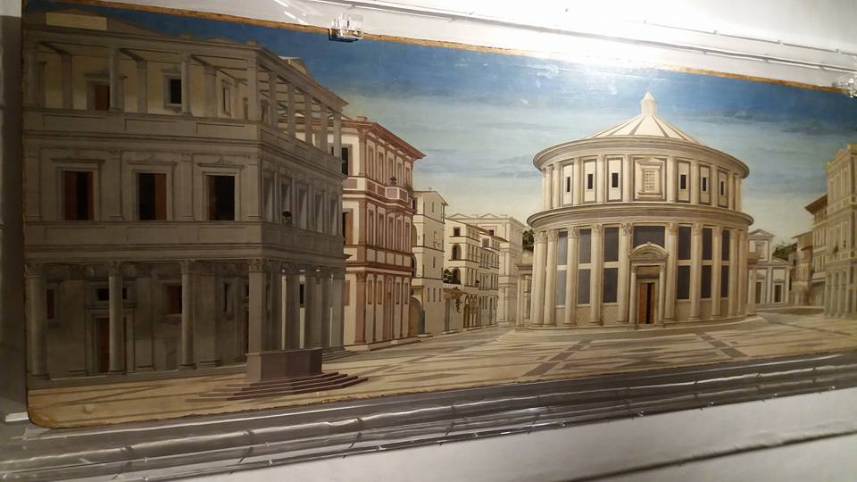 La Città ideale, tempera su tavola, databile tra il 1470 e il 1490, attribuita a diversi artisti che vi gravitarono attorno: Piero della Francesca, Luciano Laurana, Francesco di Giorgio Martini. Una grande piazza in prospettiva lineare centrale, l’ edificio circolare, religioso, ma su tutto è le luce che rappresenta la Citta ideale: la sua purezza pittorica rappresenta il concetto filosofico di utopia che il Rinascimento rincorre e vuole possedere, intorno all’uomo, assente, e al suo nuovo spazio urbano da possedere e condividere.