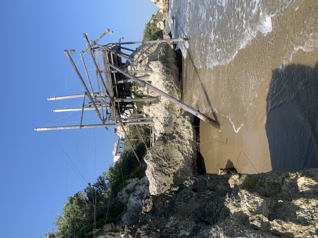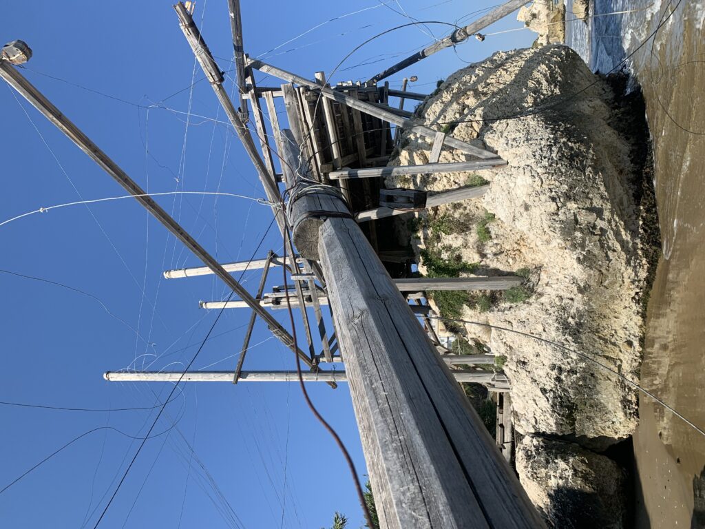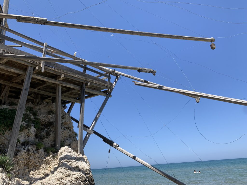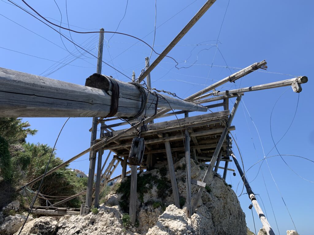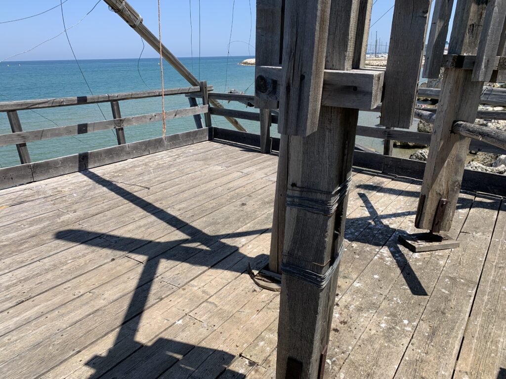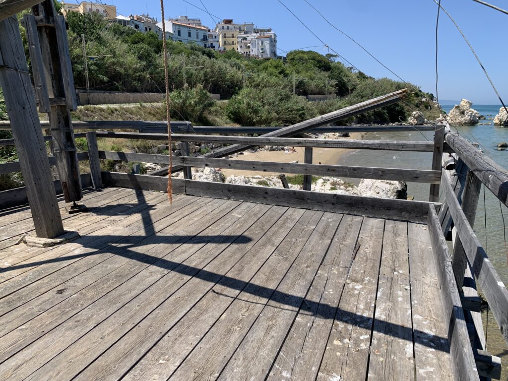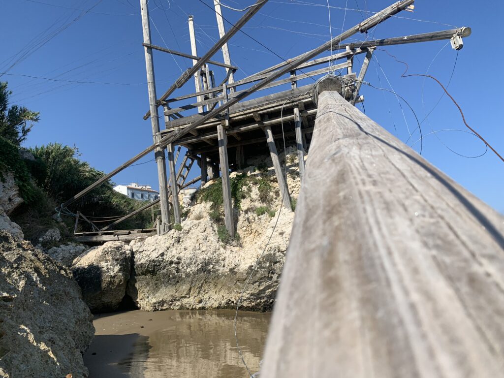 “La fissità” visiva della macchina da pesca in legno con dei tiranti metallici è il capoverso, l’inizio di un racconto di una storia dell’economia familiare di scambio e baratto, un tempo, dei pescatori in attesa sul trabocco… L’attesa, lo sguardo su mare per osservare le formazioni dei pesci forse in avvicinamento, si può definire così la pesca stanziale che aspetta le colonie dei pesci, si muovono queste lungo la costa e si riuniscono a volte sotto i trabocchi. Le reti scendono in verticale, la fauna ittica viene imprigionata, e con la stessa rete portate sulla piattaforma in legno. Far cadere dall’alto, questo il significato del “trabucco”. E’ una la rete quadrangolare che scende tenuta ai vertici da lunghi pali che disegnano una forma una crociera. Il trabocco è una architettura spontanea sorta lungo le scogliere, con pali a volte infissi sulle concrezioni rocciose scavate per l’alloggiamento degli stessi pali, e tiranti in ferro per l’iniziale piattaforma che viene ancorata alle rocce, poi è la volta dei lunghi pali detti bracci lignei alla cui estremità è fissata la rete a bilancia. Al centro della piattaforma in legno di pino d’ aleppo, l’argano comanda la discesa della rete a maglie strette con un moto di rotazione intorno al proprio asse verticale. Ponti, pedane, camminamenti e scale di accesso collegano il trabocco alla terra ferma. Nei promontori oppure nelle formazioni rocciose della costa sporgenti verso il mare, in particolare così adatta la morfologia della costa rocciosa del Gargano, i trabocchi trovavano una loro collocazione strutturale ideale. In una economia di sussistenza, scambio e baratto con i prodotti agricoli dell’entroterra, il trabocco ha sostenuto le famiglie dei pescatori stanziali…
