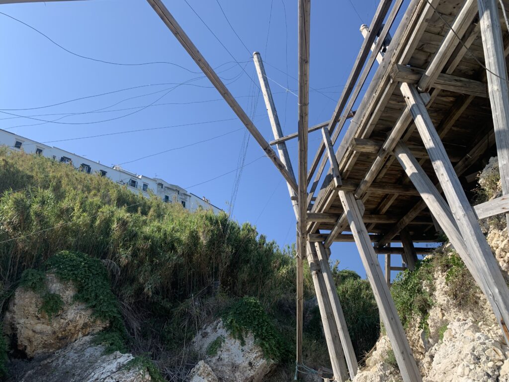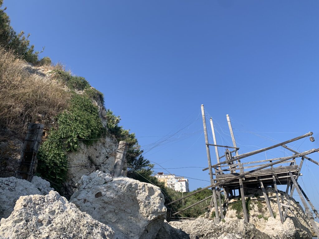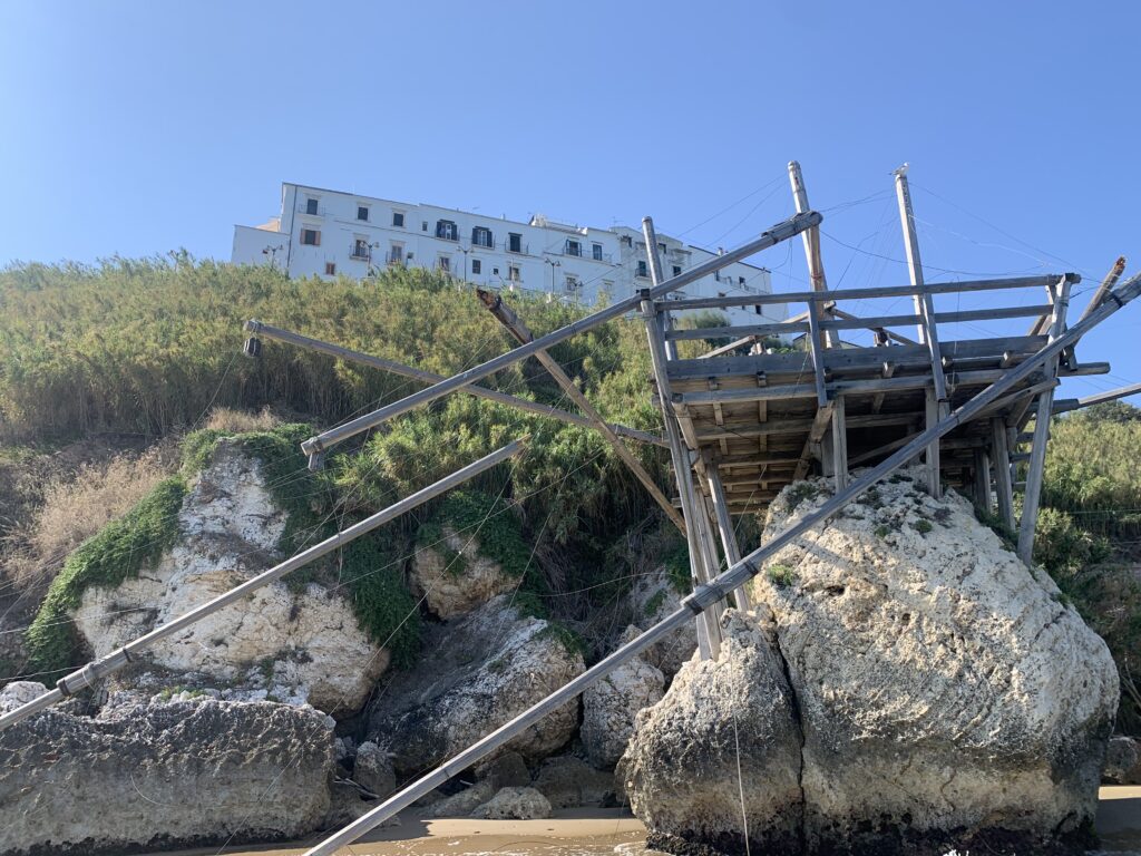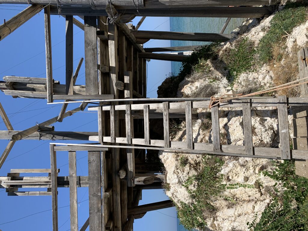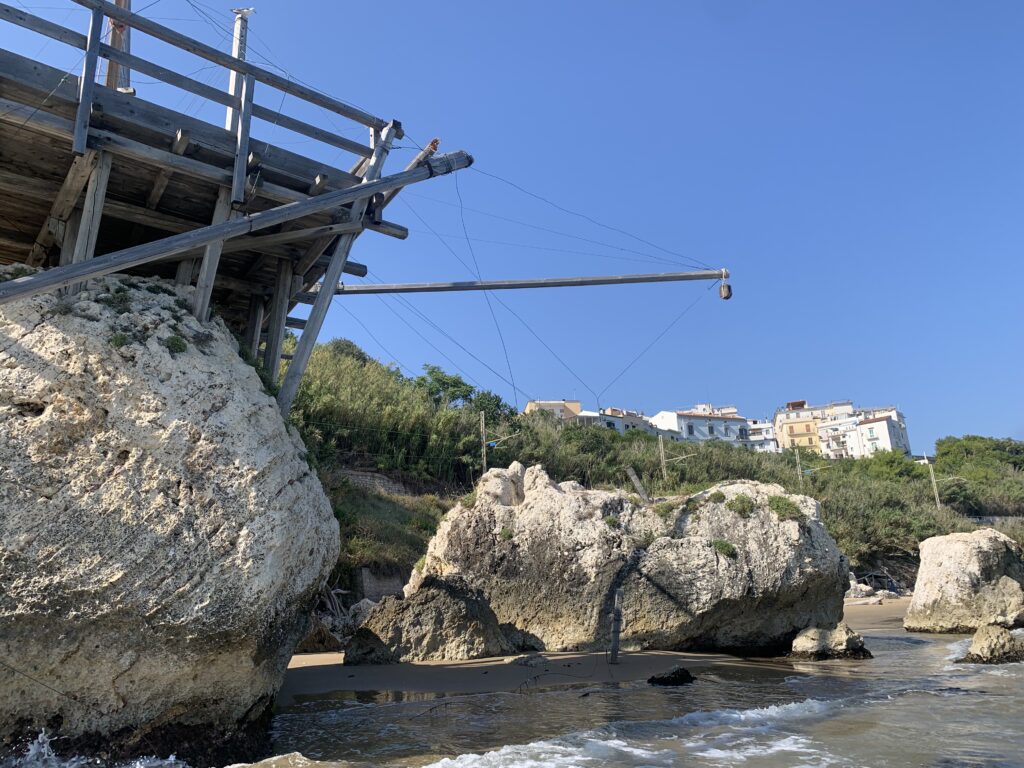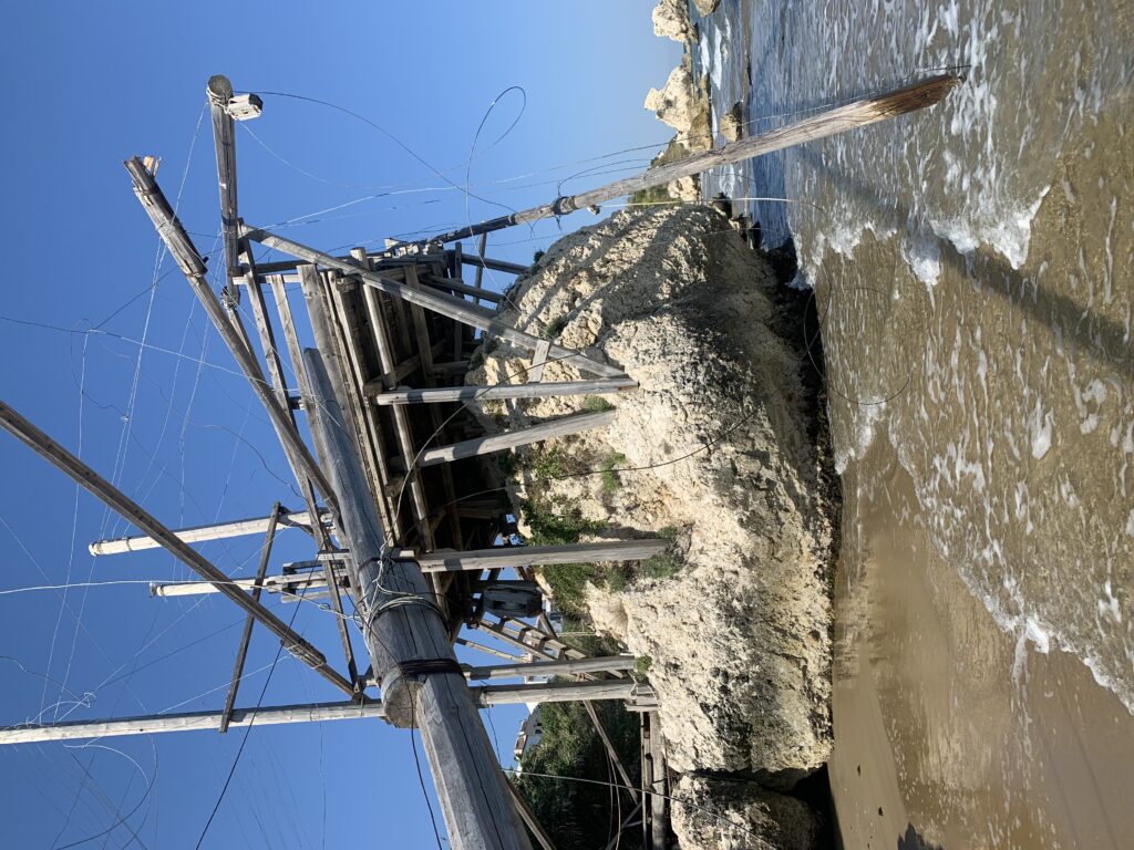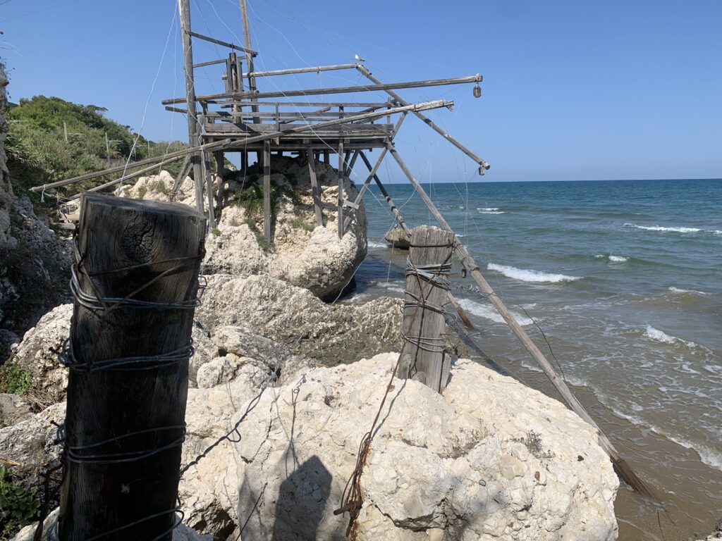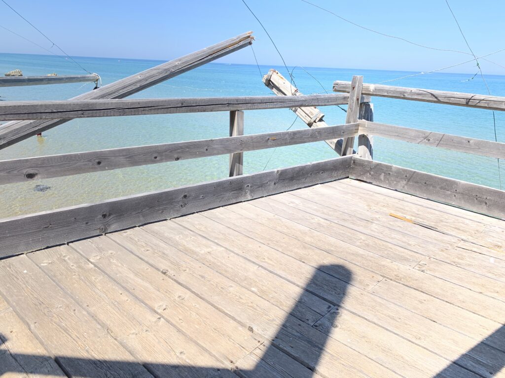 “La fissità” visiva della macchina da pesca in legno con dei tiranti metallici è il capoverso, l’inizio di un racconto di una storia dell’economia familiare di scambio e baratto, un tempo, dei pescatori in attesa sul trabocco… L’attesa, lo sguardo su mare per osservare le formazioni dei pesci forse in avvicinamento, si può definire così la pesca stanziale che aspetta le colonie dei pesci, si muovono queste lungo la costa e si riuniscono a volte sotto i trabocchi. Le reti scendono in verticale, la fauna ittica viene imprigionata, e con la stessa rete portate sulla piattaforma in legno. Far cadere dall’alto, questo il significato del “trabucco”. E’ una la rete quadrangolare che scende tenuta ai vertici da lunghi pali che disegnano una forma una crociera. Il trabocco è una architettura spontanea sorta lungo le scogliere, con pali a volte infissi sulle concrezioni rocciose scavate per l’alloggiamento degli stessi pali, e tiranti in ferro per l’iniziale piattaforma che viene ancorata alle rocce, poi è la volta dei lunghi pali detti bracci lignei alla cui estremità è fissata la rete a bilancia. Al centro della piattaforma in legno di pino d’ aleppo, l’argano comanda la discesa della rete a maglie strette con un moto di rotazione intorno al proprio asse verticale. Ponti, pedane, camminamenti e scale di accesso collegano il trabocco alla terra ferma. Nei promontori oppure nelle formazioni rocciose della costa sporgenti verso il mare, in particolare così adatta la morfologia della costa rocciosa del Gargano, i trabocchi trovavano una loro collocazione strutturale ideale. In una economia di sussistenza, scambio e baratto con i prodotti agricoli dell’entroterra, il trabocco ha sostenuto le famiglie dei pescatori stanziali…