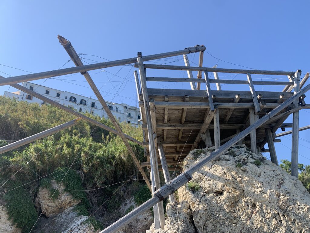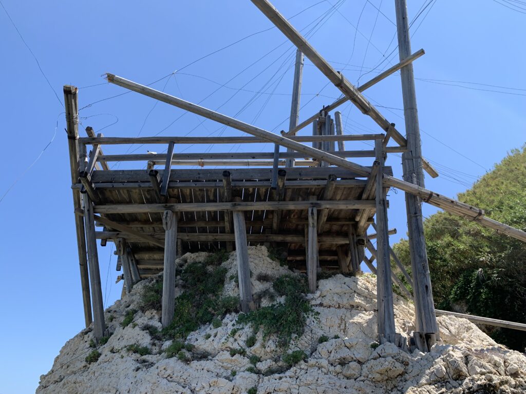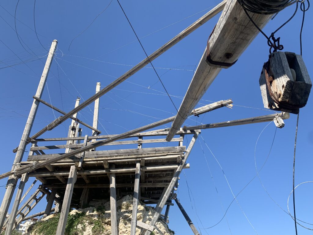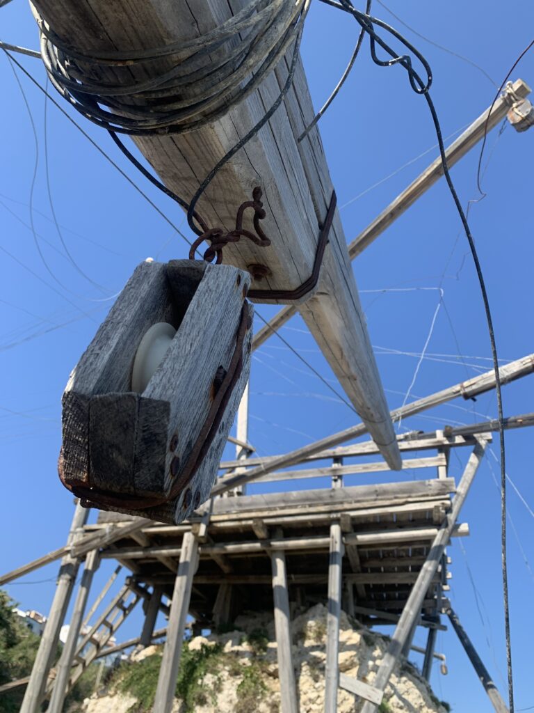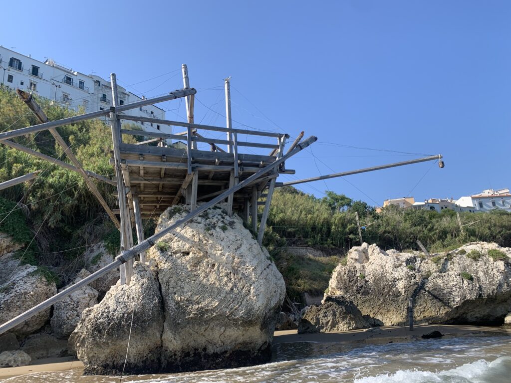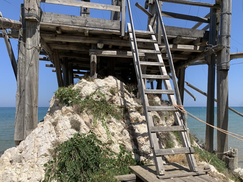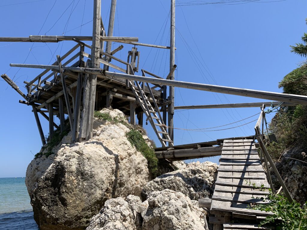 “La fissità” visiva della macchina da pesca in legno con dei tiranti metallici è il capoverso, l’inizio di un racconto di una storia dell’economia familiare di scambio e baratto, un tempo, dei pescatori in attesa sul trabocco… L’attesa, lo sguardo su mare per osservare le formazioni dei pesci forse in avvicinamento, si può definire così la pesca stanziale che aspetta le colonie dei pesci, si muovono queste lungo la costa e si riuniscono a volte sotto i trabocchi. Le reti scendono in verticale, la fauna ittica viene imprigionata, e con la stessa rete portate sulla piattaforma in legno. Far cadere dall’alto, questo il significato del “trabucco”. E’ una la rete quadrangolare che scende tenuta ai vertici da lunghi pali che disegnano una forma una crociera. Il trabocco è una architettura spontanea sorta lungo le scogliere, con pali a volte infissi sulle concrezioni rocciose scavate per l’alloggiamento degli stessi pali, e tiranti in ferro per l’iniziale piattaforma che viene ancorata alle rocce, poi è la volta dei lunghi pali detti bracci lignei alla cui estremità è fissata la rete a bilancia. Al centro della piattaforma in legno di pino d’ aleppo, l’argano comanda la discesa della rete a maglie strette con un moto di rotazione intorno al proprio asse verticale. Ponti, pedane, camminamenti e scale di accesso collegano il trabocco alla terra ferma. Nei promontori oppure nelle formazioni rocciose della costa sporgenti verso il mare, in particolare così adatta la morfologia della costa rocciosa del Gargano, i trabocchi trovavano una loro collocazione strutturale ideale. In una economia di sussistenza, scambio e baratto con i prodotti agricoli dell’entroterra, il trabocco ha sostenuto le famiglie dei pescatori stanziali…