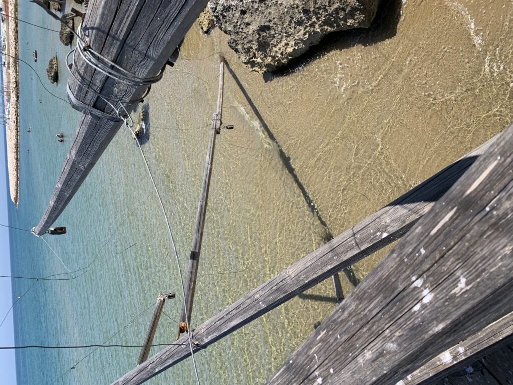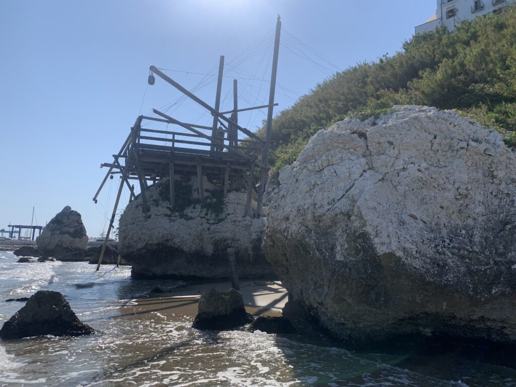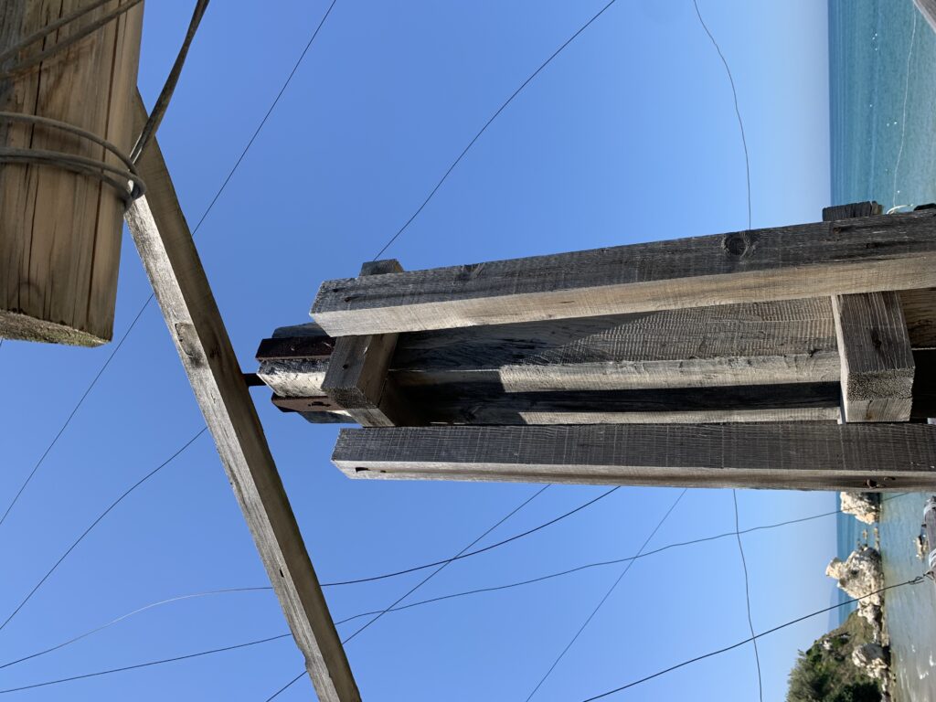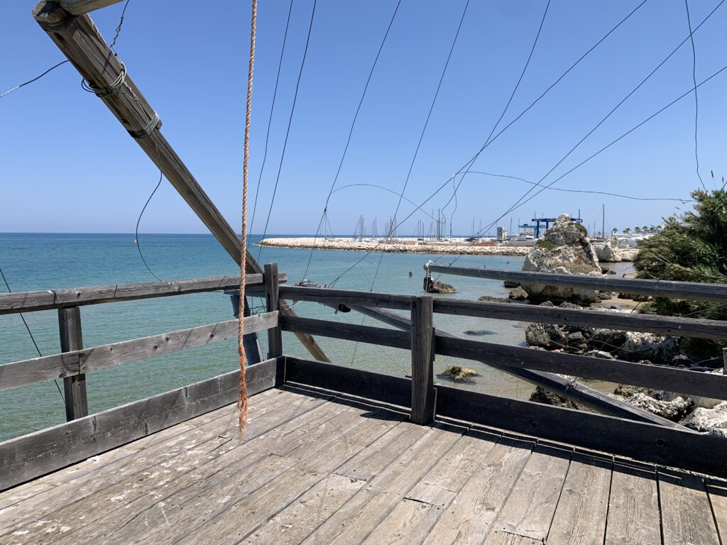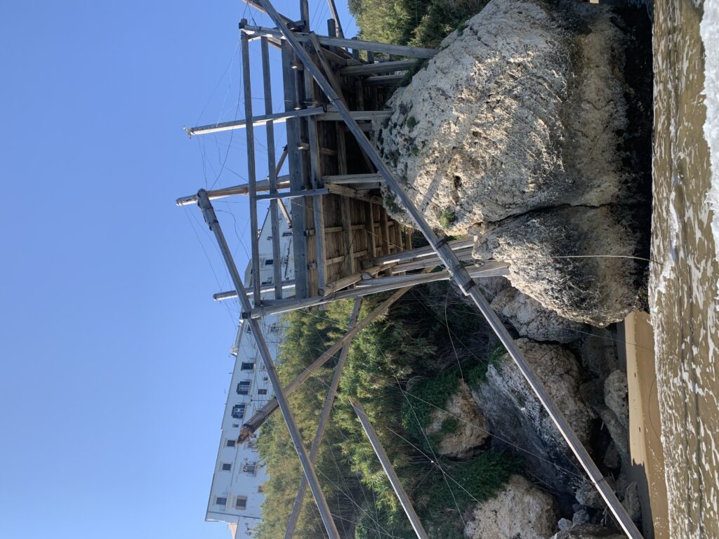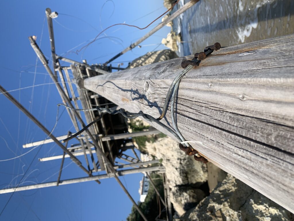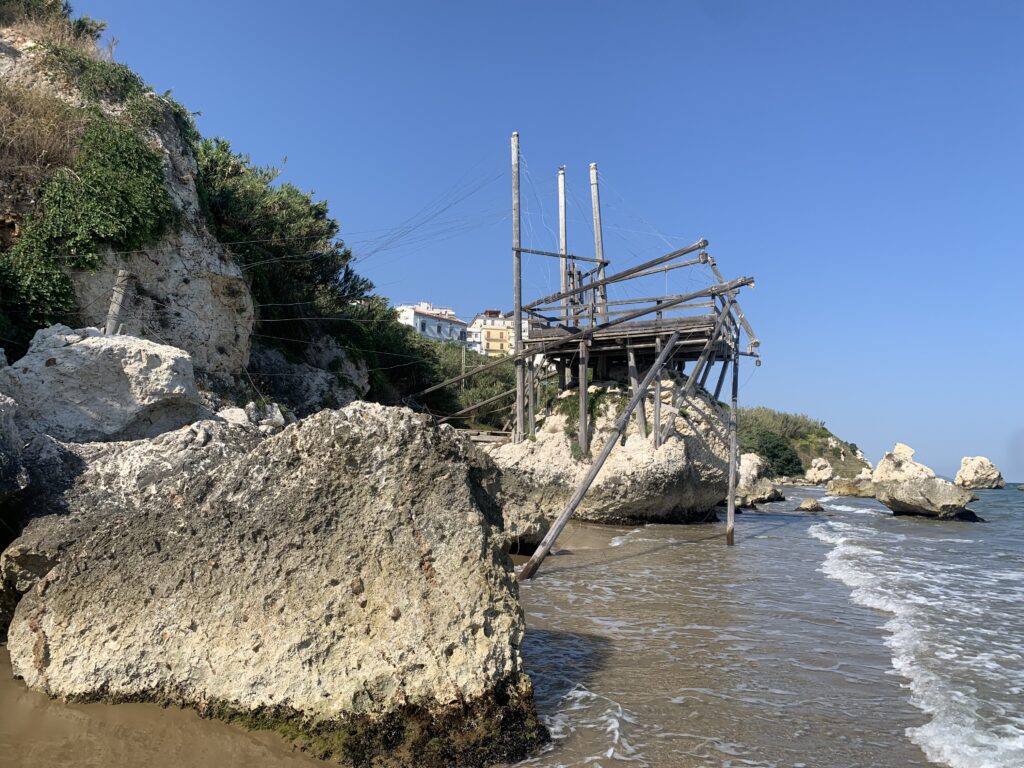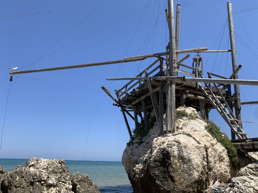 “La fissità” visiva della macchina da pesca in legno con dei tiranti metallici è il capoverso, l’inizio di un racconto di una storia dell’economia familiare di scambio e baratto, un tempo, dei pescatori in attesa sul trabocco… L’attesa, lo sguardo su mare per osservare le formazioni dei pesci forse in avvicinamento, si può definire così la pesca stanziale che aspetta le colonie dei pesci, si muovono queste lungo la costa e si riuniscono a volte sotto i trabocchi. Le reti scendono in verticale, la fauna ittica viene imprigionata, e con la stessa rete portate sulla piattaforma in legno. Far cadere dall’alto, questo il significato del “trabucco”. E’ una la rete quadrangolare che scende tenuta ai vertici da lunghi pali che disegnano una forma una crociera. Il trabocco è una architettura spontanea sorta lungo le scogliere, con pali a volte infissi sulle concrezioni rocciose scavate per l’alloggiamento degli stessi pali, e tiranti in ferro per l’iniziale piattaforma che viene ancorata alle rocce, poi è la volta dei lunghi pali detti bracci lignei alla cui estremità è fissata la rete a bilancia. Al centro della piattaforma in legno di pino d’ aleppo, l’argano comanda la discesa della rete a maglie strette con un moto di rotazione intorno al proprio asse verticale. Ponti, pedane, camminamenti e scale di accesso collegano il trabocco alla terra ferma. Nei promontori oppure nelle formazioni rocciose della costa sporgenti verso il mare, in particolare così adatta la morfologia della costa rocciosa del Gargano, i trabocchi trovavano una loro collocazione strutturale ideale. In una economia di sussistenza, scambio e baratto con i prodotti agricoli dell’entroterra, il trabocco ha sostenuto le famiglie dei pescatori stanziali…